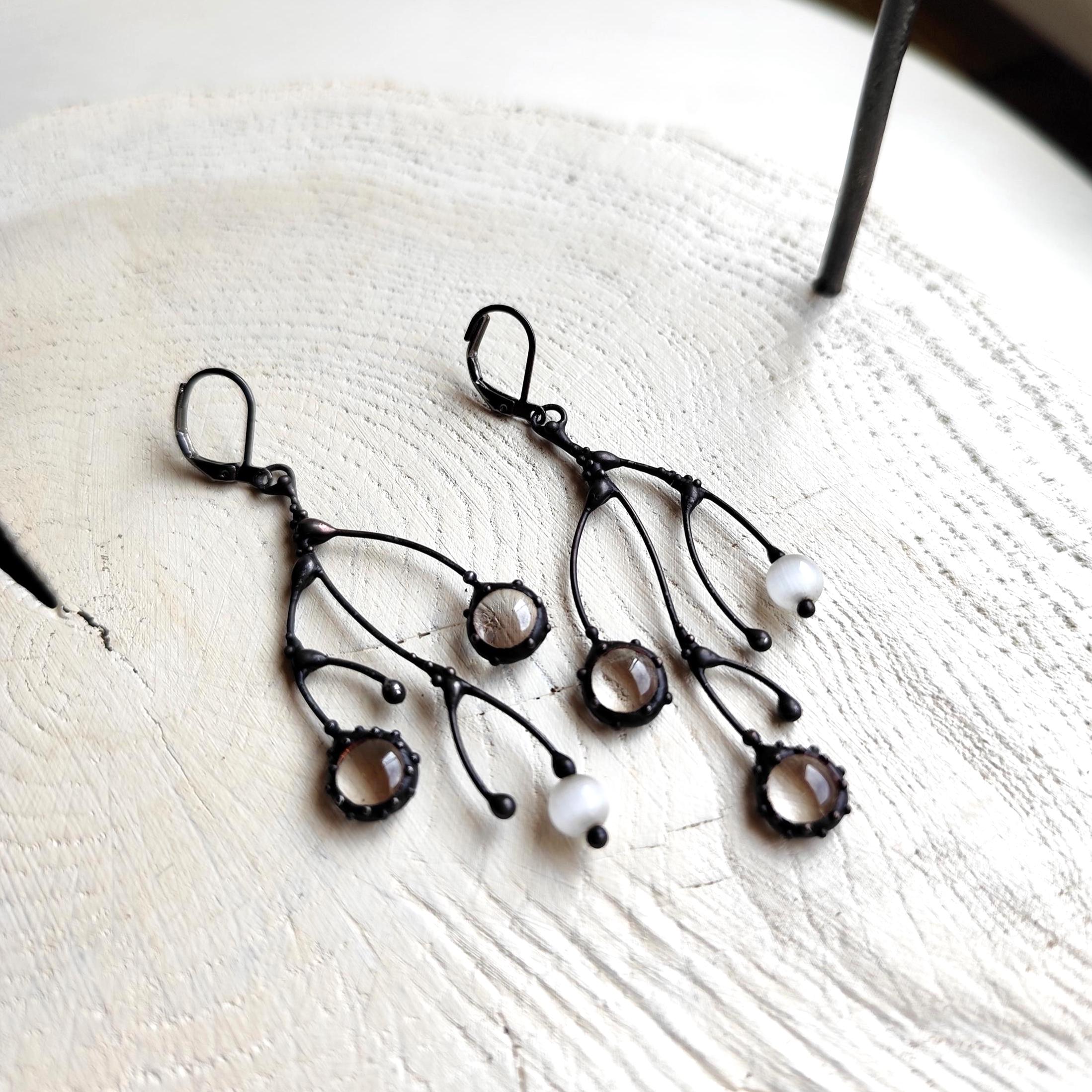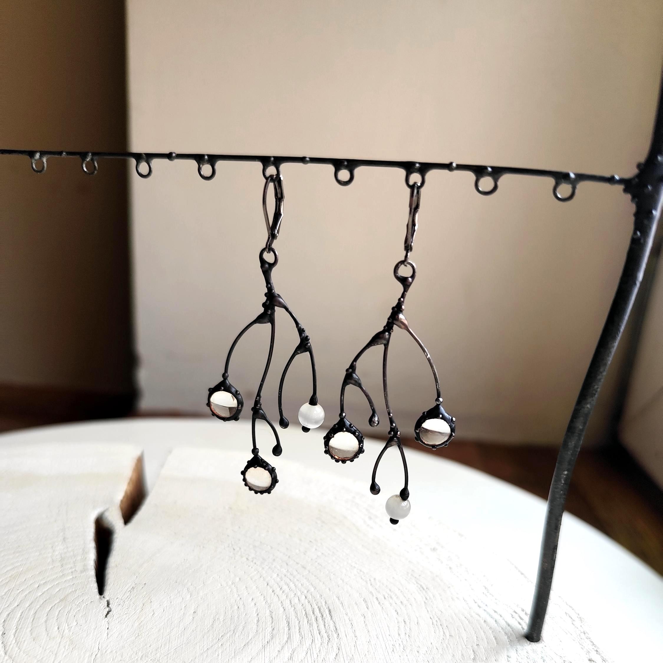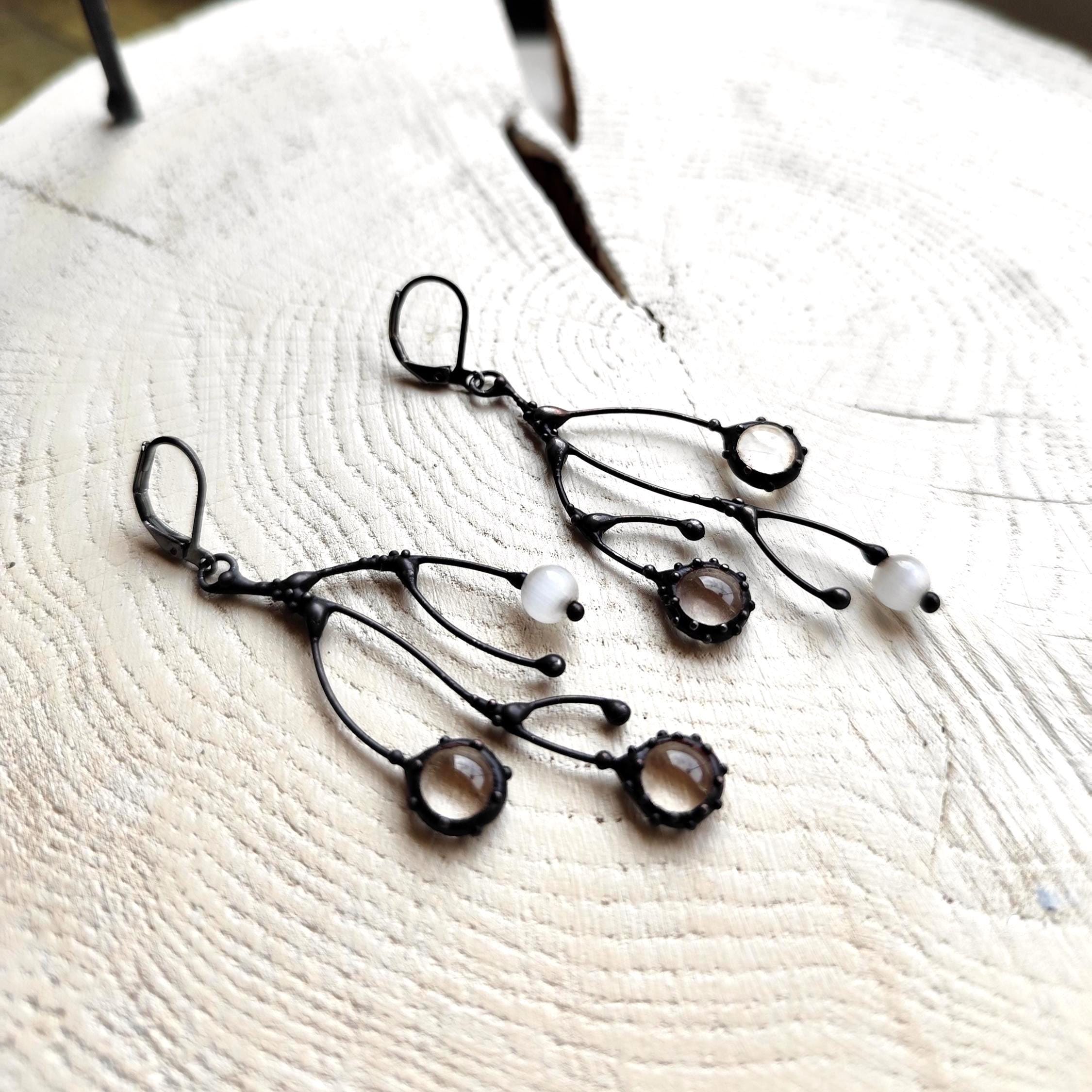 These asymmetrical forest earrings "tree branch earrings" made from copper, pewter, steel and clear glass. They are light, thin and asymmetrical. All elements are handmade, which ensures the individuality of each product made in the Yadovito workshop. The copper alloy is coated with a black patina to color the metal black, polished with a finishing solution to give the jewelry a noble appearance and at the same time so that the metal does not oxidize. The earrings use glass melted in a special furnace. After melting, the glass takes on an almost unique shape and amazing color shades that play in the light. Size about 6 * 3 cm (2.3 * 1.1 in). Color black/clear.