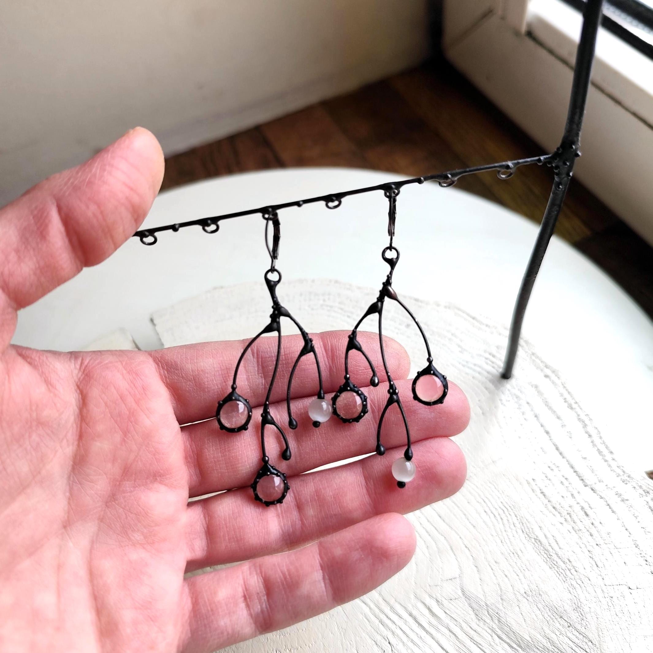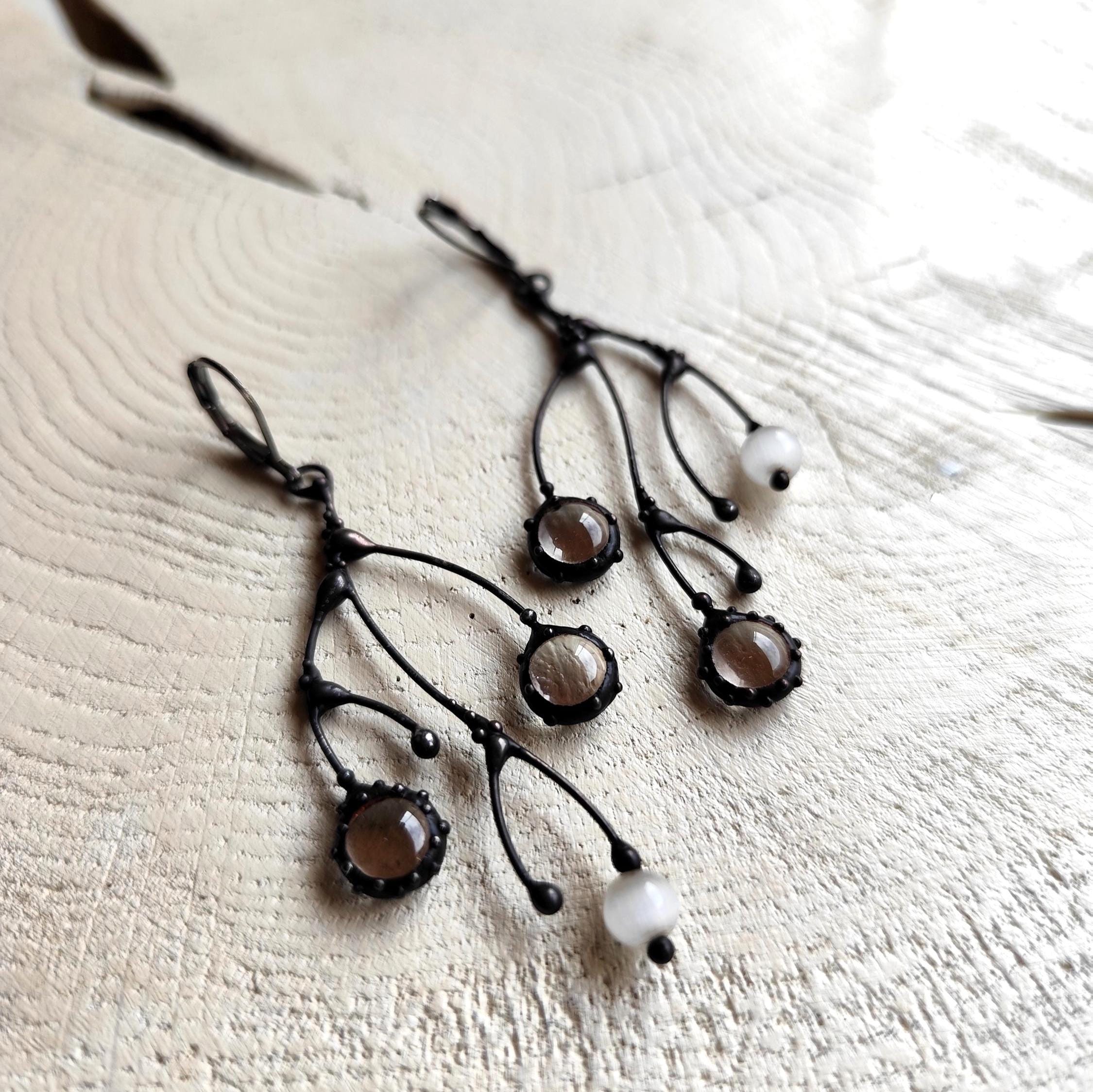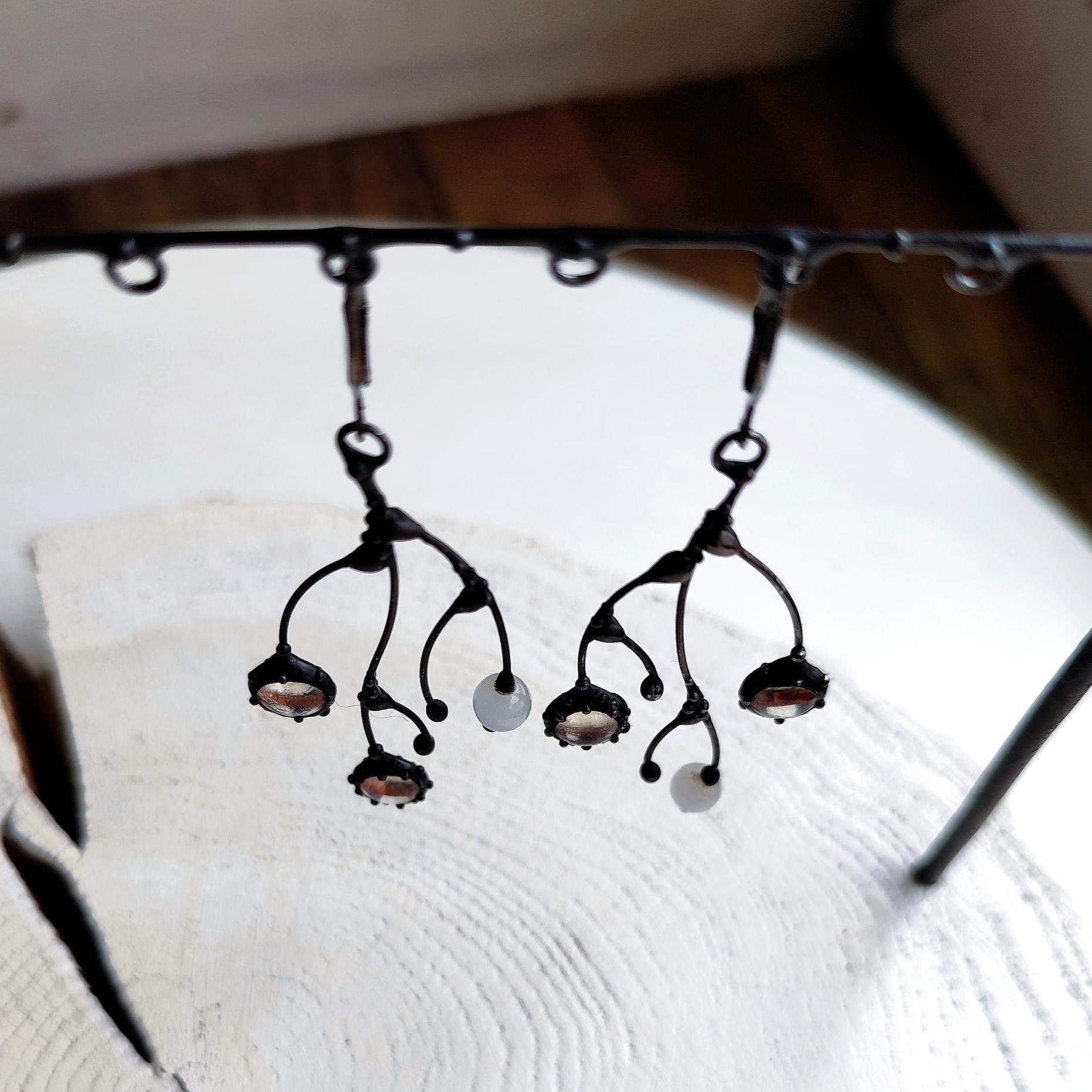 These asymmetrical forest earrings "tree branch earrings" made from copper, pewter, steel and clear glass. They are light, thin and asymmetrical. All elements are handmade, which ensures the individuality of each product made in the Yadovito workshop. The copper alloy is coated with a black patina to color the metal black, polished with a finishing solution to give the jewelry a noble appearance and at the same time so that the metal does not oxidize. The earrings use glass melted in a special furnace. After melting, the glass takes on an almost unique shape and amazing color shades that play in the light. Size about 6 * 3 cm (2.3 * 1.1 in). Color black/clear.