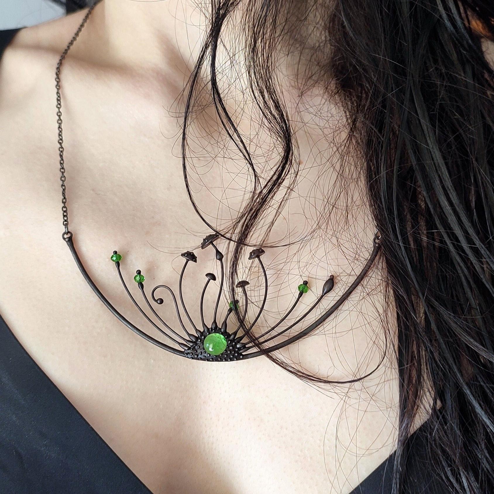 Handmade jewelry psychedelic amanita mushrooms pendant made from copper, pewter, steel and green glass. Covered in black patina and treated with antioxidant. The necklace is light and strong. All elements are handmade, which ensures the individuality of each product made in the Yadovito workshop. The tin-copper alloy is coated with a black patina to color the metal black, polished with a finishing solution to give the jewelry a noble appearance and at the same time so that the metal does not oxidize. Each jewelry looks individually, because mushroom caps are made by hand, and not cast or stamped. Mushrooms necklace use glass melted in a special furnace. After melting, the glass takes on an almost unique shape and amazing color shades that play in the light. Unusual and durable fungus amanita mushroom witchcraft pendant. Size about 13/6 cm (5 * 2.3 in). Color black/green.