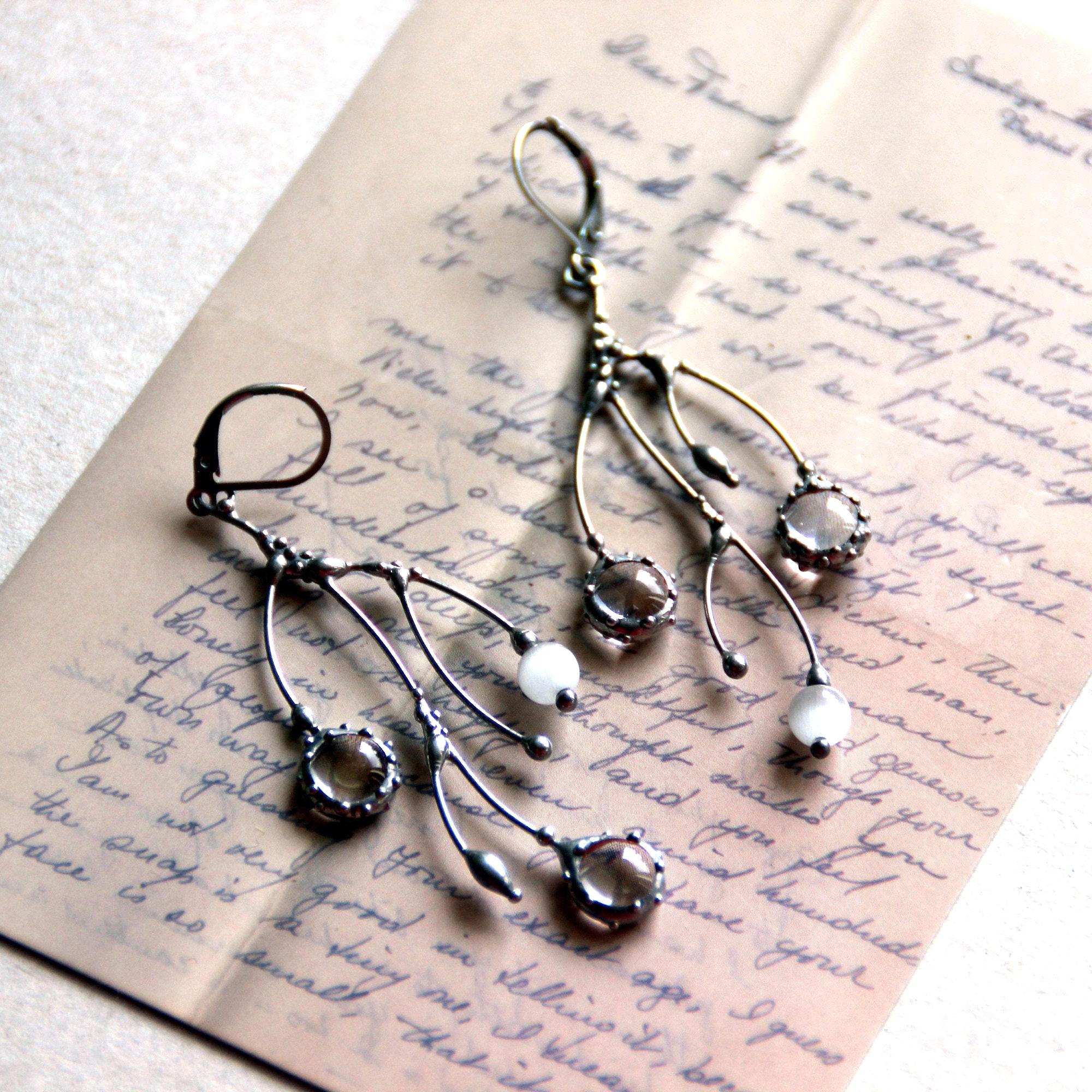 Tree branch asymmetrical earrings made from copper, pewter, steel and clear glass. Light, solid and asymmetrical. All elements are handmade, which ensures the individuality of each product made in the Yadovito workshop. The copper alloy polished with a finishing solution to give the jewelry a noble appearance and at the same time so that the metal does not oxidize. The earrings use glass melted in a special furnace. After melting, the glass takes on an almost unique shape and amazing color shades that play in the light. Size about 6/3 cm (2.3 * 1.1 in). Color silver.