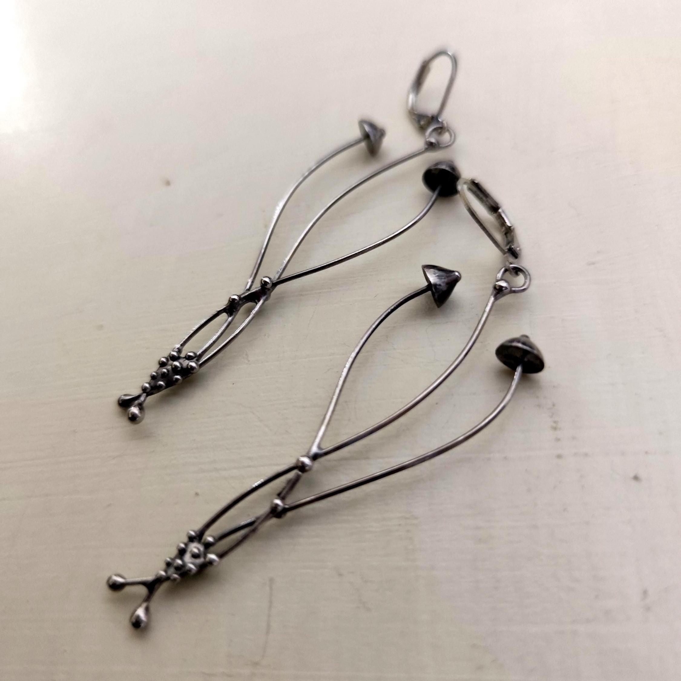 These handmade psychedelic fungi magic mushrooms forest nature witch core botanical earrings made from copper, pewter, steel. Treated with antioxidant, sanded, polished. Unusual and bright metal mushrooms amanita earrings. All elements are handmade, which ensures the individuality of each product made in the Yadovito workshop. The copper alloy is polished with a finishing solution to give the jewelry a noble appearance and at the same time so that the metal does not oxidize. Color: Silver. Size about 5/2 cm (2 * 0.8 in).