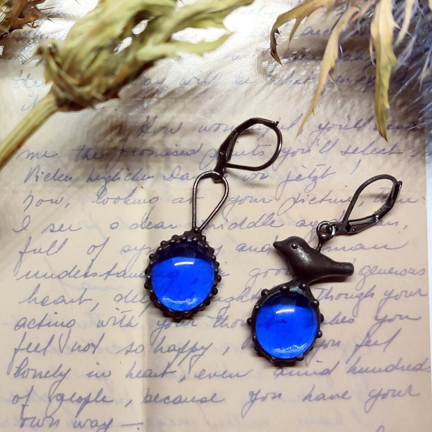 These blue glass boho wildnature asymmetrical earrings bird handmade from copper, pewter, steel, glass. Covered with patina, treated with antioxidant, sanded, polished. Unusual and strong, boho asymmetrical earrings. All elements are handmade, which ensures the individuality of each product made in the Yadovito workshop. The copper alloy is polished with a finishing solution to give the jewelry a noble appearance and at the same time so that the metal does not oxidize. Color: Black/blue. Size about 3/1.5 cm (1.2 * 0.6 in).