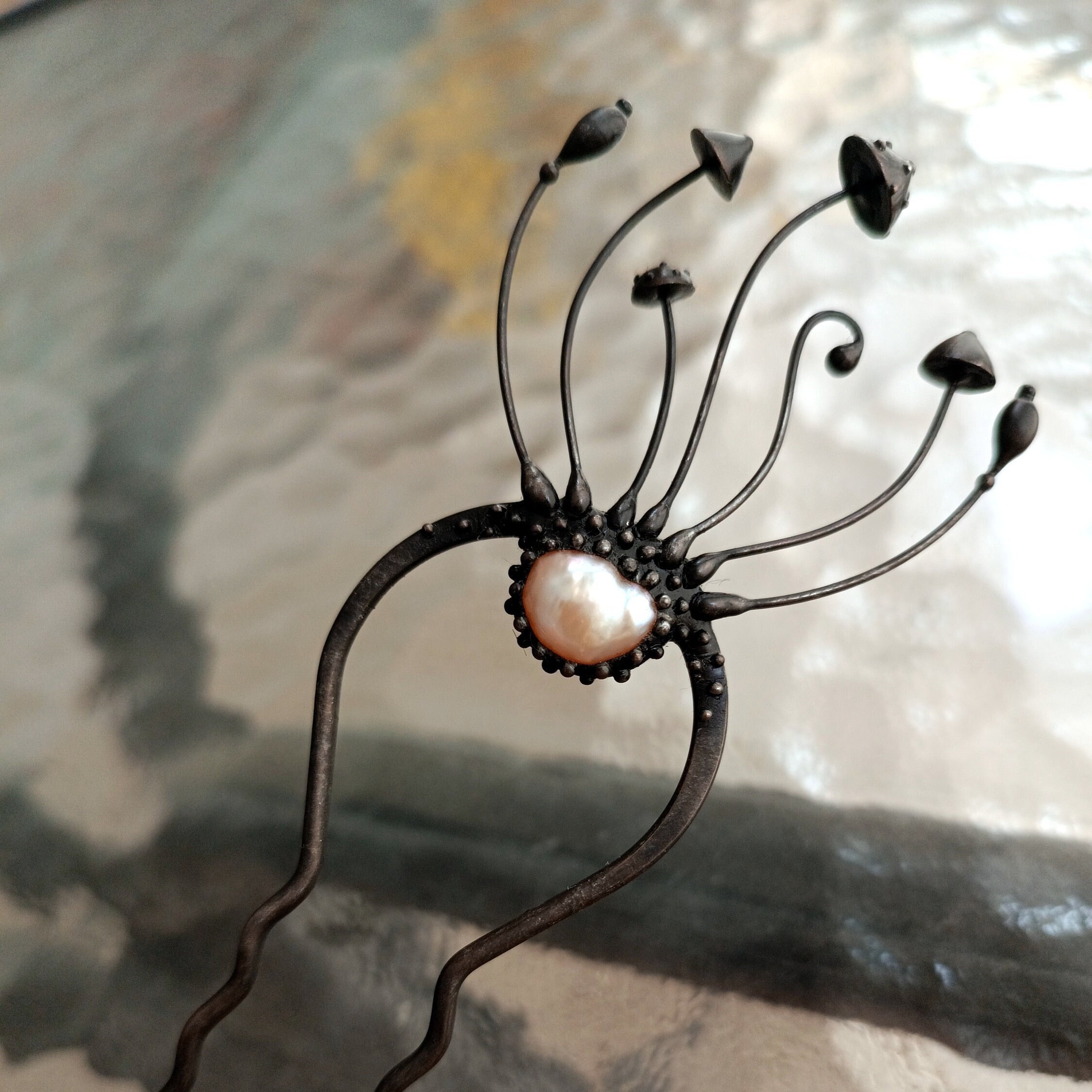 Forest magic mushrooms amanita metal hair pin with white pearl handmade from copper, pewter, steel and pearl. Covered with patina and treated with antioxidant, sanded, polished. Aesthetic sturdy psychedelic mushrooms hair pin. All elements are handmade, which ensures the individuality of each product made in the Yadovito workshop. The copper alloy is polished with a finishing solution to give the jewelry a noble appearance and at the same time so that the metal does not oxidize. Size about 14.5/5 cm (5.5 * 1.8 in). Color Black/white.