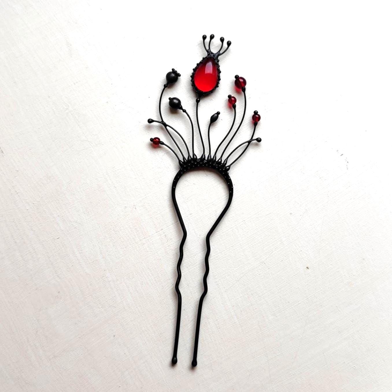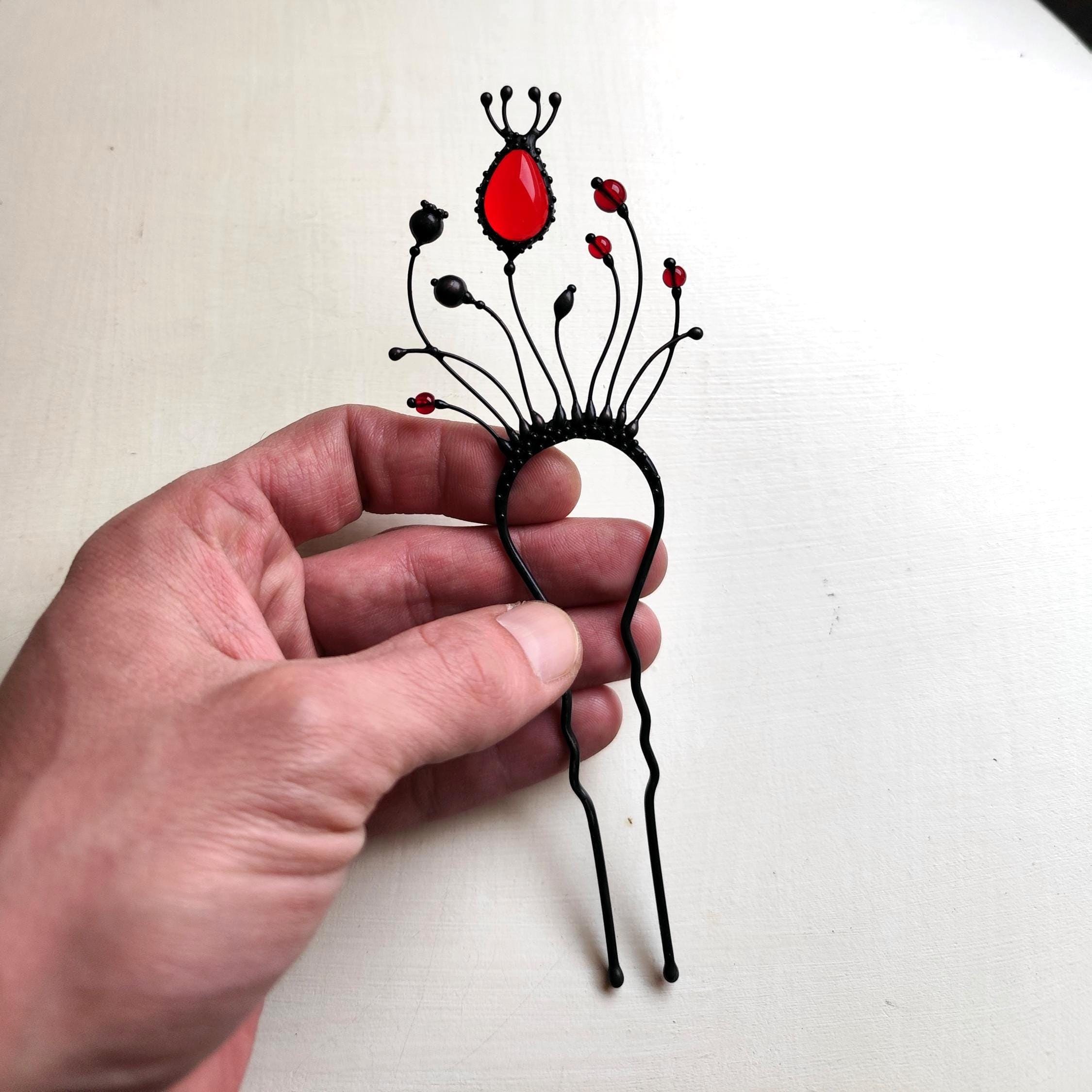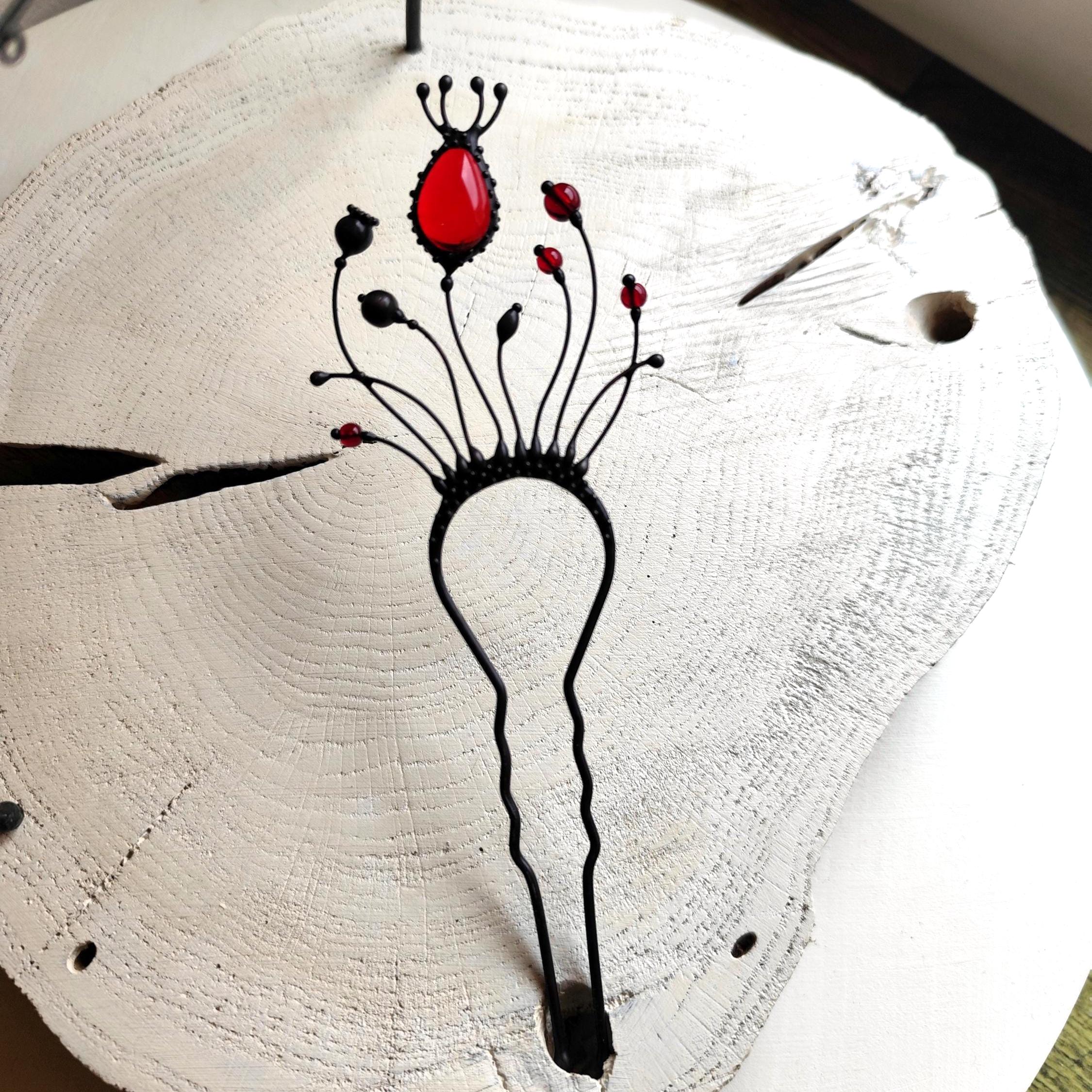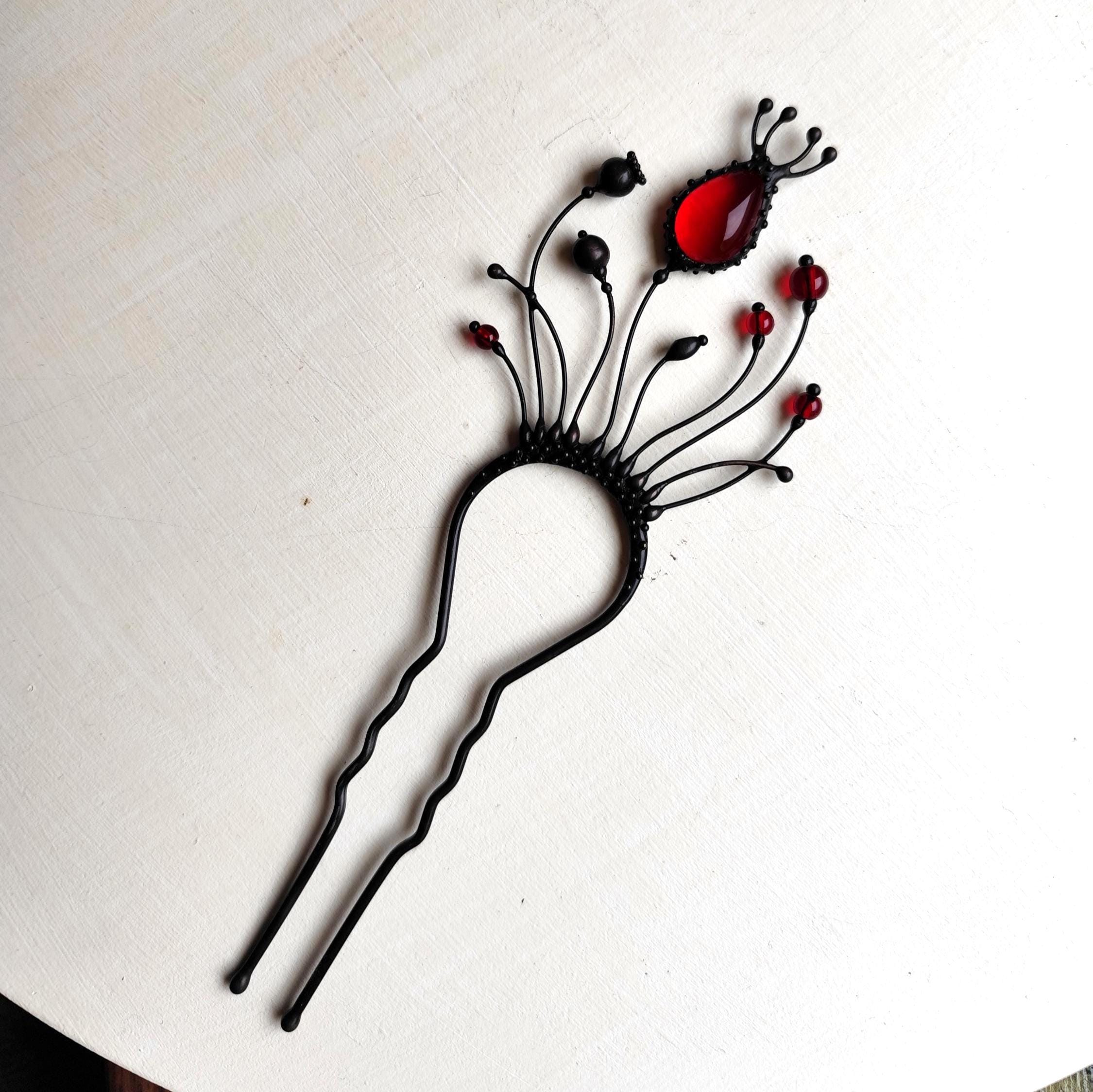 Poppy red wild flowers handcrafted metal hair pin made from copper, pewter, steel and red glass. Covered with patina and treated with antioxidant, sanded, polished. Witchcraft aesthetic sturdy red poppy flowers hair pin. All elements are handmade, which ensures the individuality of each product made in the Yadovito workshop. The copper alloy is polished with a finishing solution to give the jewelry a noble appearance and at the same time so that the metal does not oxidize. Size about 14.5/5 cm (5.7 * 2 in). Color Black/red.