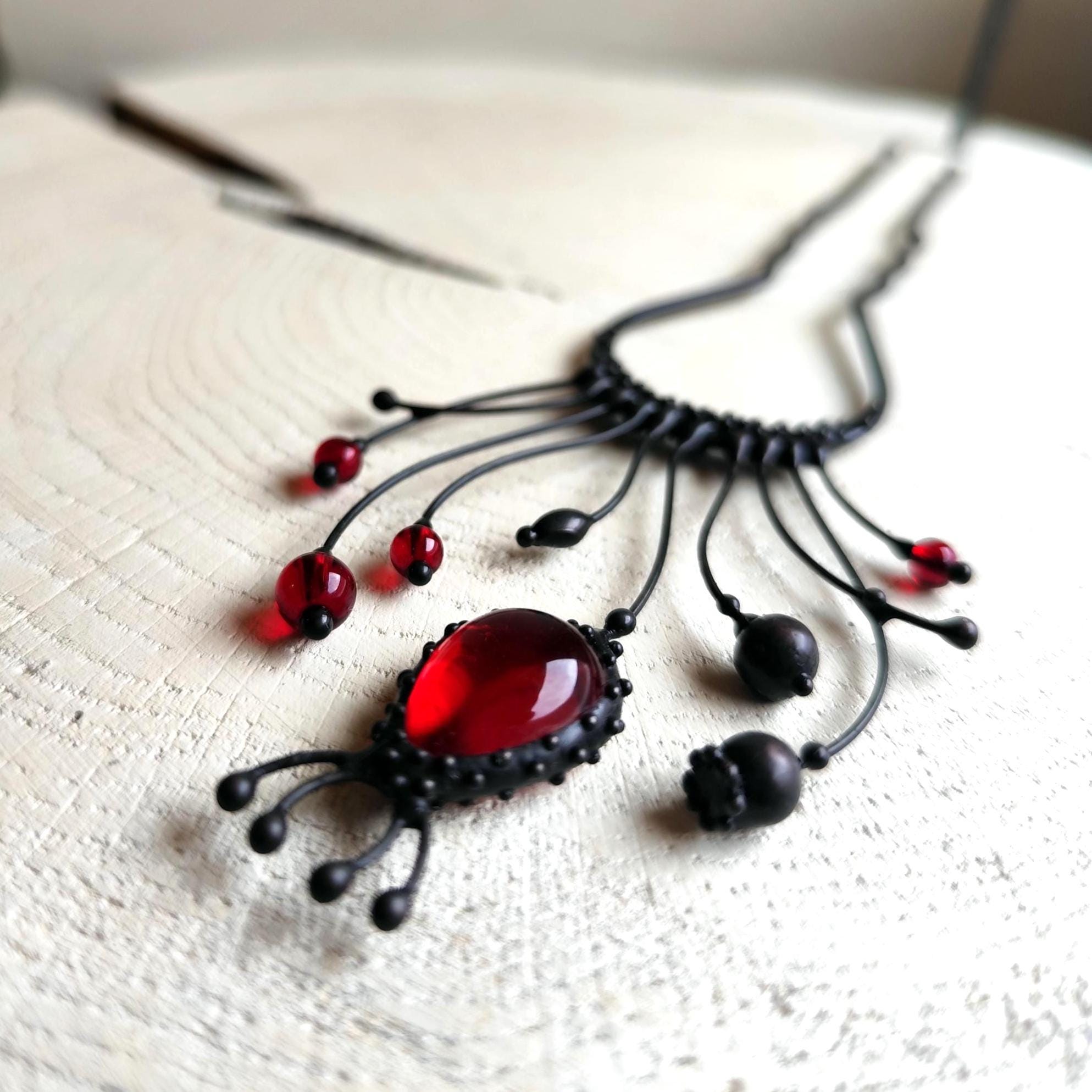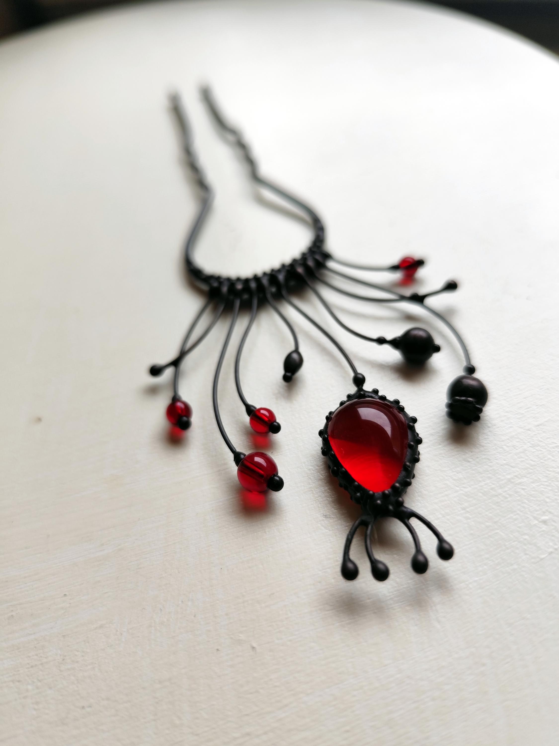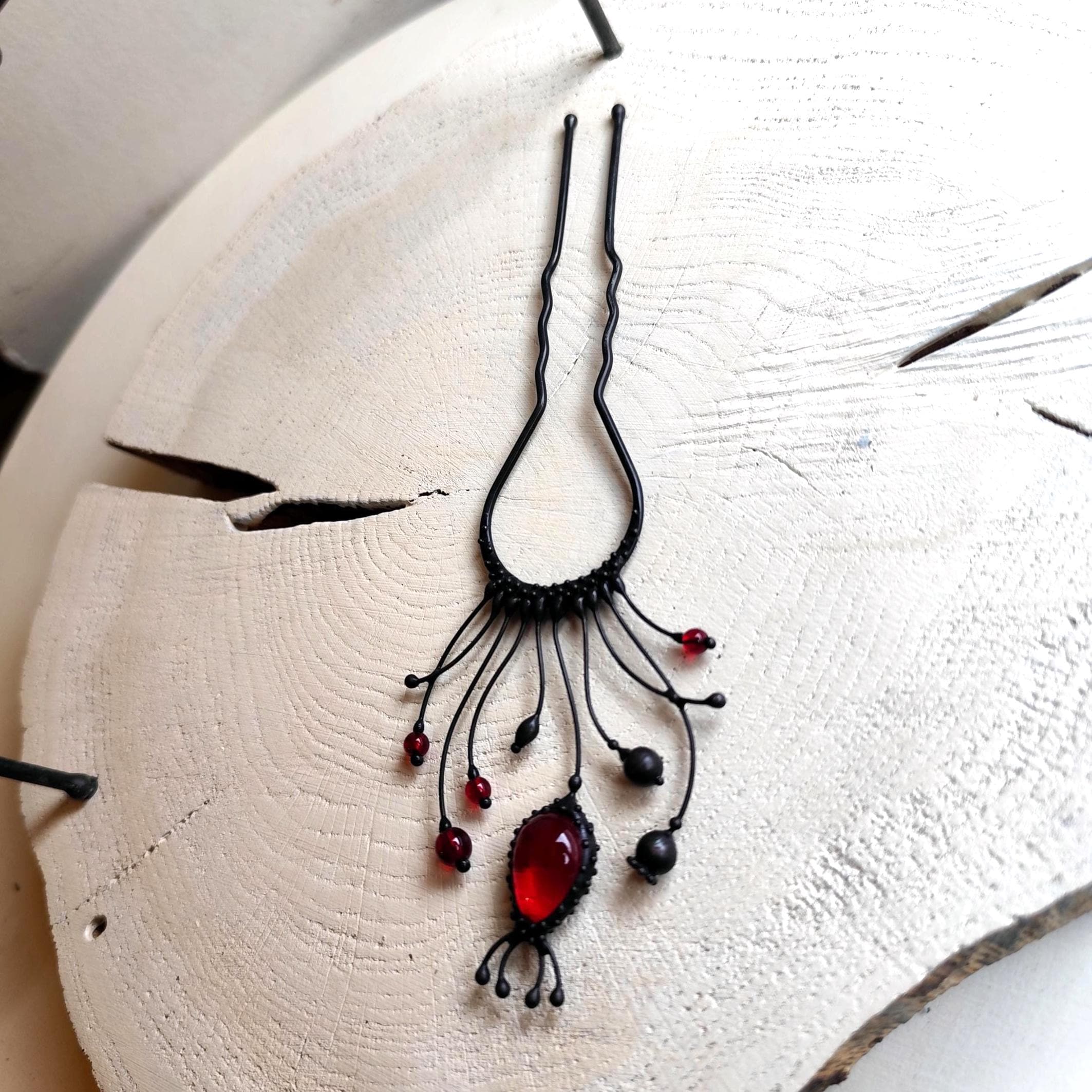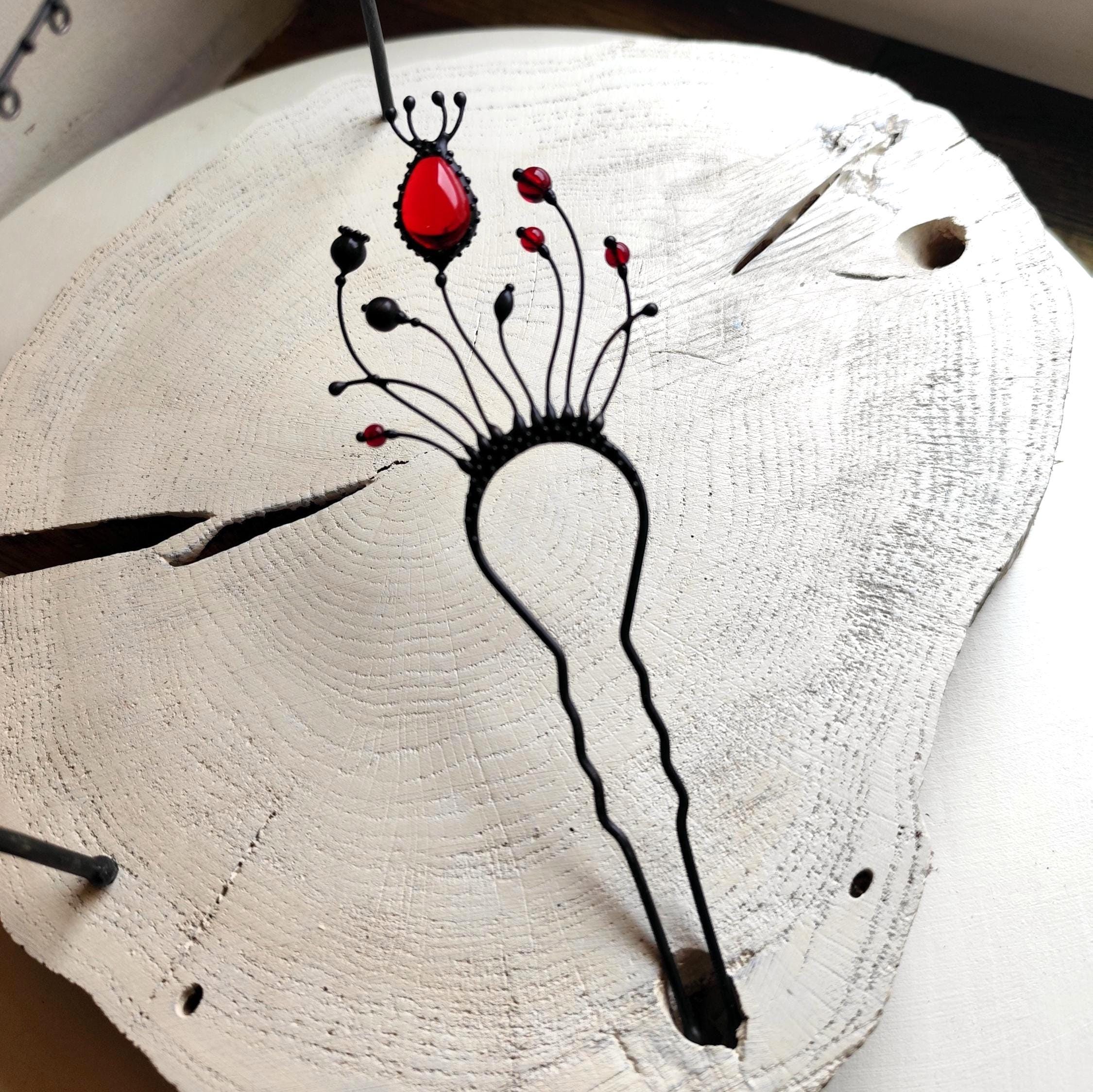 Poppy red wild flowers handcrafted metal hair pin made from copper, pewter, steel and red glass. Covered with patina and treated with antioxidant, sanded, polished. Witchcraft aesthetic sturdy red poppy flowers hair pin. All elements are handmade, which ensures the individuality of each product made in the Yadovito workshop. The copper alloy is polished with a finishing solution to give the jewelry a noble appearance and at the same time so that the metal does not oxidize. Size about 14.5/5 cm (5.7 * 2 in). Color Black/red.