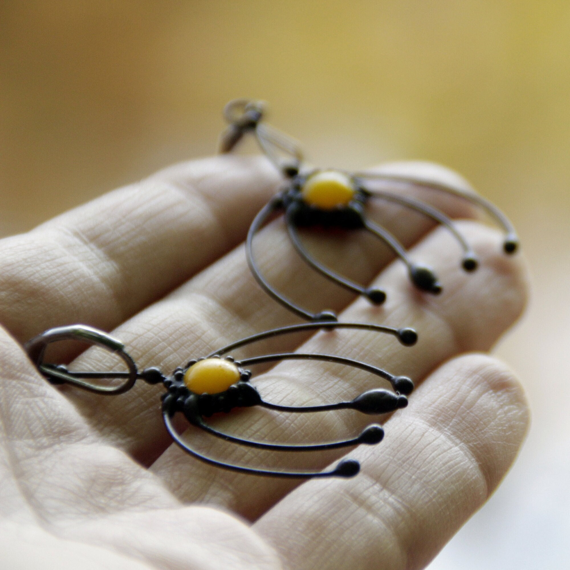 Boho hippie metal flower earrings with yellow glass handmade from copper, pewter, stainless steel, yellow glass. Covered treated with antioxidant, sanded, polished. Unusual, light and sturdy, woodland floral design unusual fairy witchy vibes earrings.All elements are handmade, which ensures the individuality of each product made in the Yadovito workshop. The tin-copper alloy is polished with a finishing solution to give the jewelry a noble appearance and at the same time so that the metal does not oxidize. Color: Black/Yellow. Size about 4/3.5 cm (1.5*1.3 in).