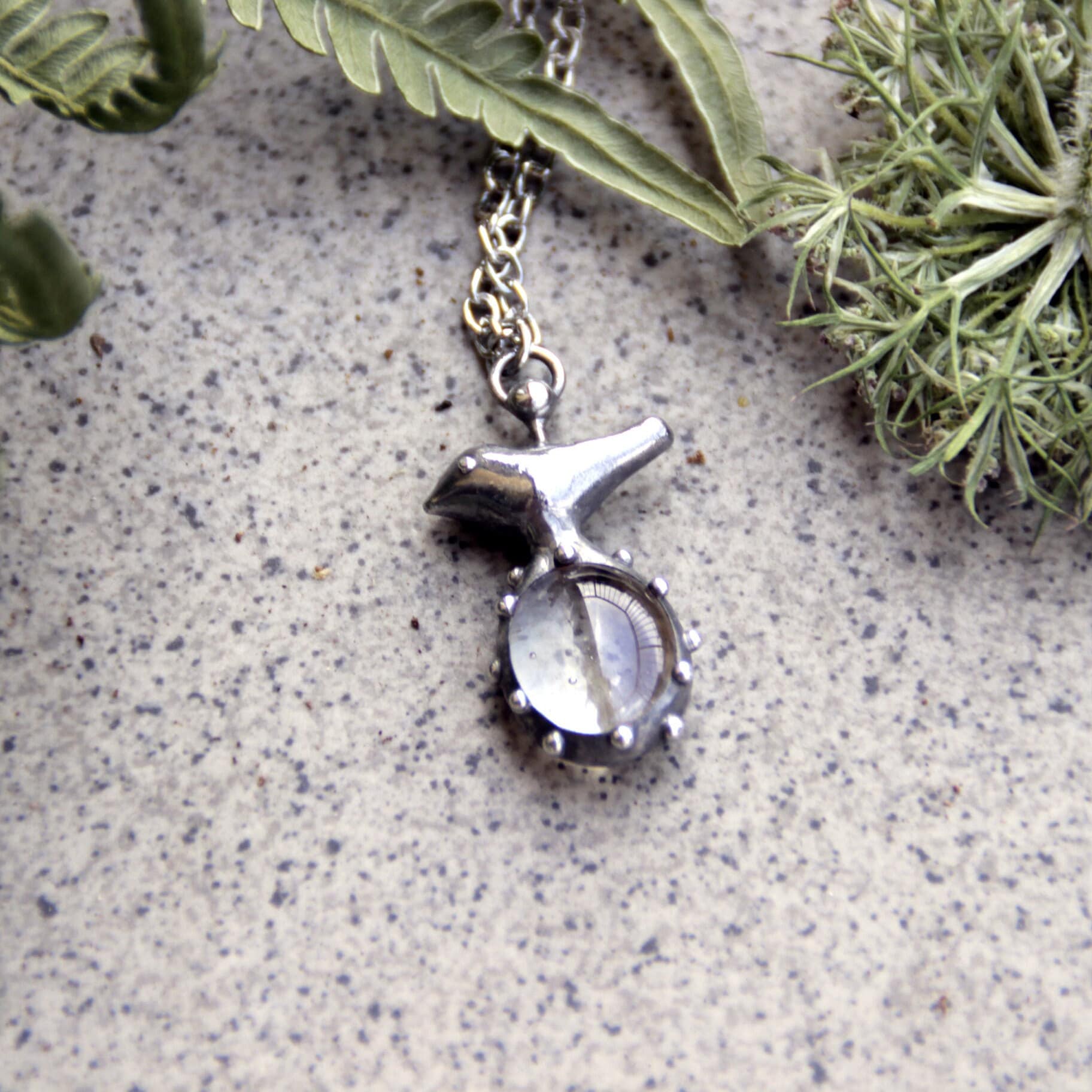 Handcrafted boho bird necklace made from copper, pewter, steel and clear glass. Treated with antioxidant, sanded, polished. Unusual and sturdy metal bird pendant. All elements are handmade, which ensures the individuality of each product made in the Yadovito workshop. Polished with a finishing solution to give the jewelry a noble appearance and at the same time so that the metal does not oxidize. Size 1.5*2.5 cm (1 * 0.6 in). Color silver.