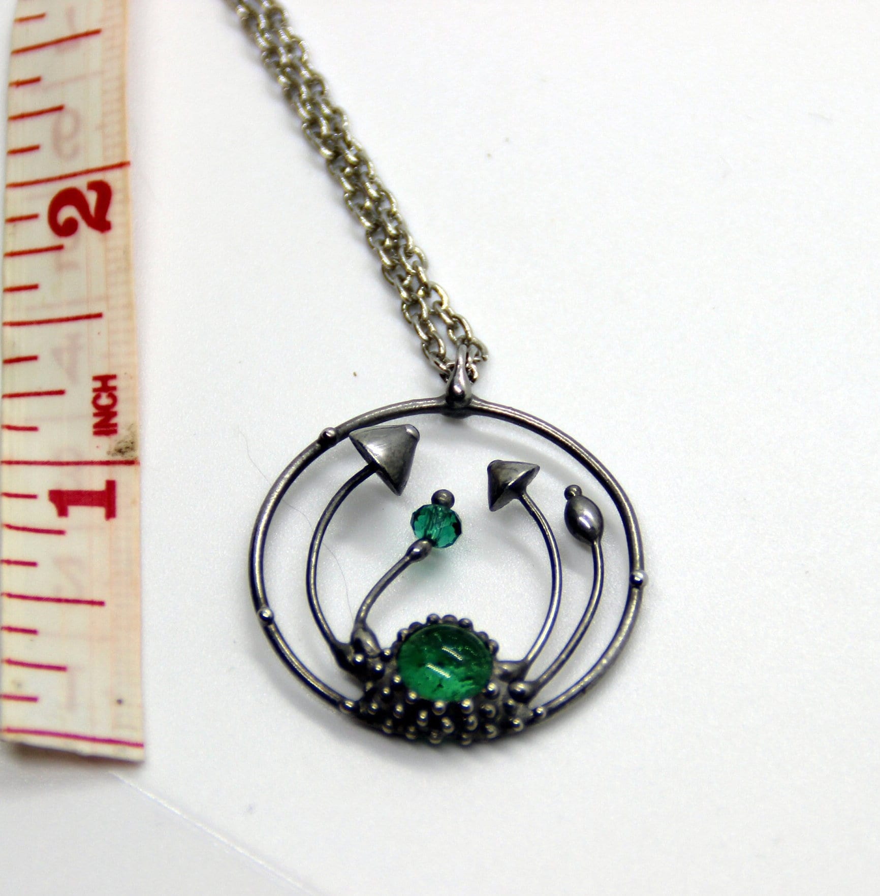 Toadstools magic mushrooms round silver metal pendant handmade from copper, pewter, steel and green glass. Treated with antioxidant, sanded, polished. Unusual botanical fairy witchy pendant light and sturdy.All elements are handmade, which ensures the individuality of each product made in the Yadovito workshop. Polished with a finishing solution to give the jewelry a noble appearance and at the same time so that the metal does not oxidize. aesthetic nature forest necklace use glass melted in a special furnace. After melting, the glass takes on an almost unique shape and amazing color shades that play in the light. Color: Black/green. Size about 4/4 cm (1.57 in).