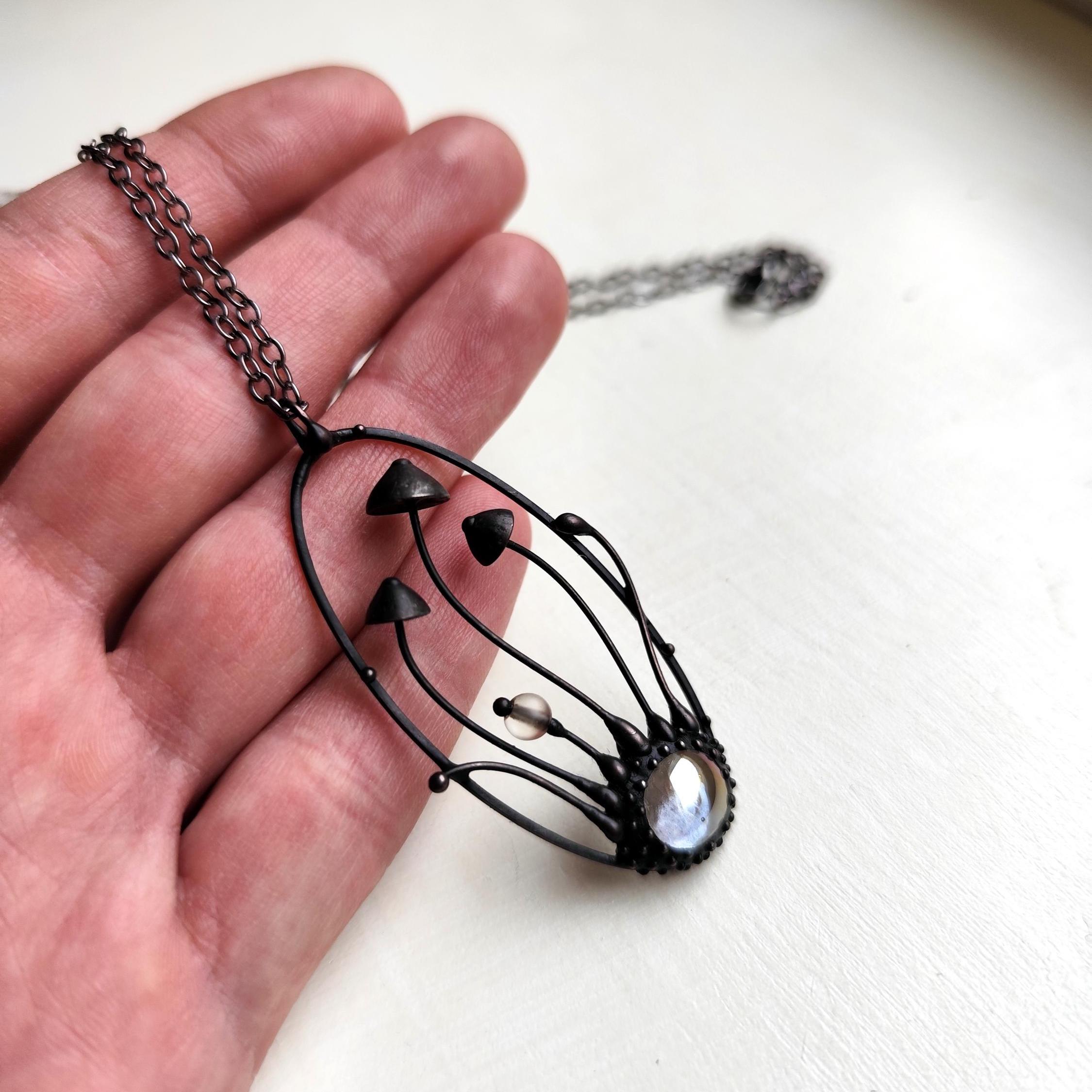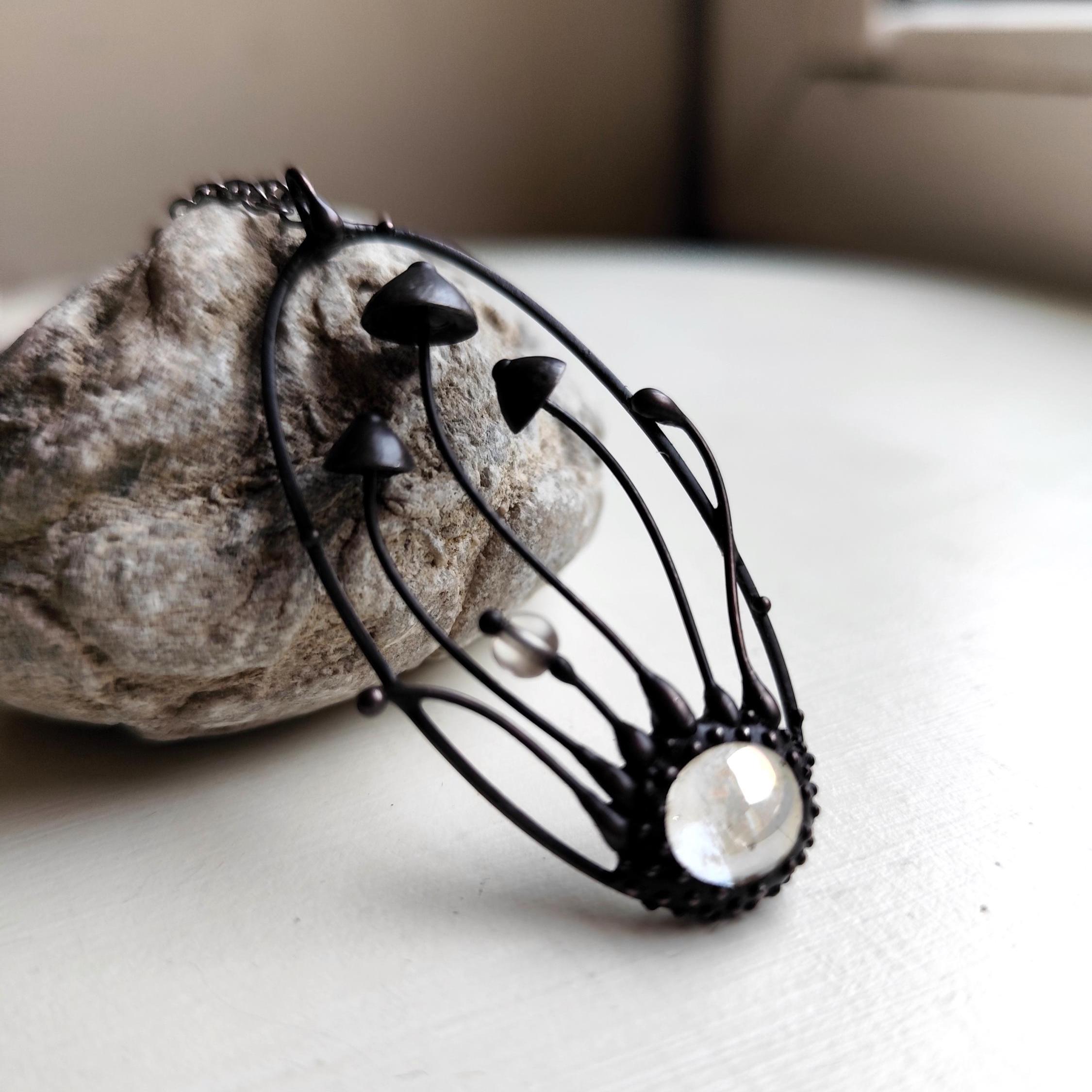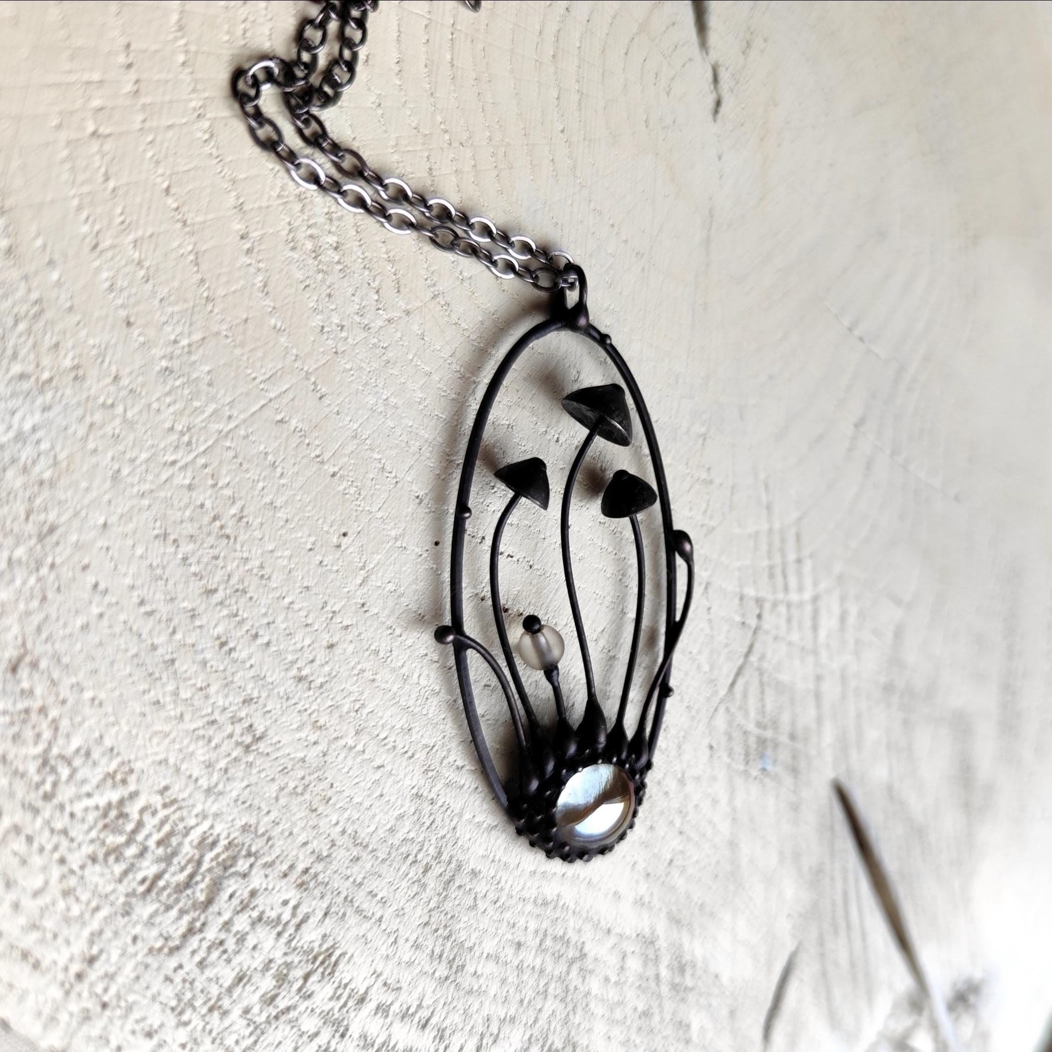Botanical hippie boho mushrooms psylocibe necklace handmade from copper, pewter. steel and clear glass. Covered with patina and treated with antioxidant, sanded, polished. Unusual and statement, sturdy forest fungi pendant inspired by wild nature. All elements are handmade, which ensures the individuality of each product made in the Yadovito workshop. The copper alloy is coated with a black patina to color the metal black, polished with a finishing solution to give the jewelry a noble appearance and at the same time so that the metal does not oxidize. The mushroom oval necklace use glass melted in a special furnace. After melting, the glass takes on an almost unique shape and amazing color shades that play in the light. Size about 5/2.5 cm (2 * 1 in).