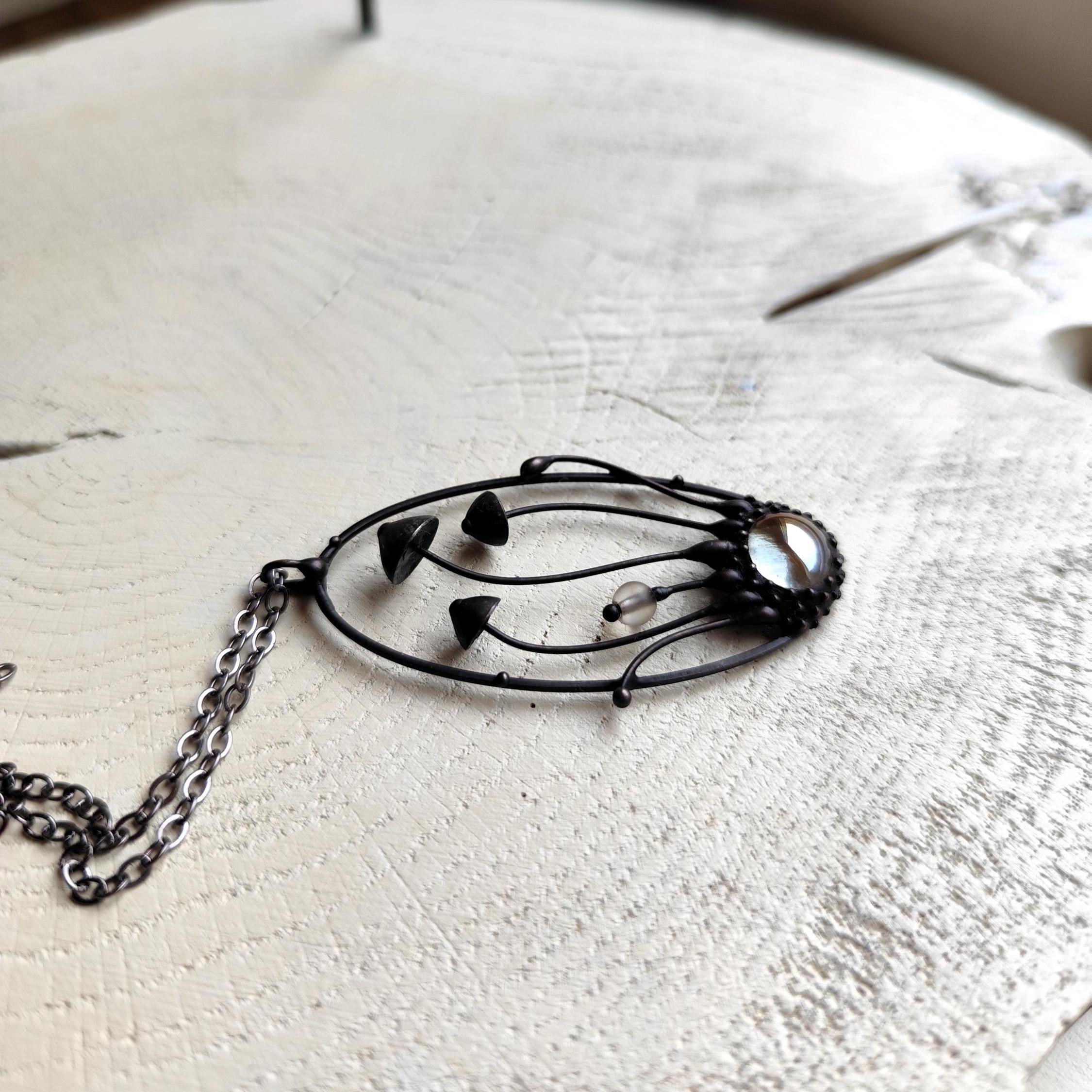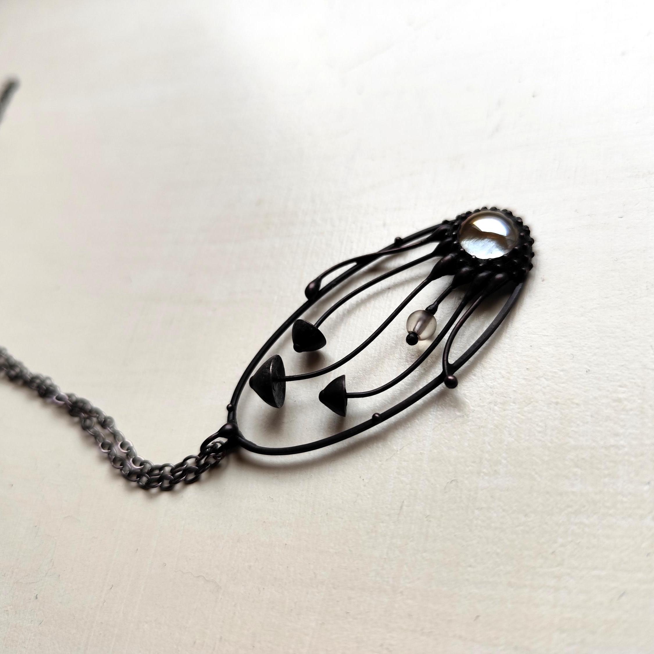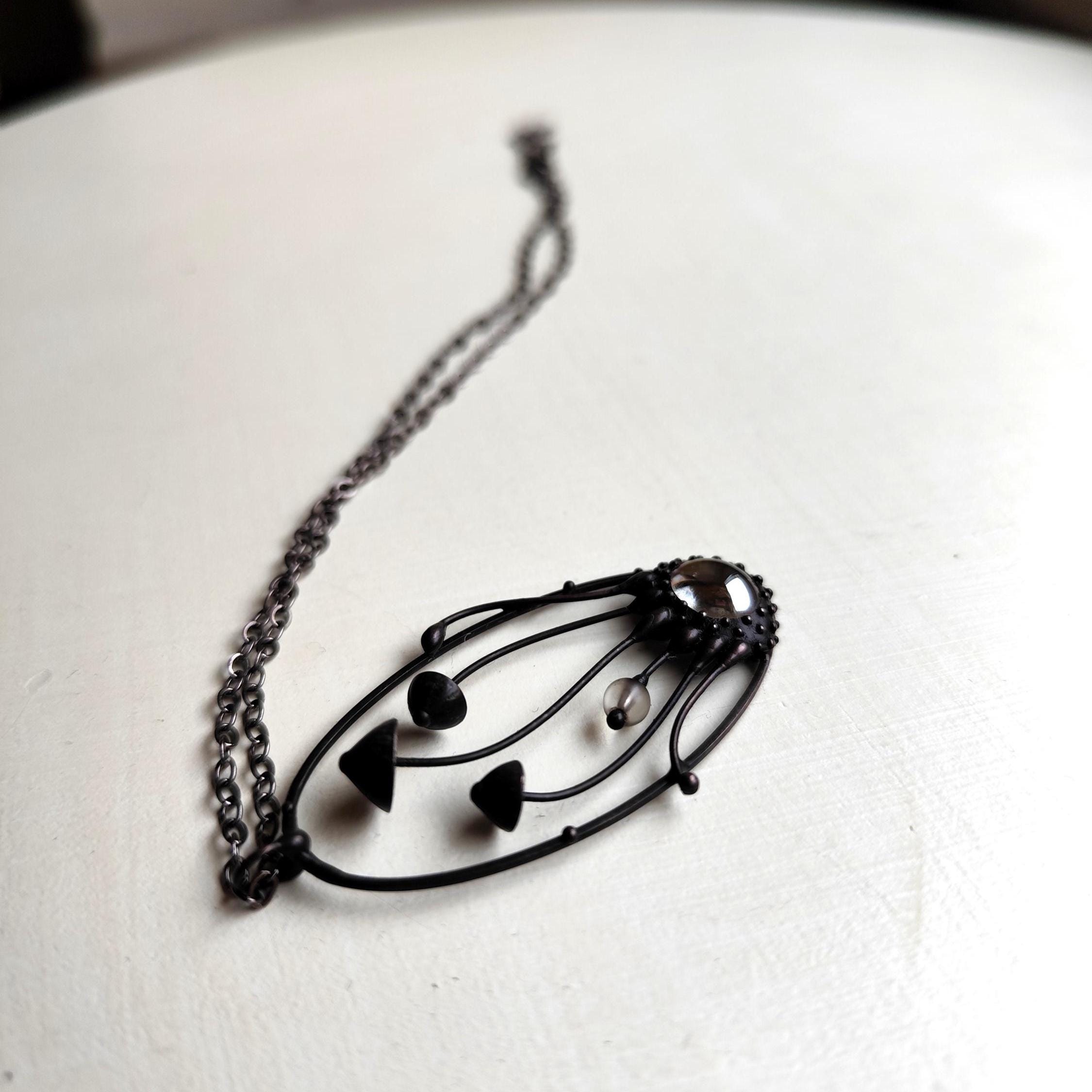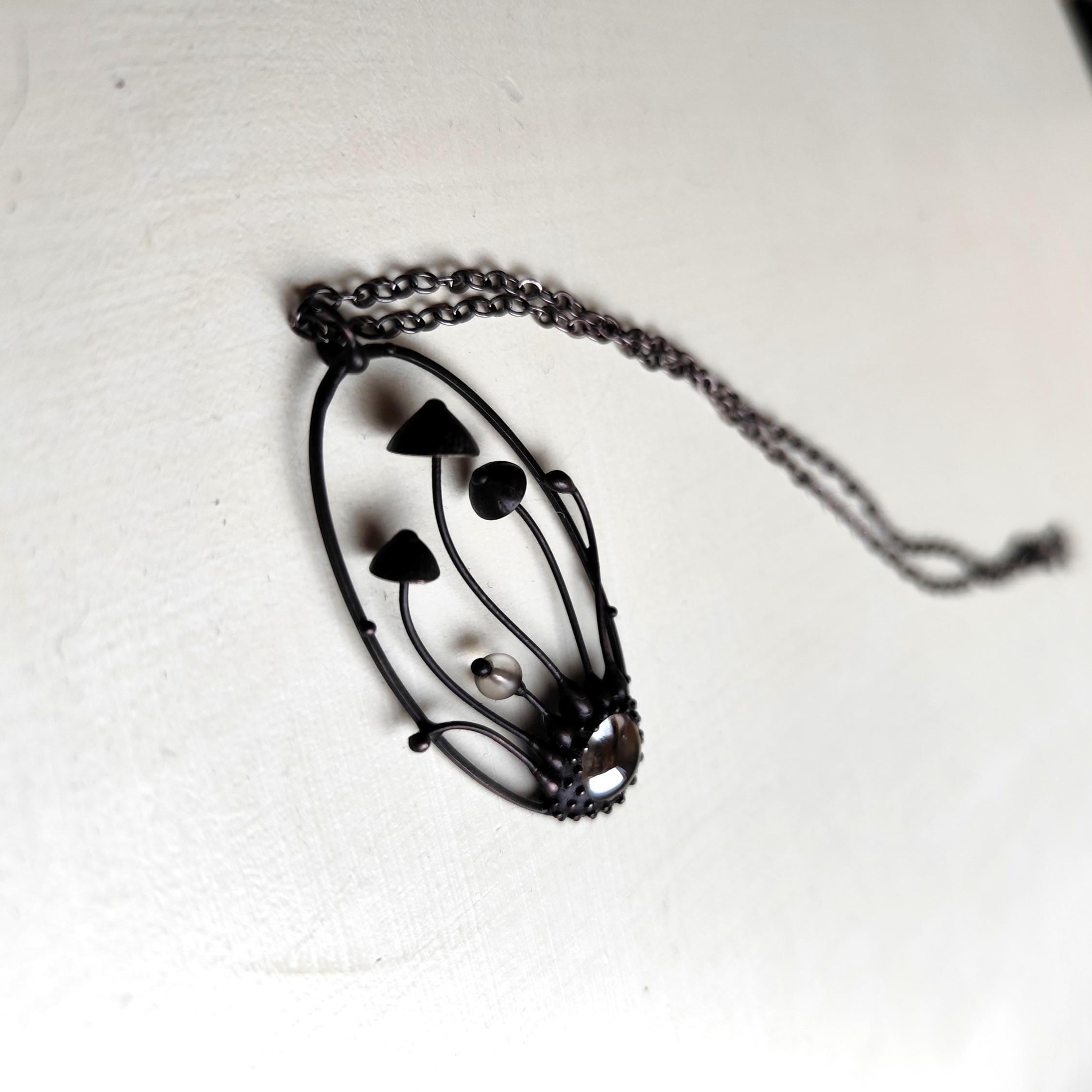 Botanical hippie boho mushrooms psylocibe necklace handmade from copper, pewter. steel and clear glass. Covered with patina and treated with antioxidant, sanded, polished. Unusual and statement, sturdy forest fungi pendant inspired by wild nature. All elements are handmade, which ensures the individuality of each product made in the Yadovito workshop. The copper alloy is coated with a black patina to color the metal black, polished with a finishing solution to give the jewelry a noble appearance and at the same time so that the metal does not oxidize. The mushroom oval necklace use glass melted in a special furnace. After melting, the glass takes on an almost unique shape and amazing color shades that play in the light. Size about 5/2.5 cm (2 * 1 in).