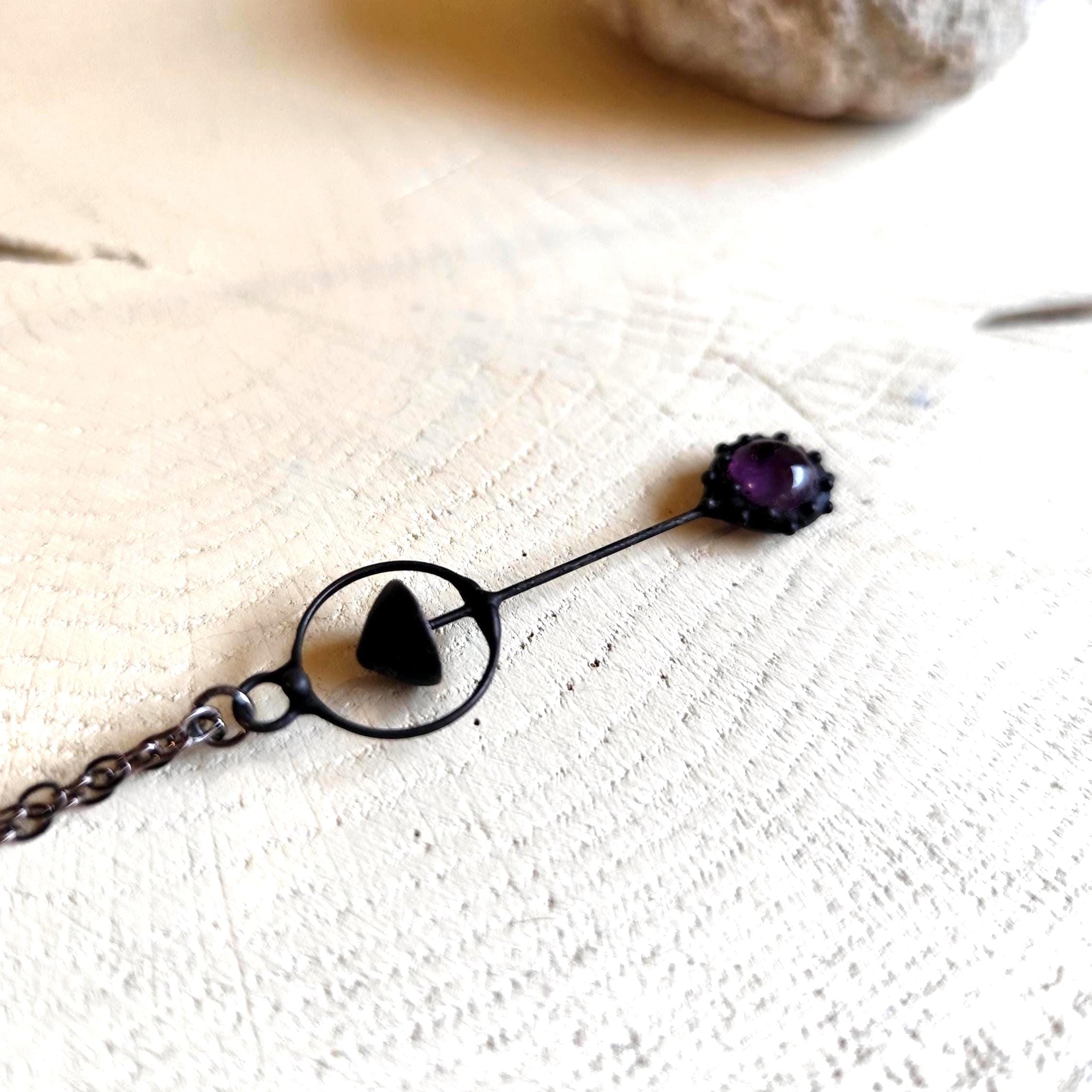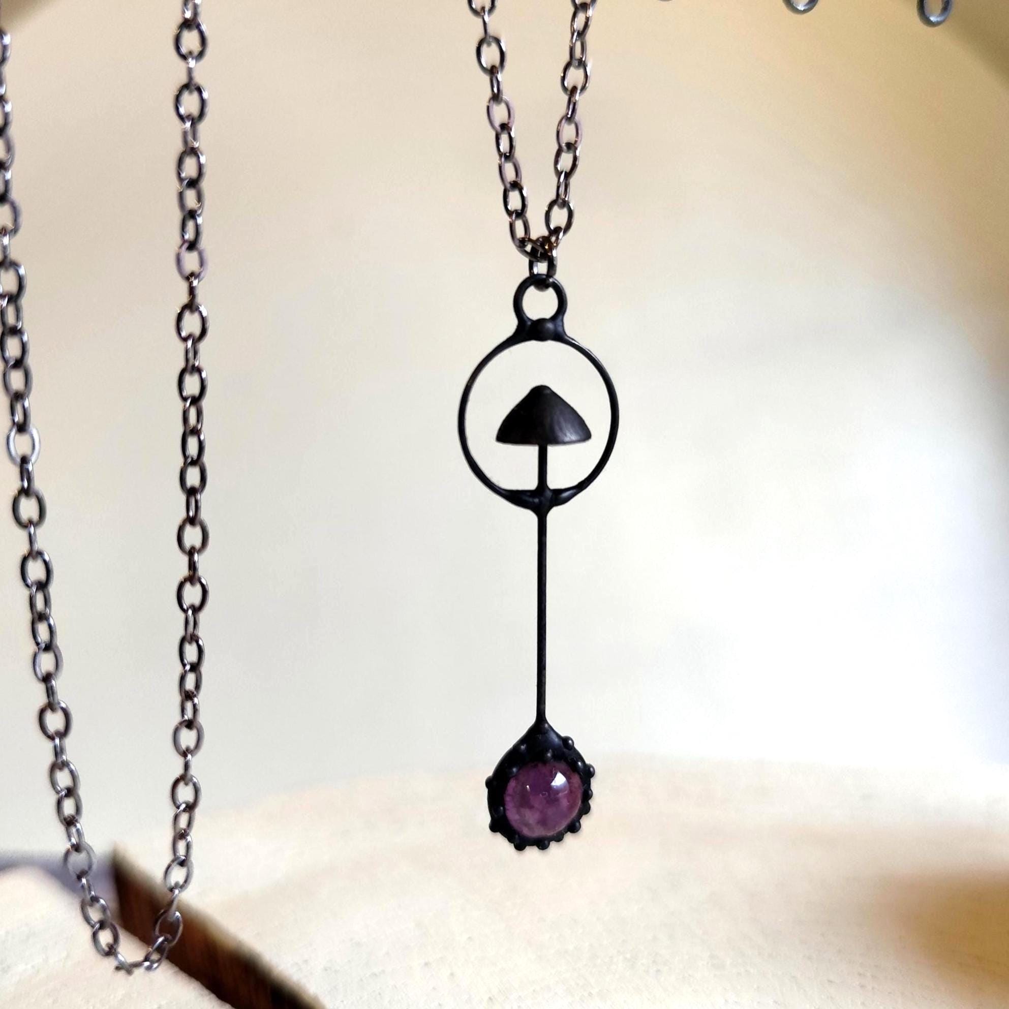 Witchcraft aesthetic magic mushroom small metal forest pendant handmade from copper, pewter, steel and amethyst. Covered with patina and treated with antioxidant, sanded, polished. Light and sturdy weird mushroom necklace. All elements are handmade, which ensures the individuality of each product made in the Yadovito workshop. The tin-copper alloy is coated with a black patina to color the metal black, polished with a finishing solution to give the jewelry a noble appearance and at the same time so that the metal does not oxidize. Size about 5/1 cm (1.9 * 0.4 in). Color black/purple.