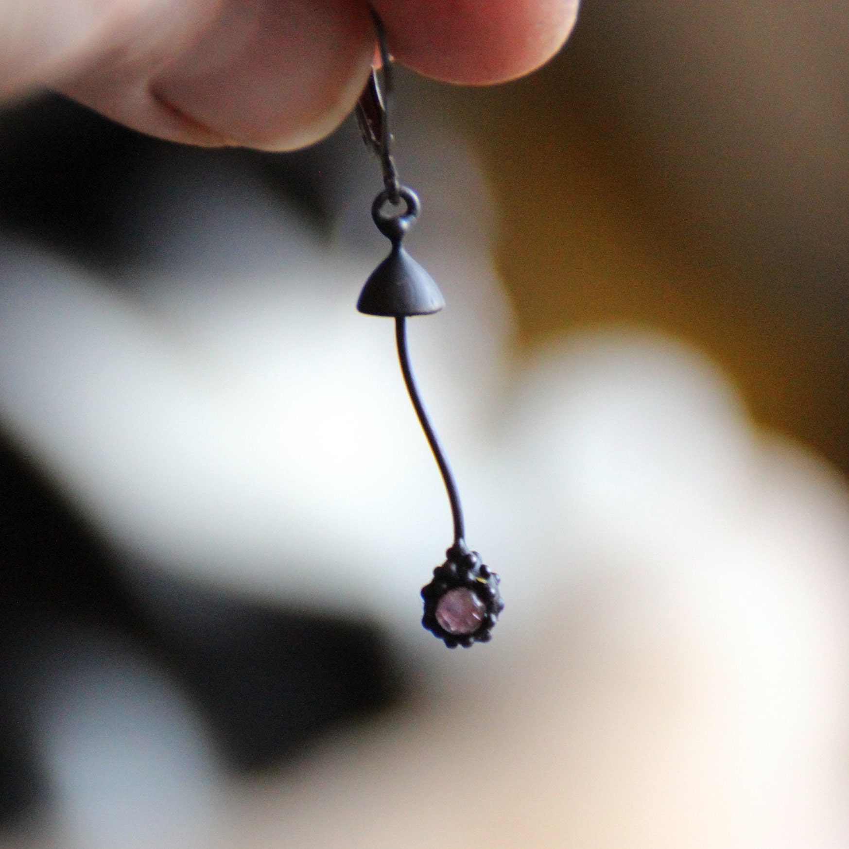 Magic mushroom boho botanical single one earring handmade from copper, pewter, steel, amethyst stone. The earring is light and sturdy. All elements are handmade, which ensures the individuality of each product made in the Yadovito workshop. Covered with patina and treated with antioxidant, sanded, polished. The copper alloy is polished with a finishing solution to give the jewelry a noble appearance and at the same time so that the metal does not oxidize. Each jewelry looks individually, because mushroom caps are made by hand, and not cast or stamped. Size about 3.5/0.5 cm (1.3 * 0.2 in). Color Black/purple.