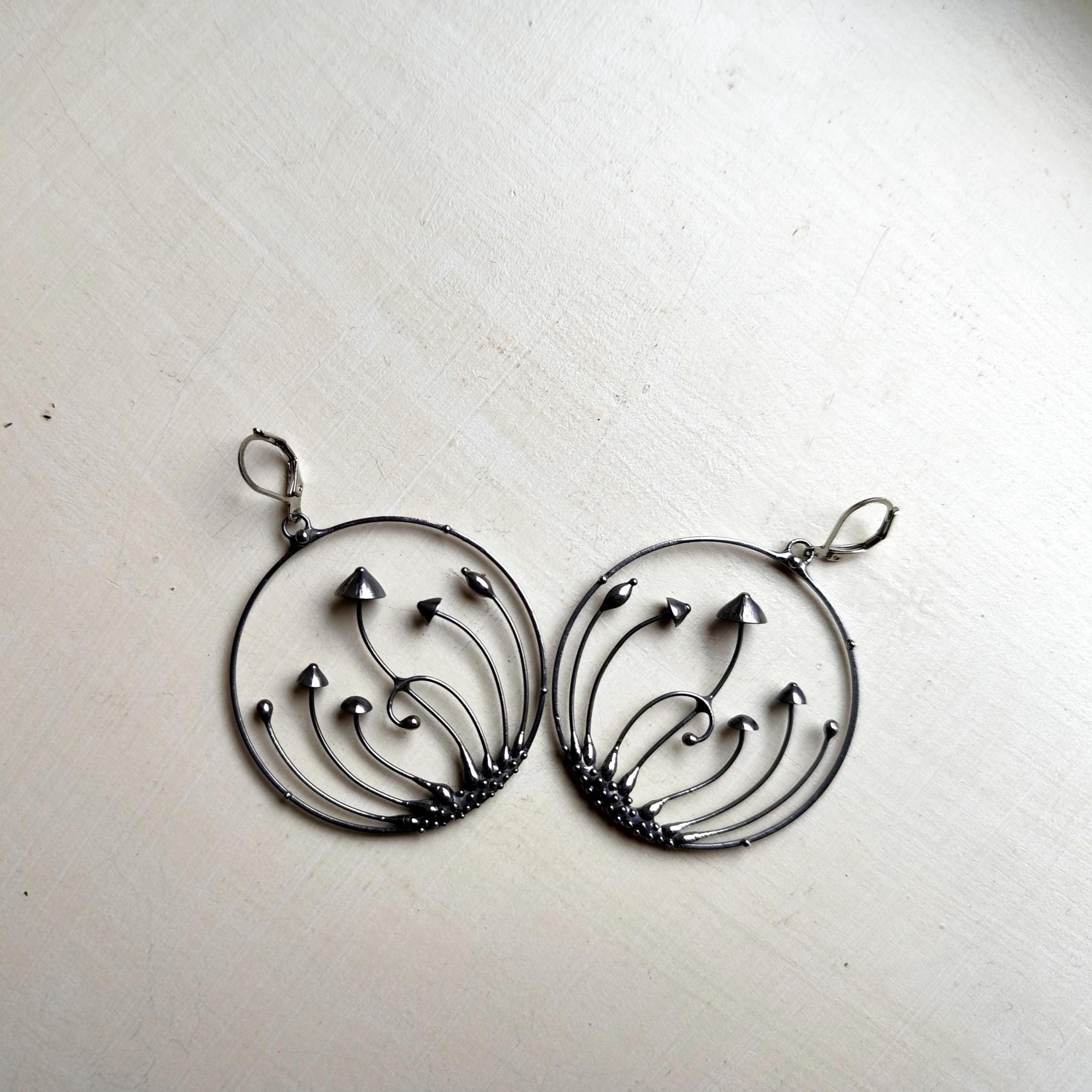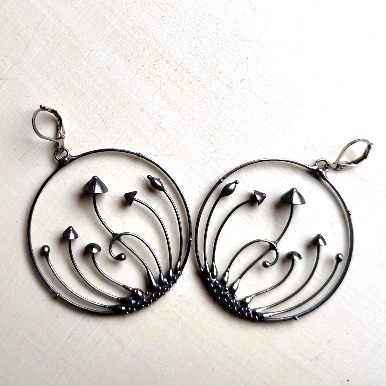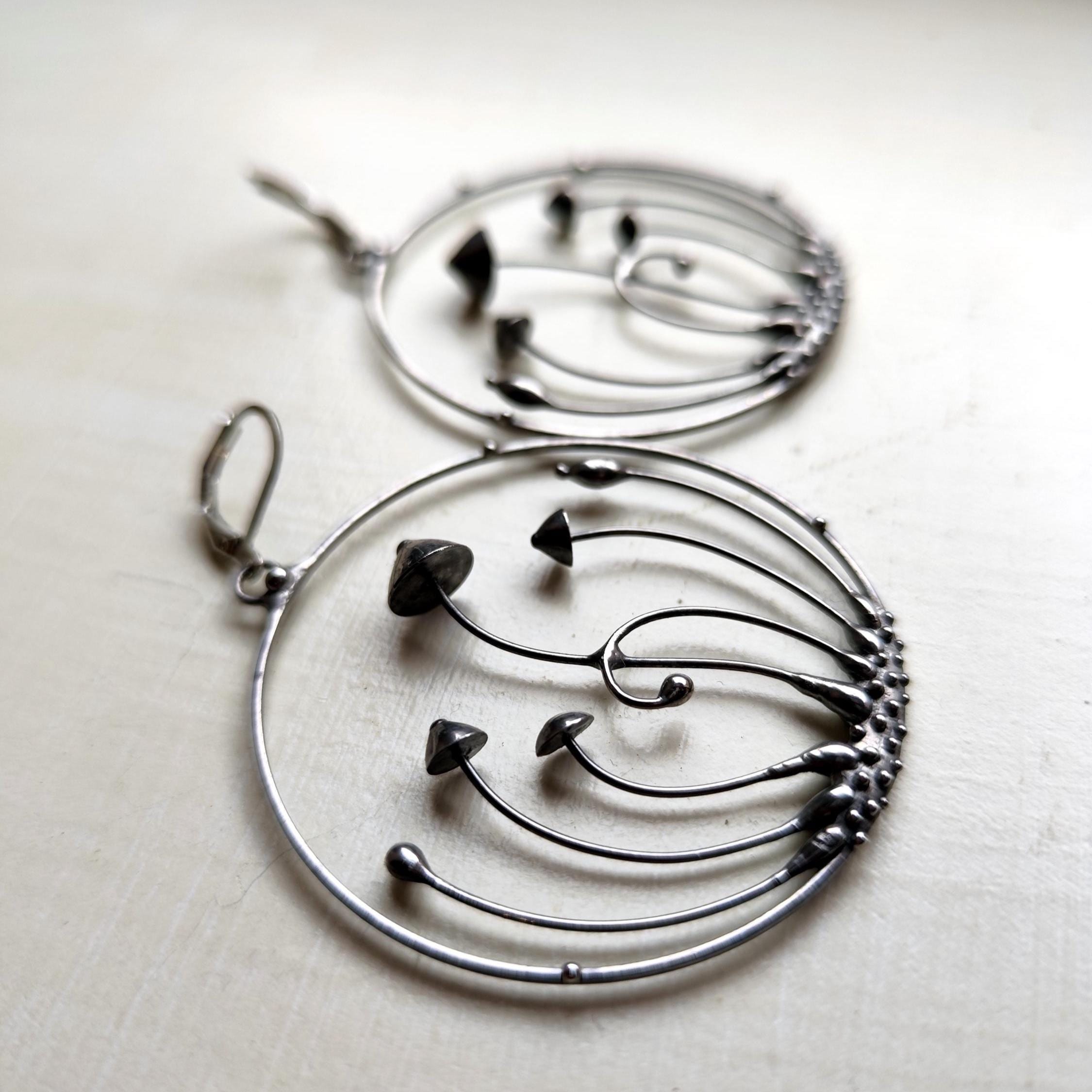 Minimalist modern design forest botanical hoops earrings mushrooms hand made from copper, pewter, steel. Treated with antioxidant, sanded, polished. Sturdy and light psychedelic hoops earrings. All elements are handmade, which ensures the individuality of each product made in the Yadovito workshop. Each jewelry looks individually, because mushroom caps are made by hand, and not cast or stamped. The earrings are made of a shiny metal and have a modern, minimalist style. Size about 5 cm (2 in) diameter. Color silver.