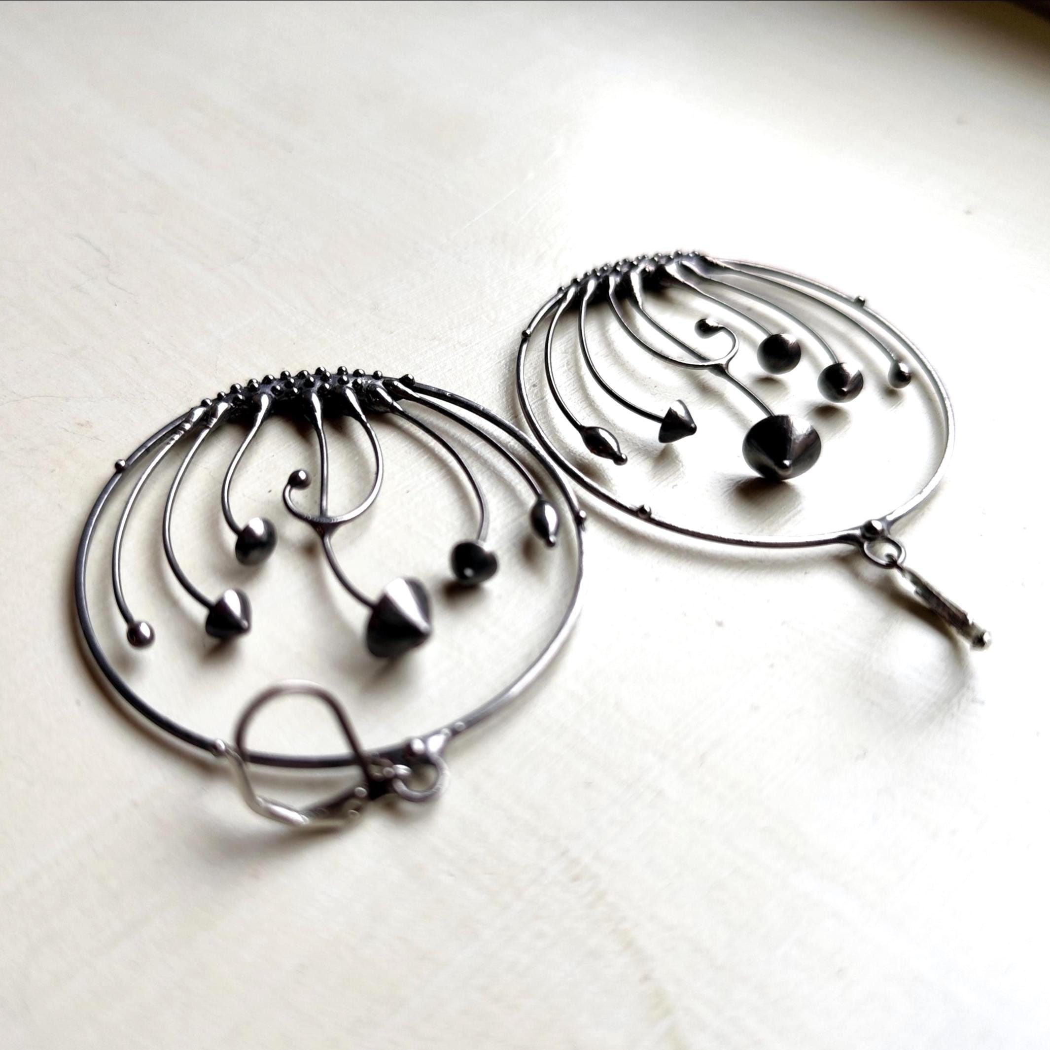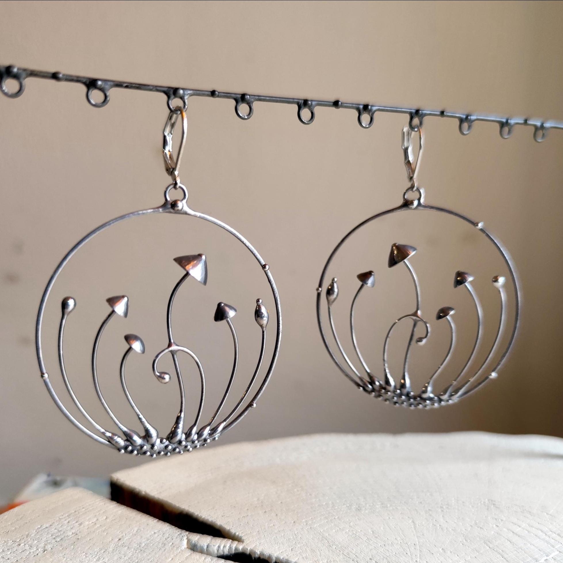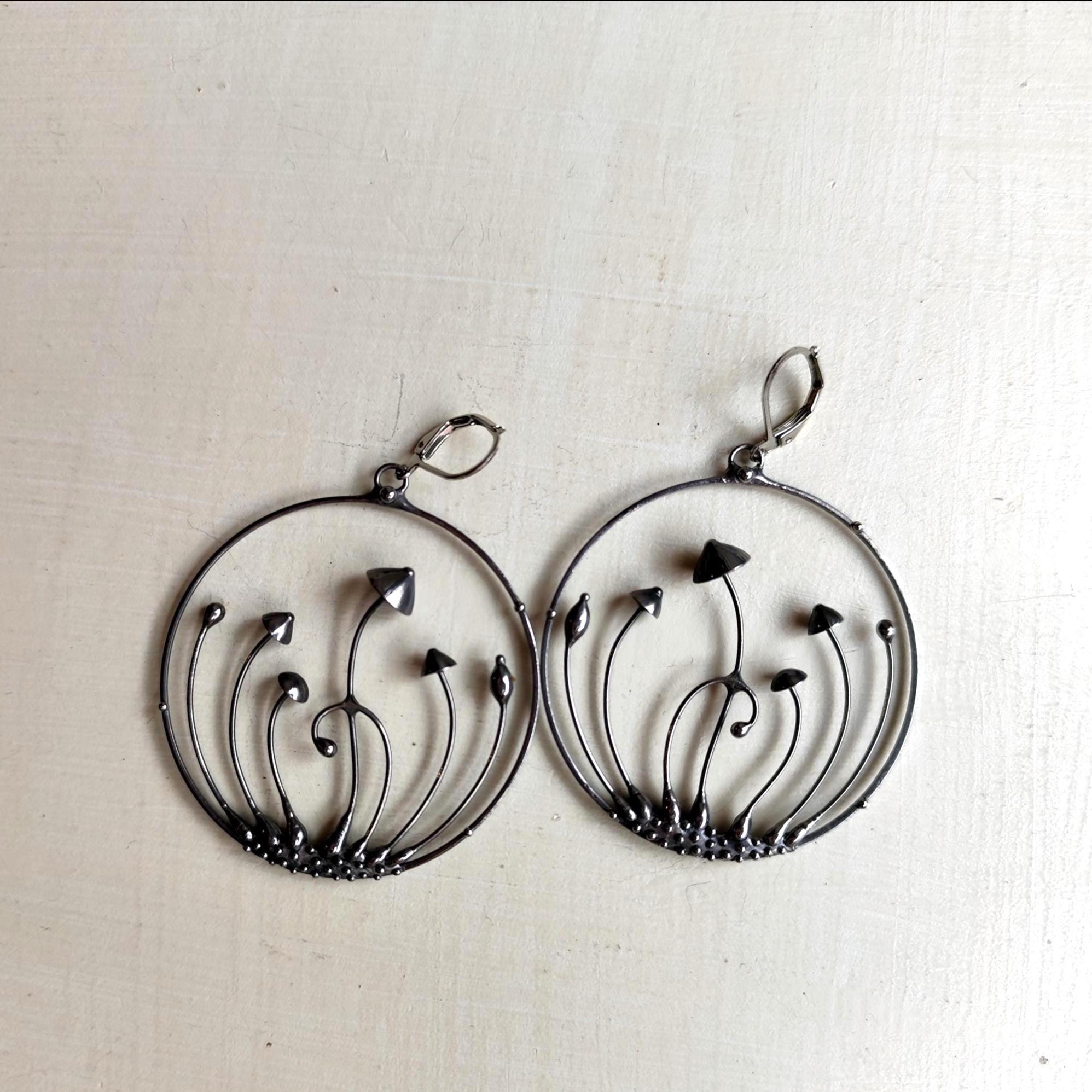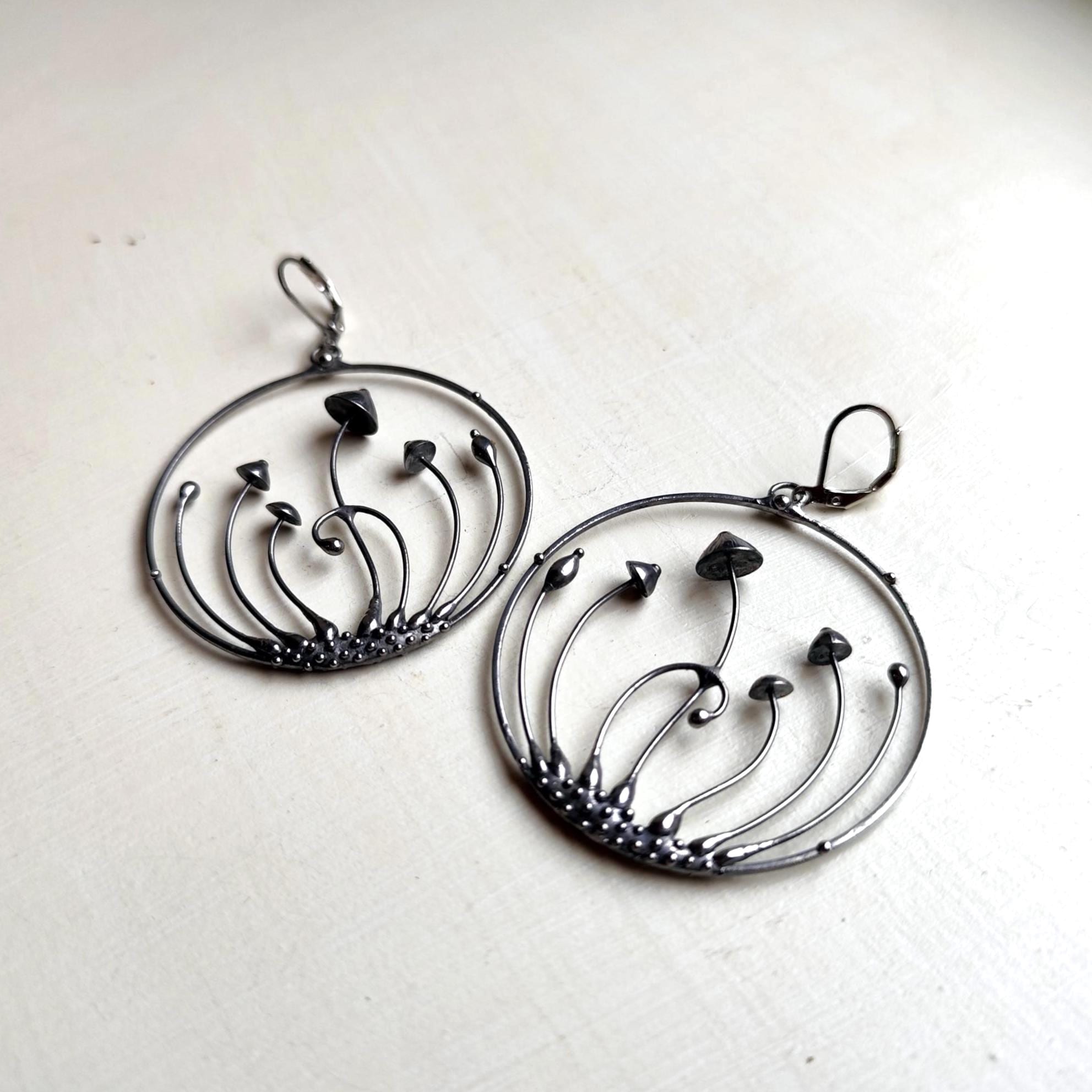 Minimalist modern design forest botanical hoops earrings mushrooms hand made from copper, pewter, steel. Treated with antioxidant, sanded, polished. Sturdy and light psychedelic hoops earrings. All elements are handmade, which ensures the individuality of each product made in the Yadovito workshop. Each jewelry looks individually, because mushroom caps are made by hand, and not cast or stamped. The earrings are made of a shiny metal and have a modern, minimalist style. Size about 5 cm (2 in) diameter. Color silver.