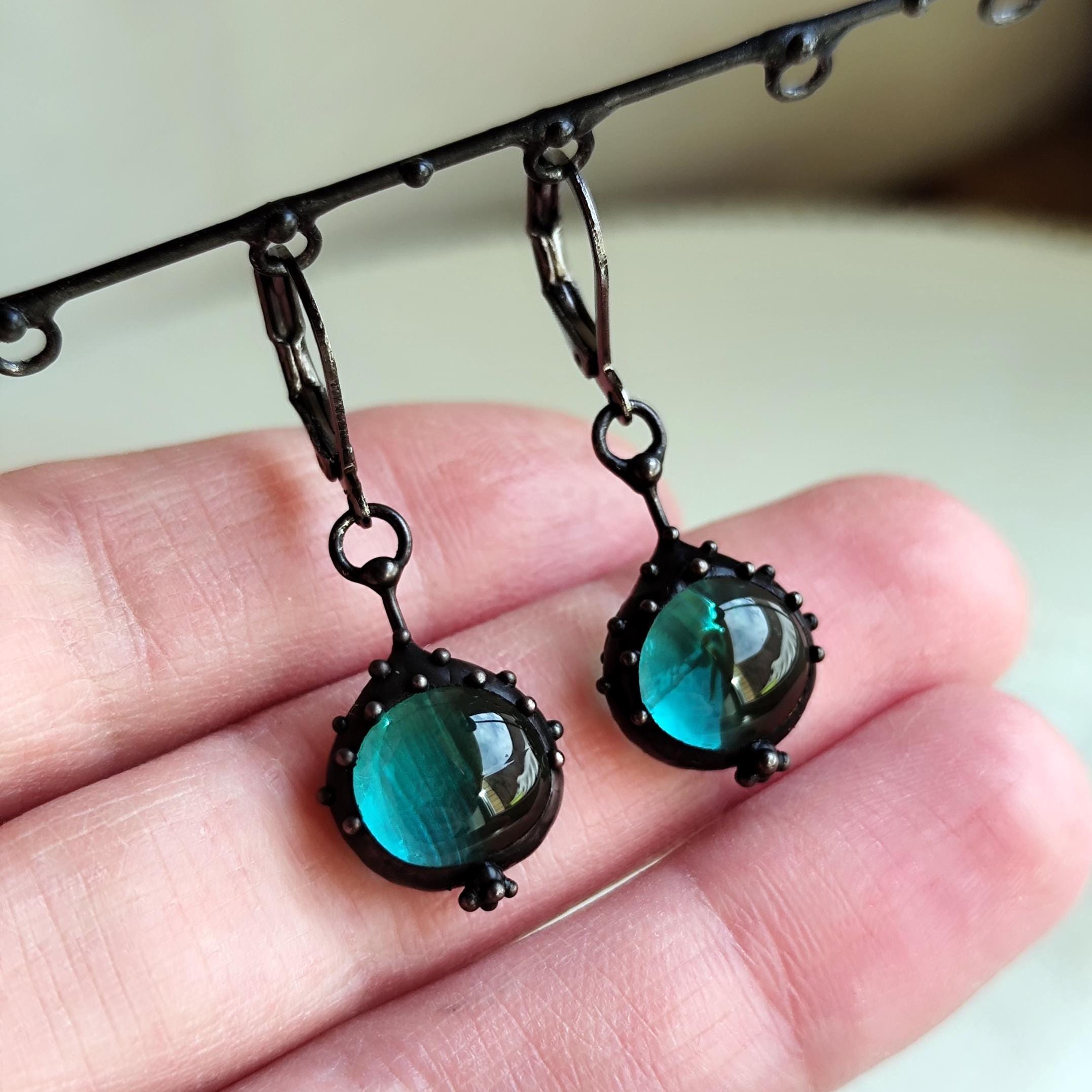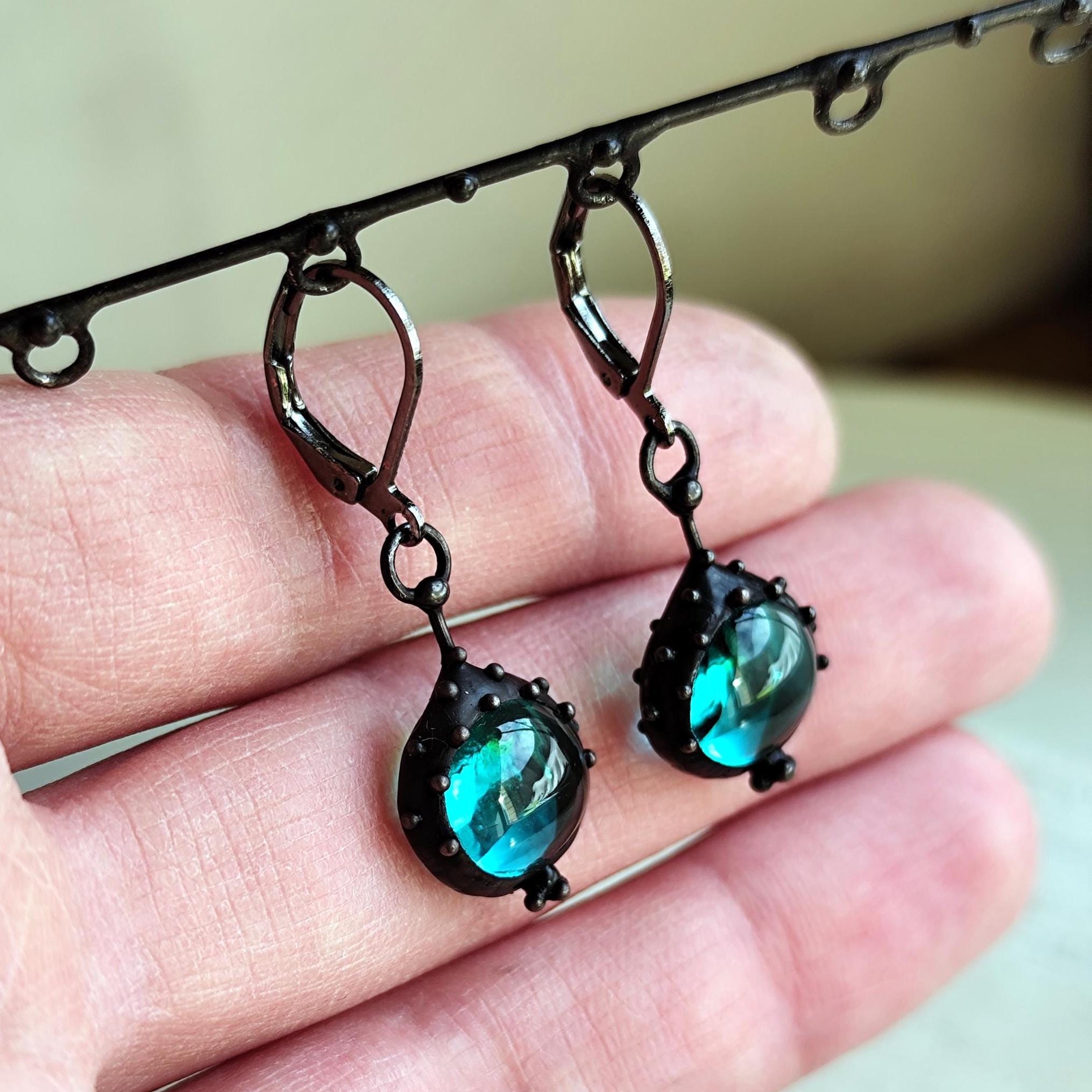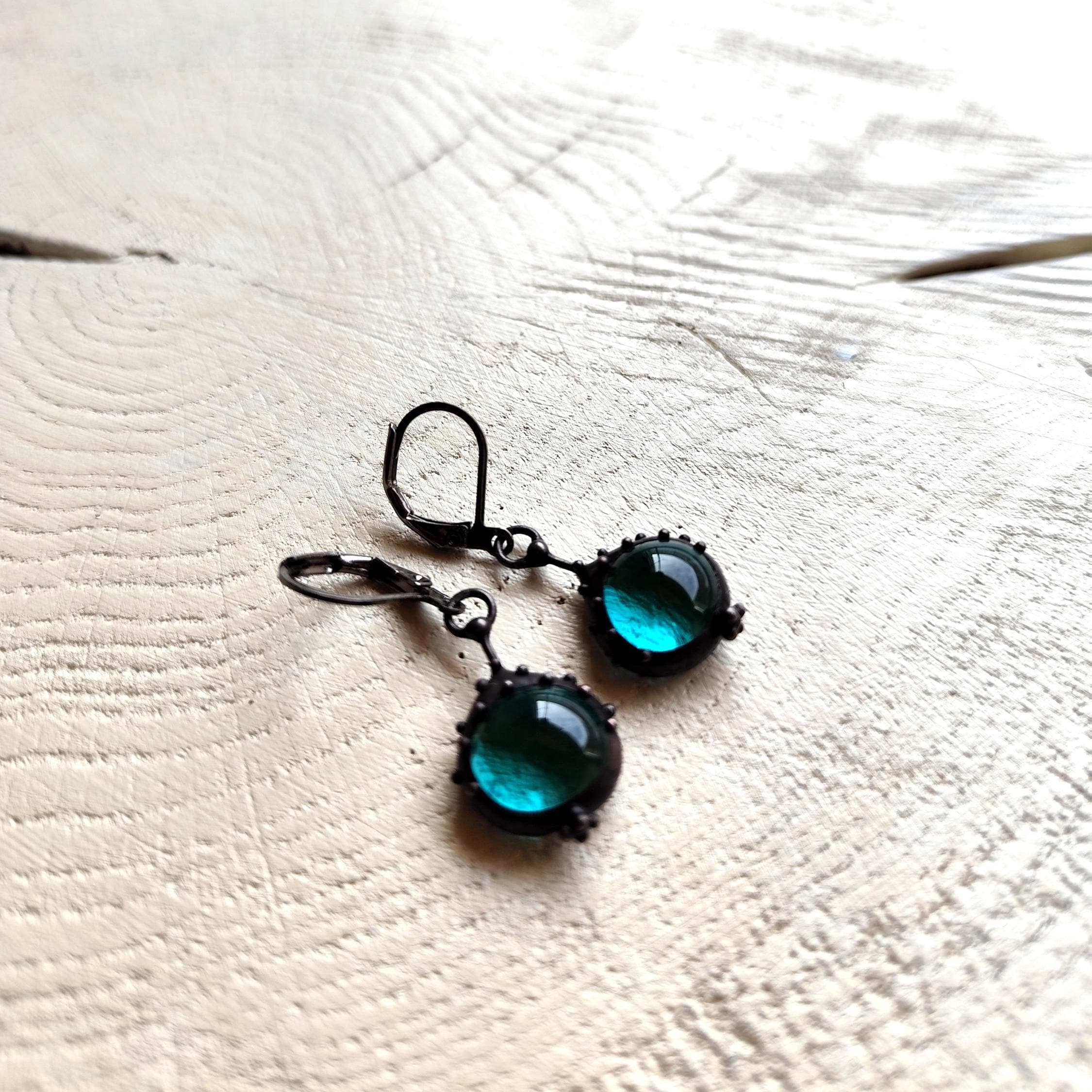 Suncatchers unique blue stained glass boho author's earrings handmade from copper, steel, pewter, blue glass. Covered with patina, treated with antioxidant, sanded, polished. Simple and sturdy, suncatcher unique blue glass earrings author's hippie jewelry. All elements are handmade, which ensures the individuality of each product made in the Yadovito workshop. The copper alloy is polished with a finishing solution to give the jewelry a noble appearance and at the same time so that the metal does not oxidize. Earrings use glass melted in a special furnace. After melting, the glass takes on an almost unique shape and amazing color. Color: Black/Blue. Size about 2/1 cm (0.8 * 0.4 in).