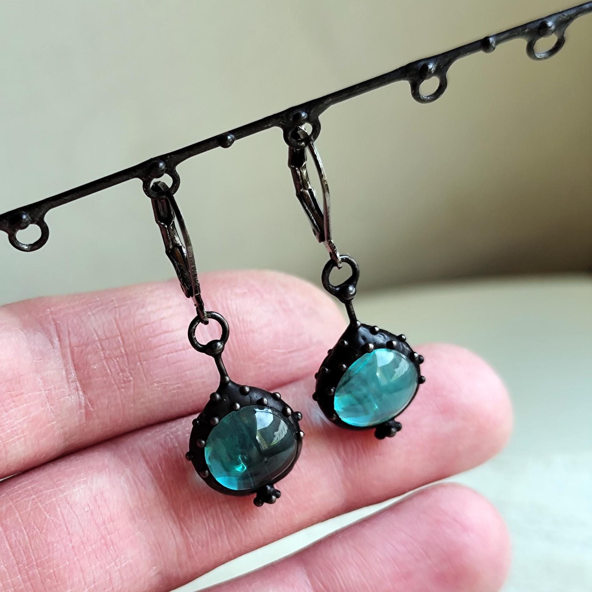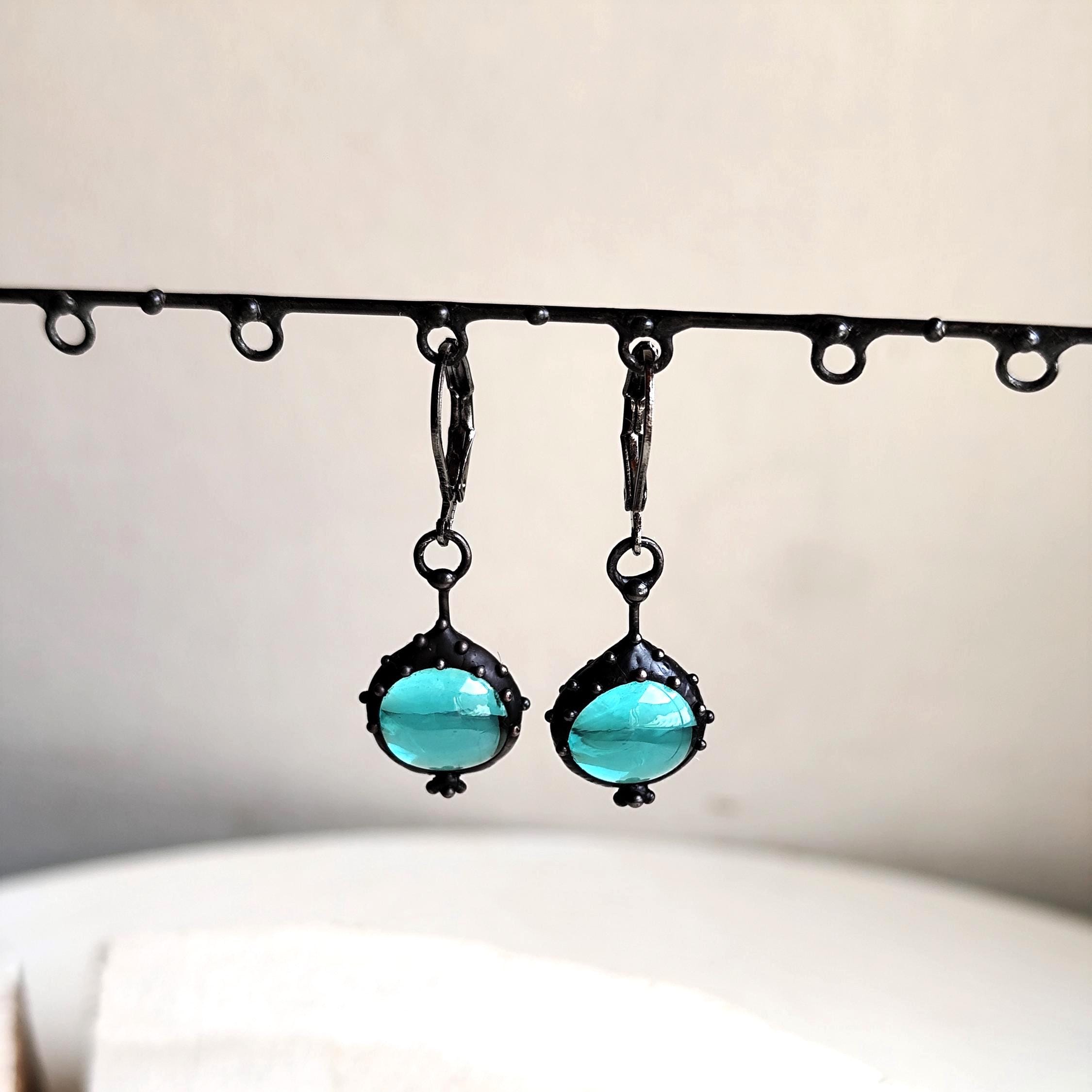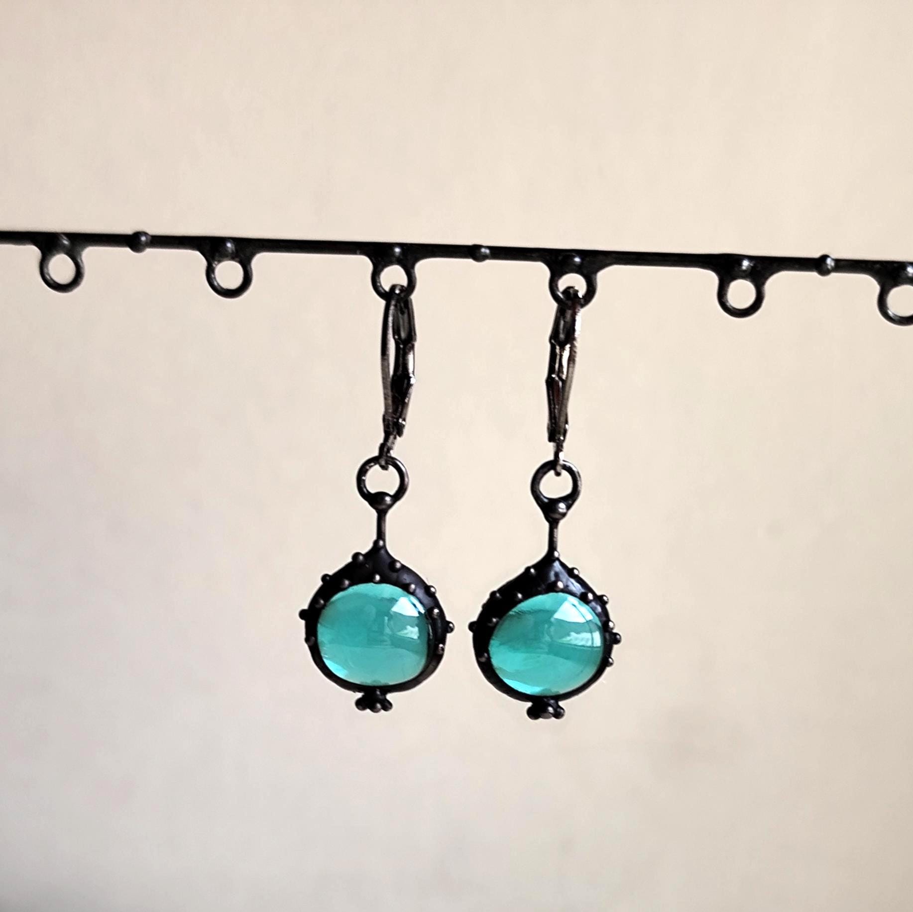 Suncatchers unique blue stained glass boho author's earrings handmade from copper, steel, pewter, blue glass. Covered with patina, treated with antioxidant, sanded, polished. Simple and sturdy, suncatcher unique blue glass earrings author's hippie jewelry. All elements are handmade, which ensures the individuality of each product made in the Yadovito workshop. The copper alloy is polished with a finishing solution to give the jewelry a noble appearance and at the same time so that the metal does not oxidize. Earrings use glass melted in a special furnace. After melting, the glass takes on an almost unique shape and amazing color. Color: Black/Blue. Size about 2/1 cm (0.8 * 0.4 in).