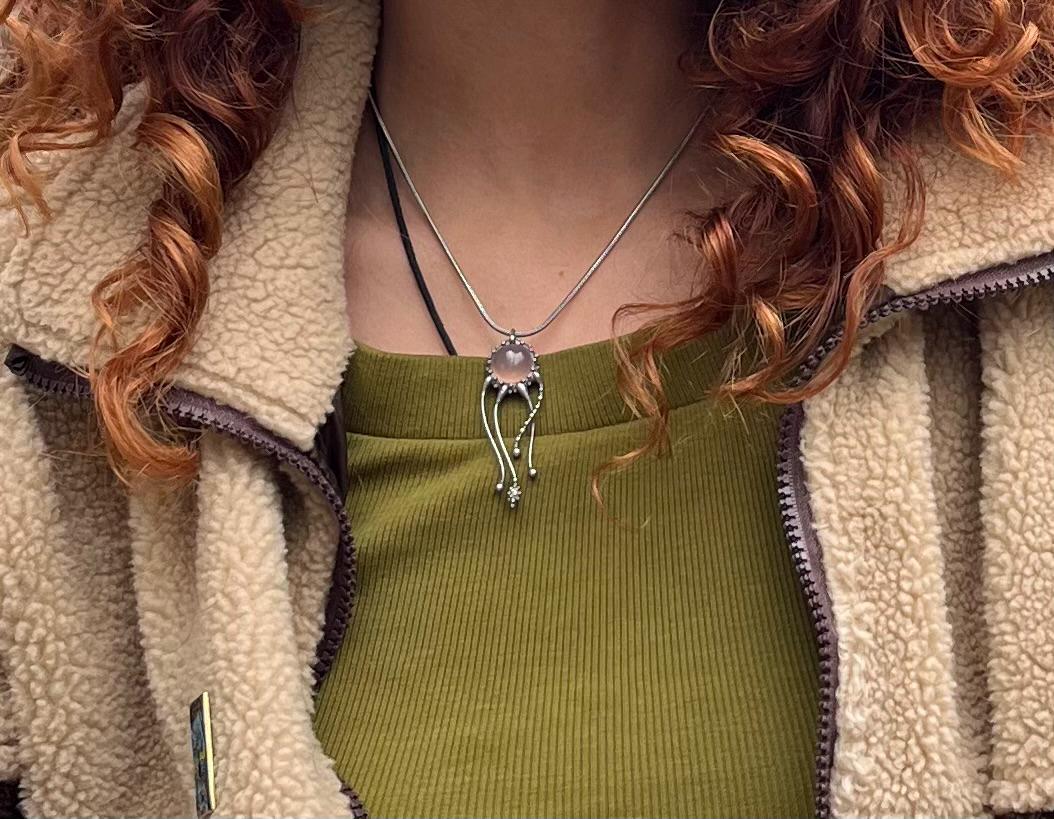Ocean creatures jellyfish stained glass necklace hand made from copper, pewter, steel, rose agate stone. Unusual suncatcher octopus pendant is light and sturdy. All elements are handmade, which ensures the individuality of each product made in the Yadovito workshop. The tin-copper alloy is polished with a finishing solution to give the jewelry a noble appearance and at the same time so that the metal does not oxidize. Size about 4/1 cm (1.57*0.39 in). Color silver/pink.