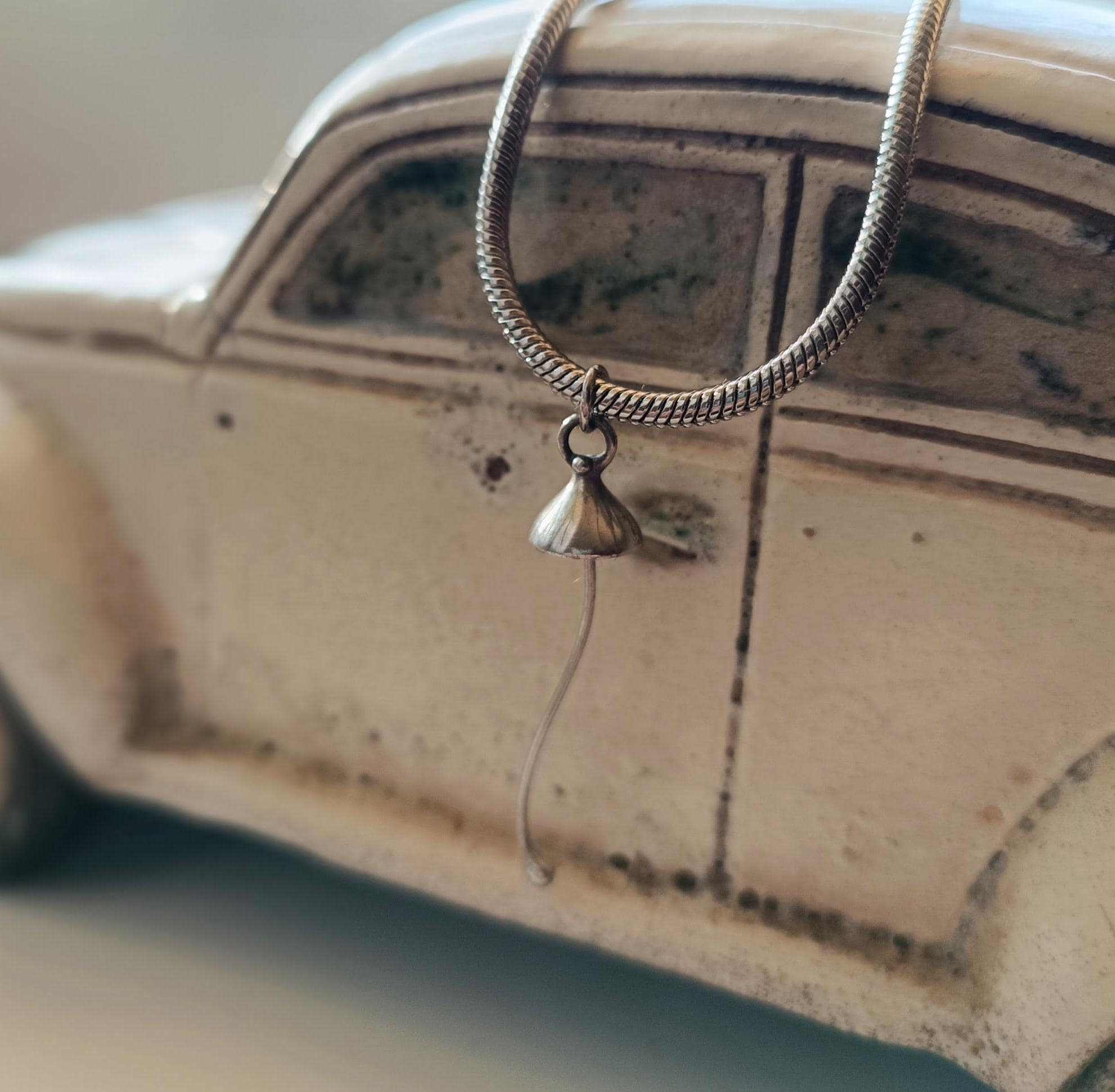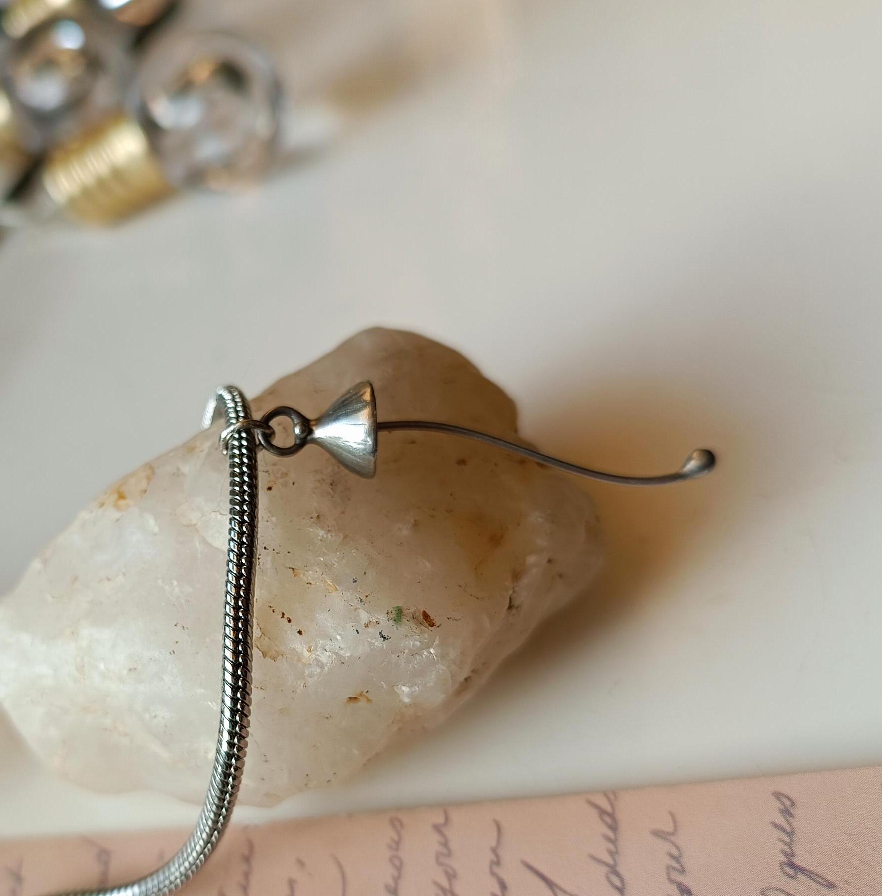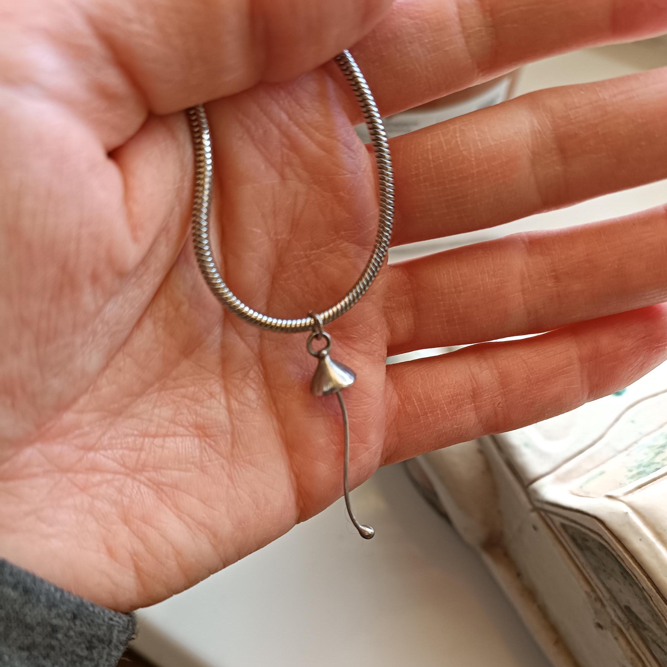 Magic mushroom pendant necklace handmade from copper, tin alloy, pewter, steel. Treated with antioxidant, sanded, polished. Light and sturdy witch botanical necklace. All elements are handmade, which ensures the individuality of each product made in the Yadovito workshop. The tin-copper alloy polished with a finishing solution to give the jewelry a noble appearance and at the same time so that the metal does not oxidize. Size about 4/1 cm (1.7*0.4 in). Color silver.