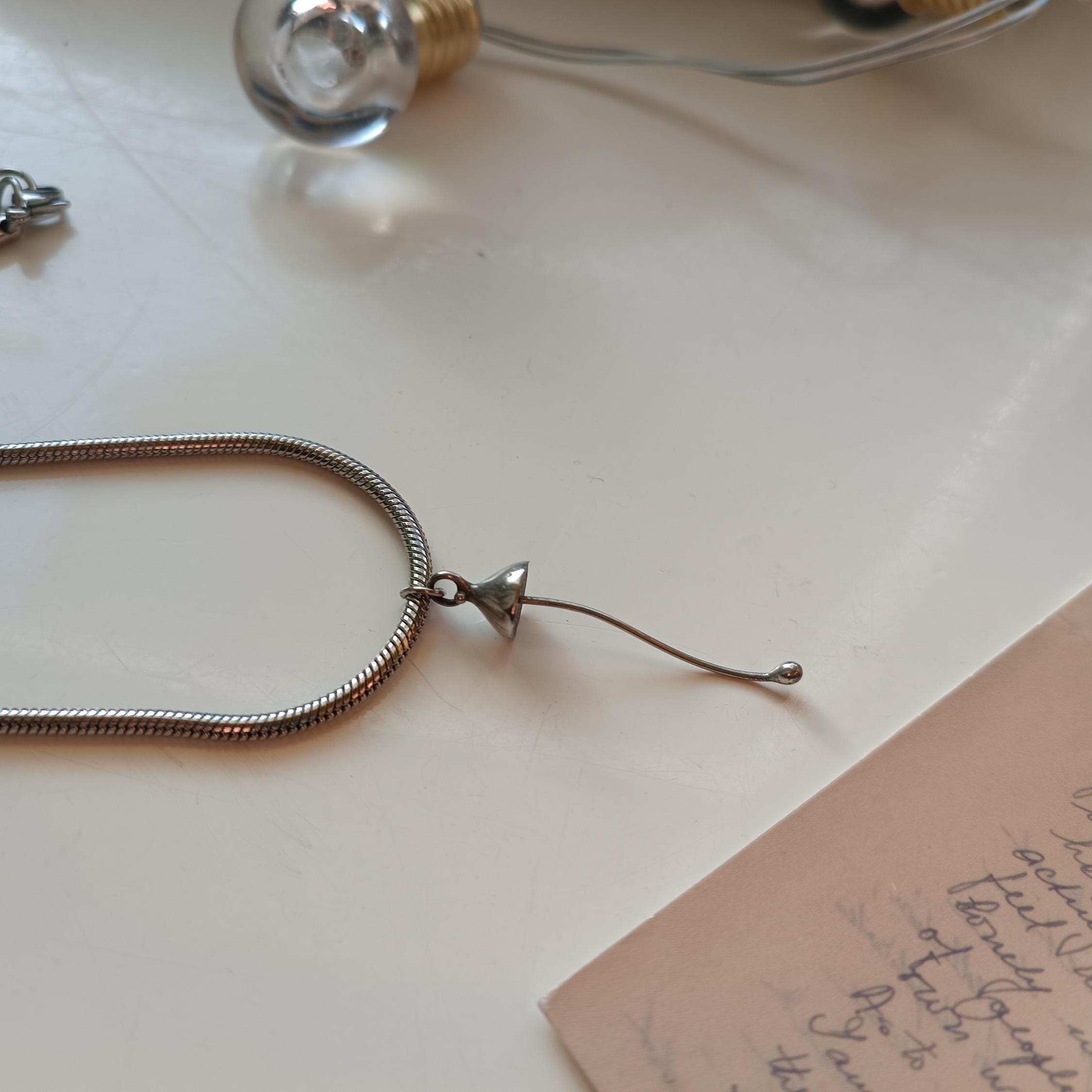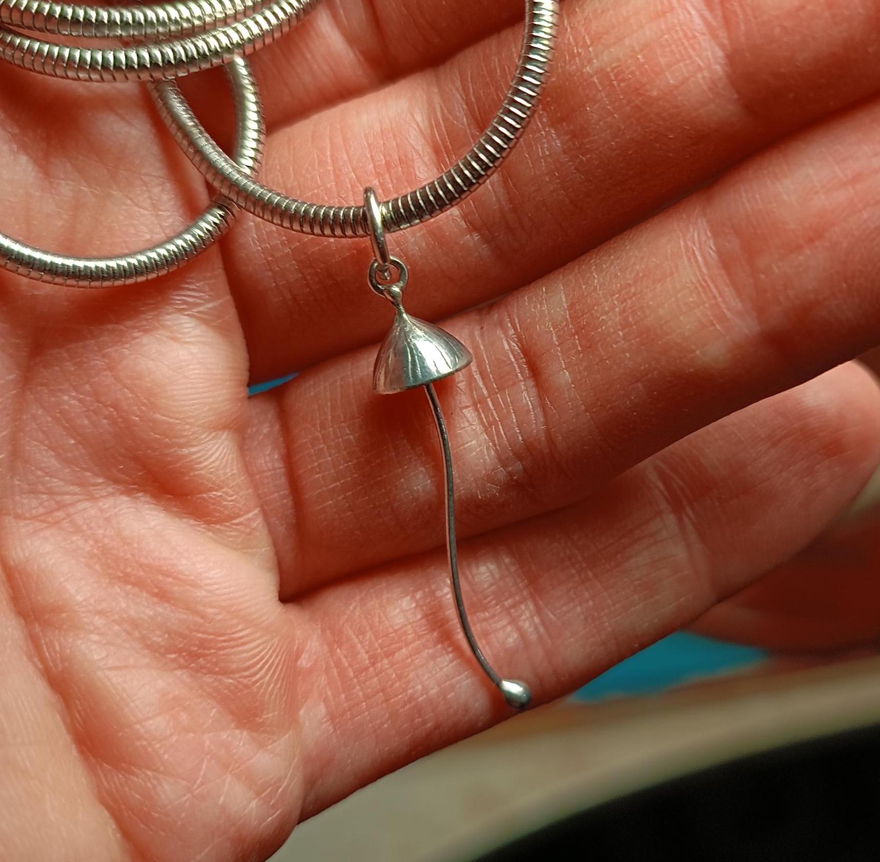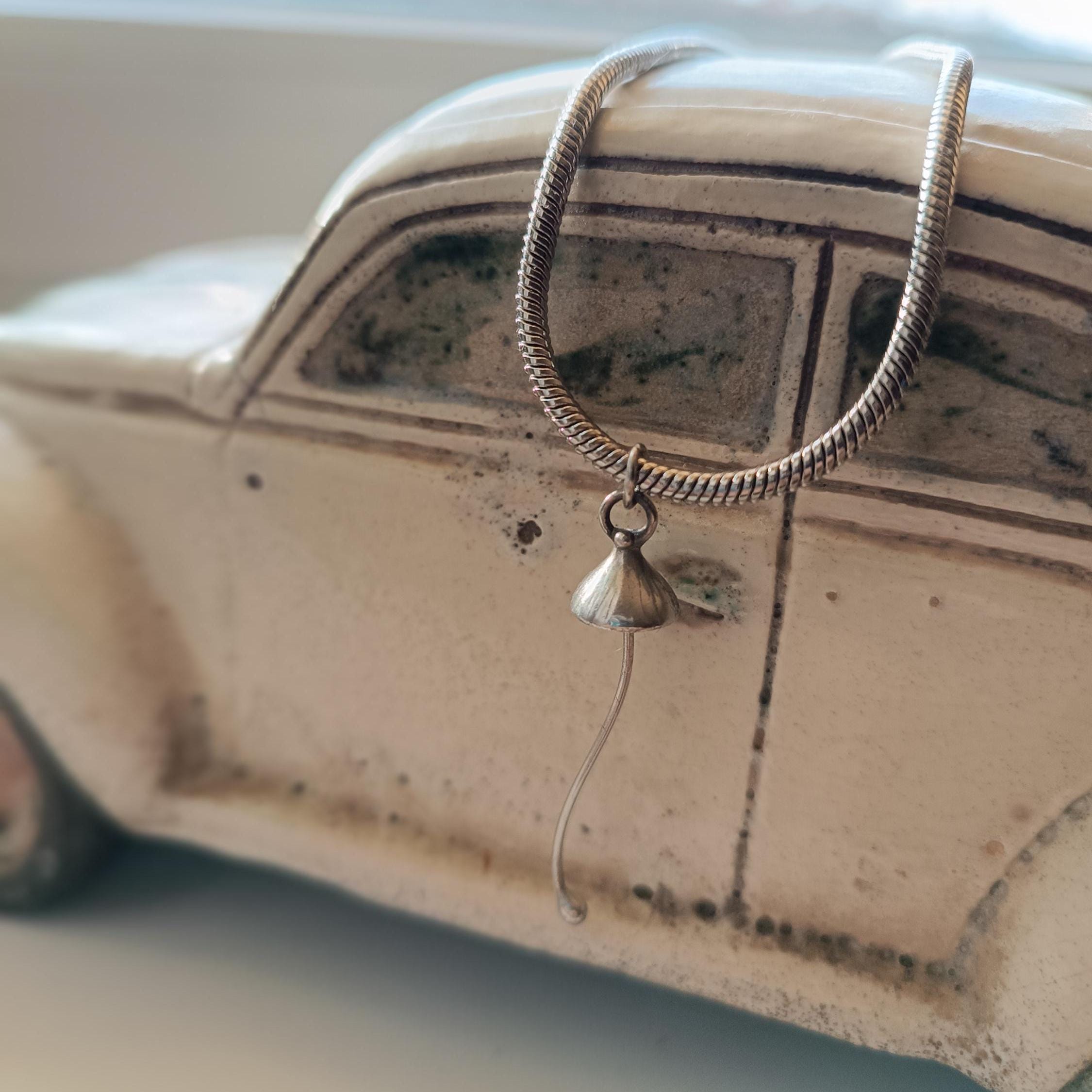 Magic mushroom pendant necklace handmade from copper, tin alloy, pewter, steel. Treated with antioxidant, sanded, polished. Light and sturdy witch botanical necklace. All elements are handmade, which ensures the individuality of each product made in the Yadovito workshop. The tin-copper alloy polished with a finishing solution to give the jewelry a noble appearance and at the same time so that the metal does not oxidize. Size about 4/1 cm (1.7*0.4 in). Color silver.