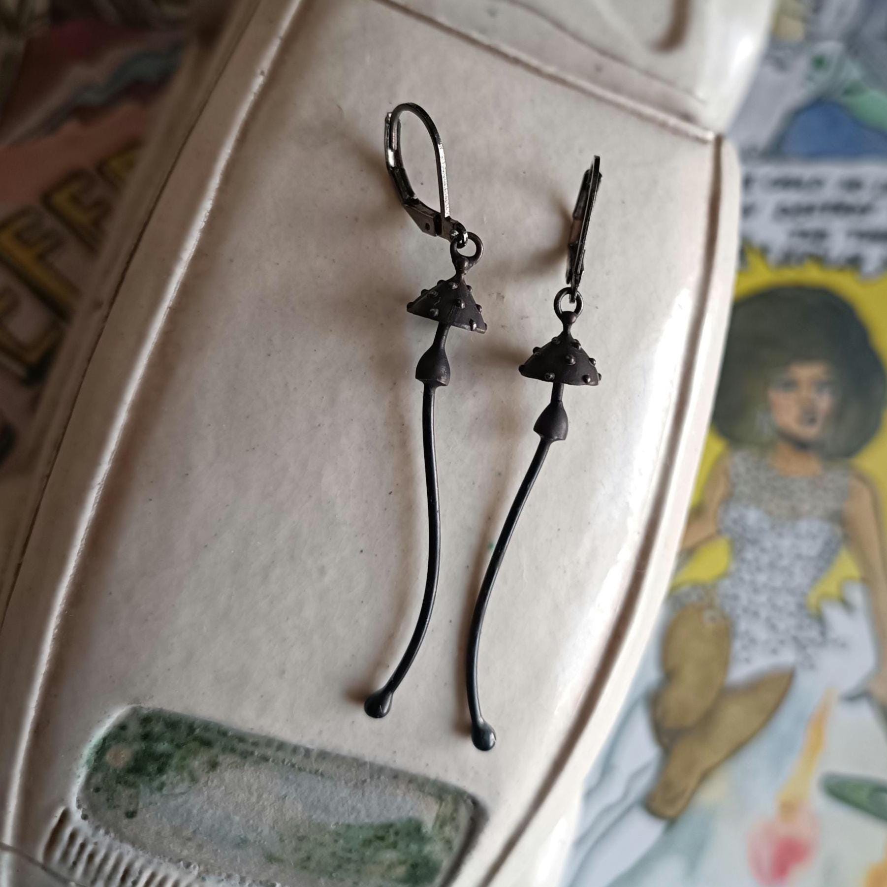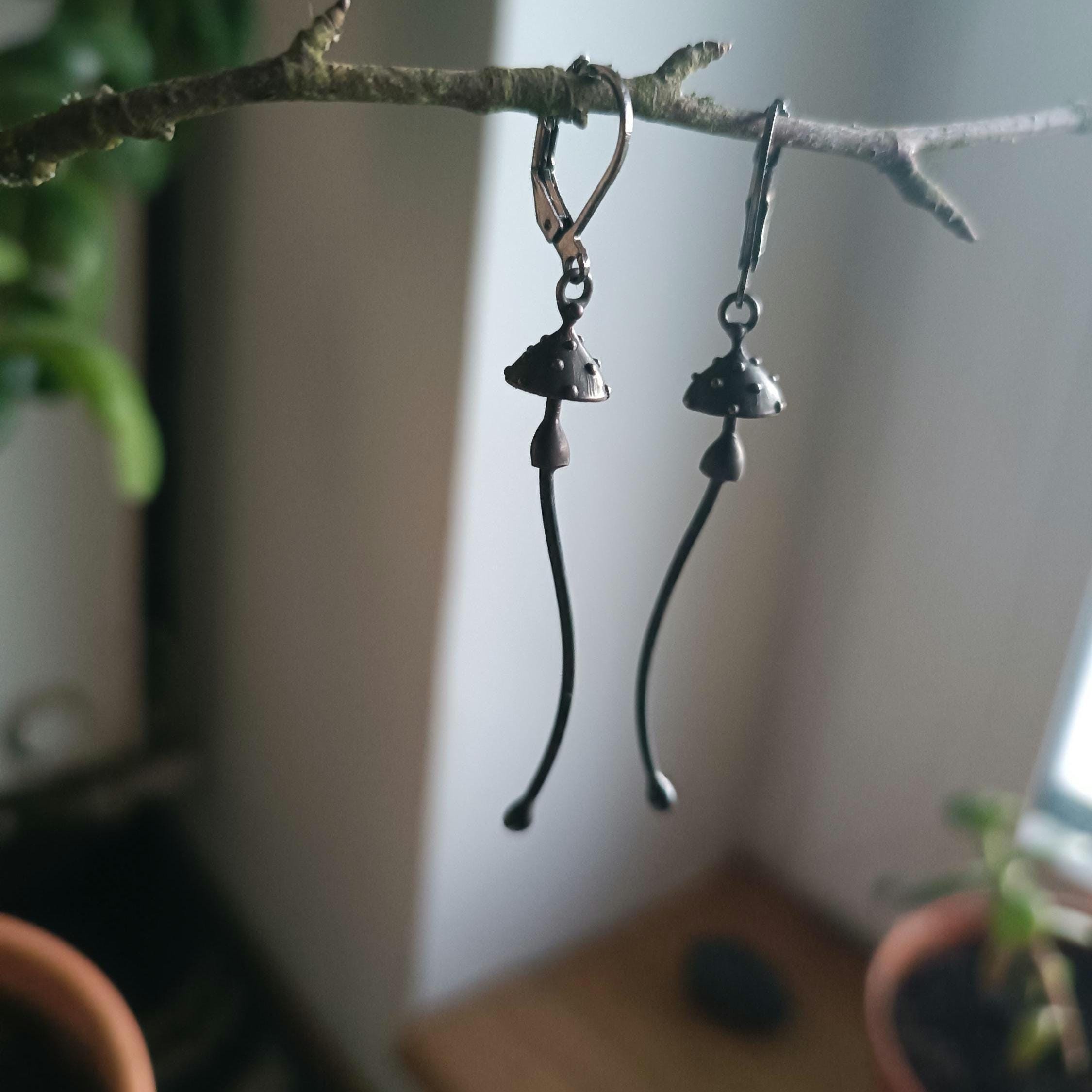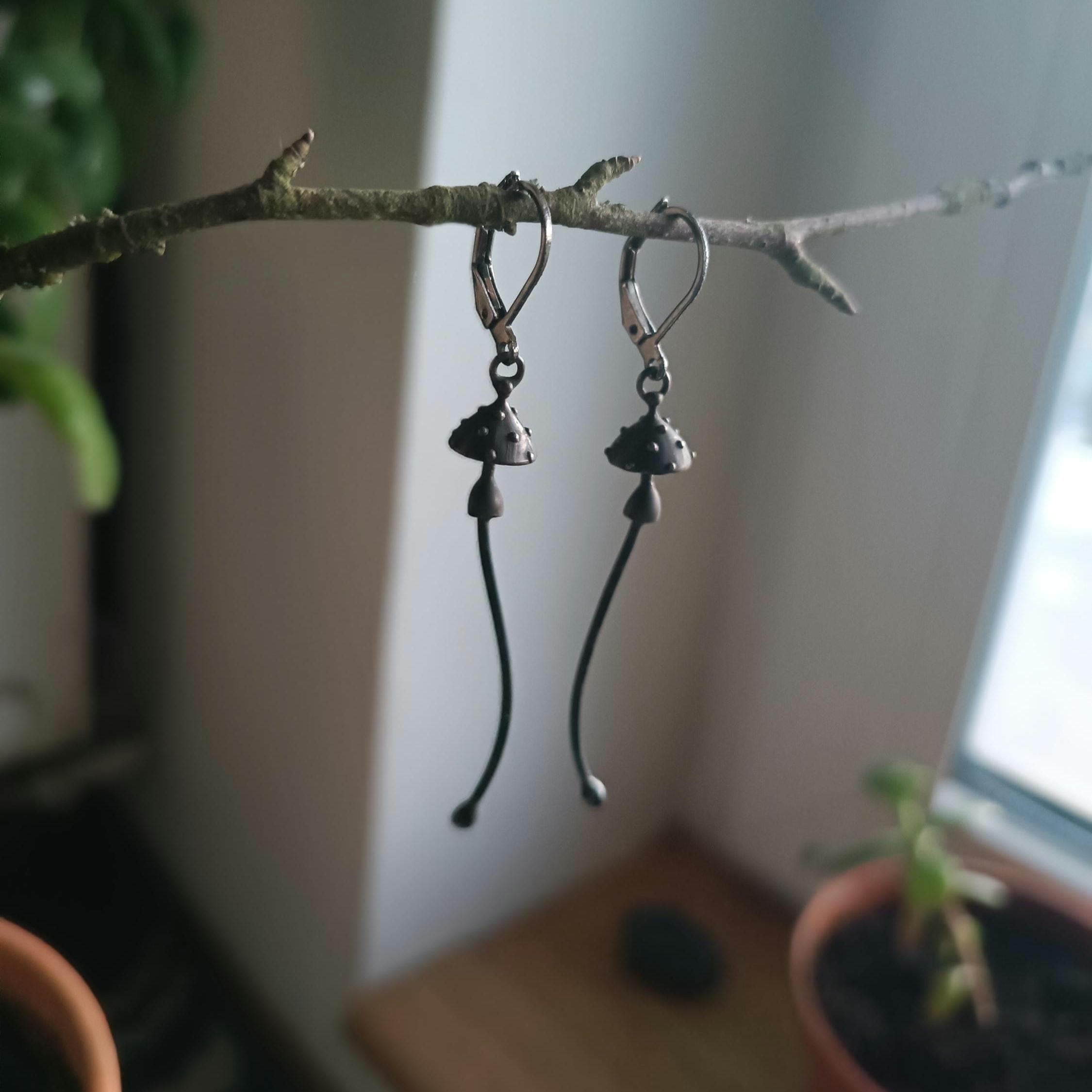 Amanita mushrooms unusual boho hippie earrings made from copper, pewter, steel. Unusual, light and solid amanita mushroom forest witch style earrings. All elements are handmade, which ensures the individuality of each product made in the Yadovito workshop. The tin-copper alloy is polished with a finishing solution to give the jewelry a noble appearance and at the same time so that the metal does not oxidize. Each mushroom jewelry looks individually, because mushroom caps are made by hand, and not cast or stamped. Size: about 5 cm (1.9 in). The sizes are coordinated with the customer. Color: silver.