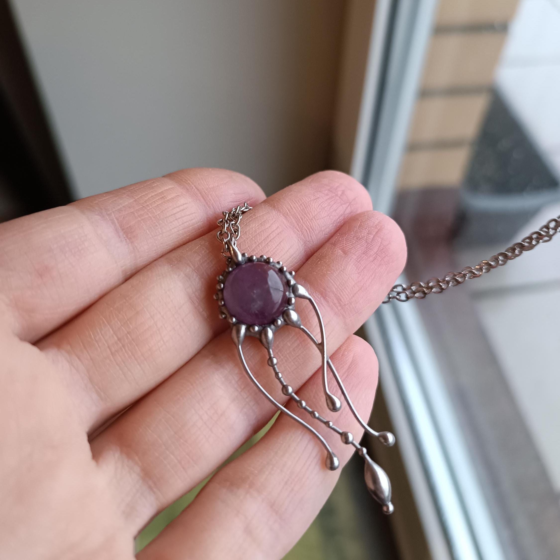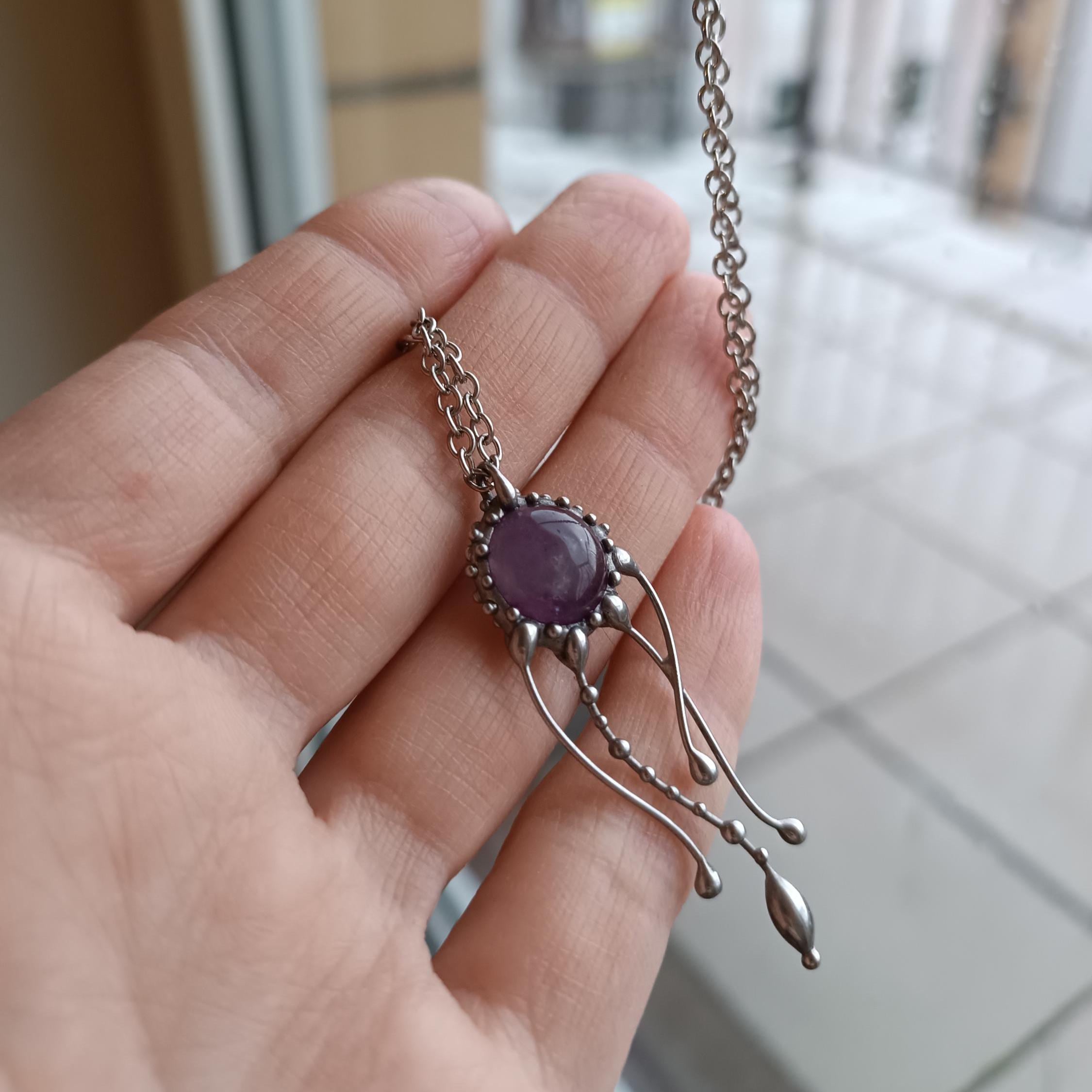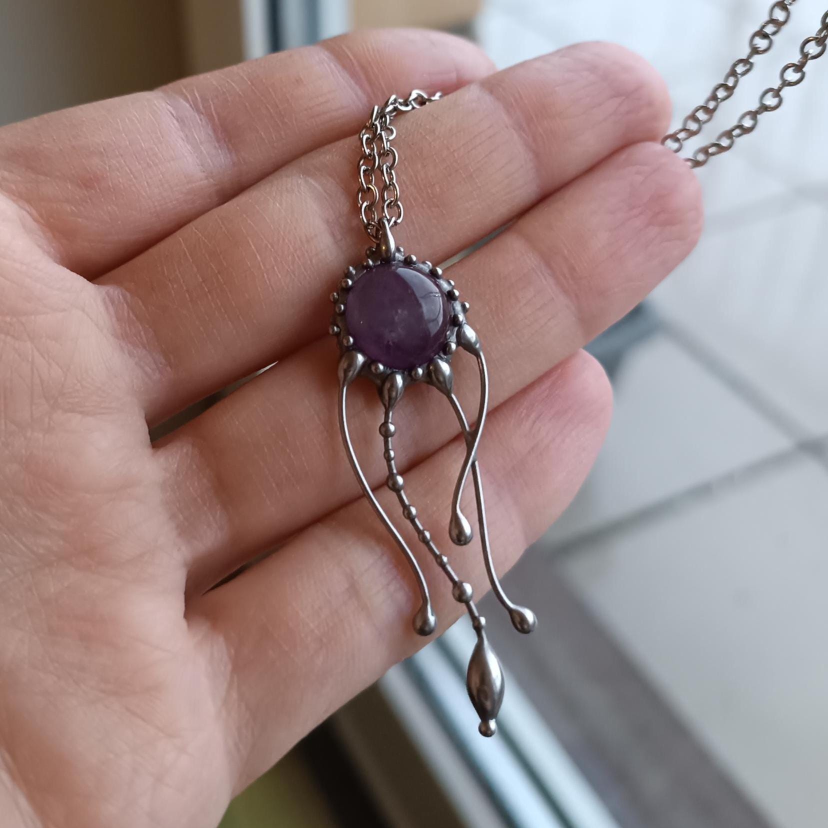 Psychedelic creatures jellyfish amethyst necklace hand made from copper, pewter, steel, purple amethyst. The pendant is light and durable enough. All elements are handmade, which ensures the individuality of each product made in the Yadovito workshop. The copper alloy is polished with a finishing solution to give the jewelry a noble appearance and at the same time so that the metal does not oxidize. Size about 4/1 cm (1.6 * 0.4 in). Color silver/purple.