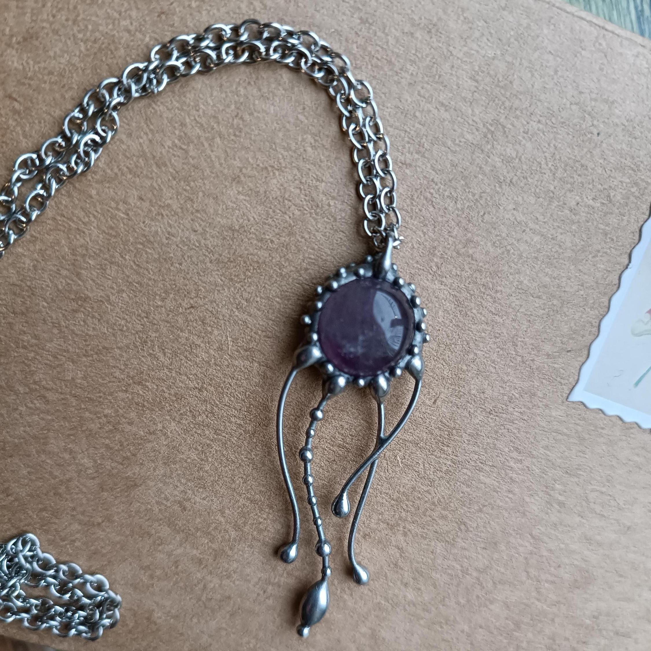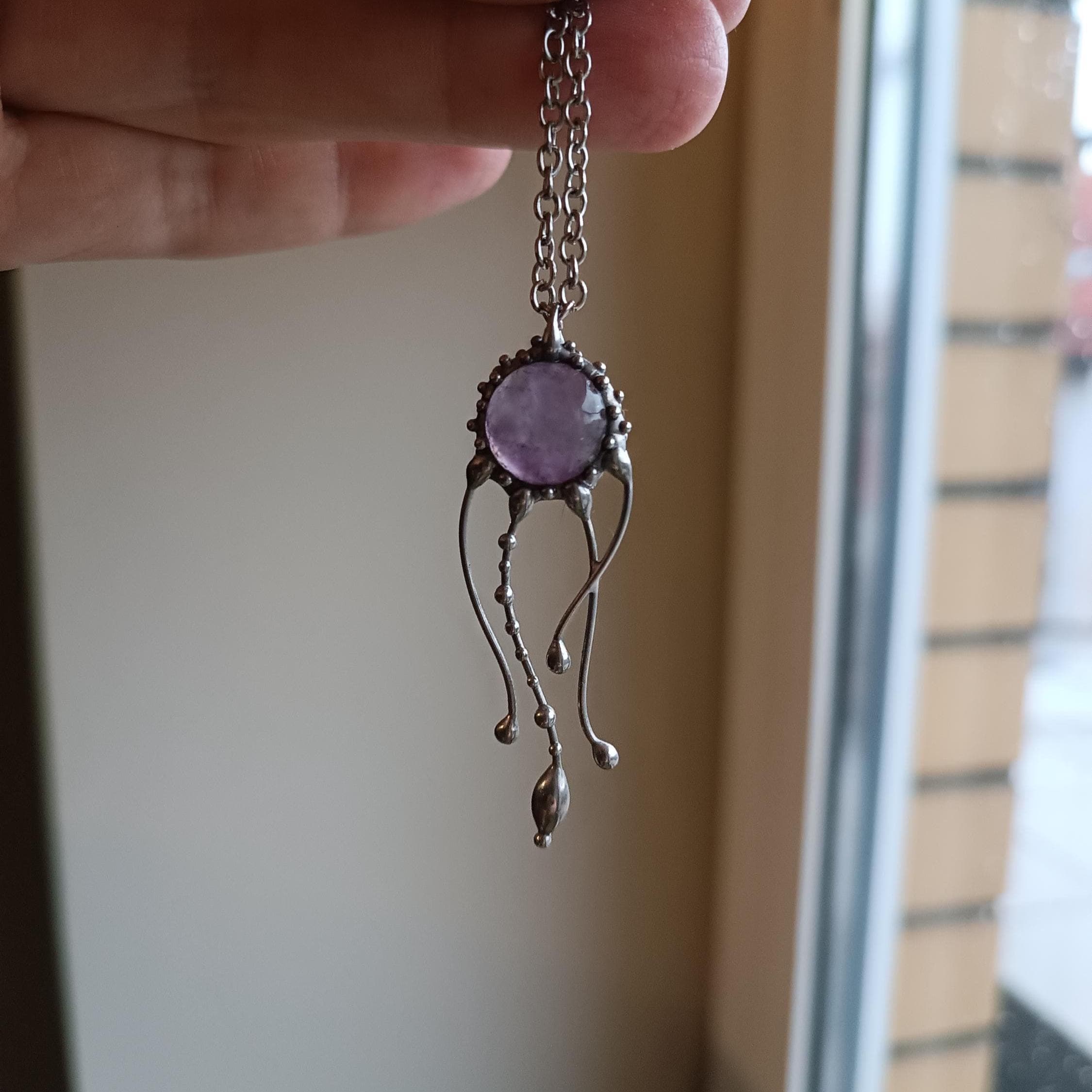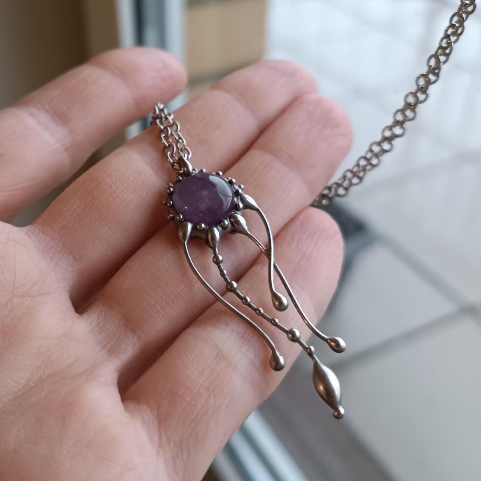 Psychedelic creatures jellyfish amethyst necklace hand made from copper, pewter, steel, purple amethyst. The pendant is light and durable enough. All elements are handmade, which ensures the individuality of each product made in the Yadovito workshop. The copper alloy is polished with a finishing solution to give the jewelry a noble appearance and at the same time so that the metal does not oxidize. Size about 4/1 cm (1.6 * 0.4 in). Color silver/purple.