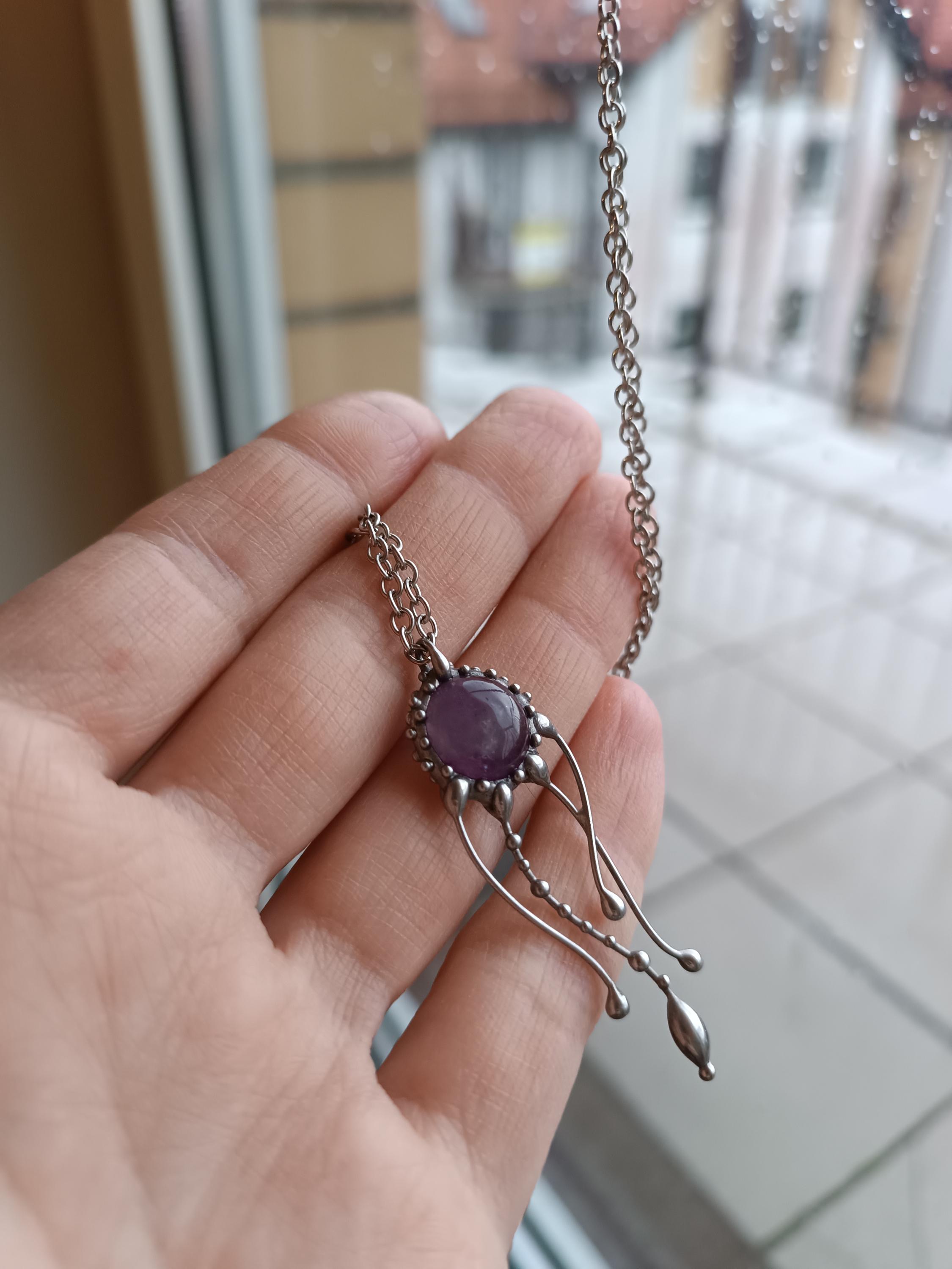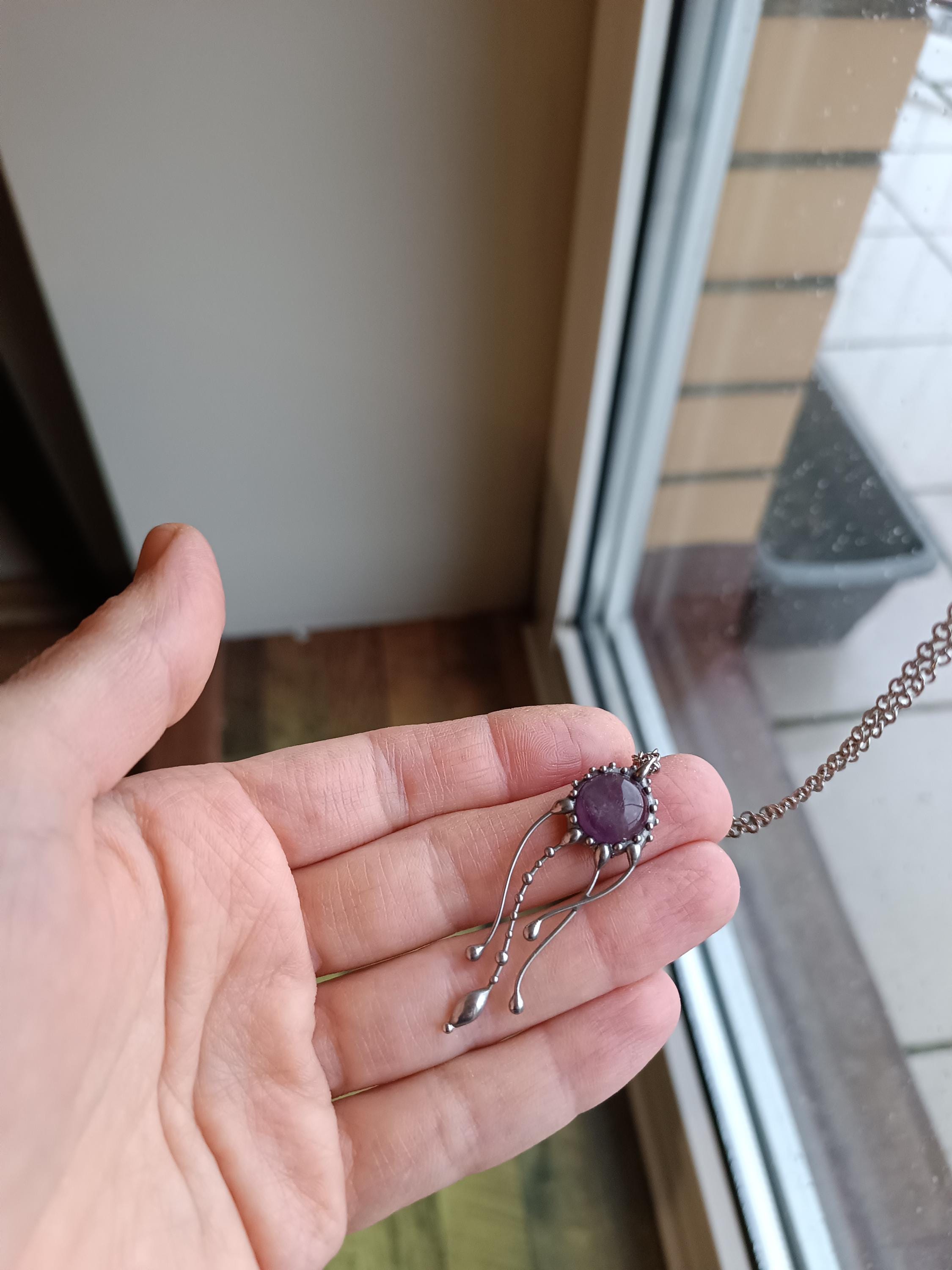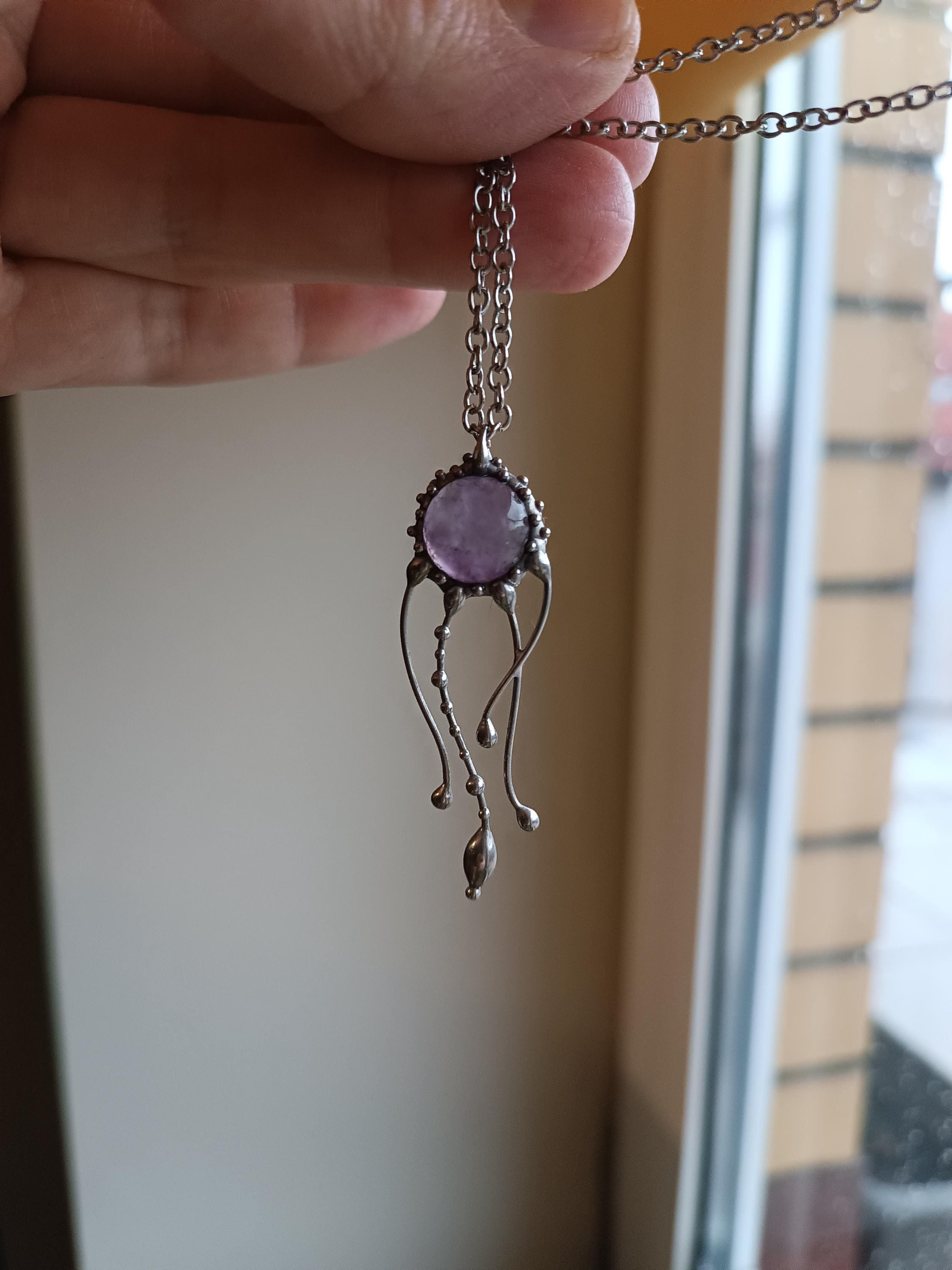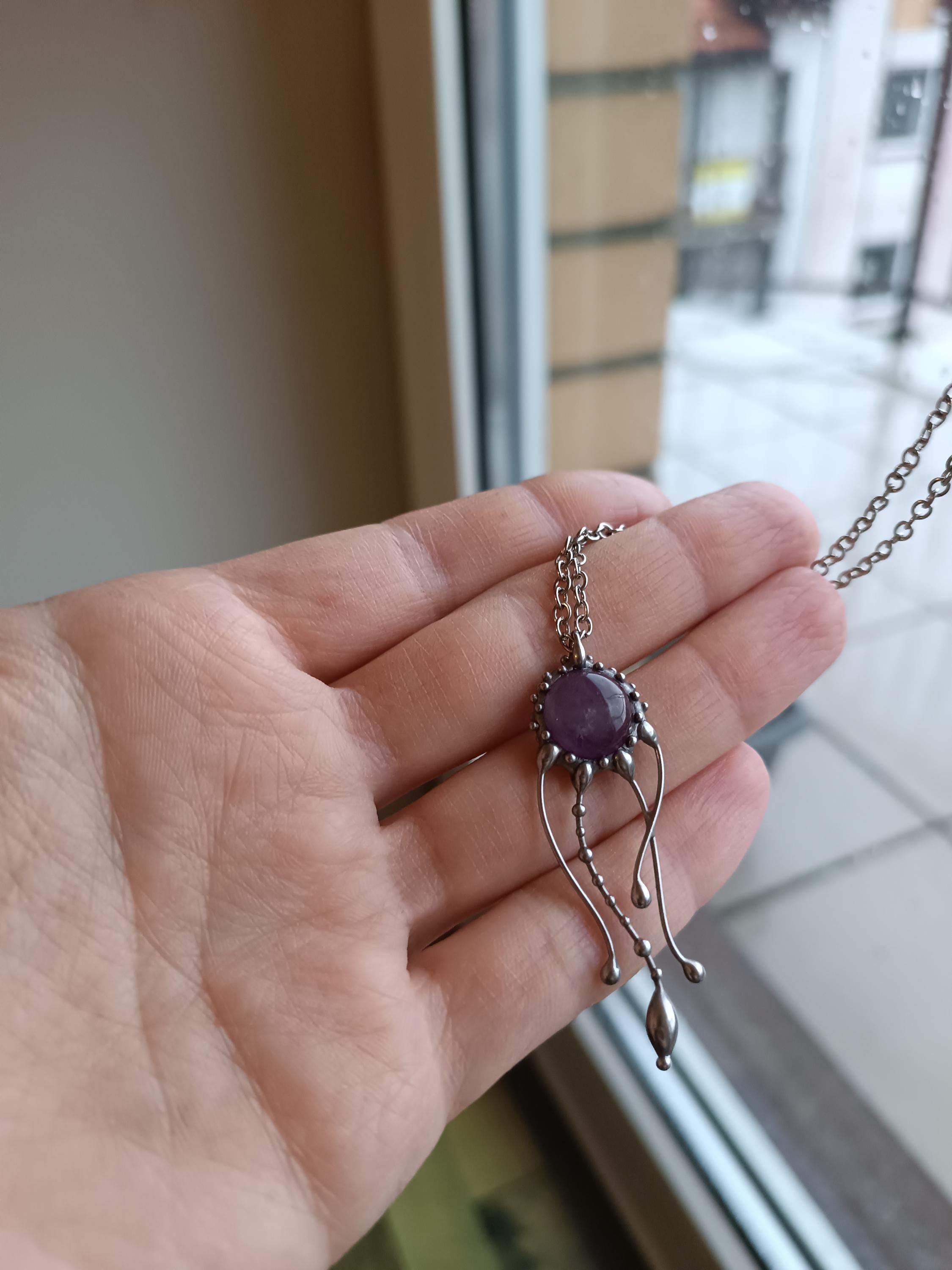 Psychedelic creatures jellyfish amethyst necklace hand made from copper, pewter, steel, purple amethyst. The pendant is light and durable enough. All elements are handmade, which ensures the individuality of each product made in the Yadovito workshop. The tin-copper alloy is polished with a finishing solution to give the jewelry a noble appearance and at the same time so that the metal does not oxidize. Size about 4/1 cm (1.57*0.39 in). Color silver/purple.