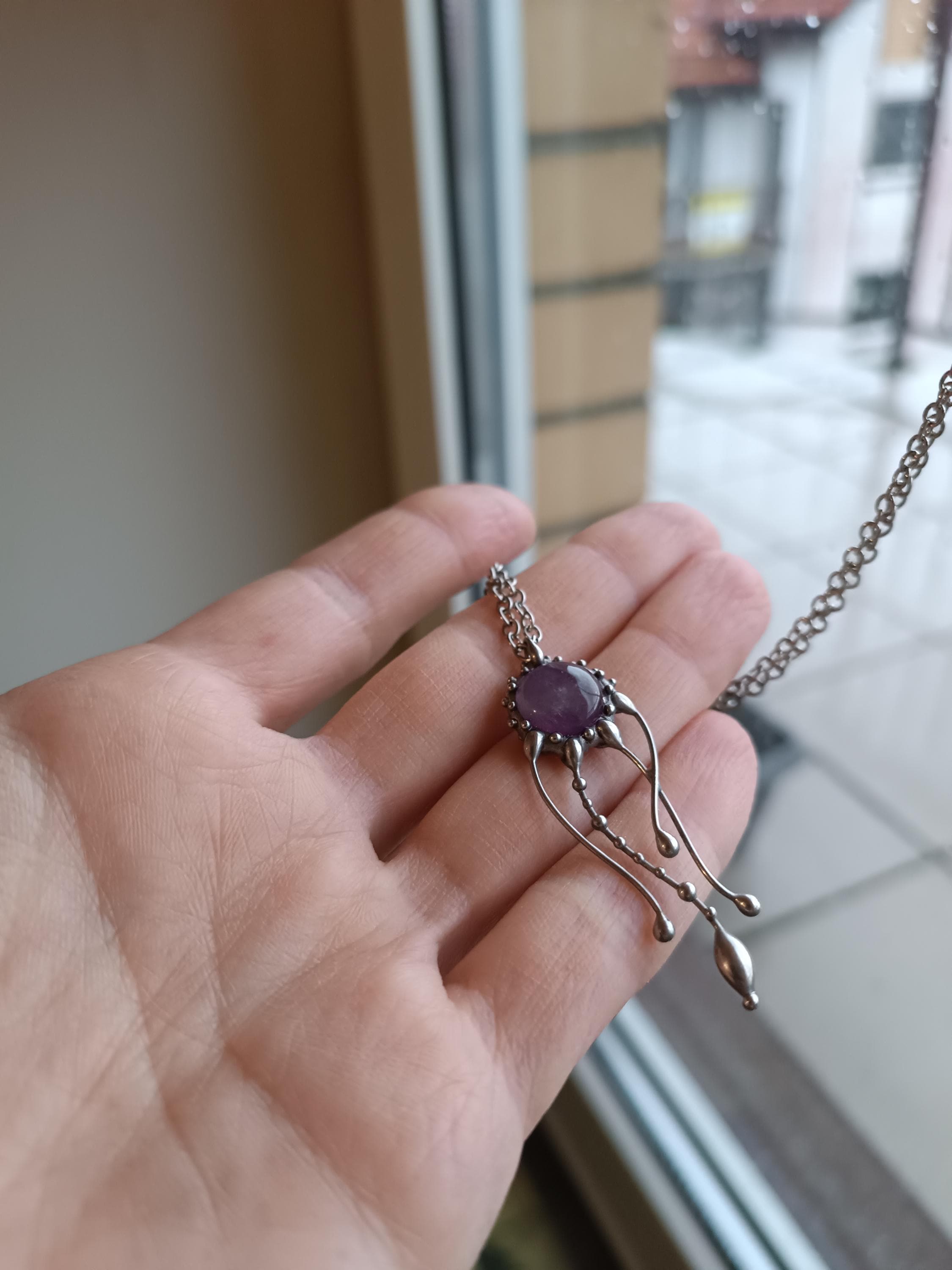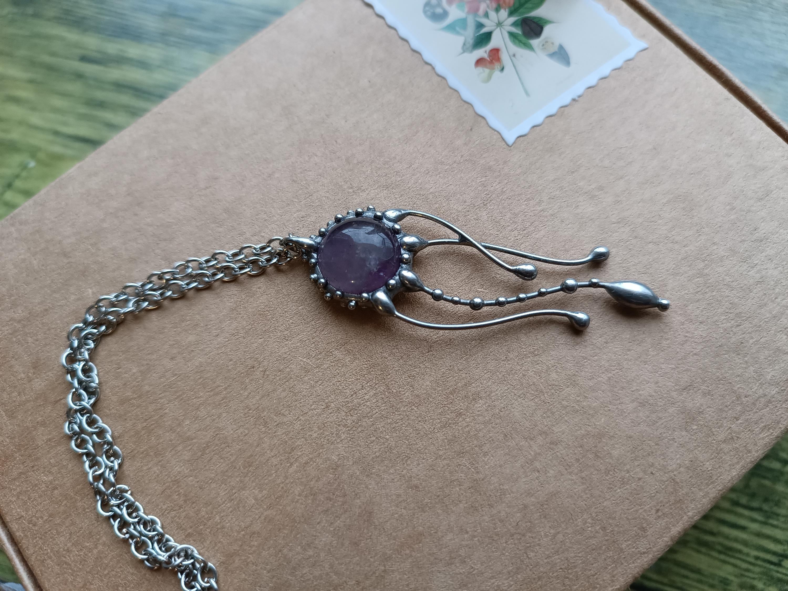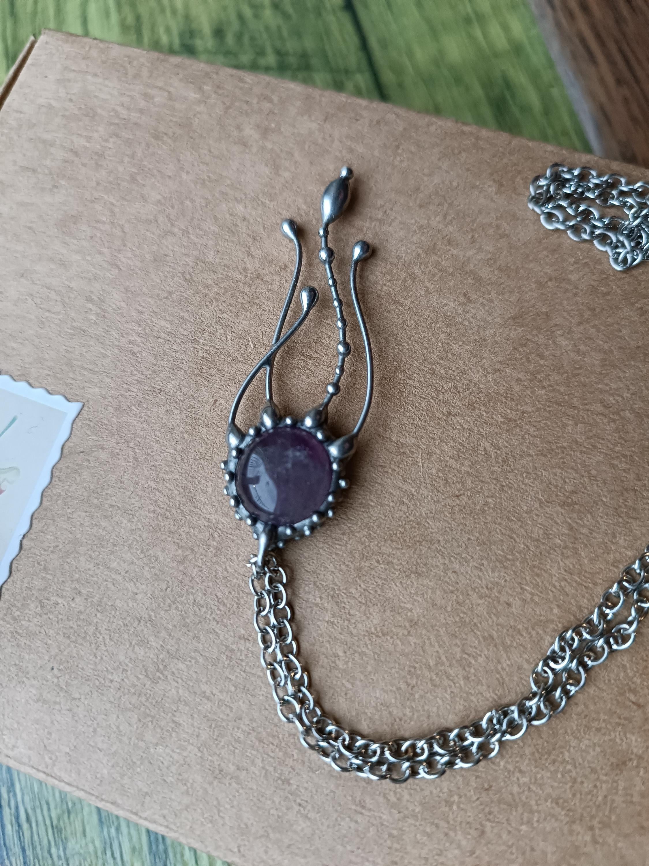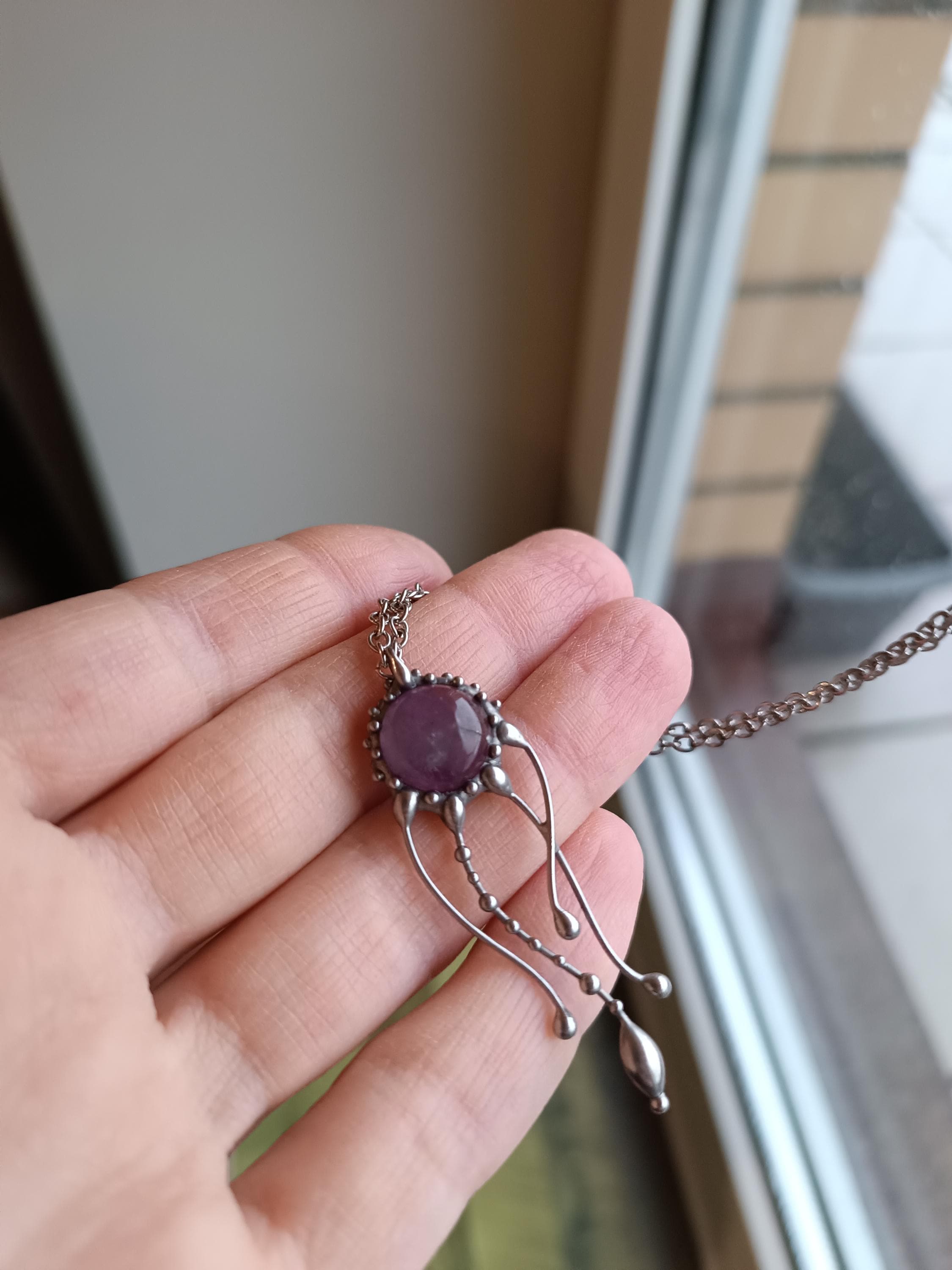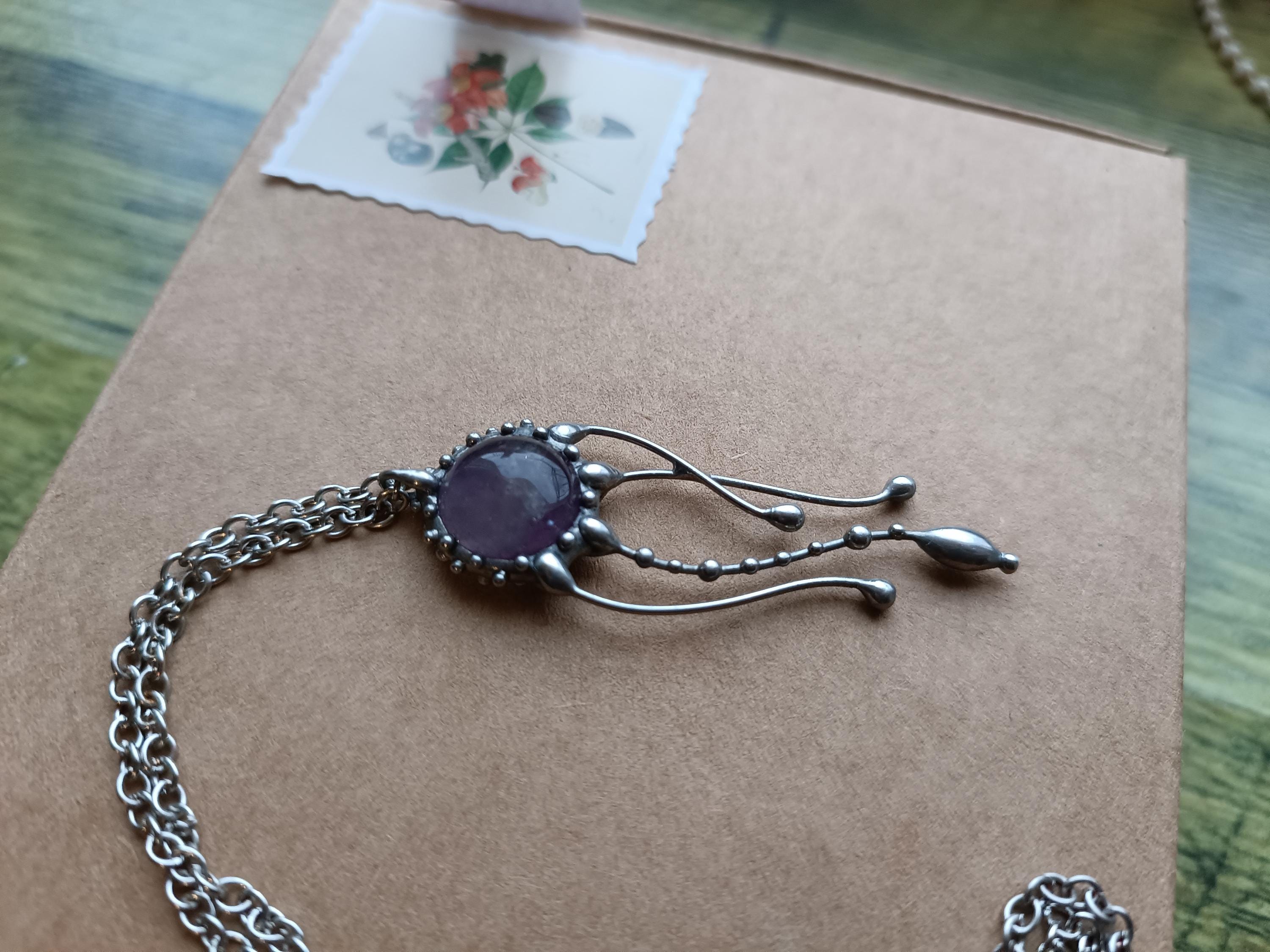 Psychedelic creatures jellyfish amethyst necklace hand made from copper, pewter, steel, purple amethyst. The pendant is light and durable enough. All elements are handmade, which ensures the individuality of each product made in the Yadovito workshop. The tin-copper alloy is polished with a finishing solution to give the jewelry a noble appearance and at the same time so that the metal does not oxidize. Size about 4/1 cm (1.57*0.39 in). Color silver/purple.