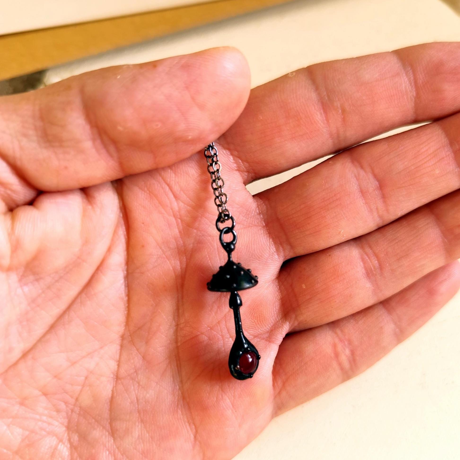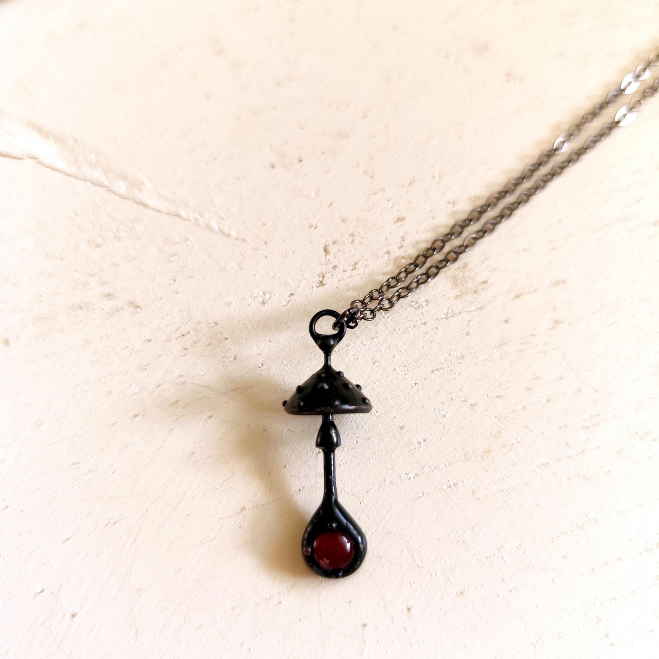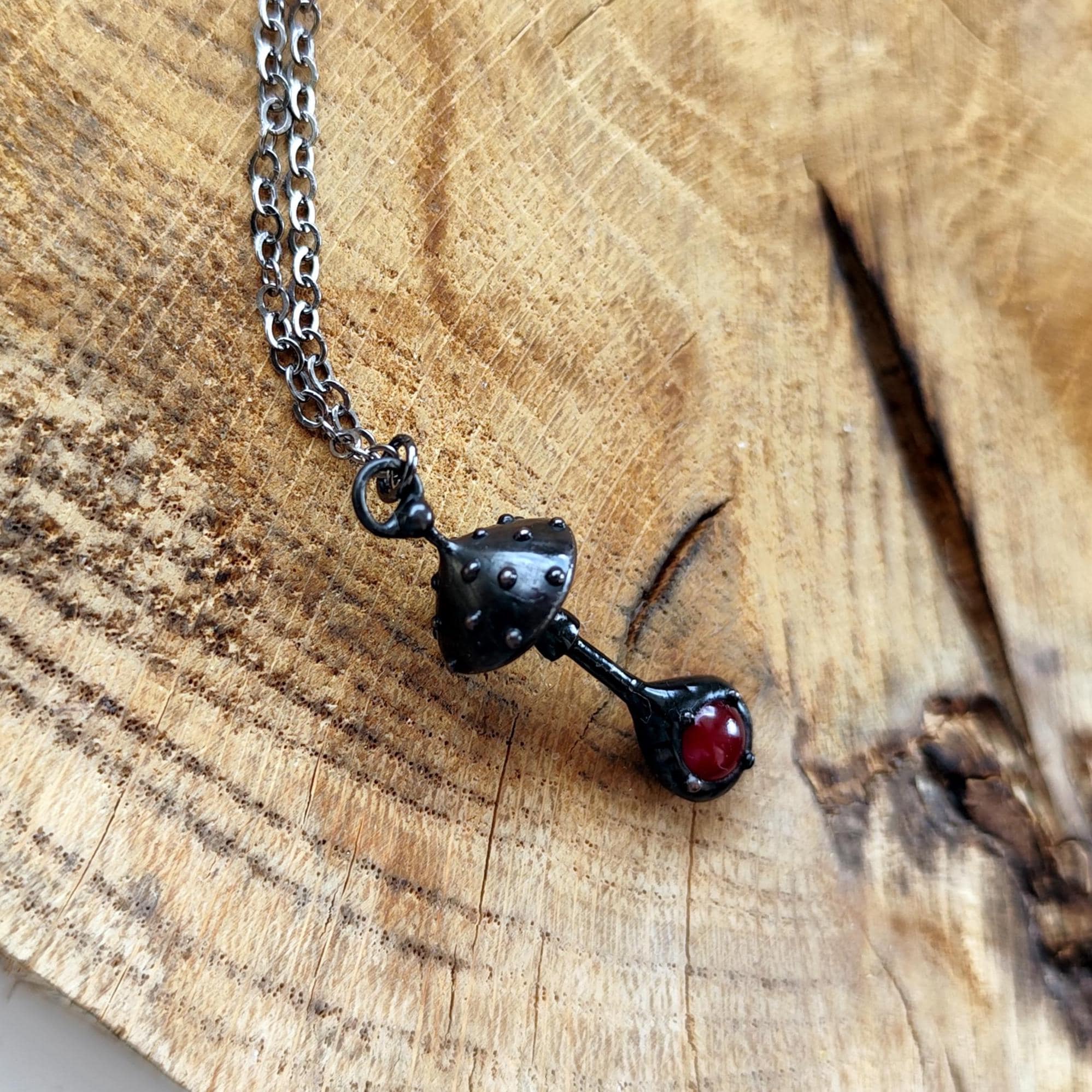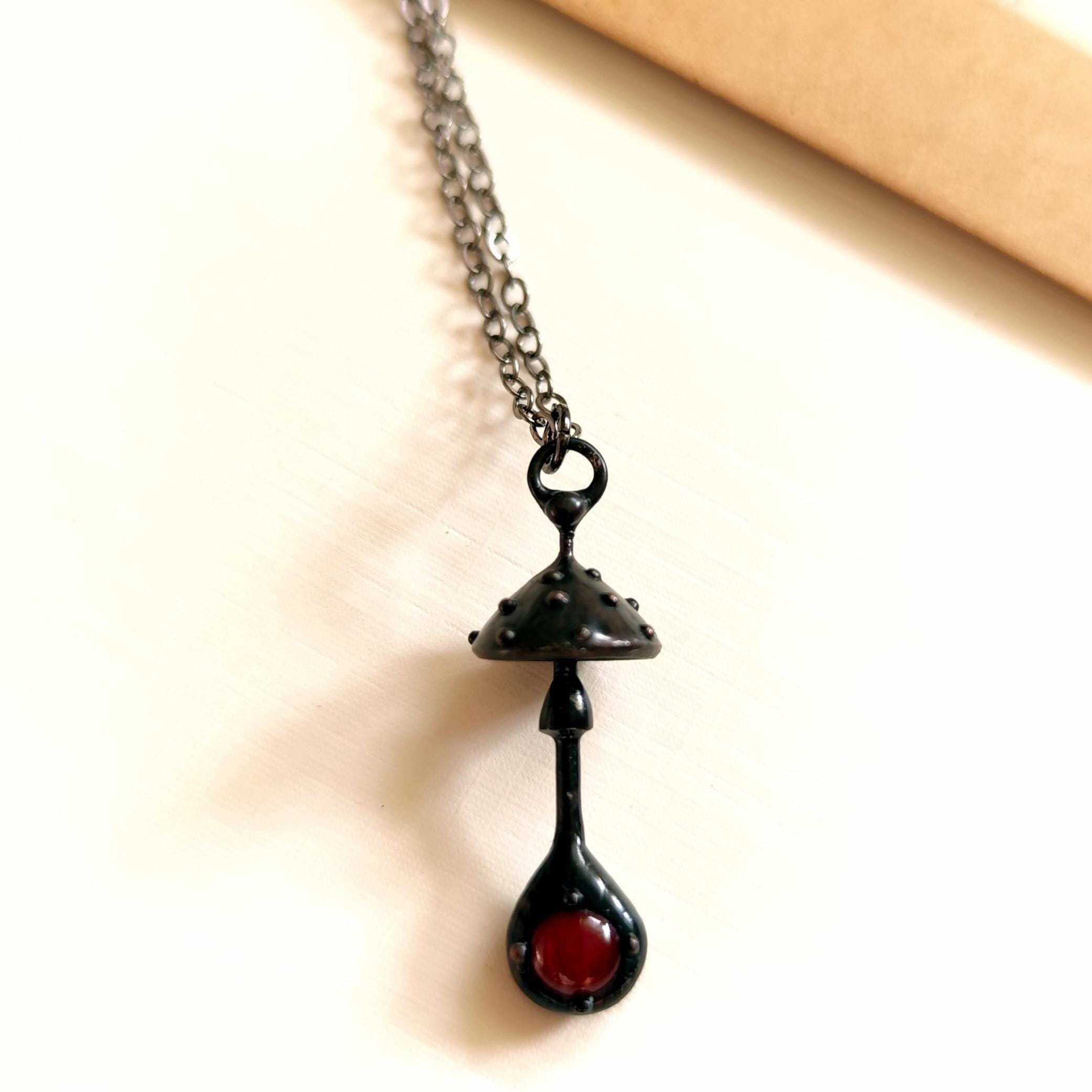 Mushroom amanita necklace pendant made from copper, tin, steel, pewter alloy, red glass. Covered with patina and treated with antioxidant, sanded, polished. These are light, sturdy. All elements are handmade, which ensures the individuality of each product made in the Yadovito workshop. The tin-copper alloy is coated with a black patina to color the metal black, polished with a finishing solution to give the jewelry a noble appearance and at the same time so that the metal does not oxidize. Each jewelry looks individually, because mushroom caps are made by hand, and not cast or stamped. Size about 2.7*1.1 cm (1*0.4in). Color black/red.