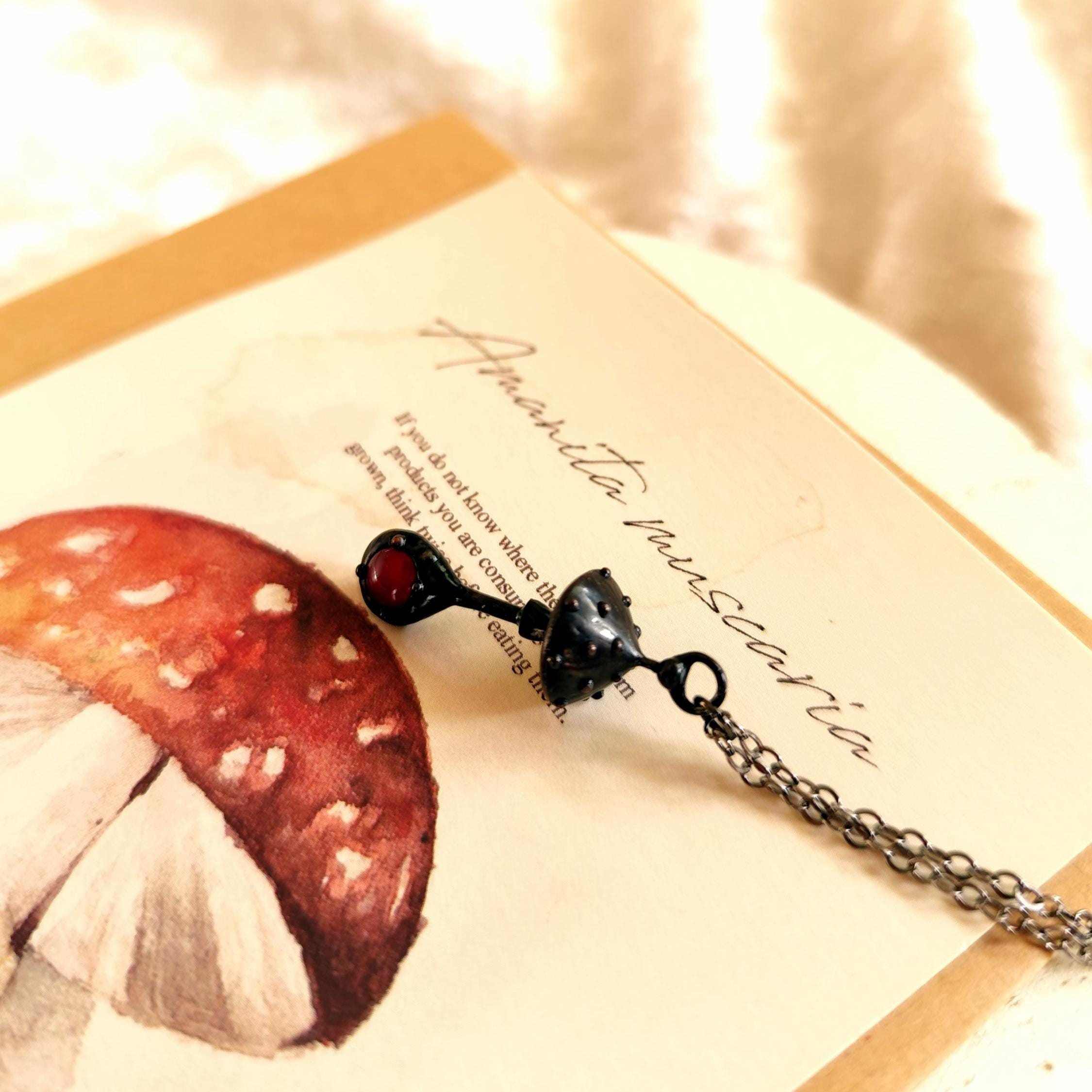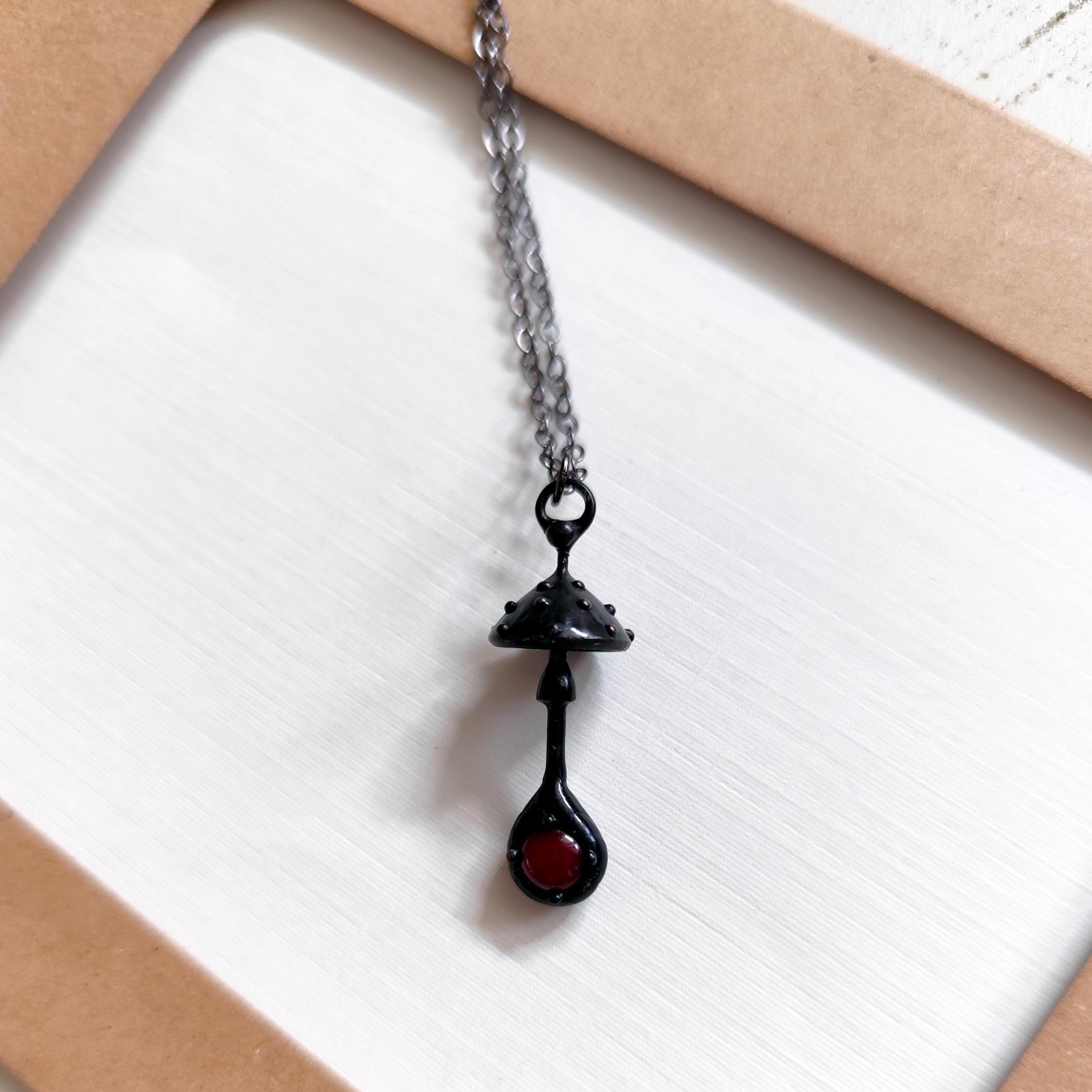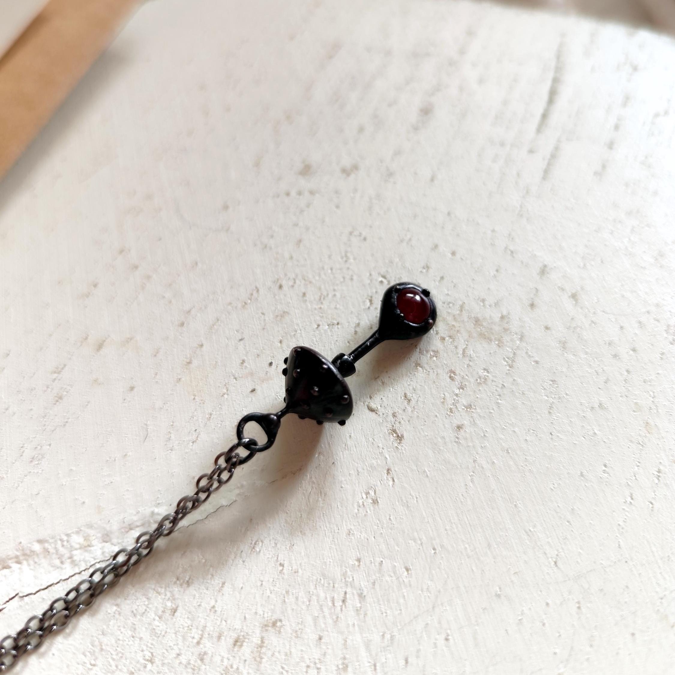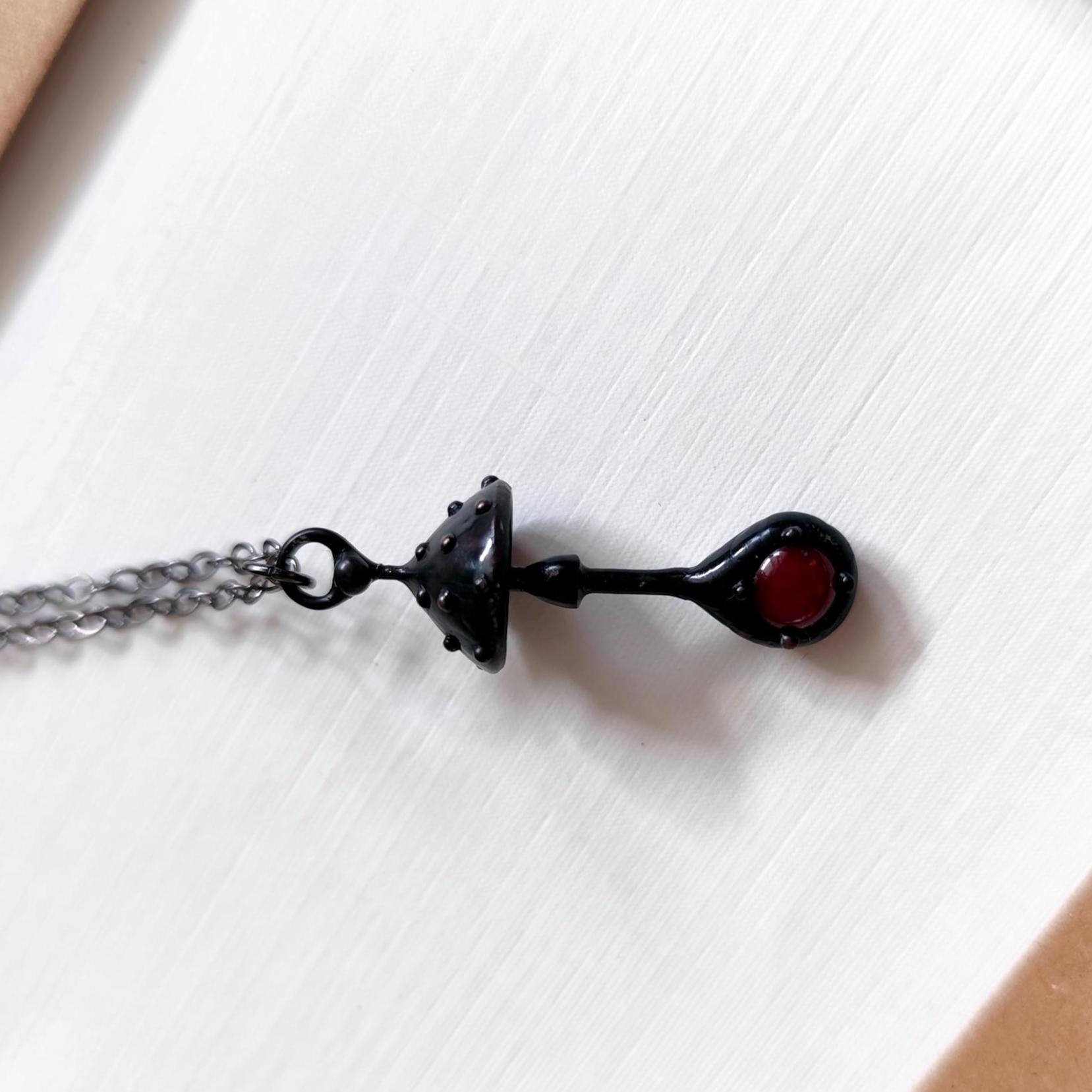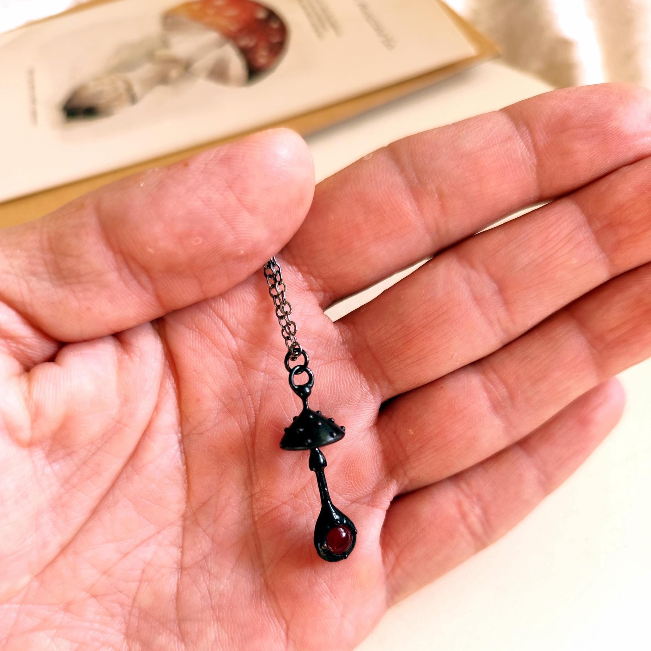 Mushroom amanita necklace pendant made from copper, tin, steel, pewter alloy, red glass. Covered with patina and treated with antioxidant, sanded, polished. These are light, sturdy. All elements are handmade, which ensures the individuality of each product made in the Yadovito workshop. The tin-copper alloy is coated with a black patina to color the metal black, polished with a finishing solution to give the jewelry a noble appearance and at the same time so that the metal does not oxidize. Each jewelry looks individually, because mushroom caps are made by hand, and not cast or stamped. Size about 2.7*1.1 cm (1*0.4in). Color black/red.