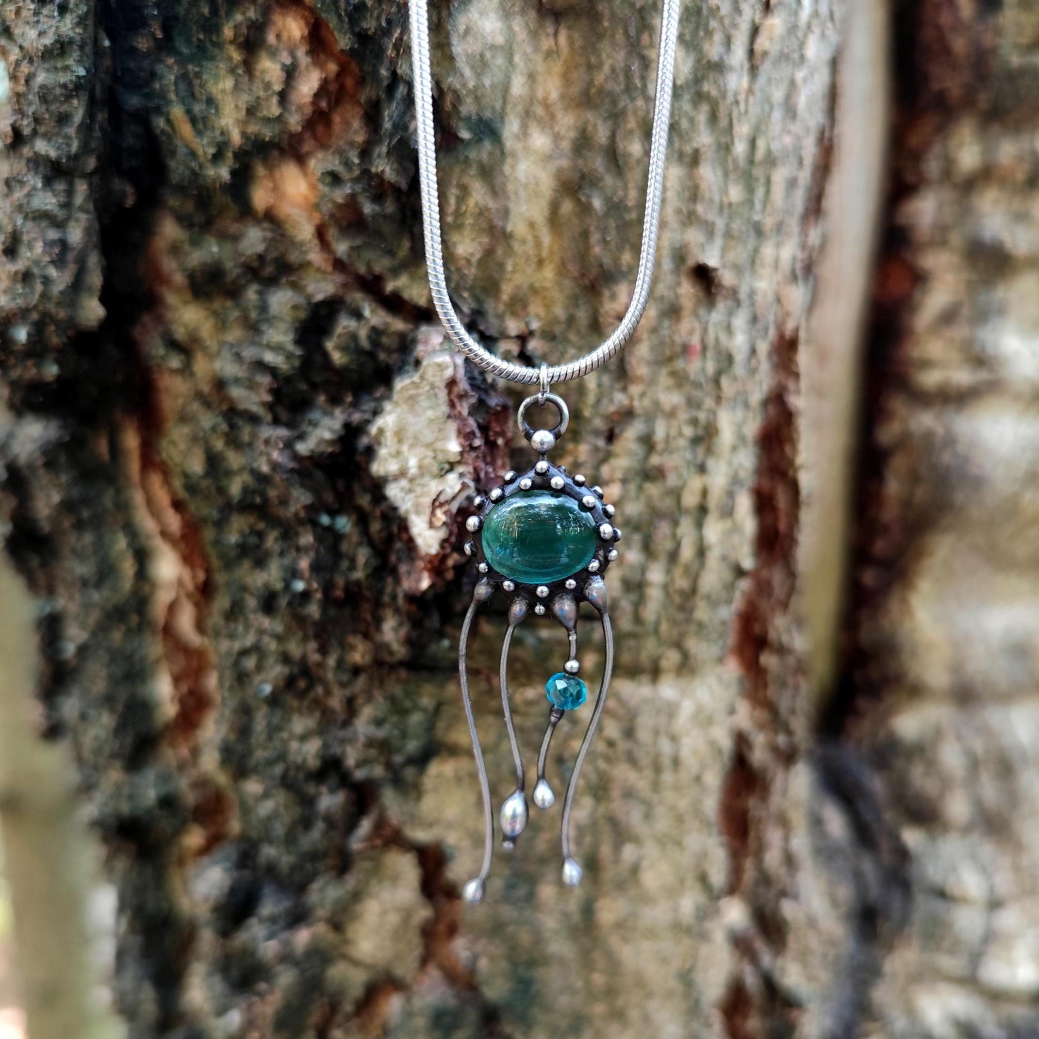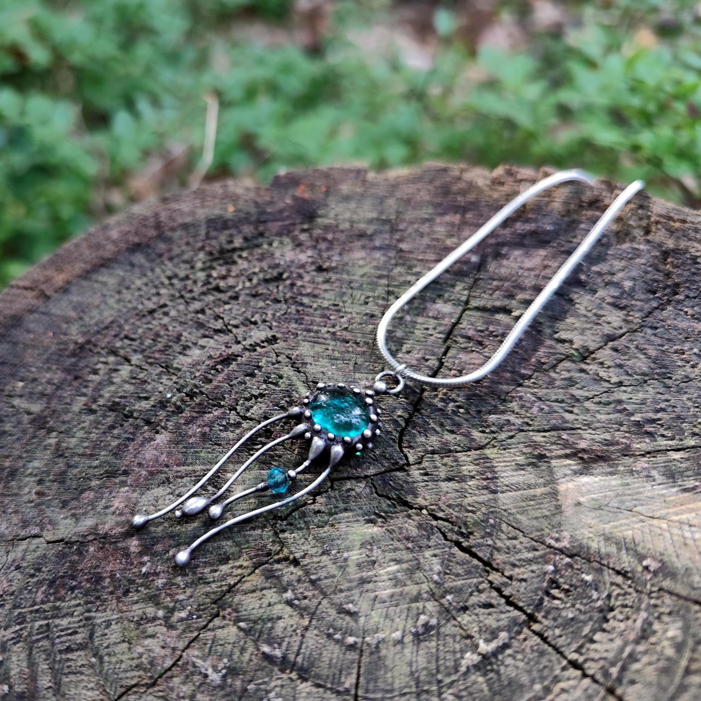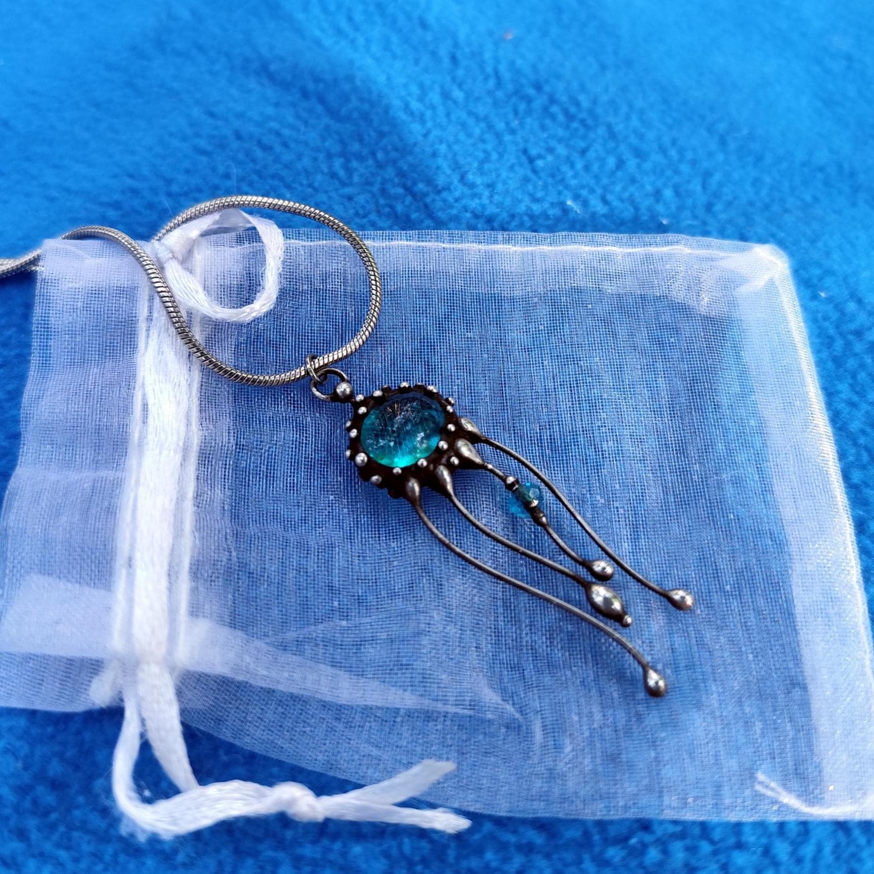 Ocean creatures jellyfish stained glass necklace hand made from copper, pewter, steel, blue glass cabashon. Unusual suncatcher octopus pendant is light and sturdy. All elements are handmade, which ensures the individuality of each product made in the Yadovito workshop. The copper alloy is polished with a finishing solution to give the jewelry a noble appearance and at the same time so that the metal does not oxidize. Size about 4/1 cm (1.6 * 0.4 in). Color black/silver/blue.