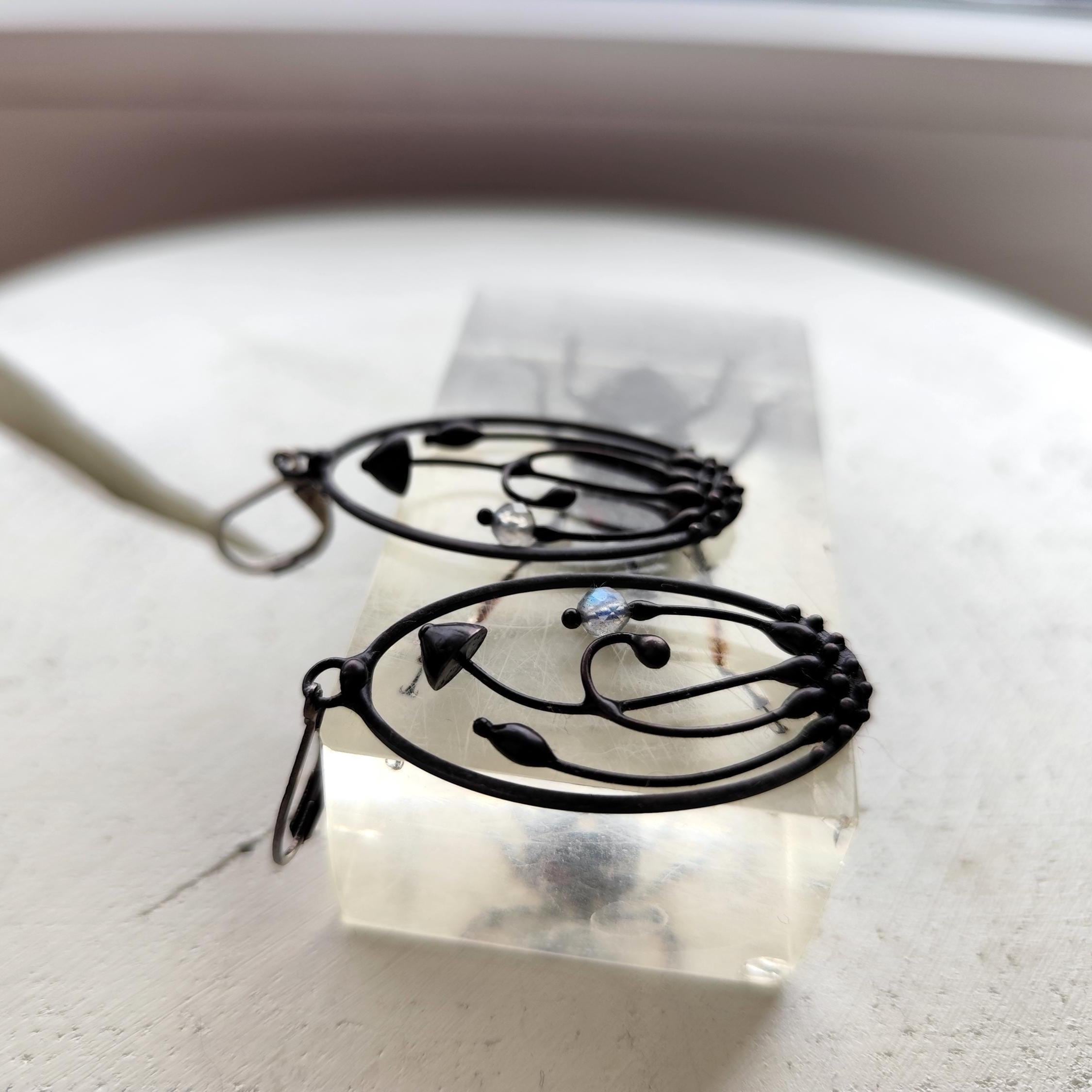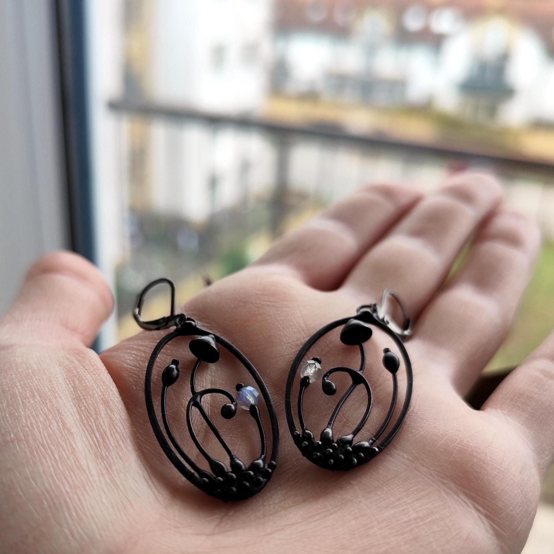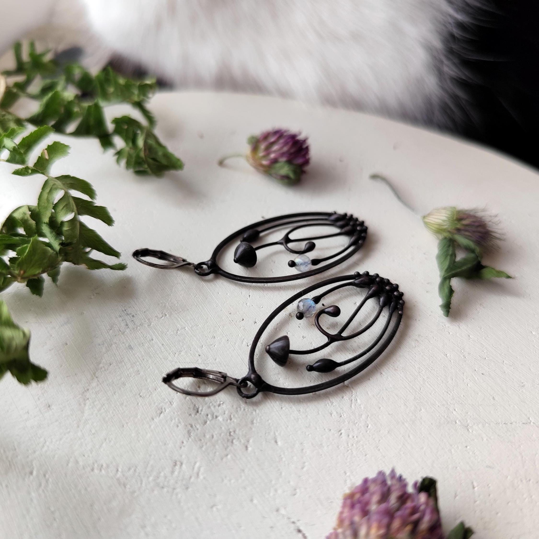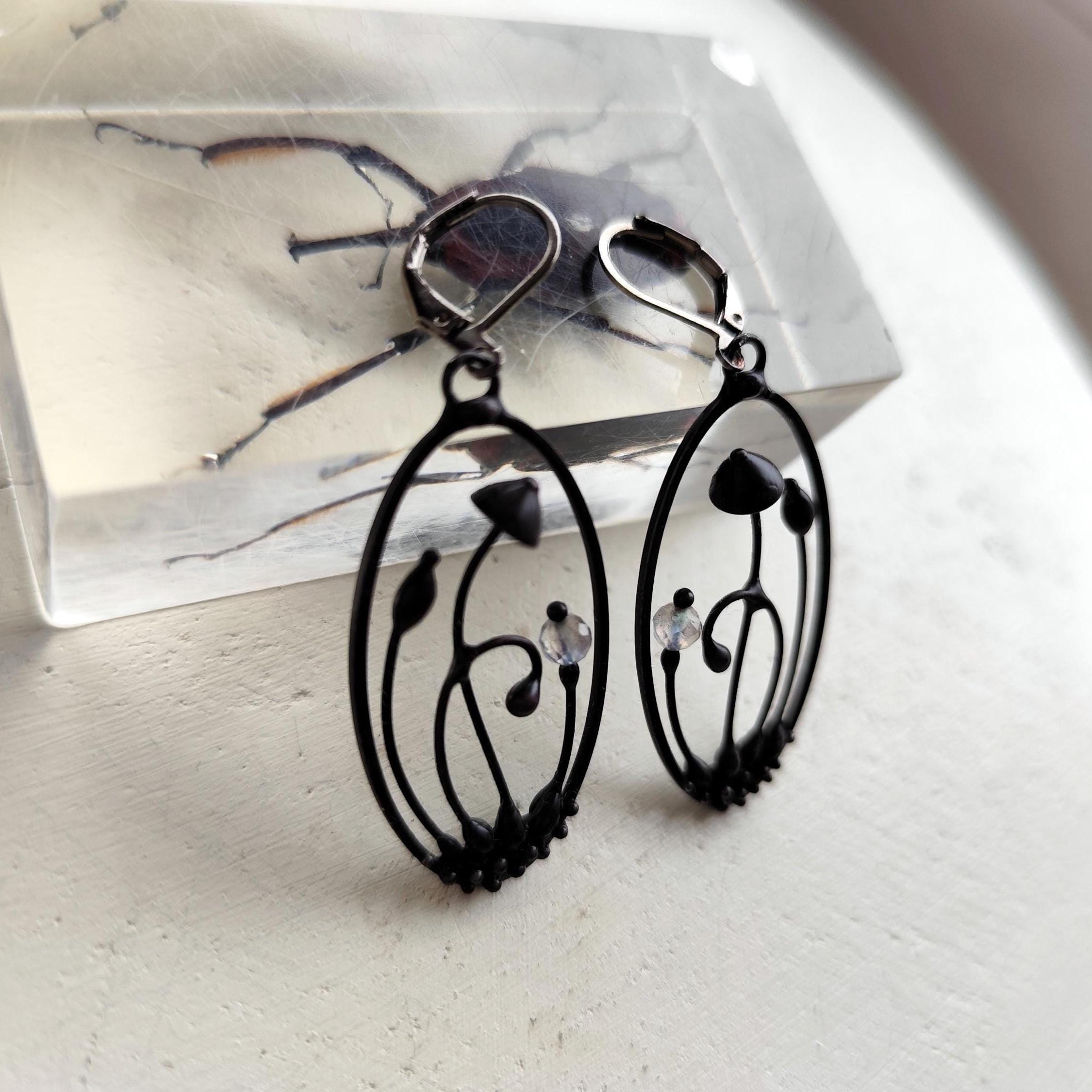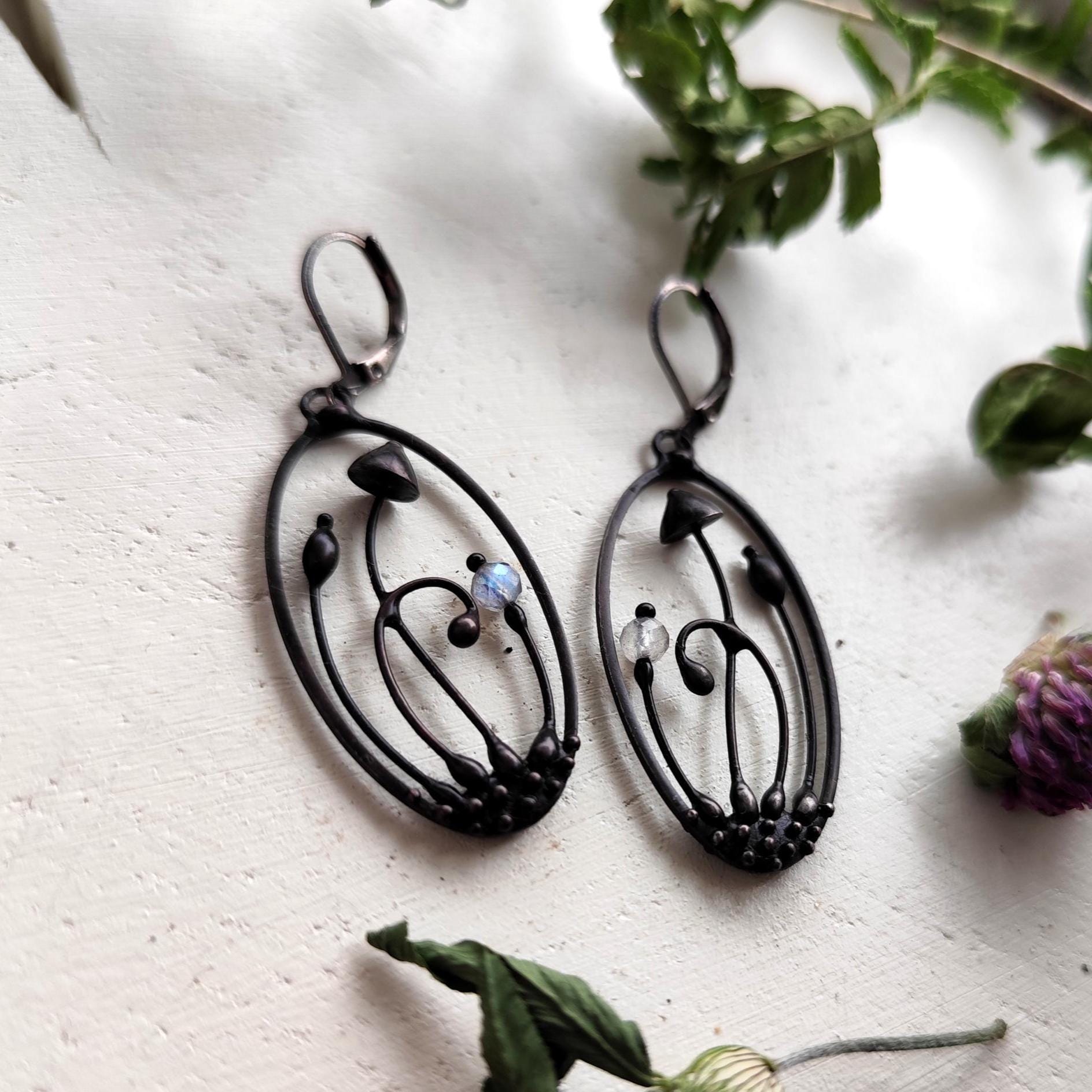 This mushroom fairy earrings handmade from copper, pewter alloy, steel and labradorite stone beads. Covered with patina treated with antioxidant, sanded, polished. Light and sturdy. All elements are handmade, which ensures the individuality of each product made in the Yadovito workshop. Polished with a finishing solution to give the jewelry a noble appearance and at the same time so that the metal does not oxidize. The mushroom earrings use glass melted in a special furnace. After melting, the glass takes on an almost unique shape and amazing color shades that play in the light. Size about 4/2cm (1.6 * 0.8 in). Color black/blue.