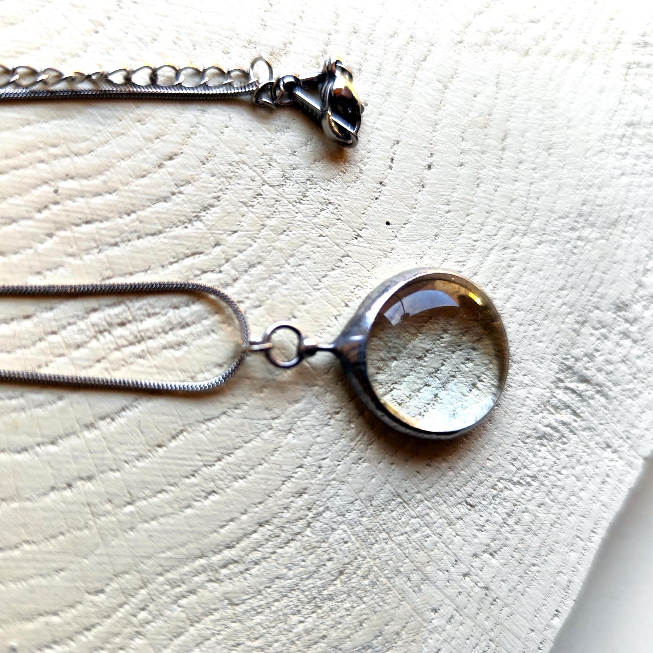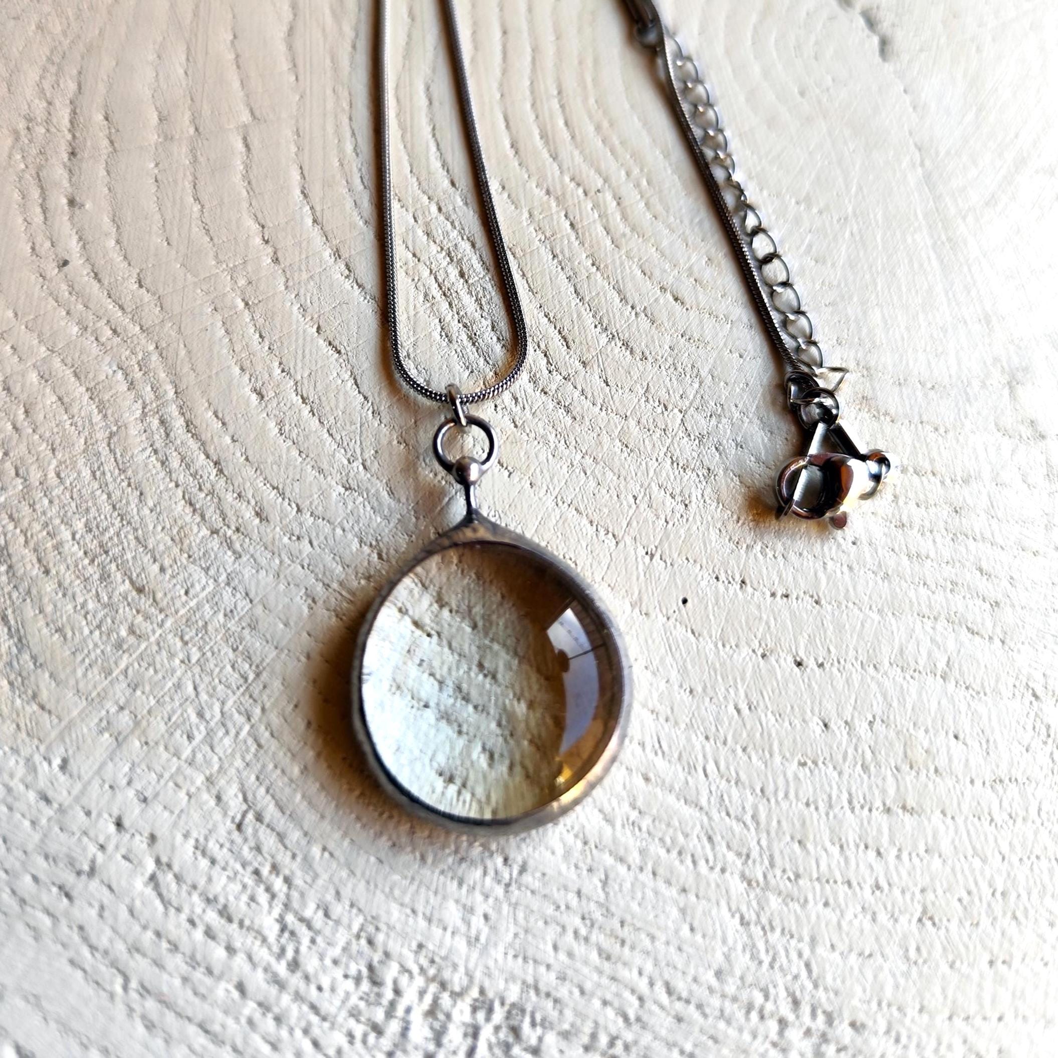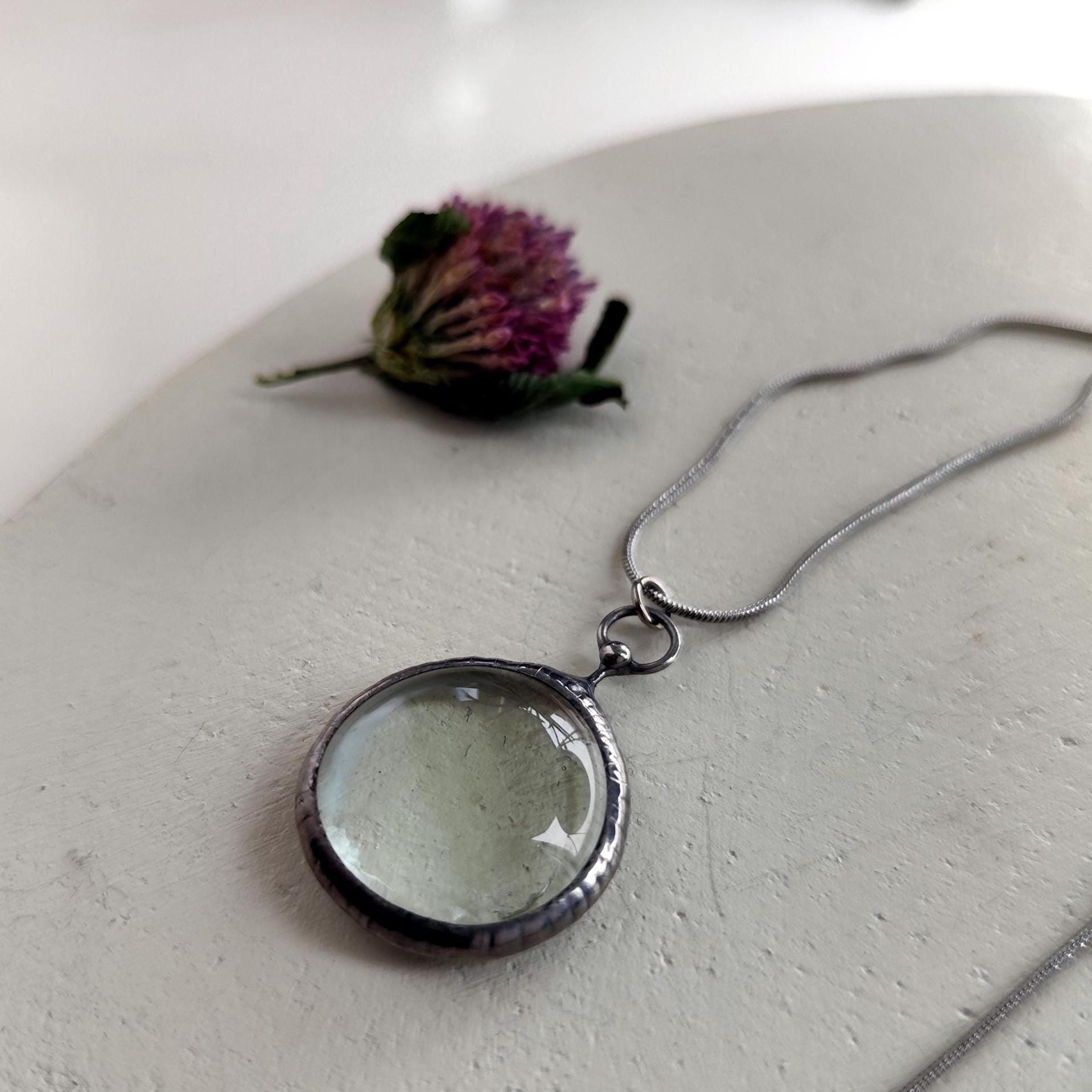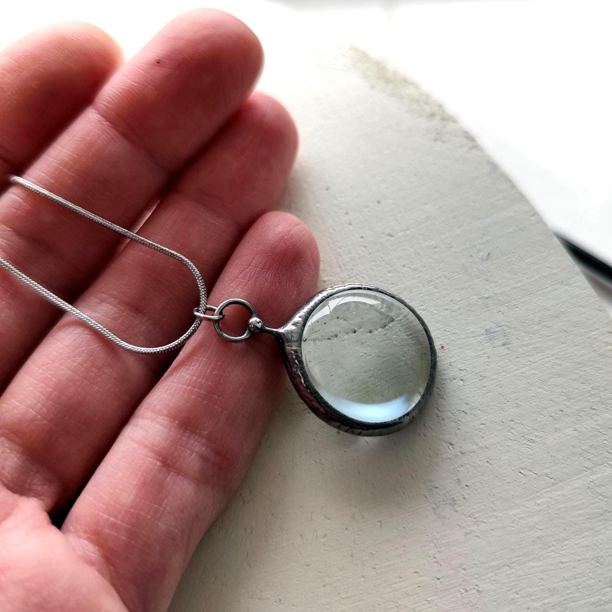 Handmade minimalistic circle metal pendant necklace with clear glass handmade from copper, pewter, steel and glass. Treated with antioxidant, sanded, polished. All elements are handmade, which ensures the individuality of each product made in the Yadovito workshop. The copper alloy is polished with a finishing solution to give the jewelry a noble appearance and at the same time so that the metal does not oxidize. Size about 2.2 cm (1 in). Color silver/clear.