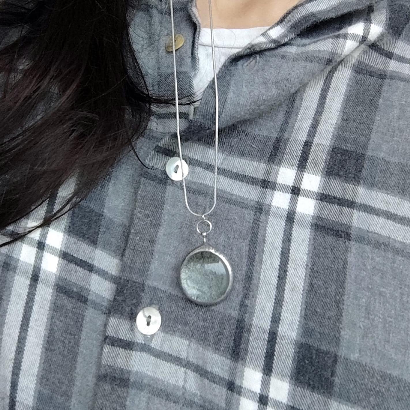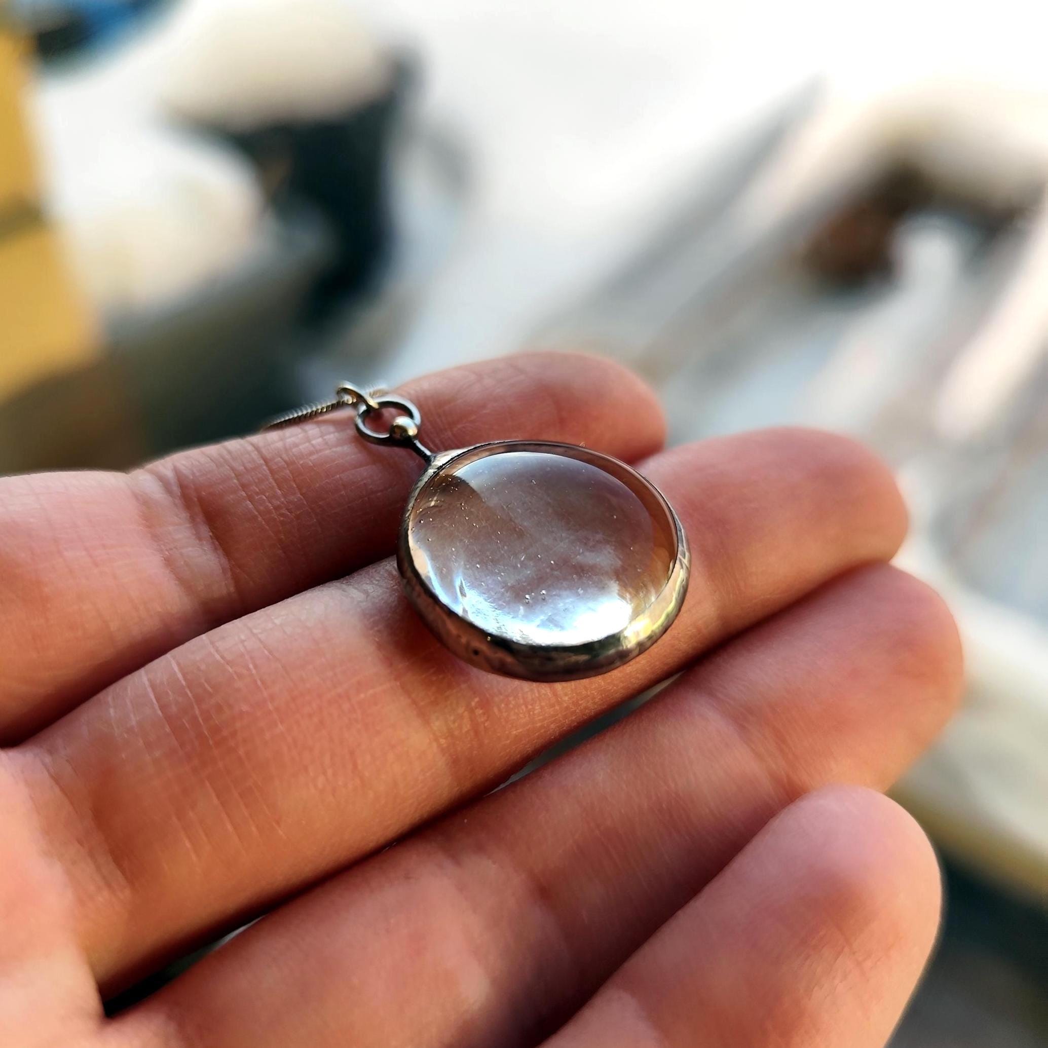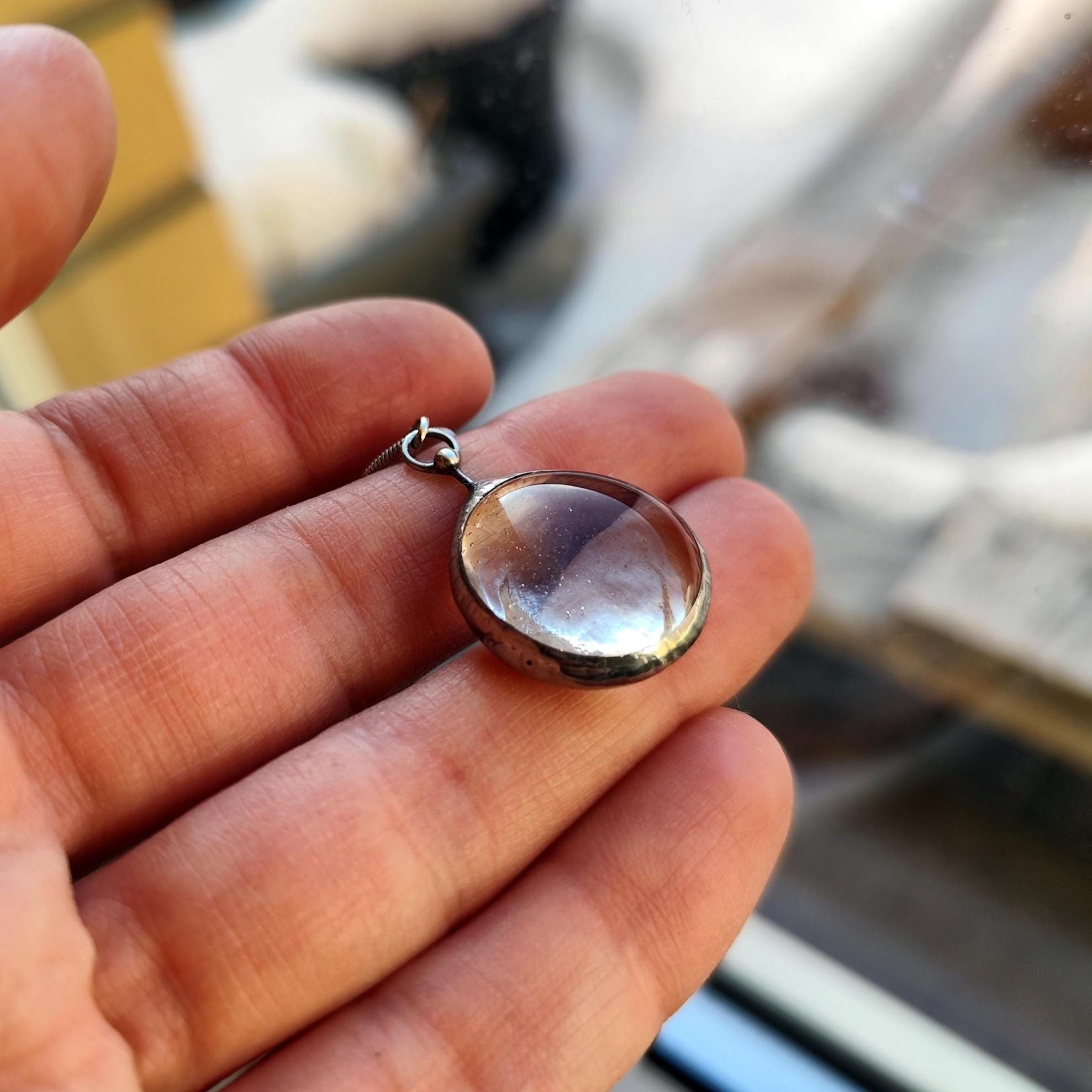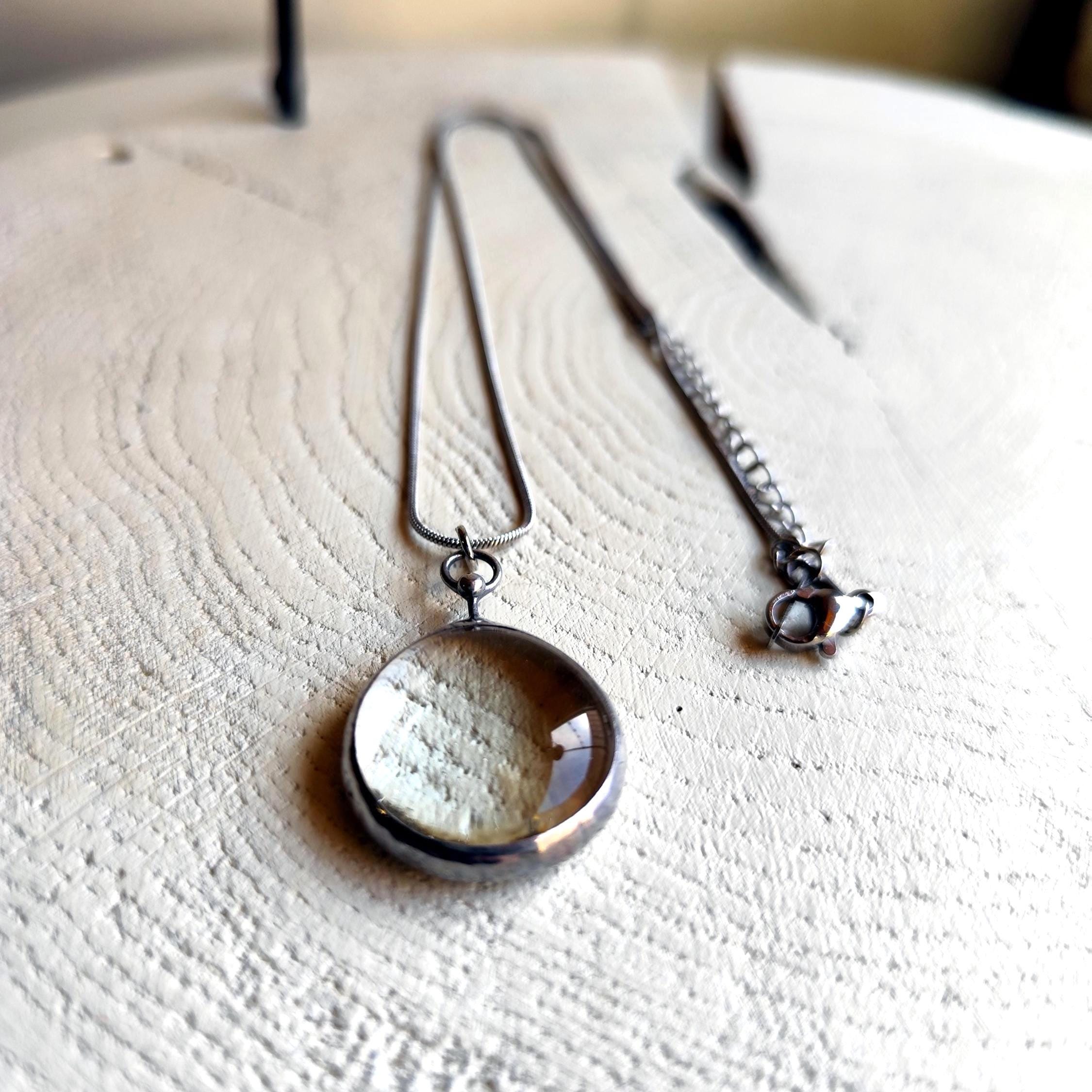 Handmade minimalistic circle metal pendant necklace with clear glass handmade from copper, pewter, steel and glass. Treated with antioxidant, sanded, polished. All elements are handmade, which ensures the individuality of each product made in the Yadovito workshop. The copper alloy is polished with a finishing solution to give the jewelry a noble appearance and at the same time so that the metal does not oxidize. Size about 2.2 cm (1 in). Color silver/clear.