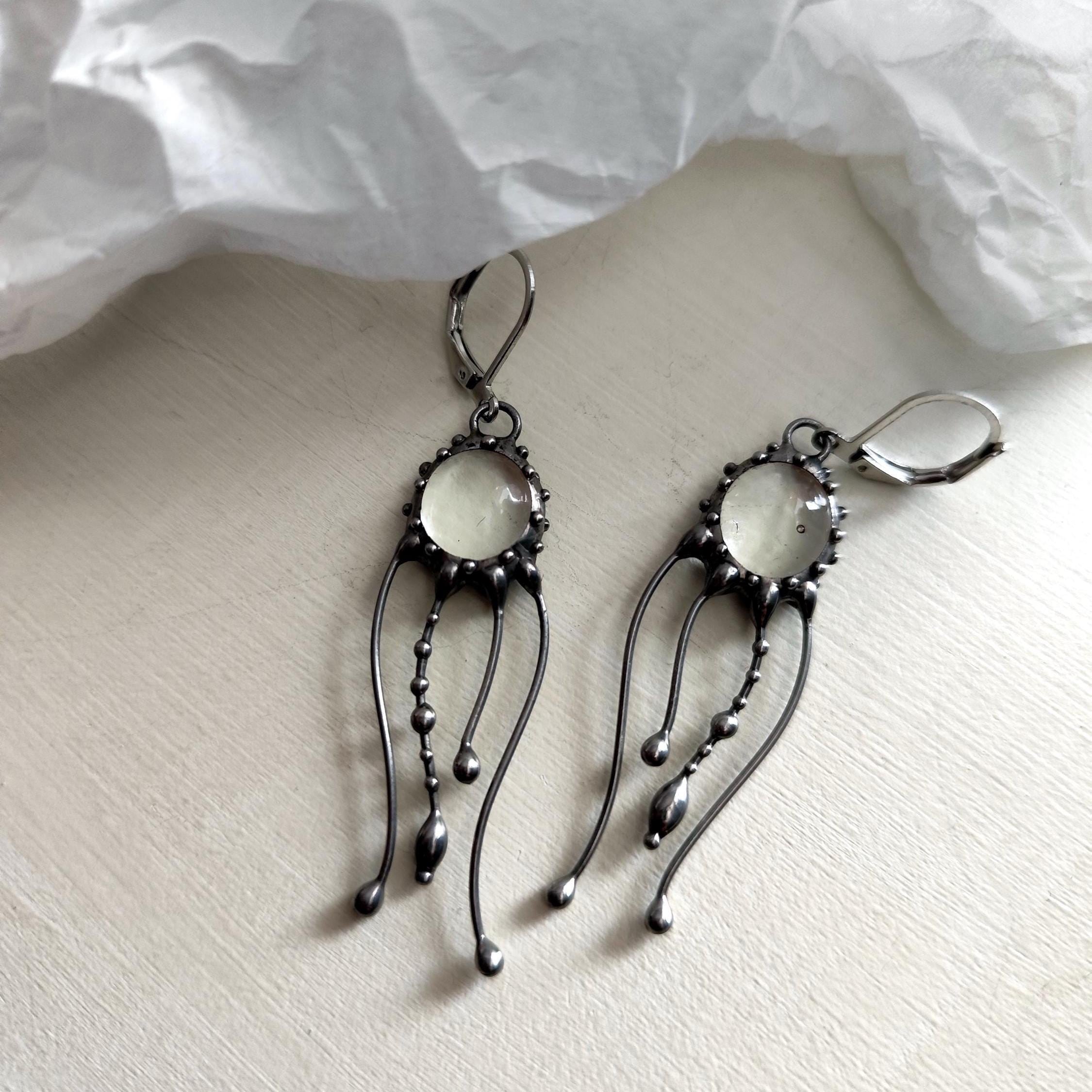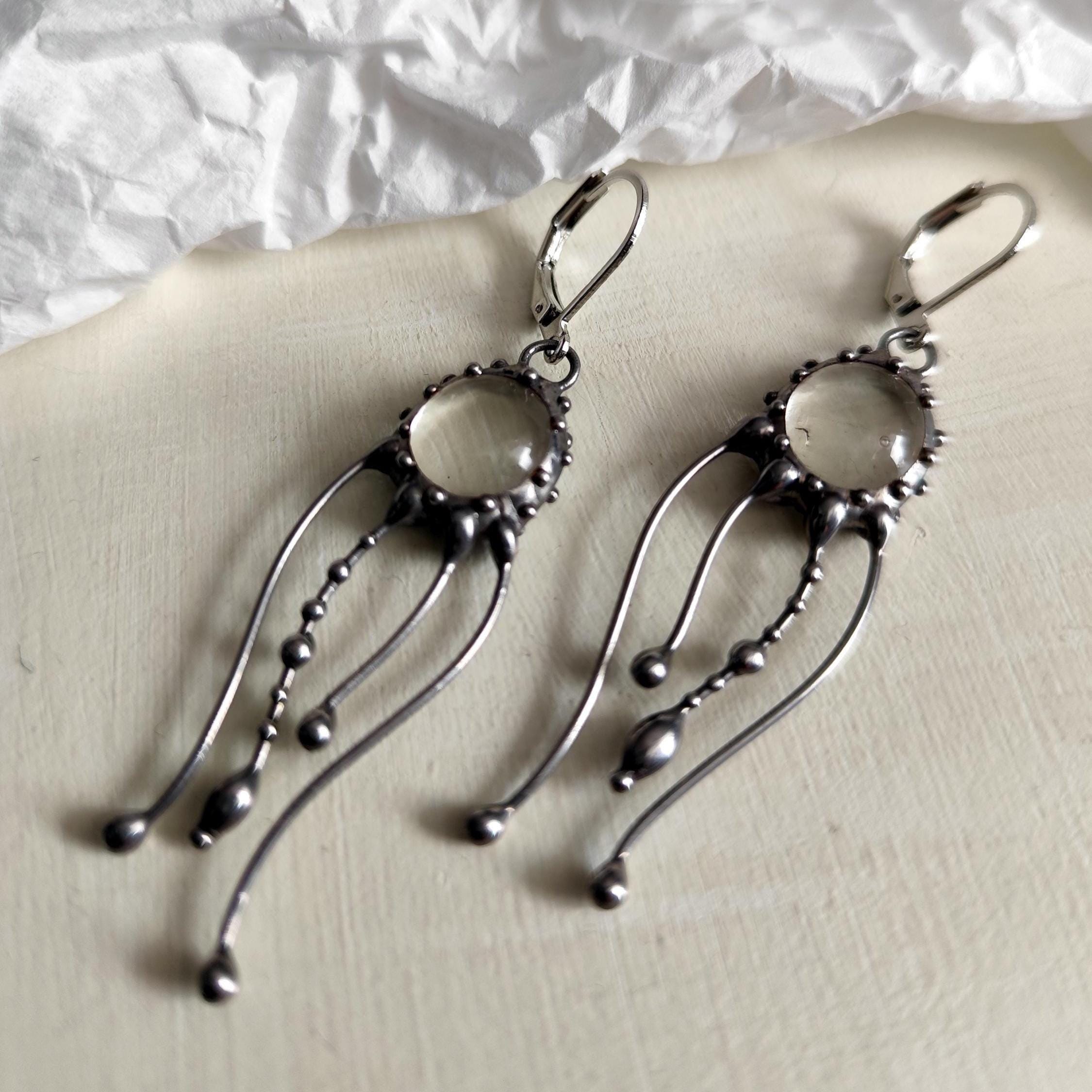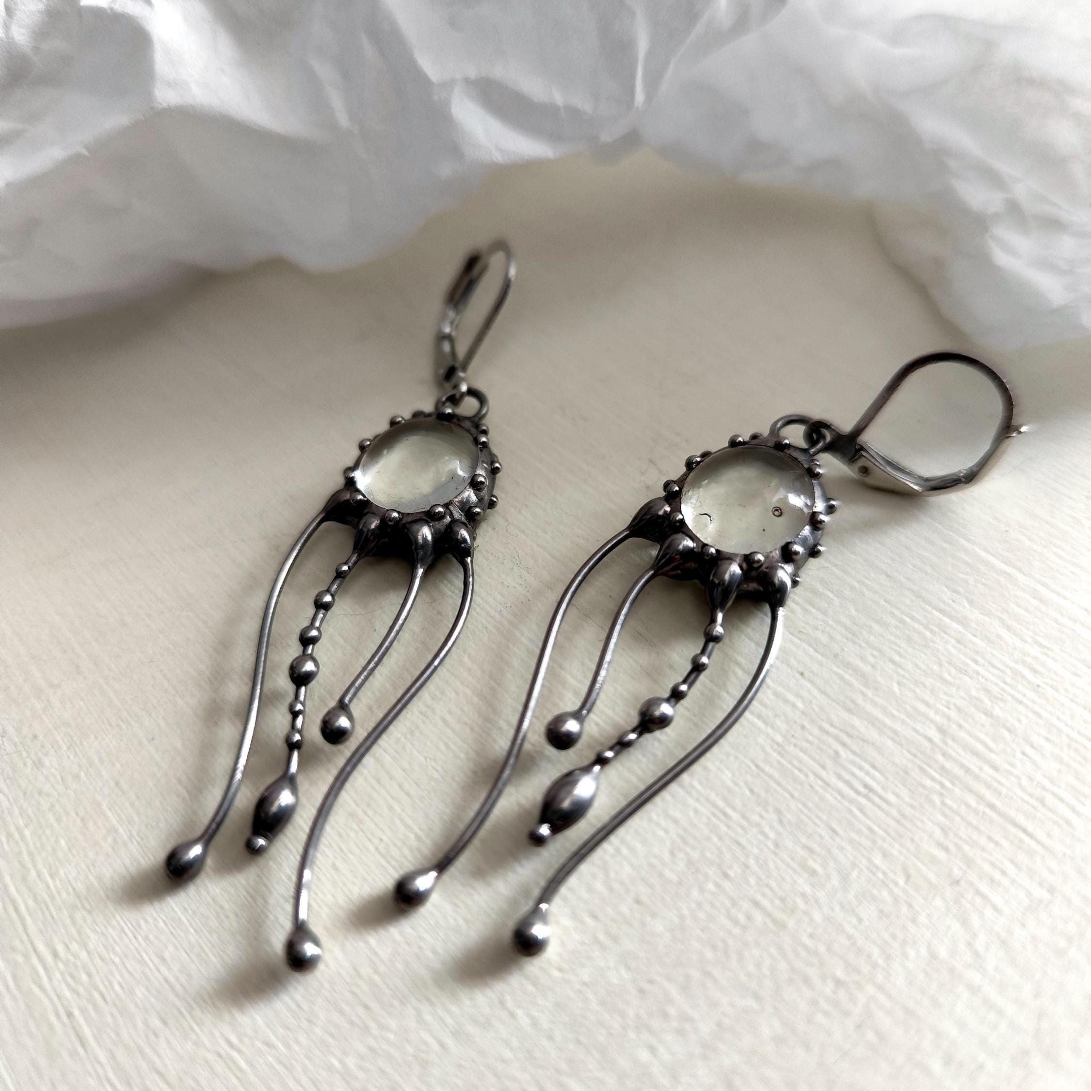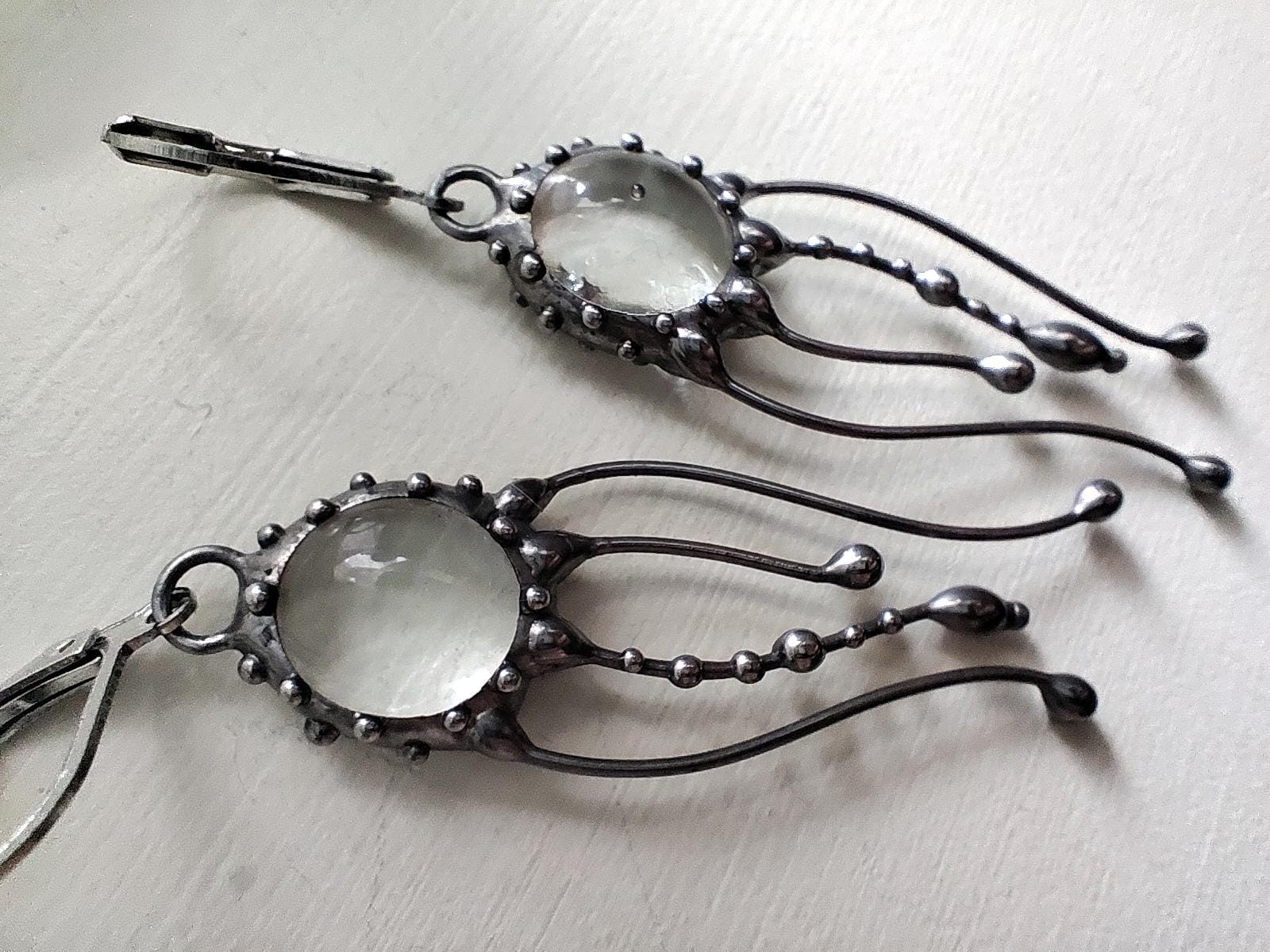 Art nouveau Jellyfish Stained glass earrings hand made from copper, pewter, steel, clear glass. The earring is light and sturdy. All elements are handmade, which ensures the individuality of each product made in the Yadovito workshop. The copper alloy is polished with a finishing solution to give the jewelry a noble appearance and at the same time so that the metal does not oxidize.