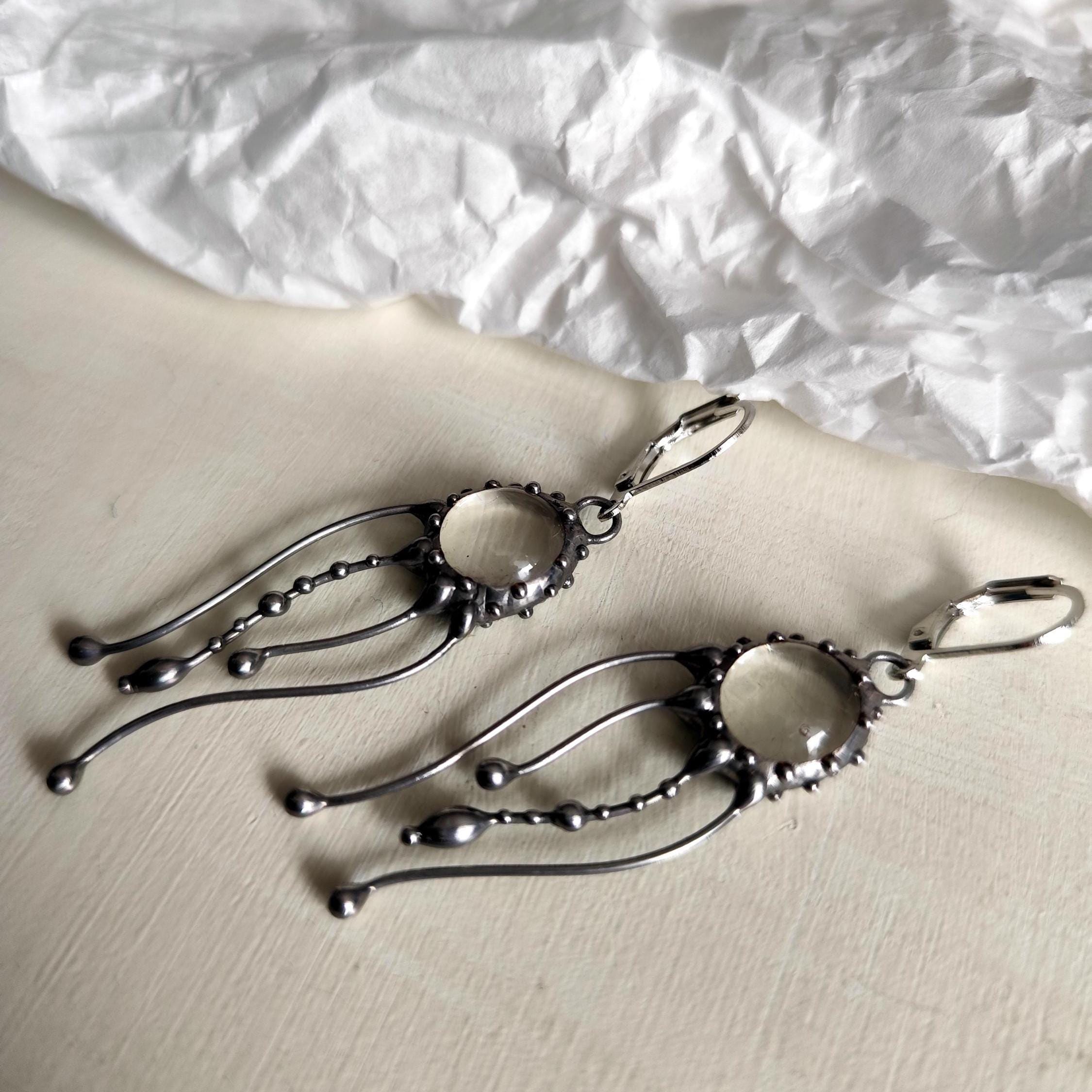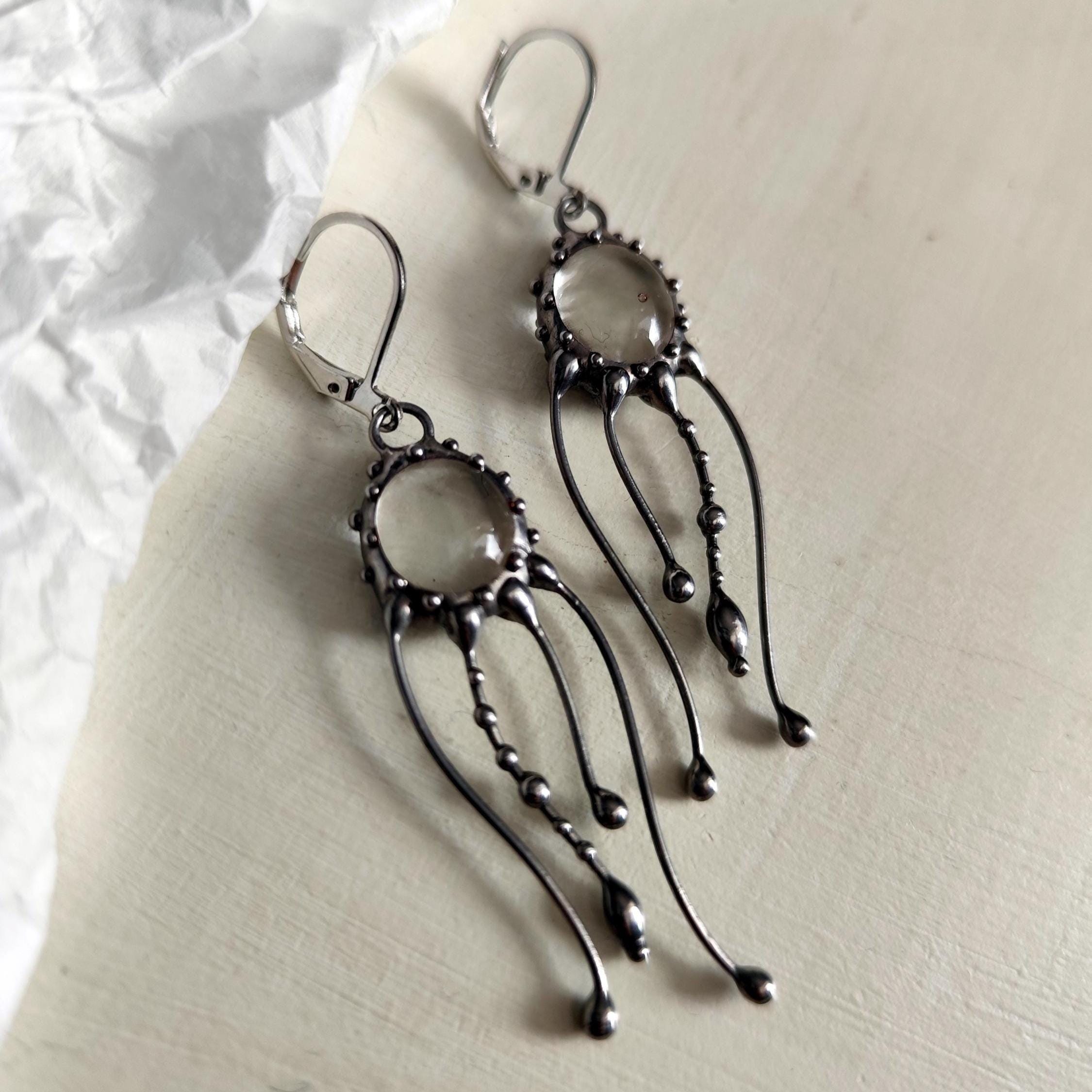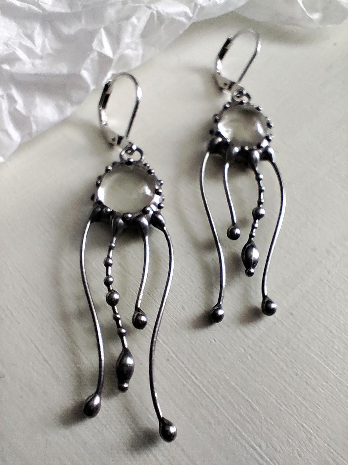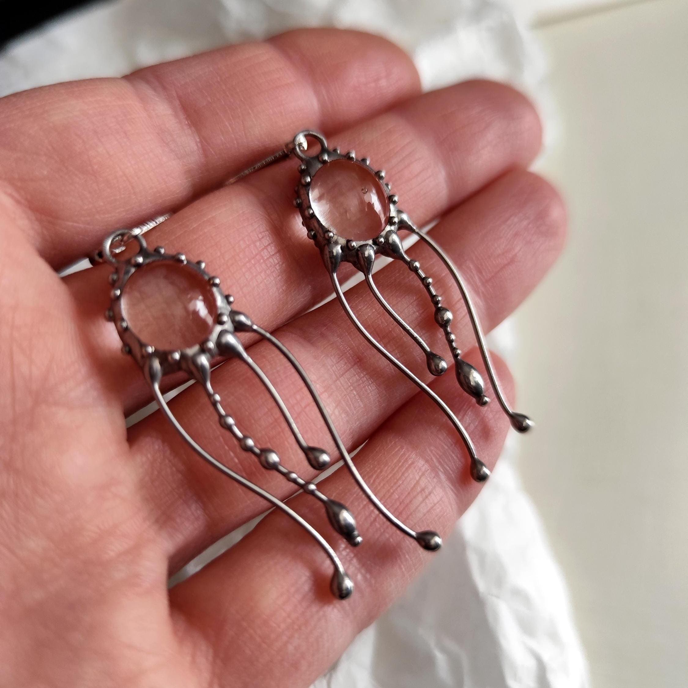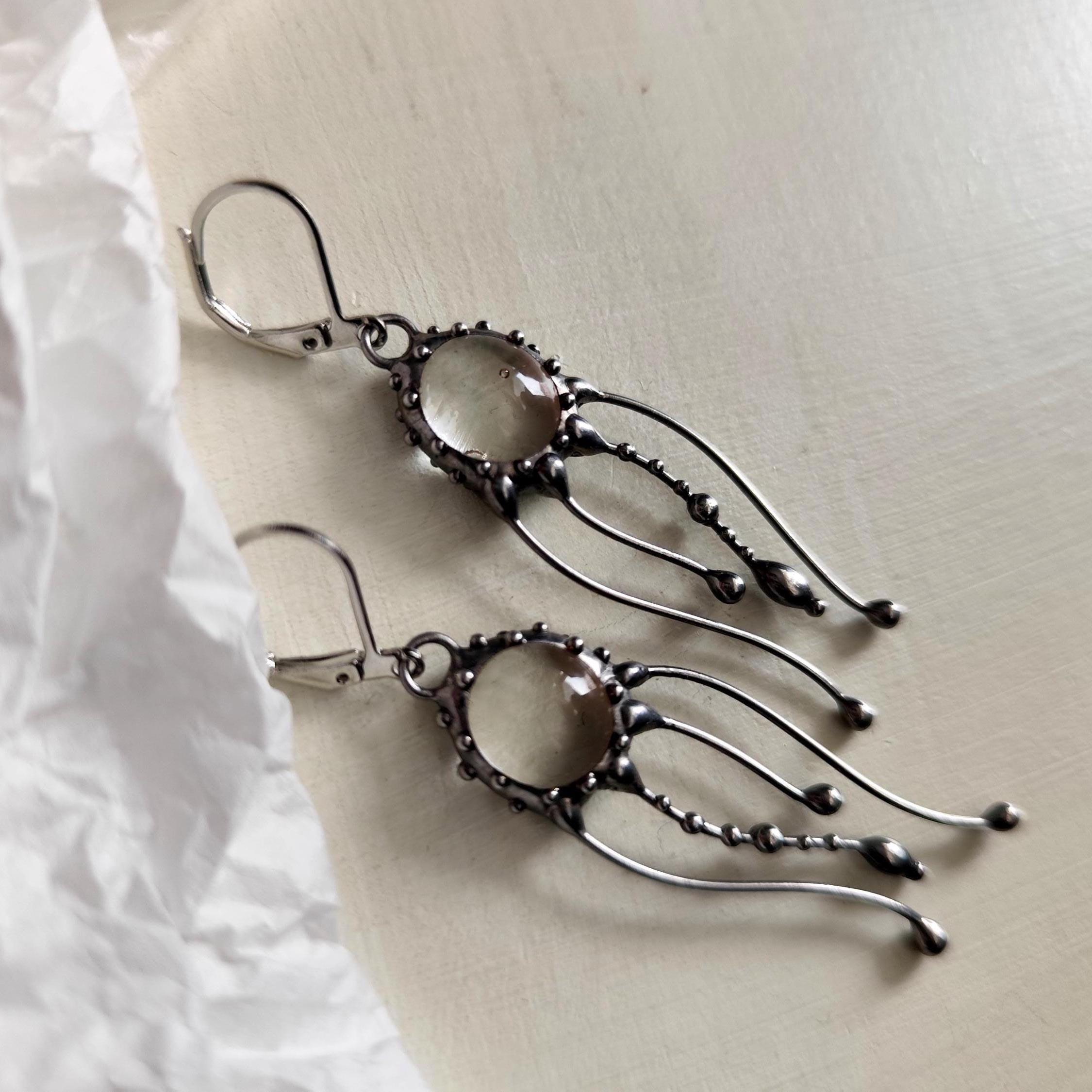Art nouveau Jellyfish Stained glass earrings hand made from copper, pewter, steel, clear glass. The earring is light and sturdy. All elements are handmade, which ensures the individuality of each product made in the Yadovito workshop. The copper alloy is polished with a finishing solution to give the jewelry a noble appearance and at the same time so that the metal does not oxidize.