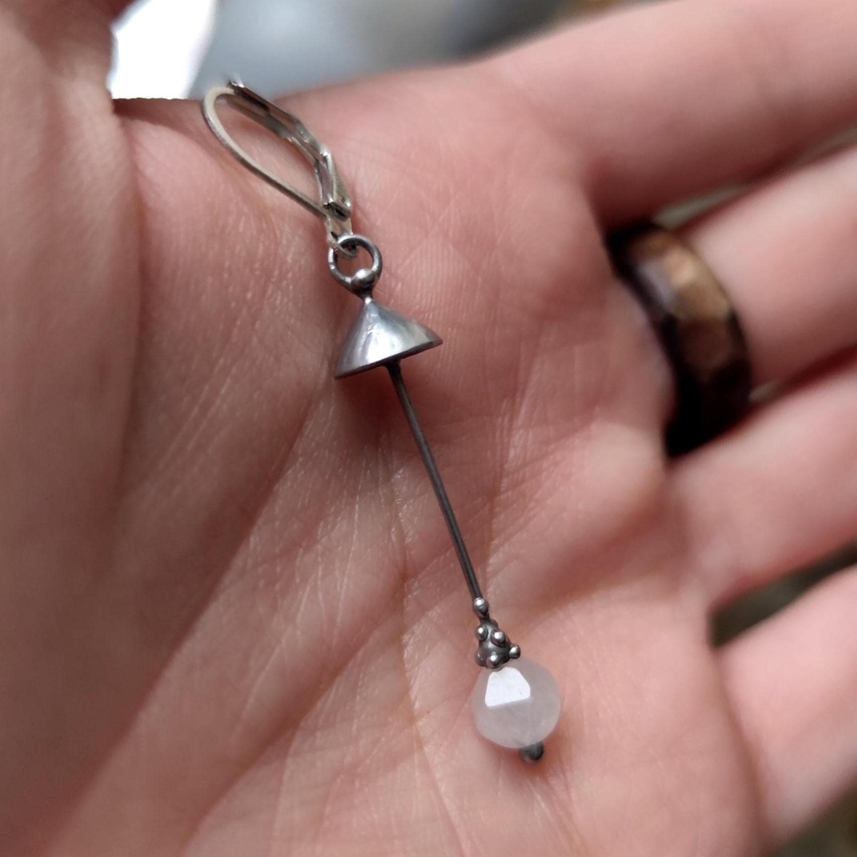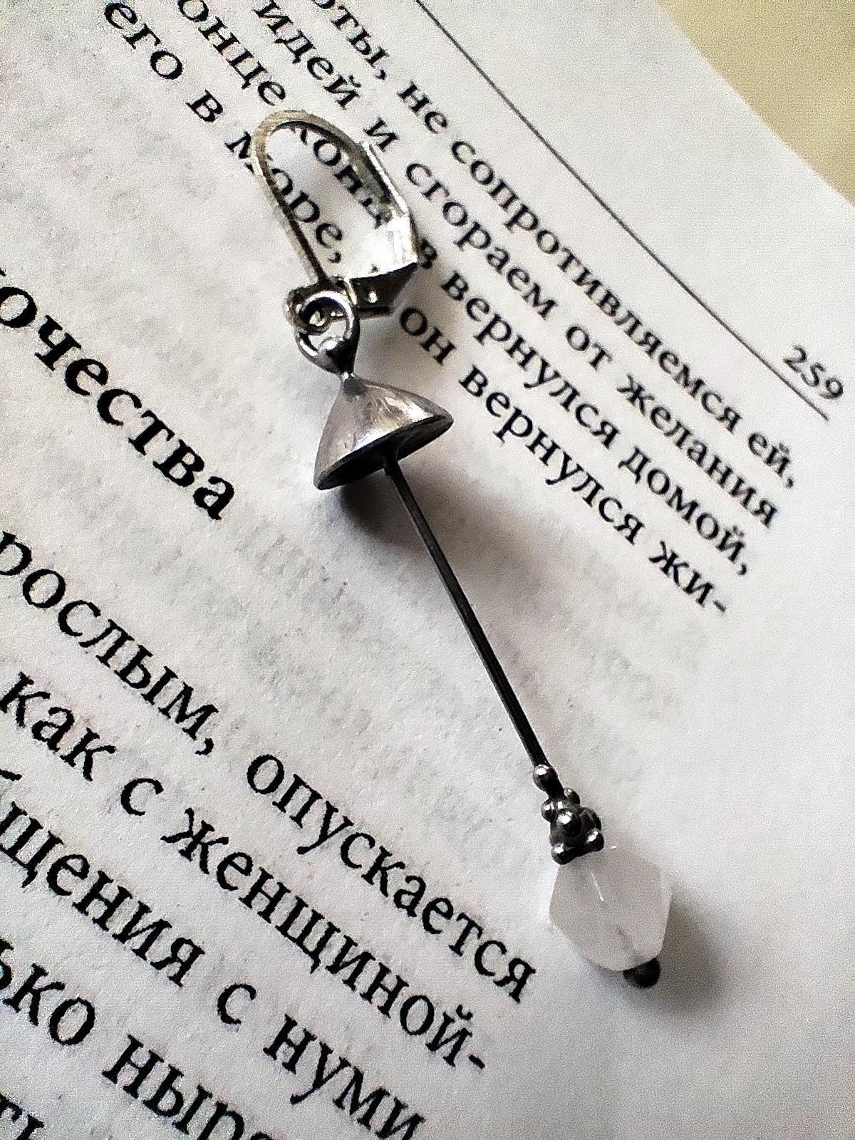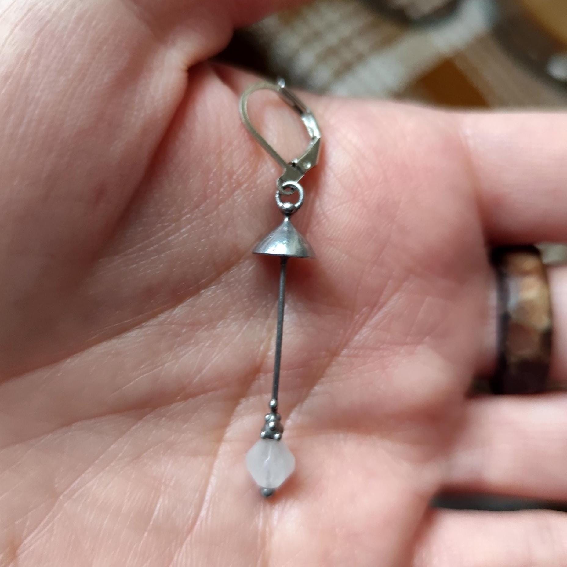Aesthetic witchcarft magic mushroom one earring handcrafted from copper, pewter, steel and pink quartz. Covered with patina and treated with antioxidant, sanded, polished. Light and sturdy inspired by wild nature fungi single earring. All elements are handmade, which ensures the individuality of each product made in the Yadovito workshop. The copper alloy is polished with a finishing solution to give the jewelry a noble appearance and at the same time so that the metal does not oxidize. Size about 4.5/0.8 cm (1.7 * 0.3 in). Color silver/pink.
