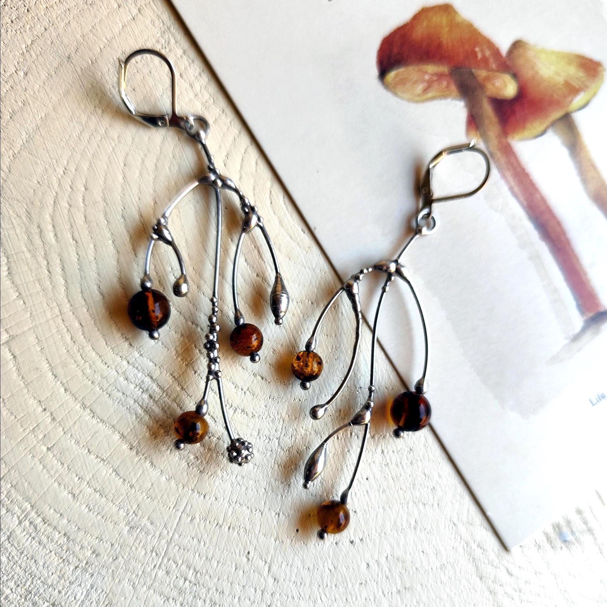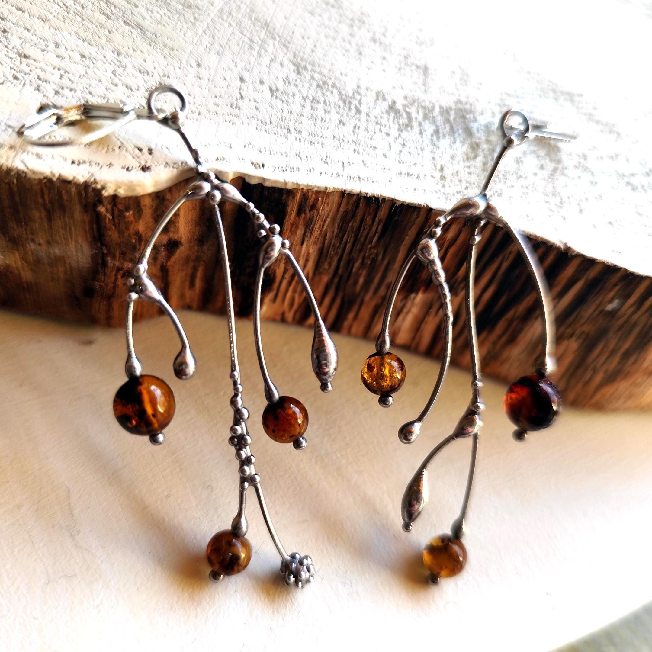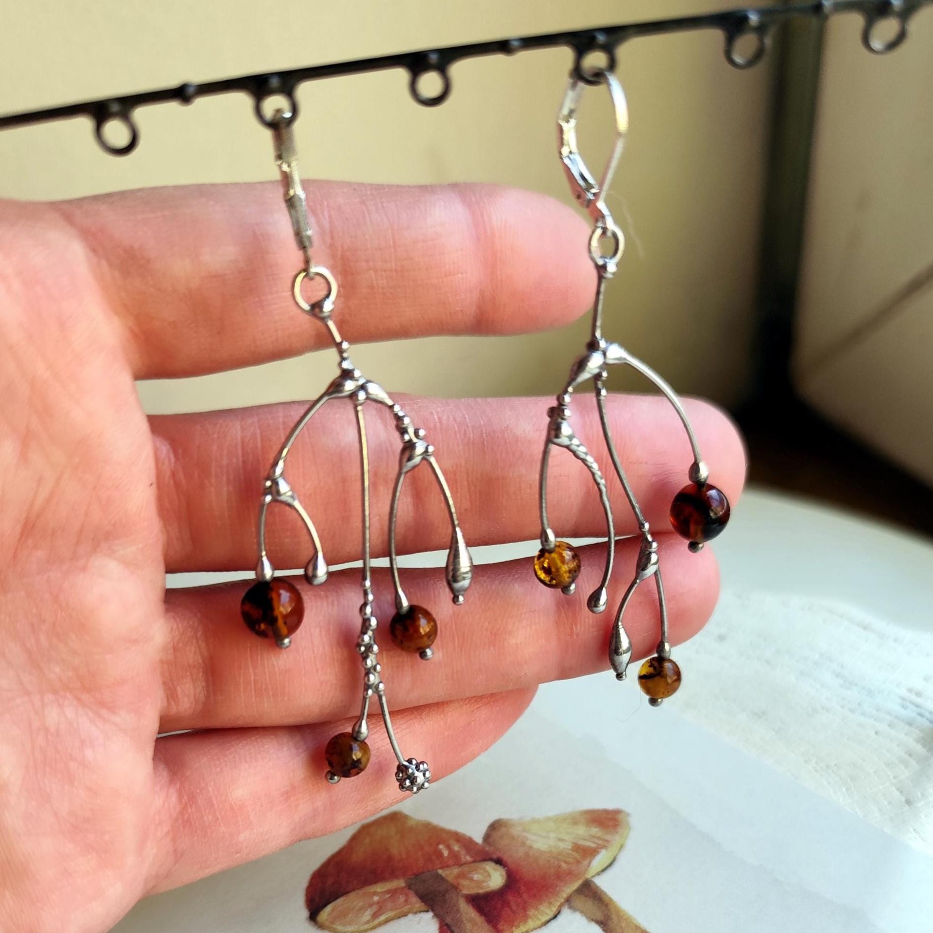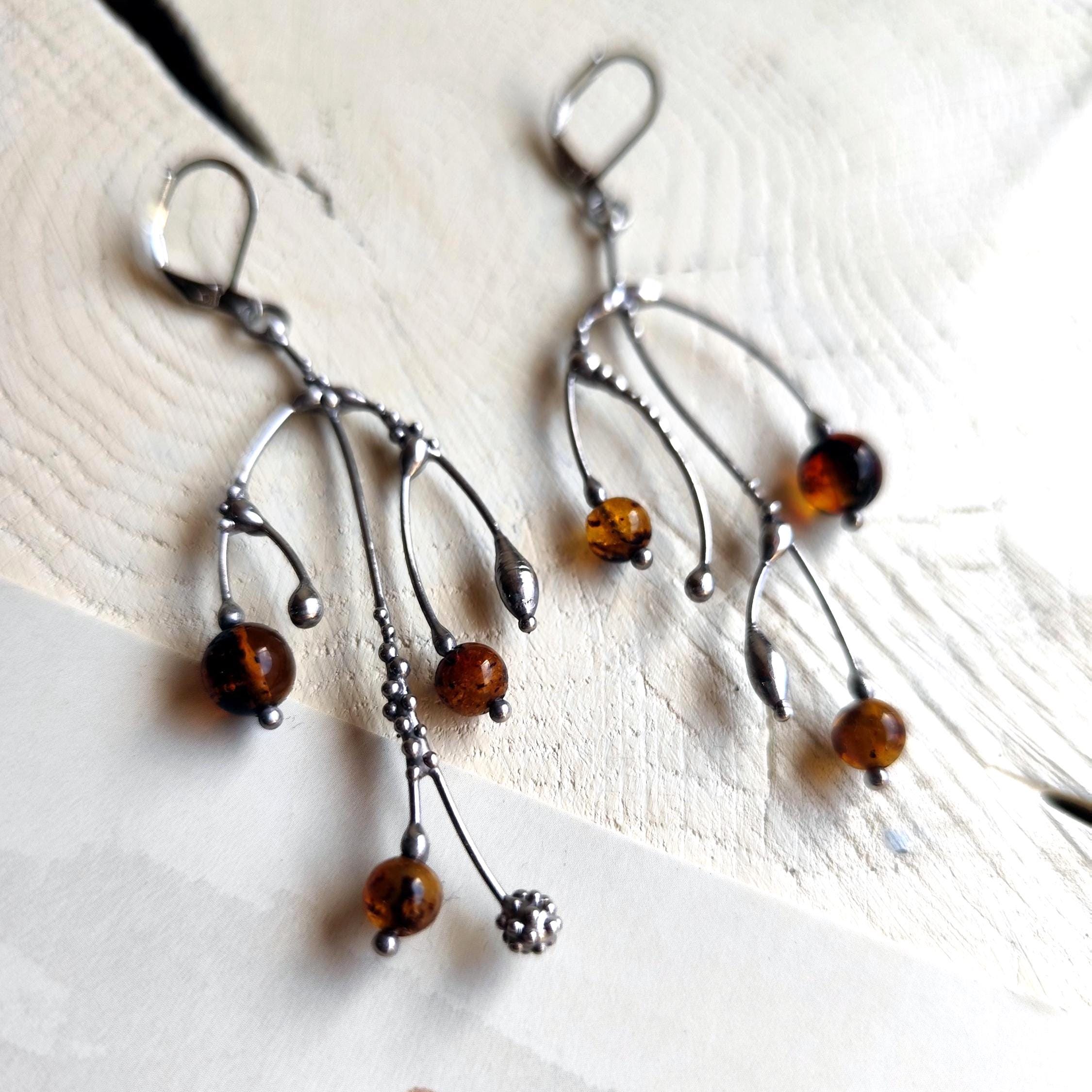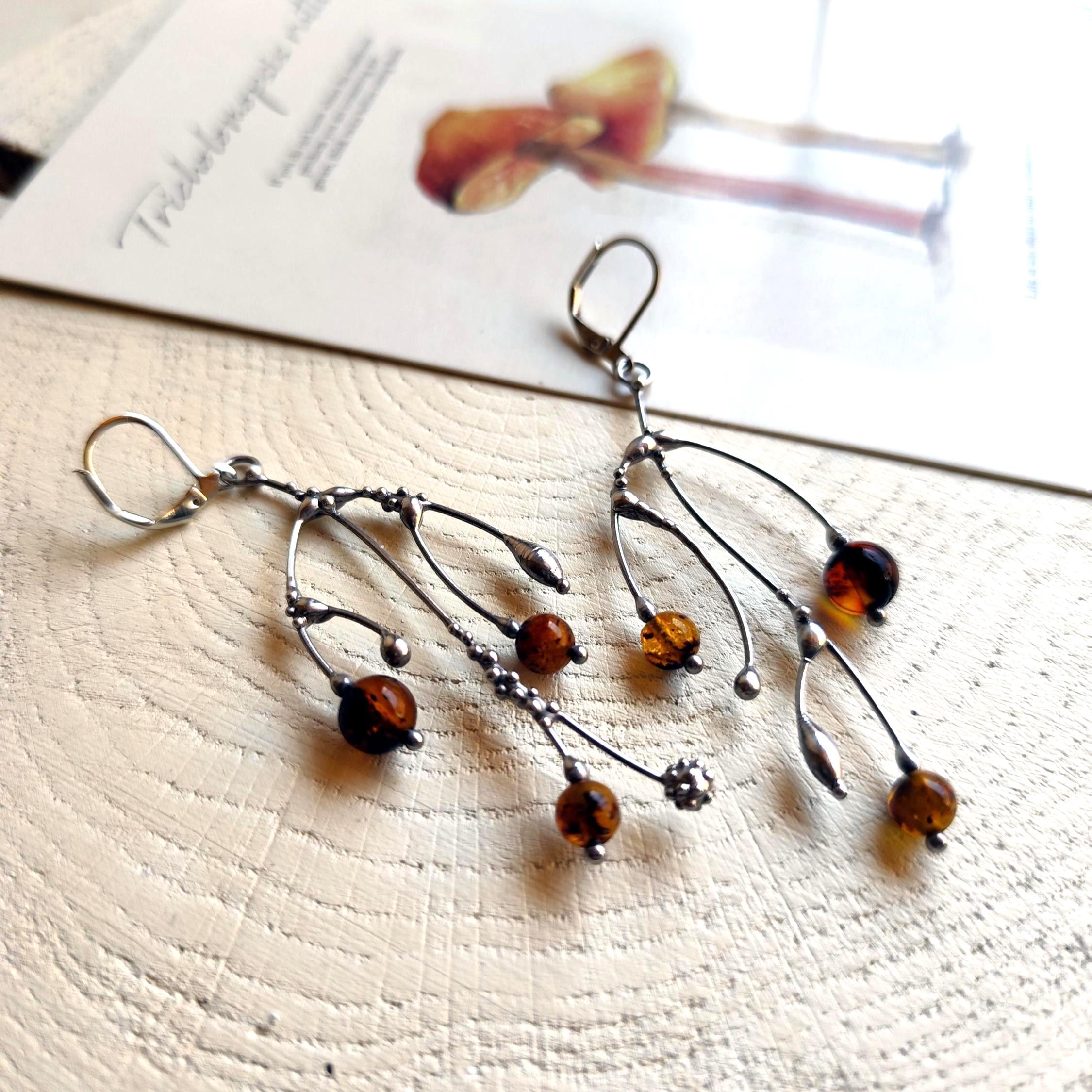 These asymmetrical forest earrings "tree branch earrings" made from copper, pewter, steel and amber beads. They are light, thin and asymmetrical. All elements are handmade, which ensures the individuality of each product made in the Yadovito workshop. The copper alloy is polished with a finishing solution to give the jewelry a noble appearance and at the same time so that the metal does not oxidize. The earrings use glass melted in a special furnace. After melting, the glass takes on an almost unique shape and amazing color shades that play in the light. Size about 6 * 3 cm (2.3 * 1.1 in). Color silver/brown.