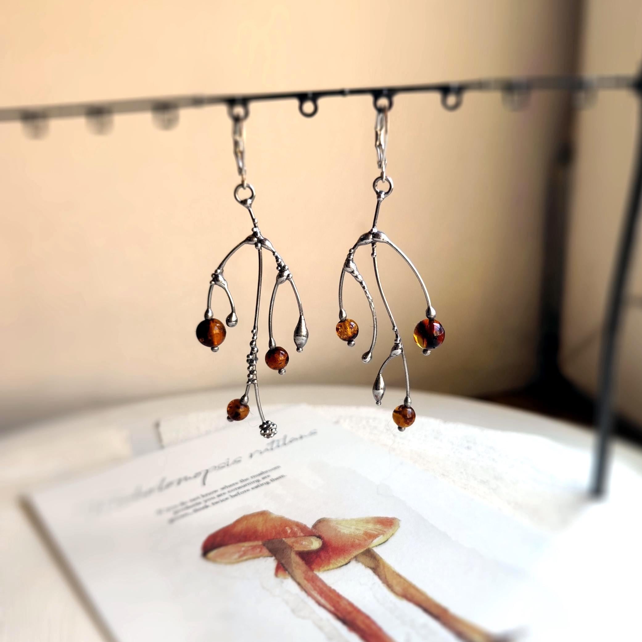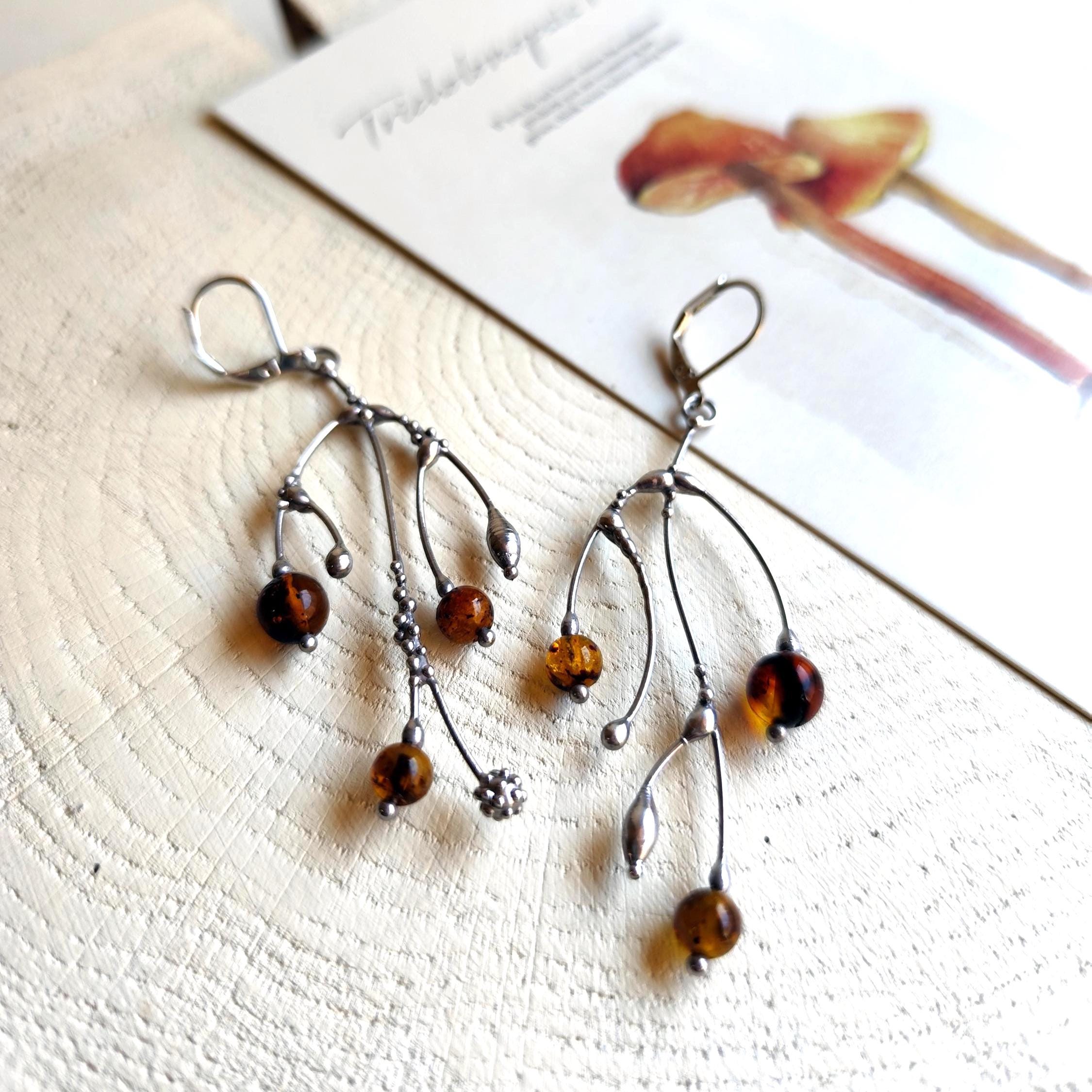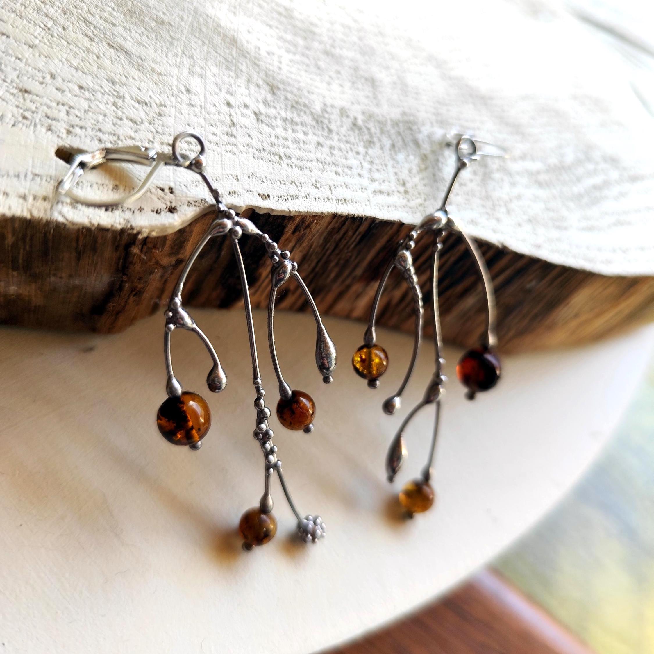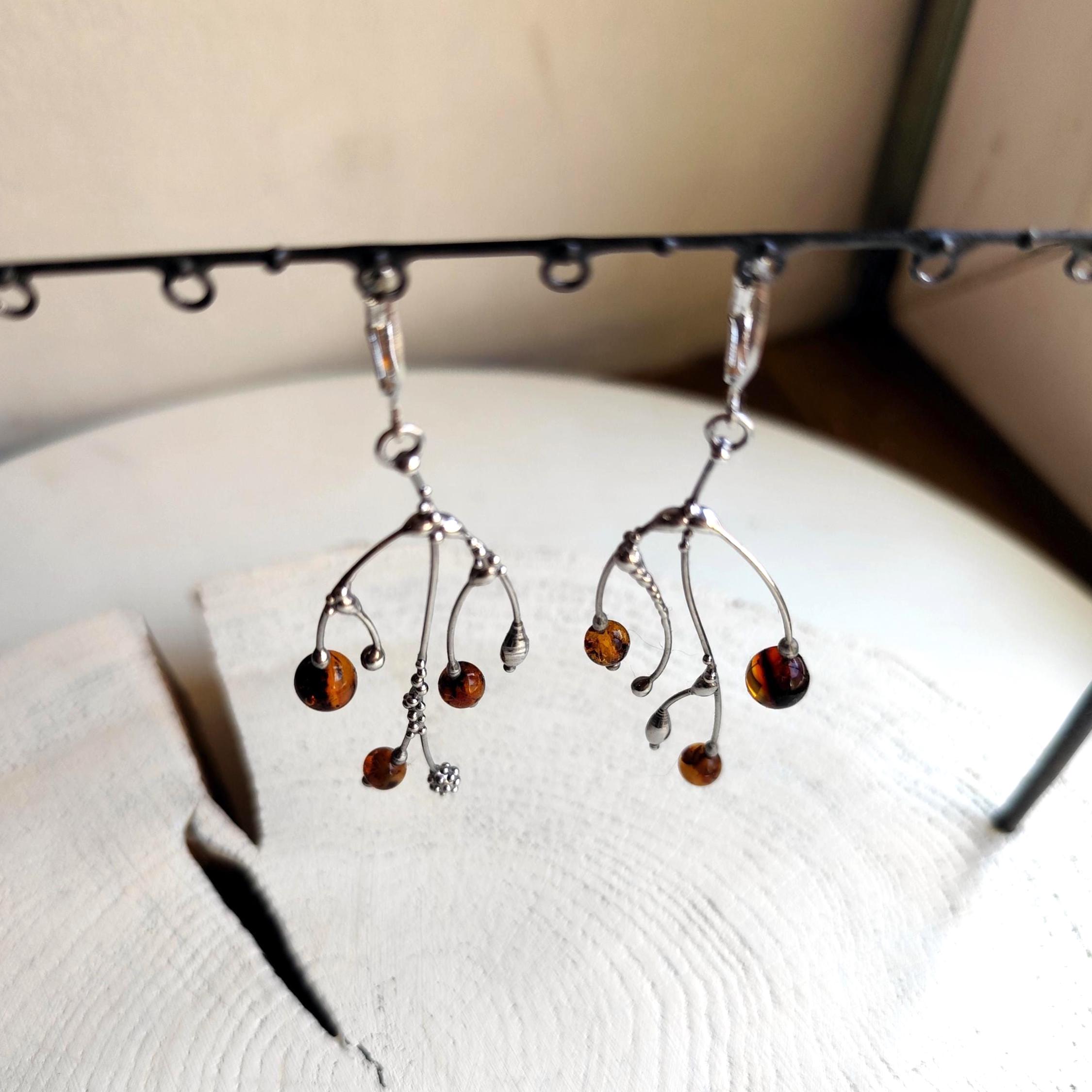 These asymmetrical forest earrings "tree branch earrings" made from copper, pewter, steel and amber beads. They are light, thin and asymmetrical. All elements are handmade, which ensures the individuality of each product made in the Yadovito workshop. The copper alloy is polished with a finishing solution to give the jewelry a noble appearance and at the same time so that the metal does not oxidize. The earrings use glass melted in a special furnace. After melting, the glass takes on an almost unique shape and amazing color shades that play in the light. Size about 6 * 3 cm (2.3 * 1.1 in). Color silver/brown.
