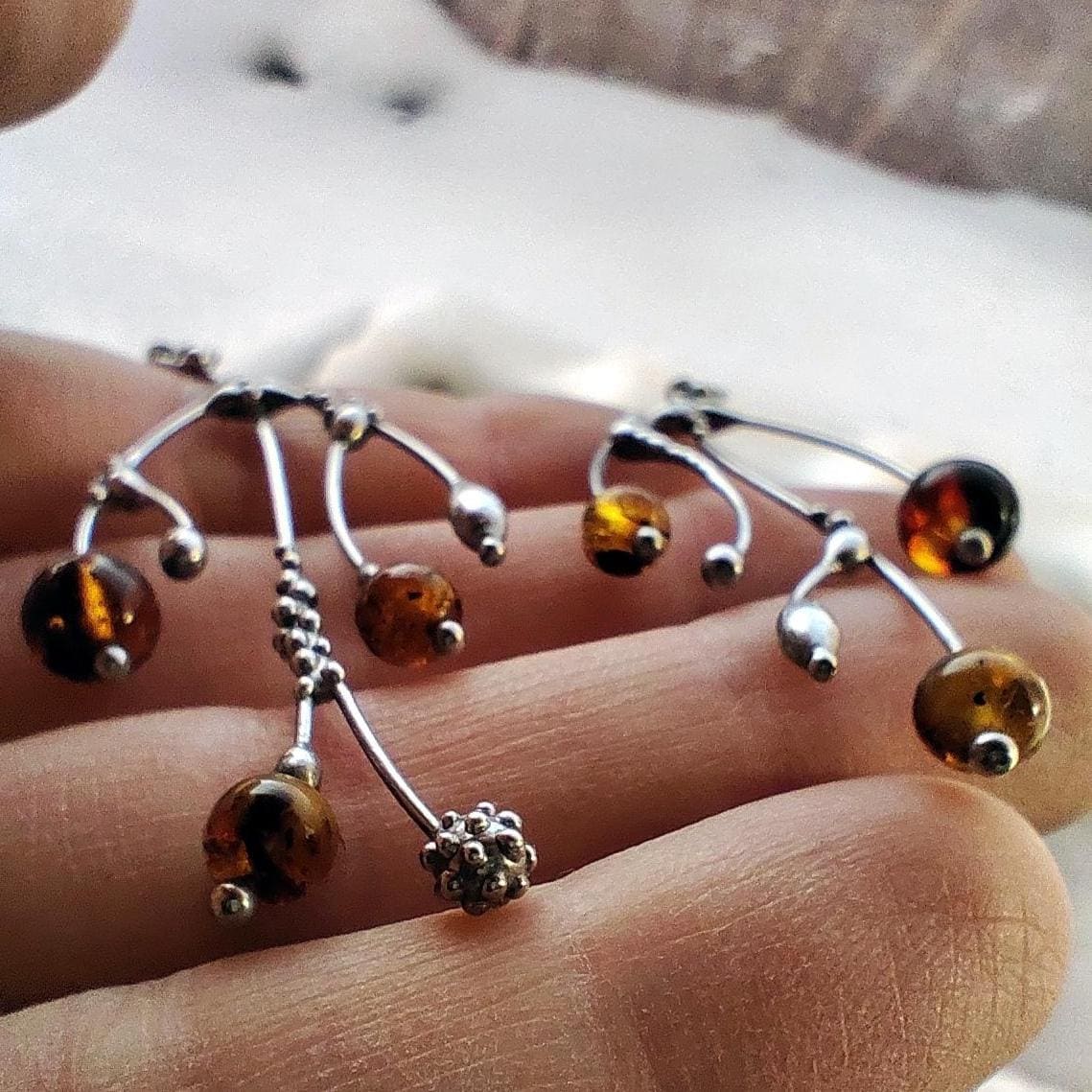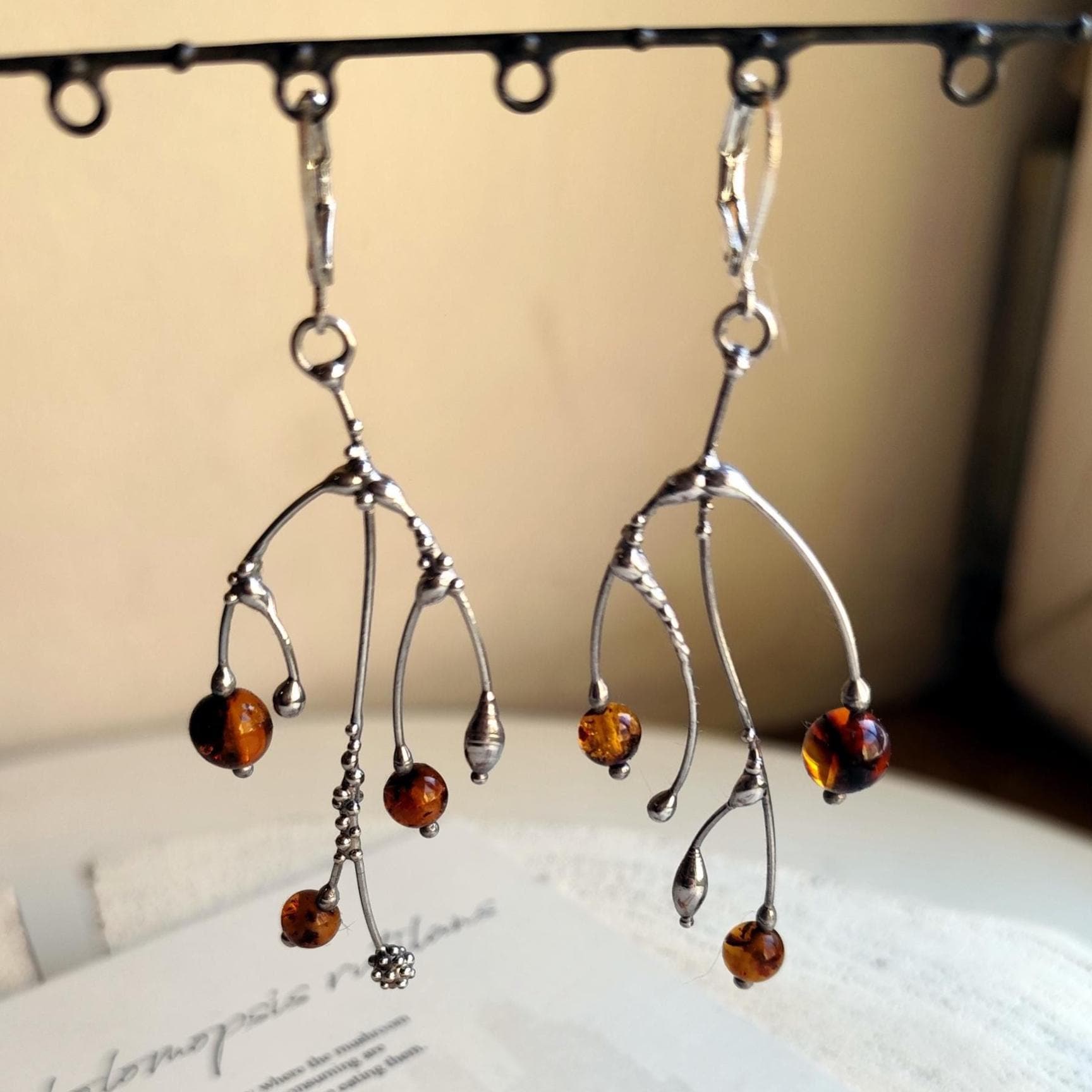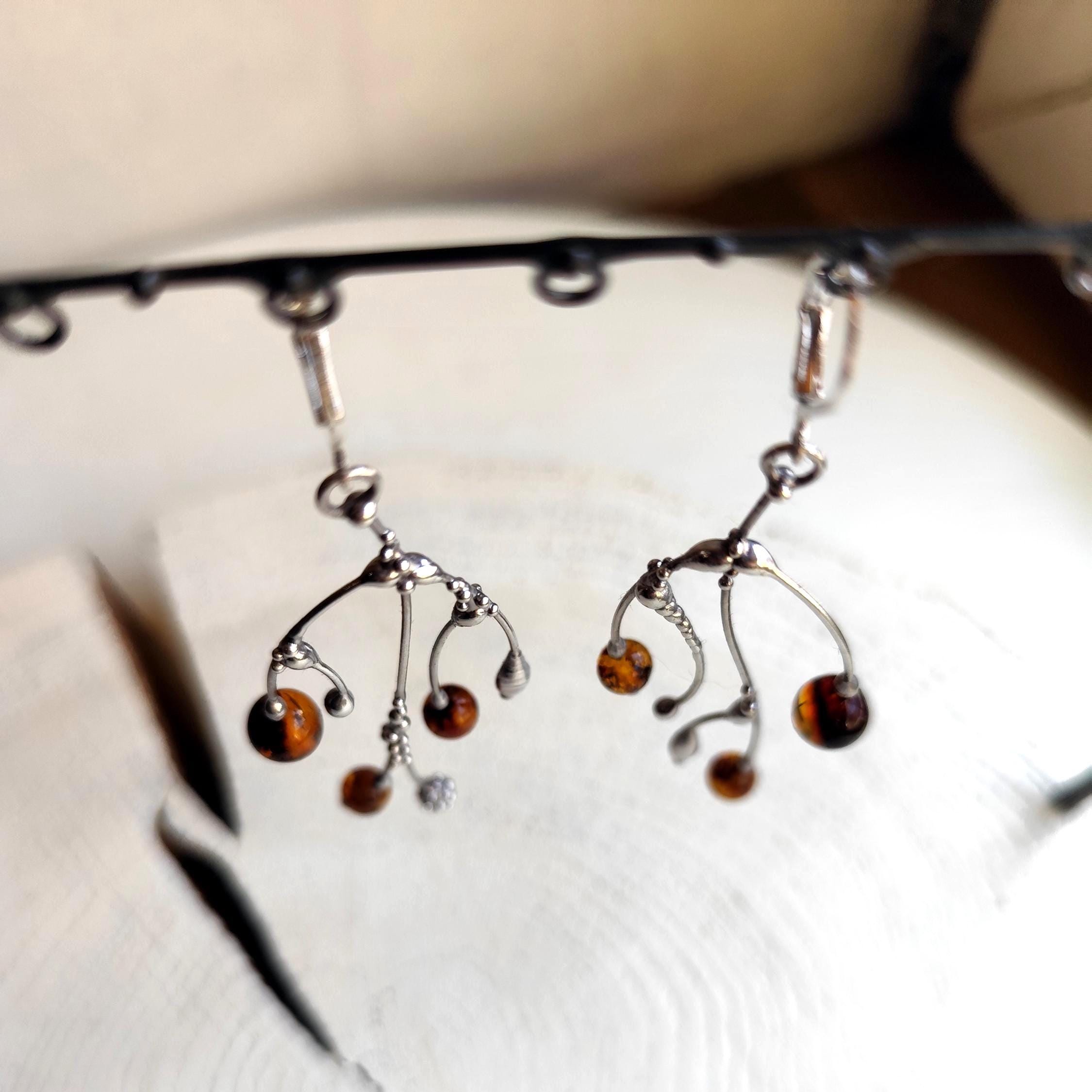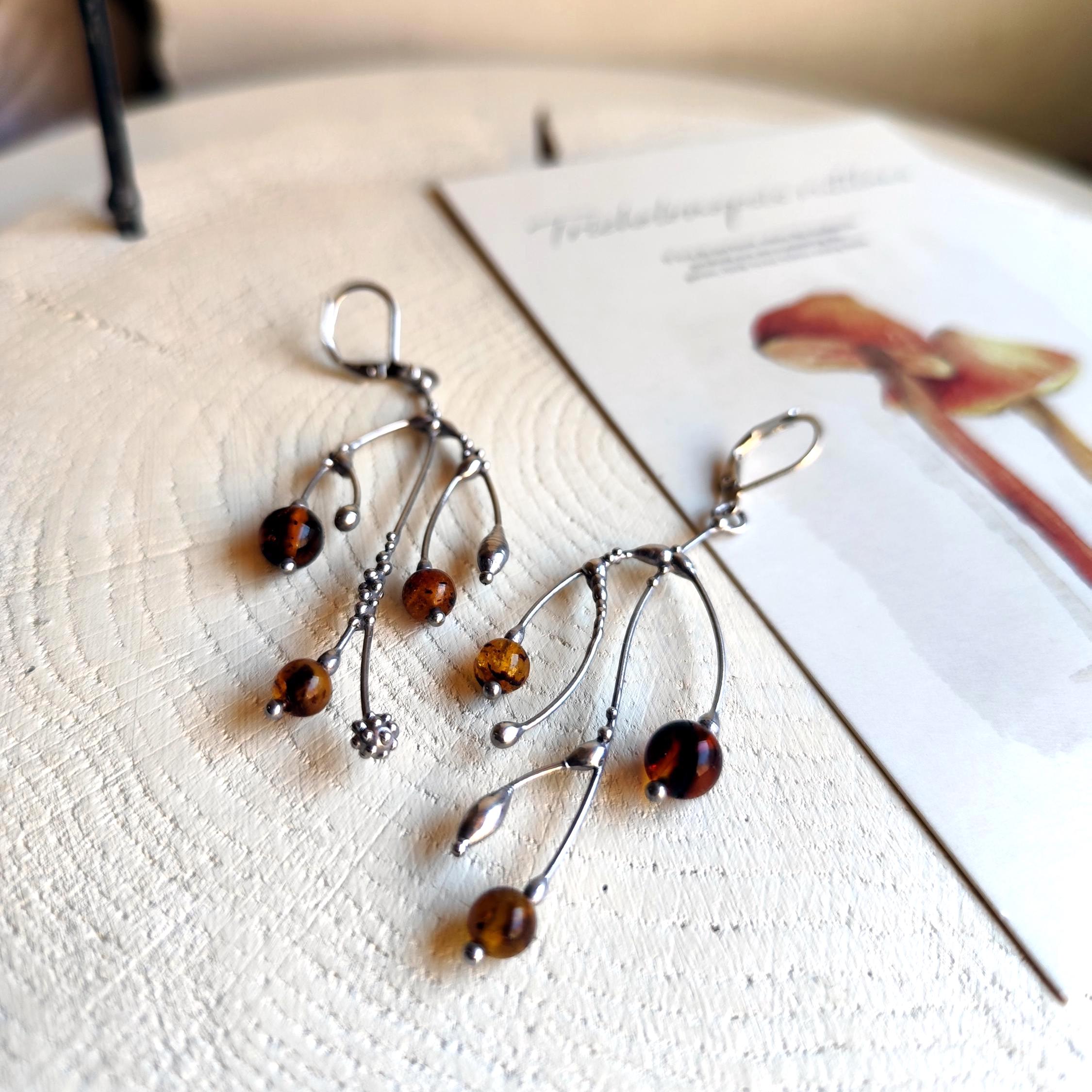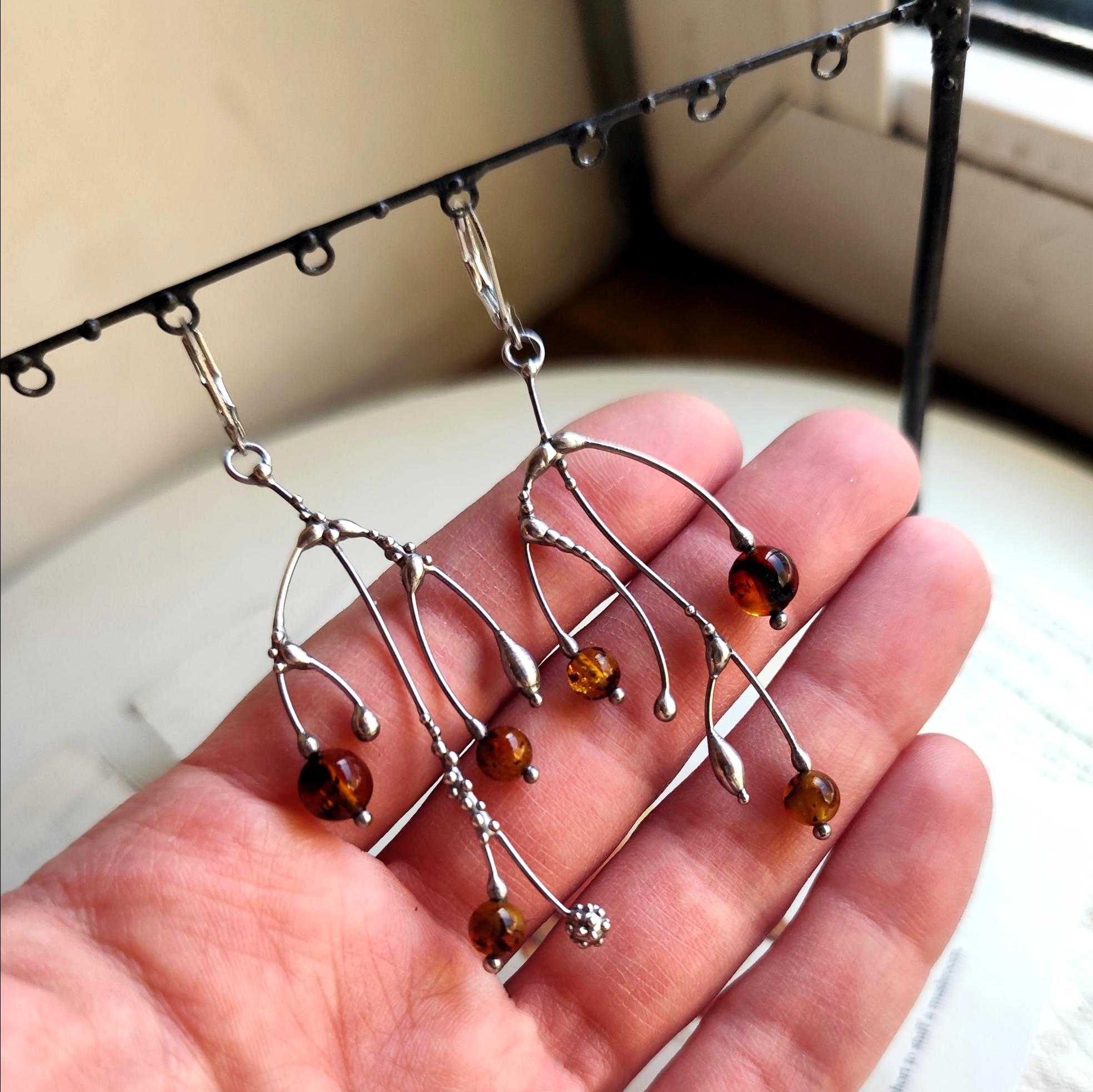 These asymmetrical forest earrings "tree branch earrings" made from copper, pewter, steel and amber beads. They are light, thin and asymmetrical. All elements are handmade, which ensures the individuality of each product made in the Yadovito workshop. The copper alloy is polished with a finishing solution to give the jewelry a noble appearance and at the same time so that the metal does not oxidize. The earrings use glass melted in a special furnace. After melting, the glass takes on an almost unique shape and amazing color shades that play in the light. Size about 6 * 3 cm (2.3 * 1.1 in). Color silver/brown.
