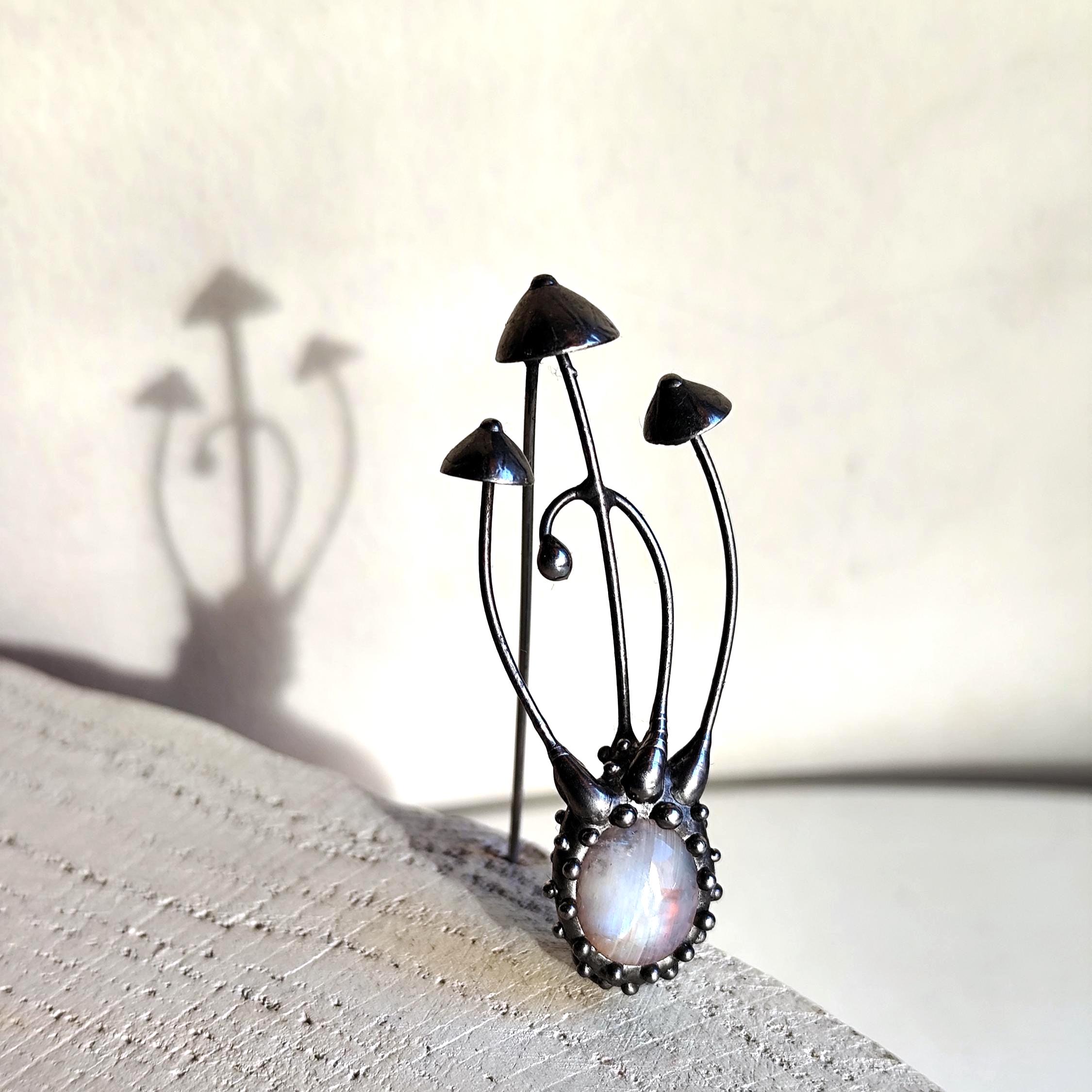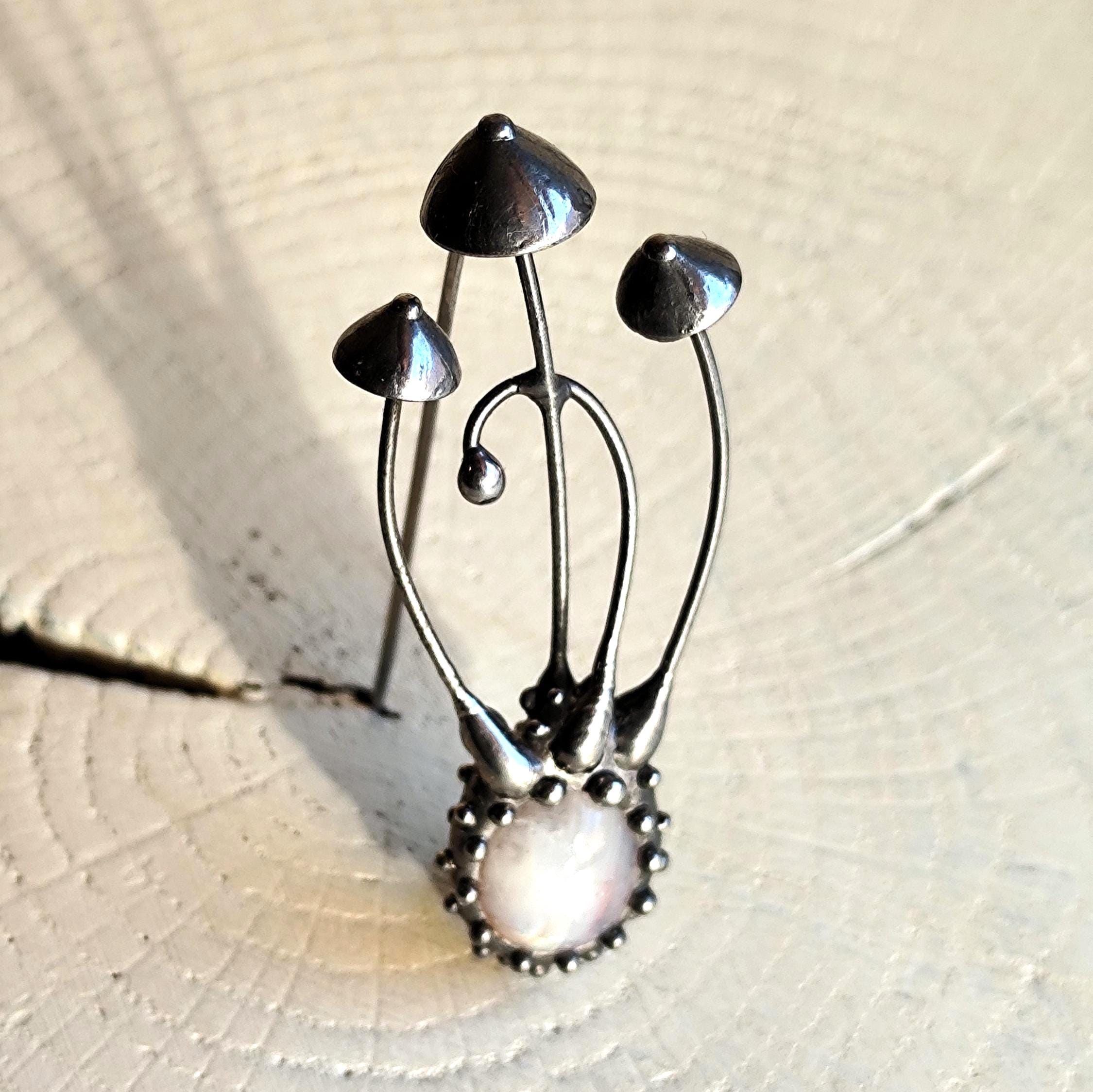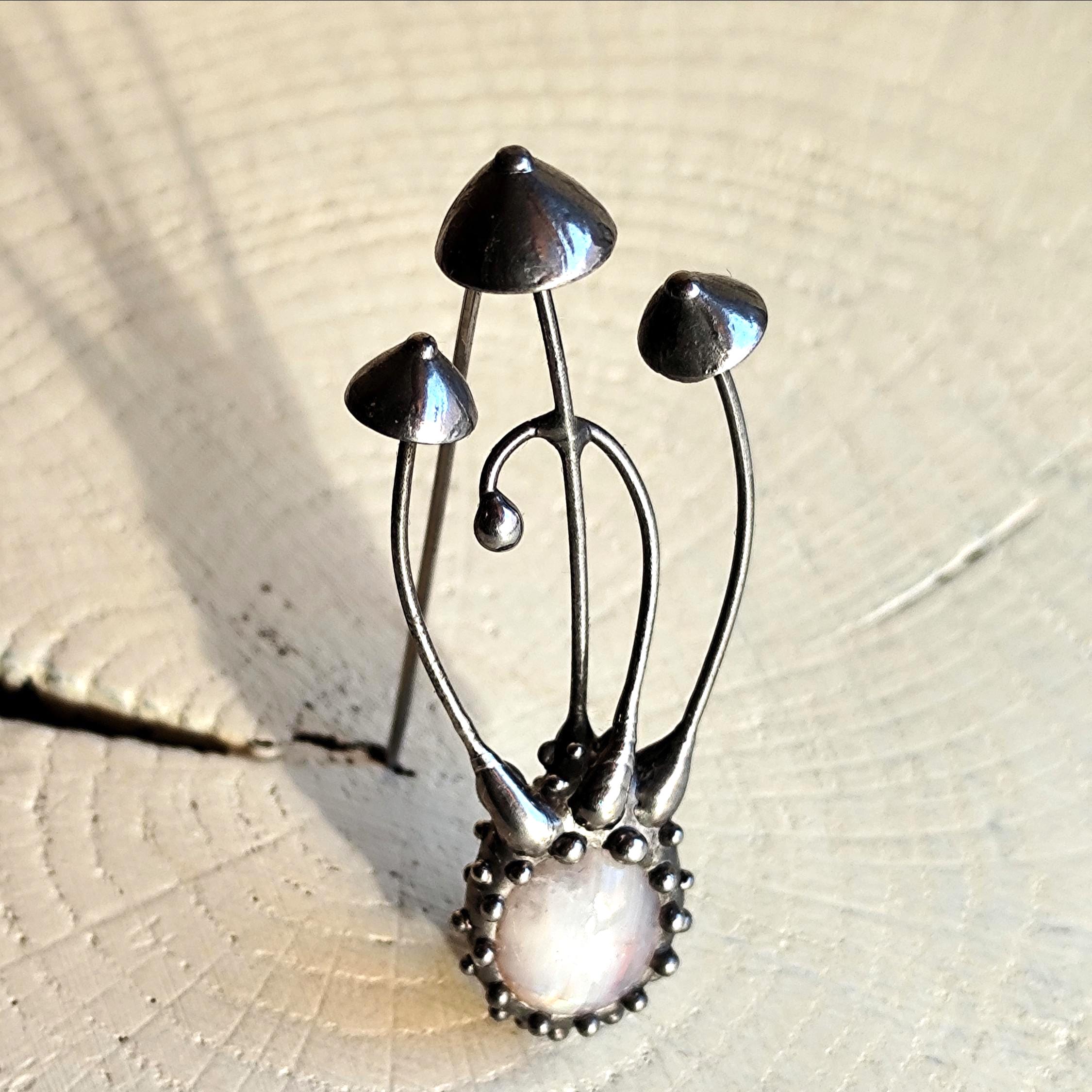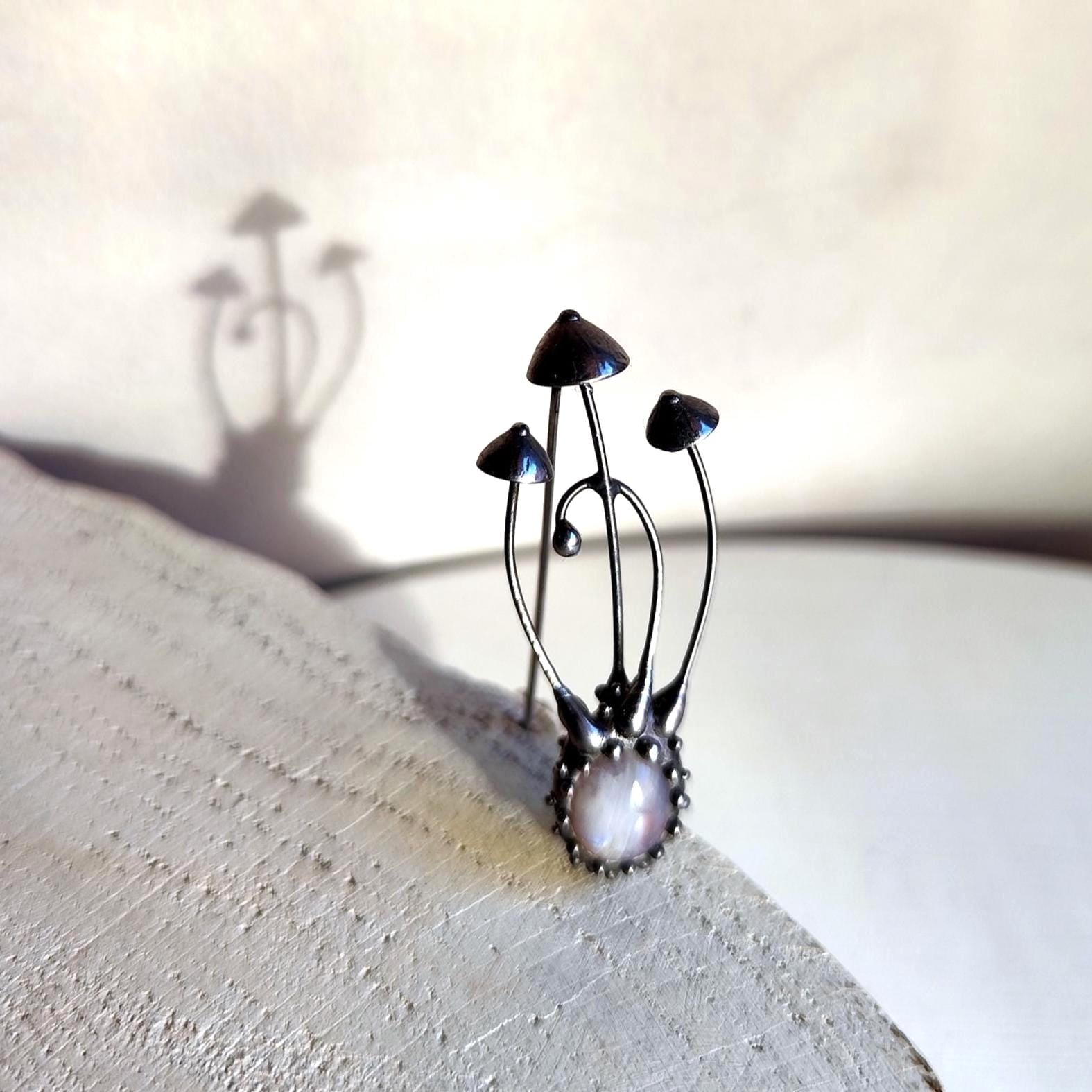 Elevate your style and connect with nature with our handcrafted forest magic mushroom brooch. Inspired by the mystical beauty of wild forest, this exquisite piece combines floral botanical elements with a fairy witchy aesthetic, bringing a touch of enchantment to your wardrobe. Each brooch is meticulously made from copper, pewter, steel and moonstone, treated to resist oxidation and polished to perfection. The fastening mechanism is skillfully sharpened by hand, ensuring a secure and comfortable fit. Individually crafted in the Yadovito workshop, no two pieces are alike, as each mushroom cap is delicately shaped without the use of molds or stamps. Embrace the unique charm and style of this psychedelic design, measuring approximately 5.2/2.2 cm (2 * 0.8 in). Elevate your accessories game and let our brooch be a conversation starter, showcasing the finest craftsmanship and detail in every stitch.