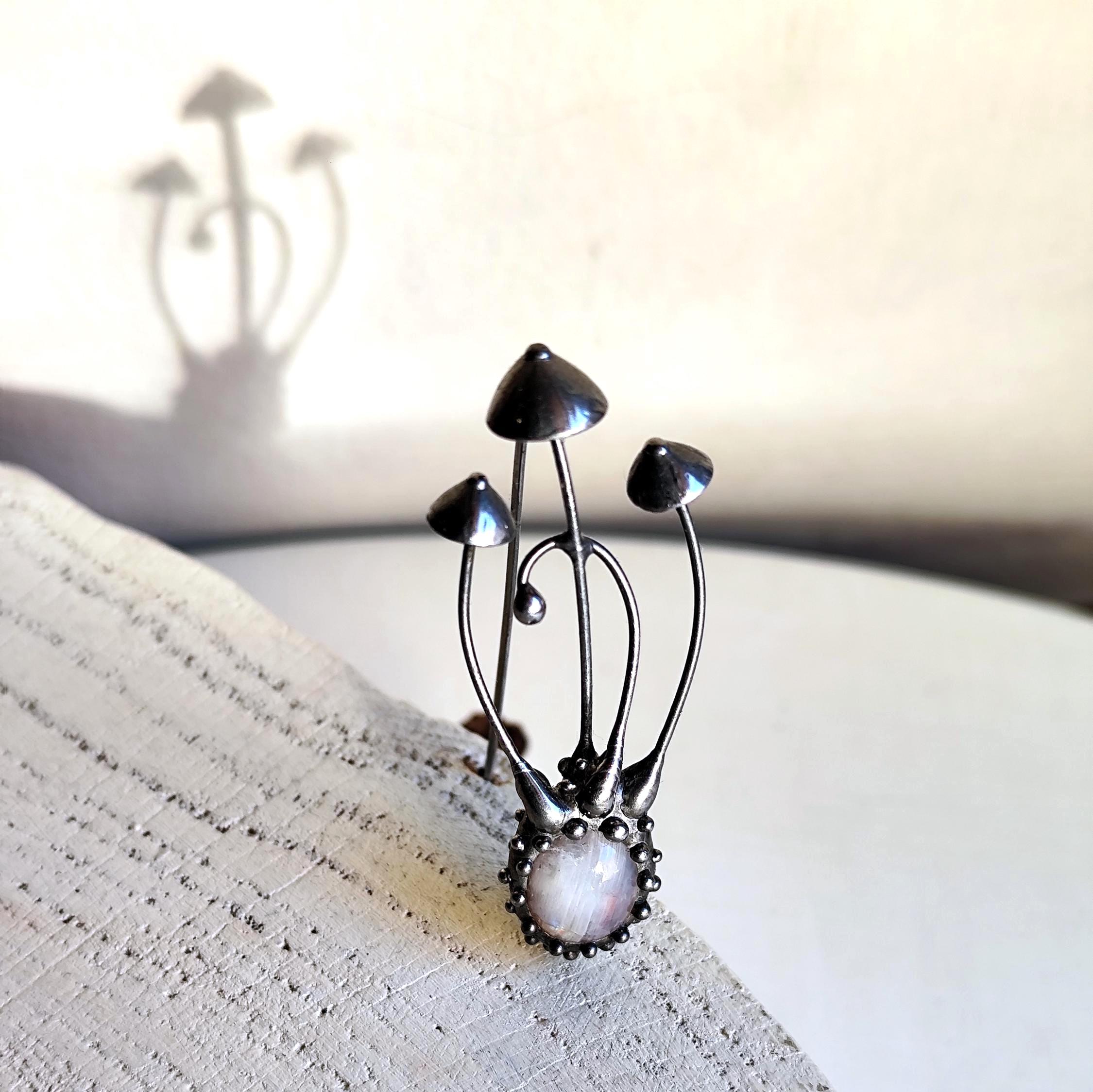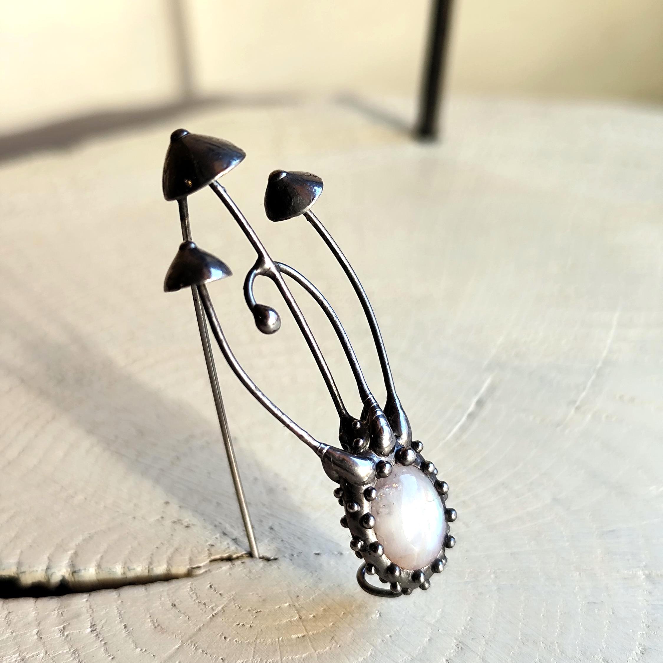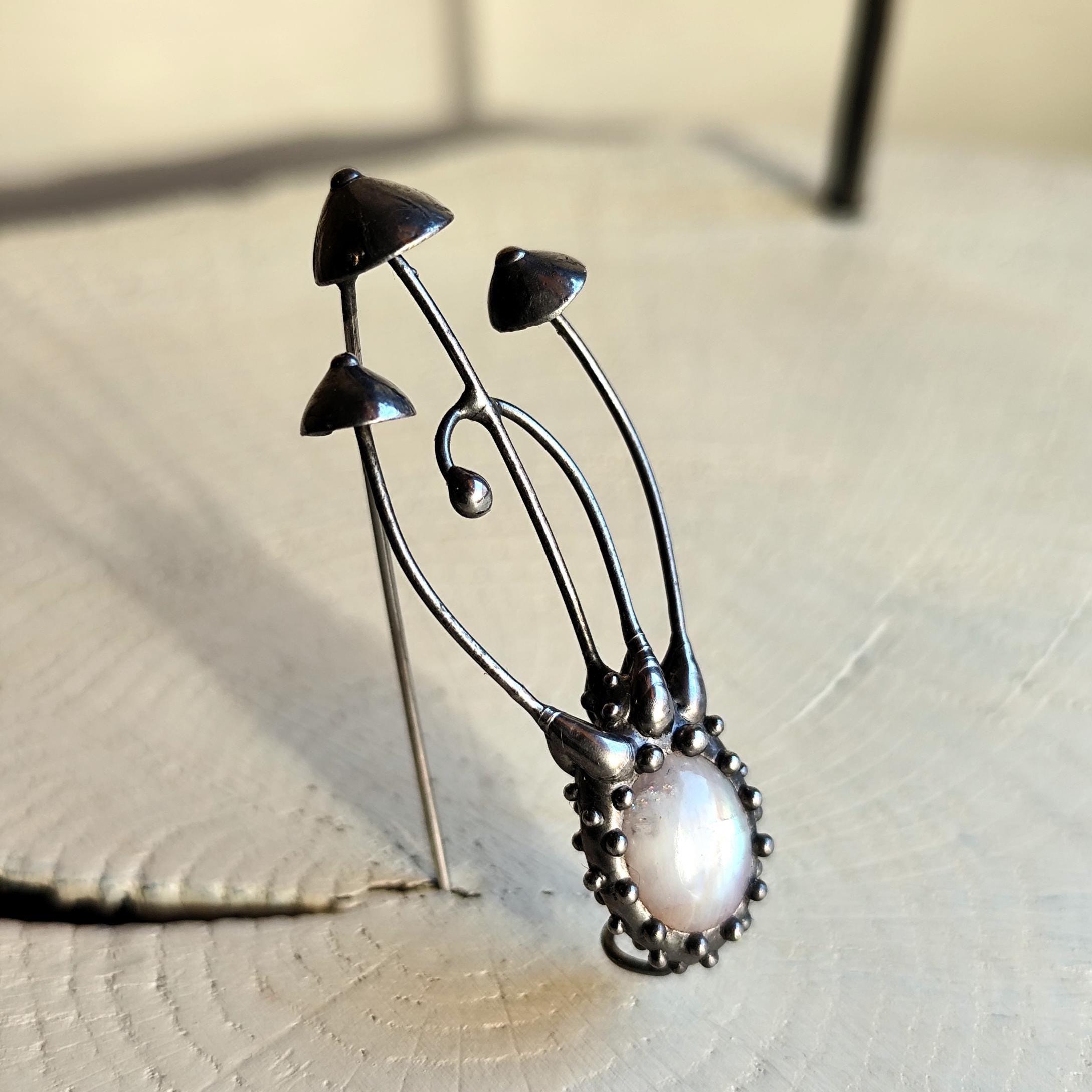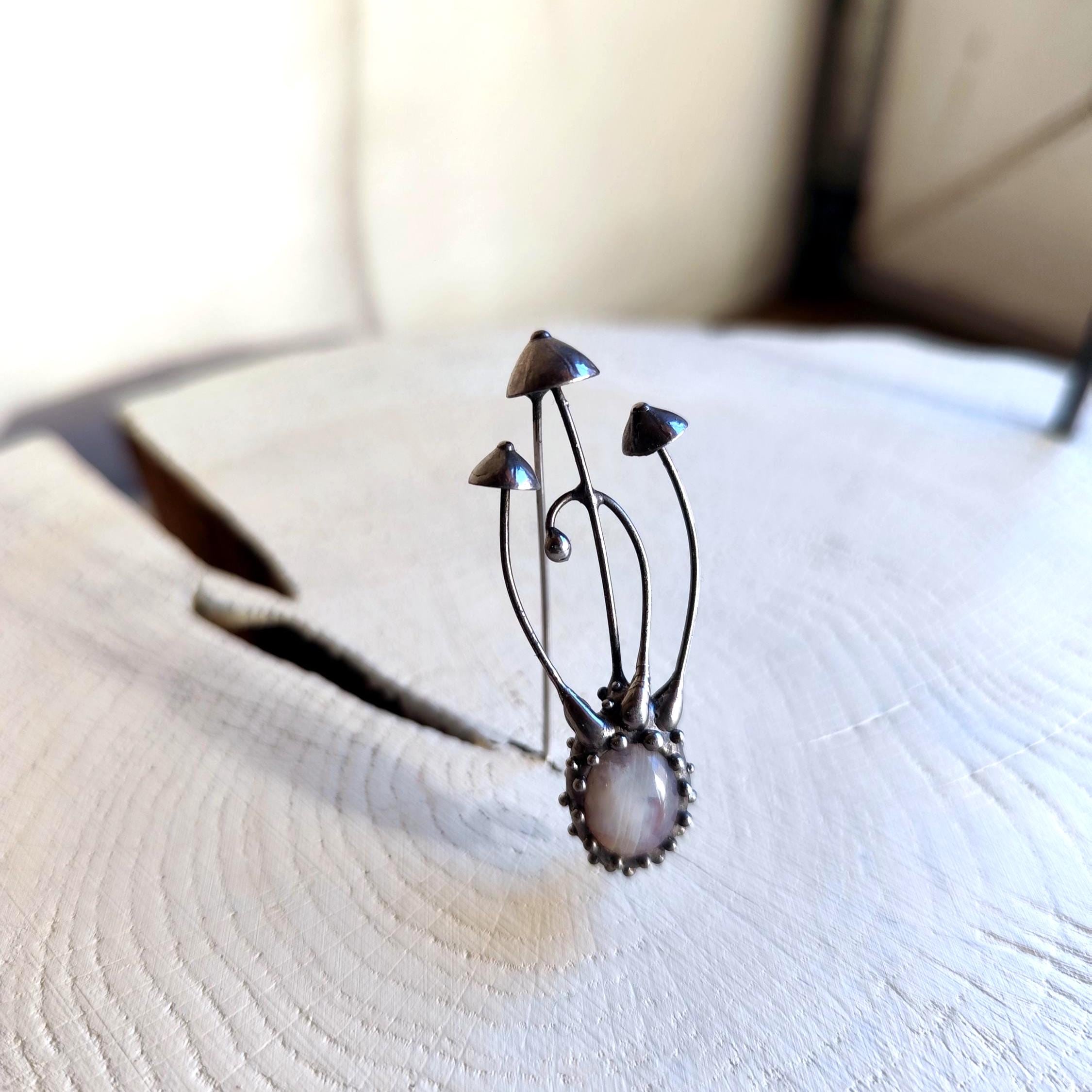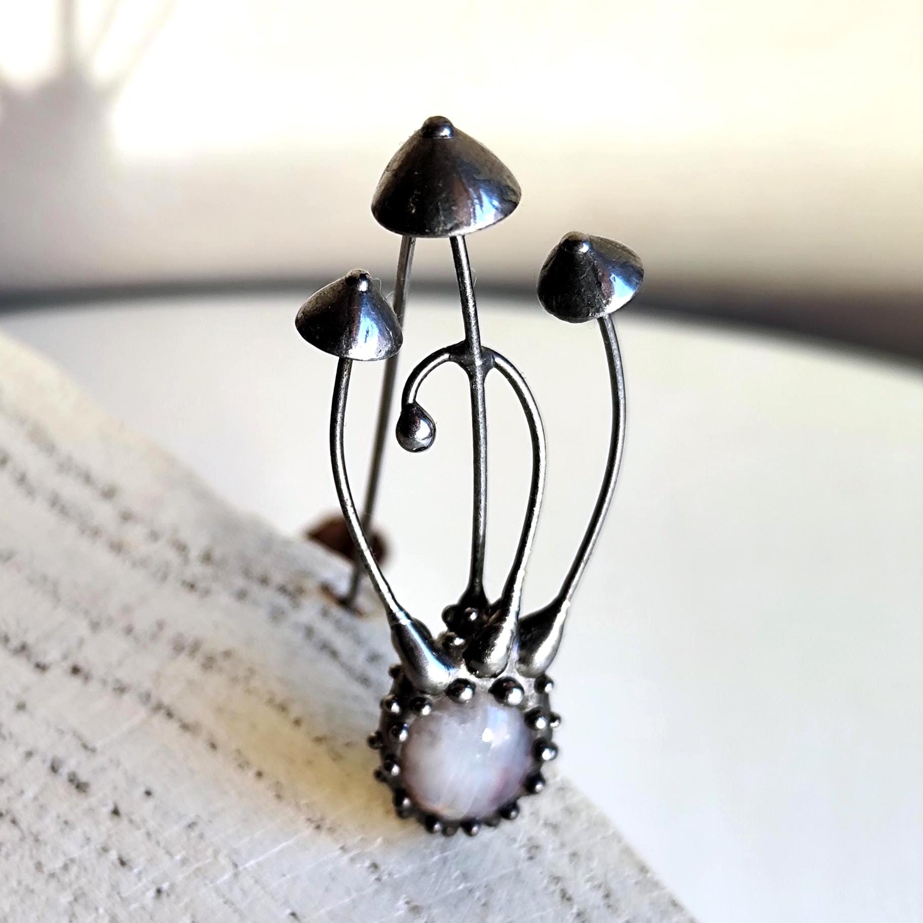 Elevate your style and connect with nature with our handcrafted forest magic mushroom brooch. Inspired by the mystical beauty of wild forest, this exquisite piece combines floral botanical elements with a fairy witchy aesthetic, bringing a touch of enchantment to your wardrobe. Each brooch is meticulously made from copper, pewter, steel and moonstone, treated to resist oxidation and polished to perfection. The fastening mechanism is skillfully sharpened by hand, ensuring a secure and comfortable fit. Individually crafted in the Yadovito workshop, no two pieces are alike, as each mushroom cap is delicately shaped without the use of molds or stamps. Embrace the unique charm and style of this psychedelic design, measuring approximately 5.2/2.2 cm (2 * 0.8 in). Elevate your accessories game and let our brooch be a conversation starter, showcasing the finest craftsmanship and detail in every stitch.