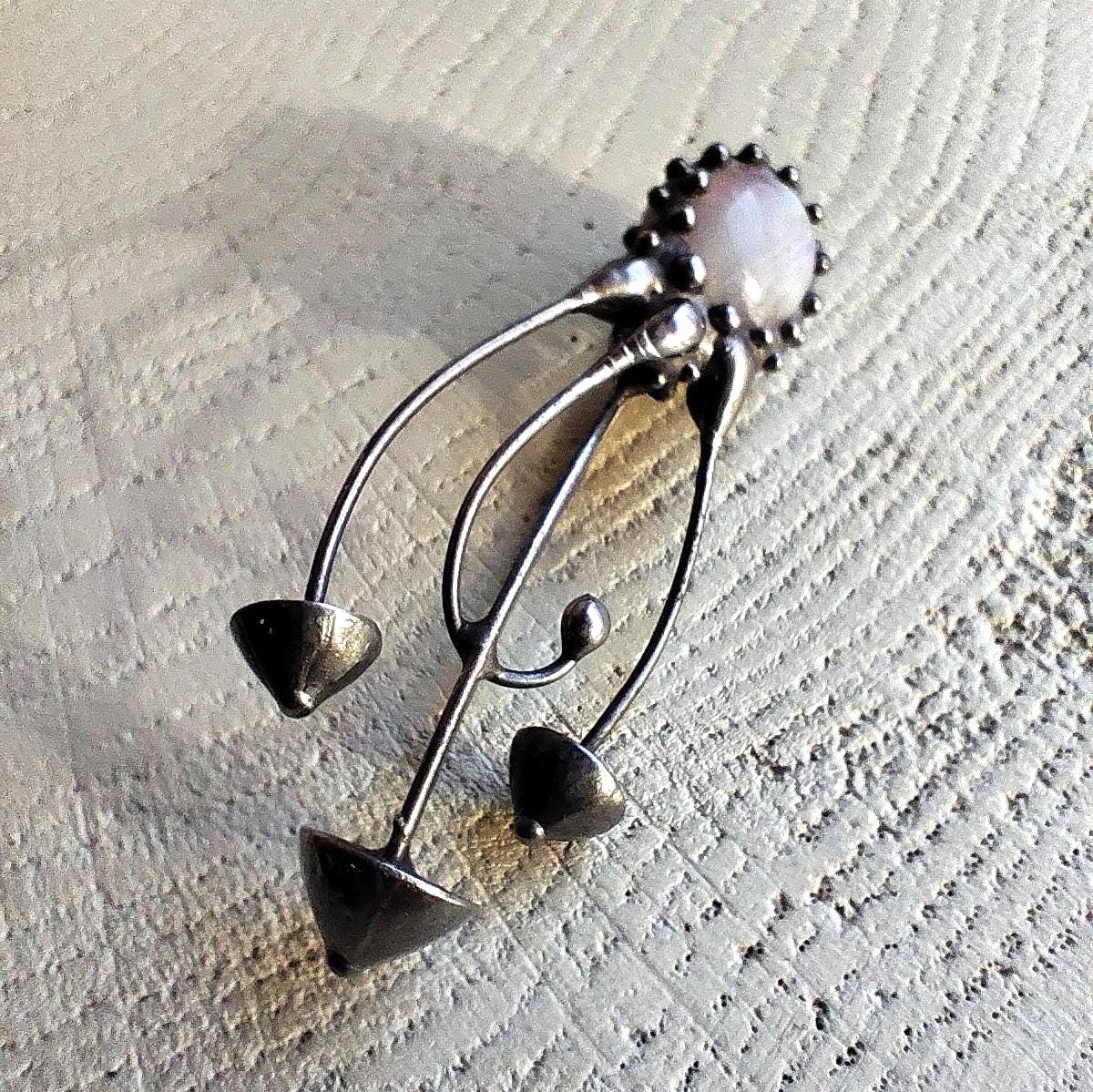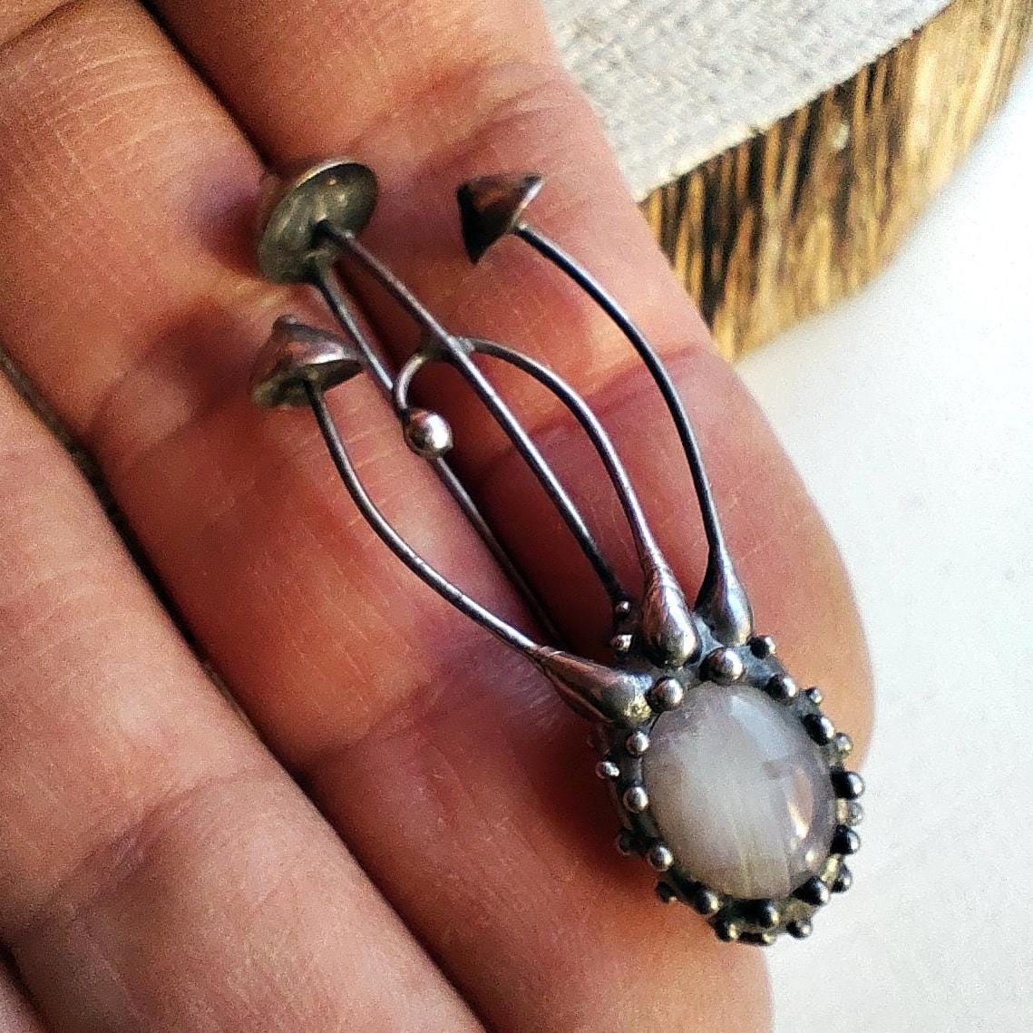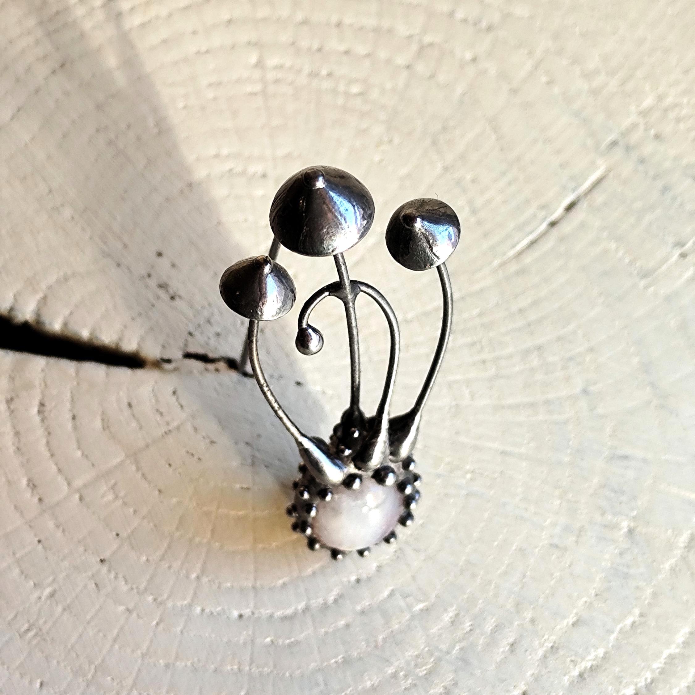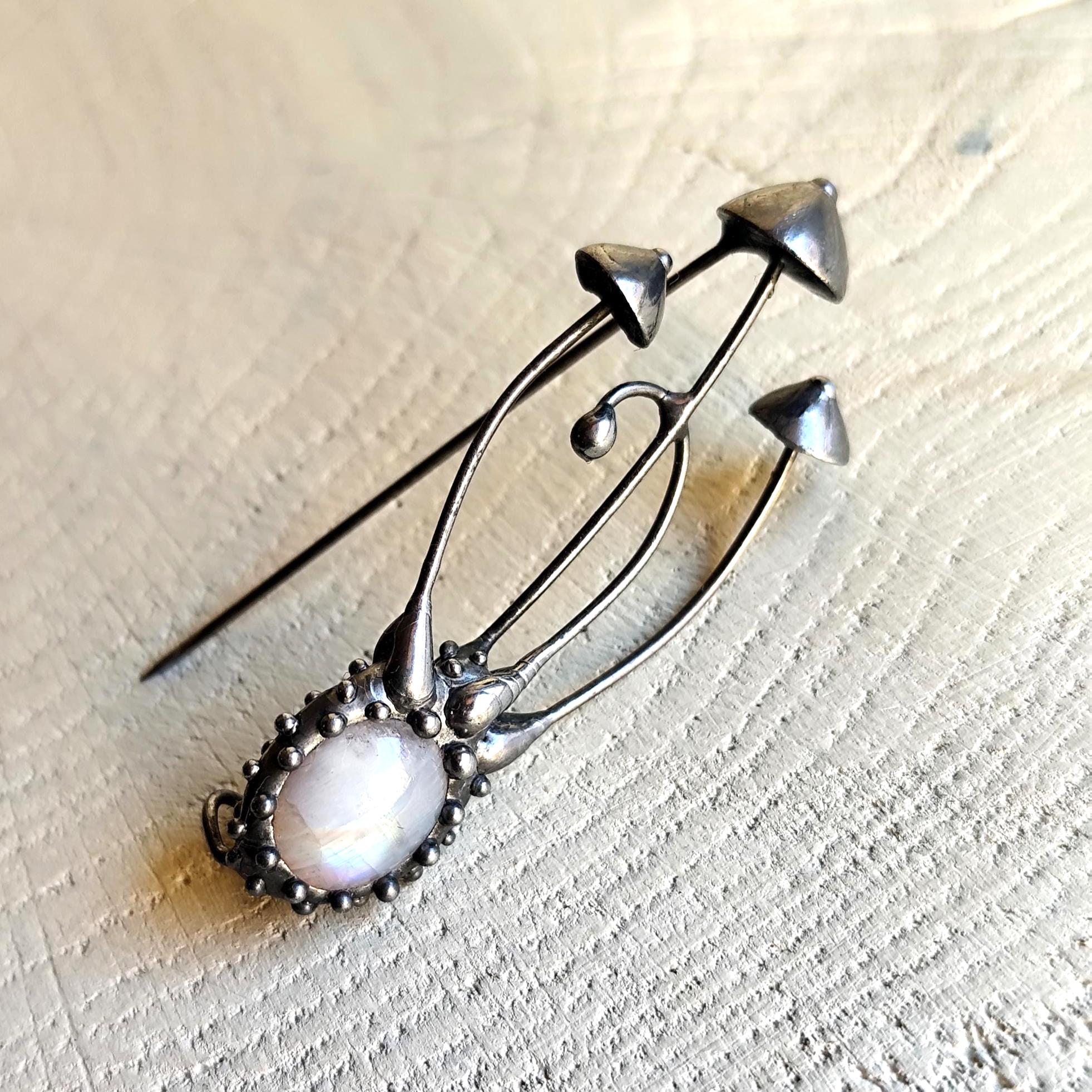 Elevate your style and connect with nature with our handcrafted forest magic mushroom brooch. Inspired by the mystical beauty of wild forest, this exquisite piece combines floral botanical elements with a fairy witchy aesthetic, bringing a touch of enchantment to your wardrobe. Each brooch is meticulously made from copper, pewter, steel and moonstone, treated to resist oxidation and polished to perfection. The fastening mechanism is skillfully sharpened by hand, ensuring a secure and comfortable fit. Individually crafted in the Yadovito workshop, no two pieces are alike, as each mushroom cap is delicately shaped without the use of molds or stamps. Embrace the unique charm and style of this psychedelic design, measuring approximately 5.2/2.2 cm (2 * 0.8 in). Elevate your accessories game and let our brooch be a conversation starter, showcasing the finest craftsmanship and detail in every stitch.