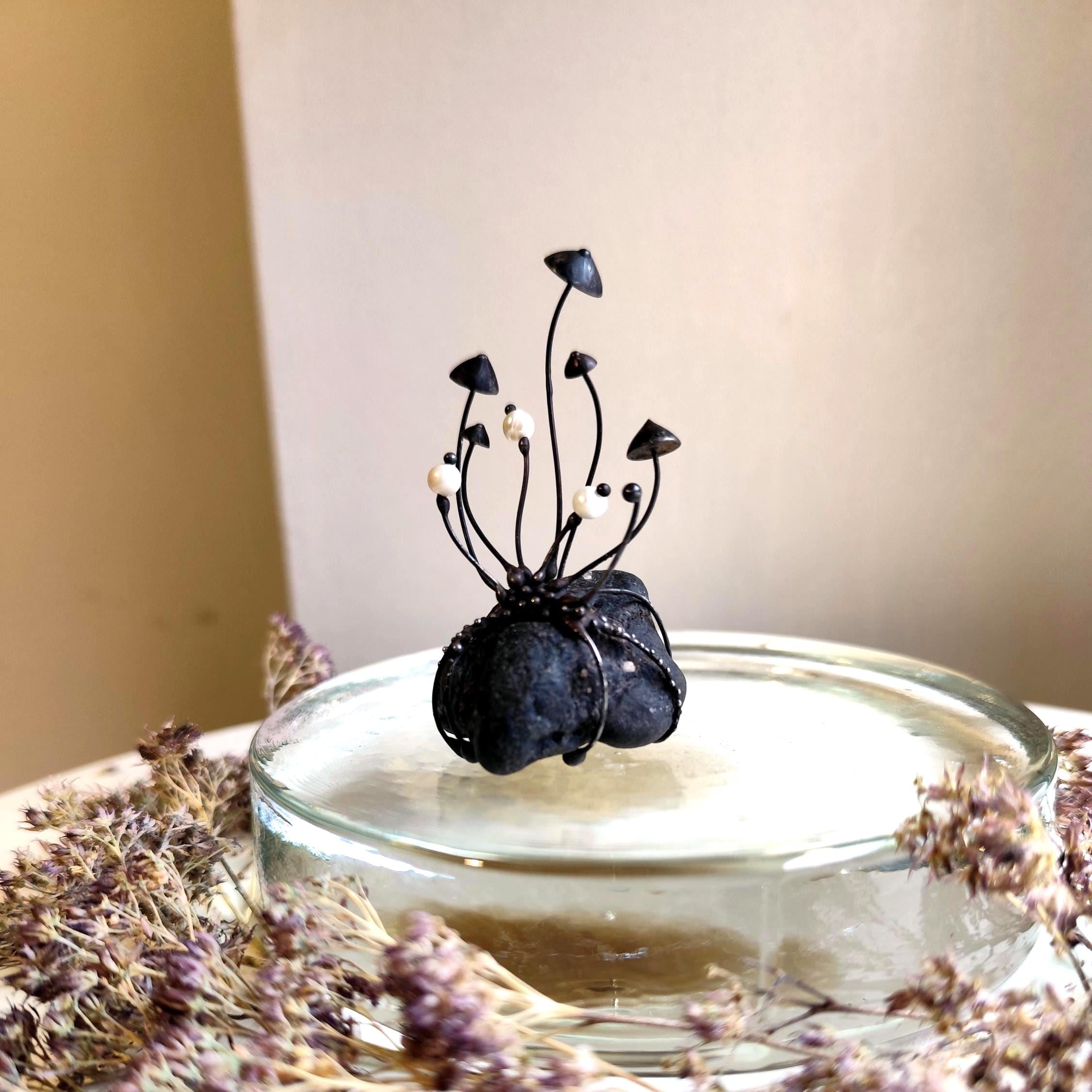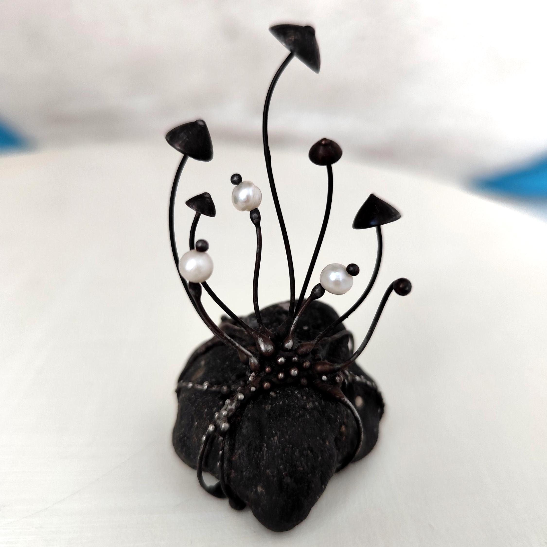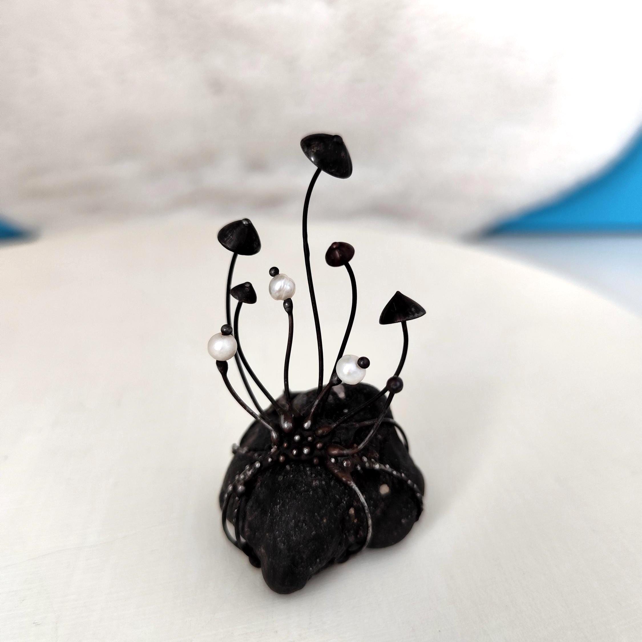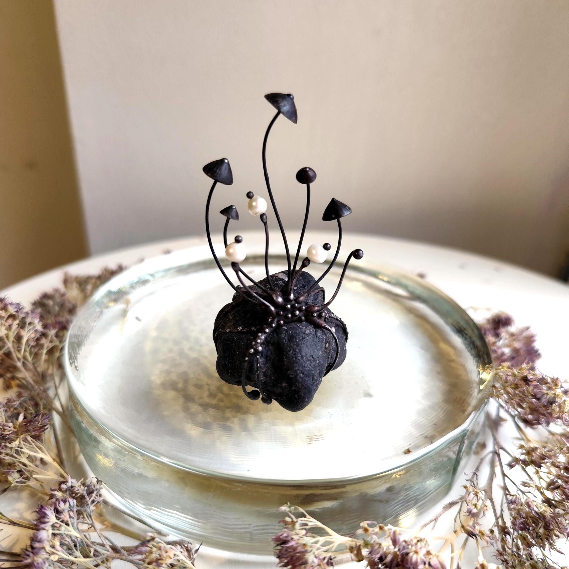Baltic Sea Stone Mushroom Statue inspired by nature handmade from stone, copper, pewter alloy, steel and pearl beads. Covered with patina and treated with antioxidant, sanded, polished. Light and sturdy forest magic home decor statue . All elements are handmade, which ensures the individuality of each product made in the Yadovito workshop. The copper alloy is coated with a black patina to color the metal black, polished with a finishing solution to give the jewelry a noble appearance and at the same time so that the metal does not oxidize. Each jewelry looks individually, because mushroom caps are made by hand, and not cast or stamped. Size about 8 * 4 * 4.6 cm (3.1 * 1.5 * 1.7 in).