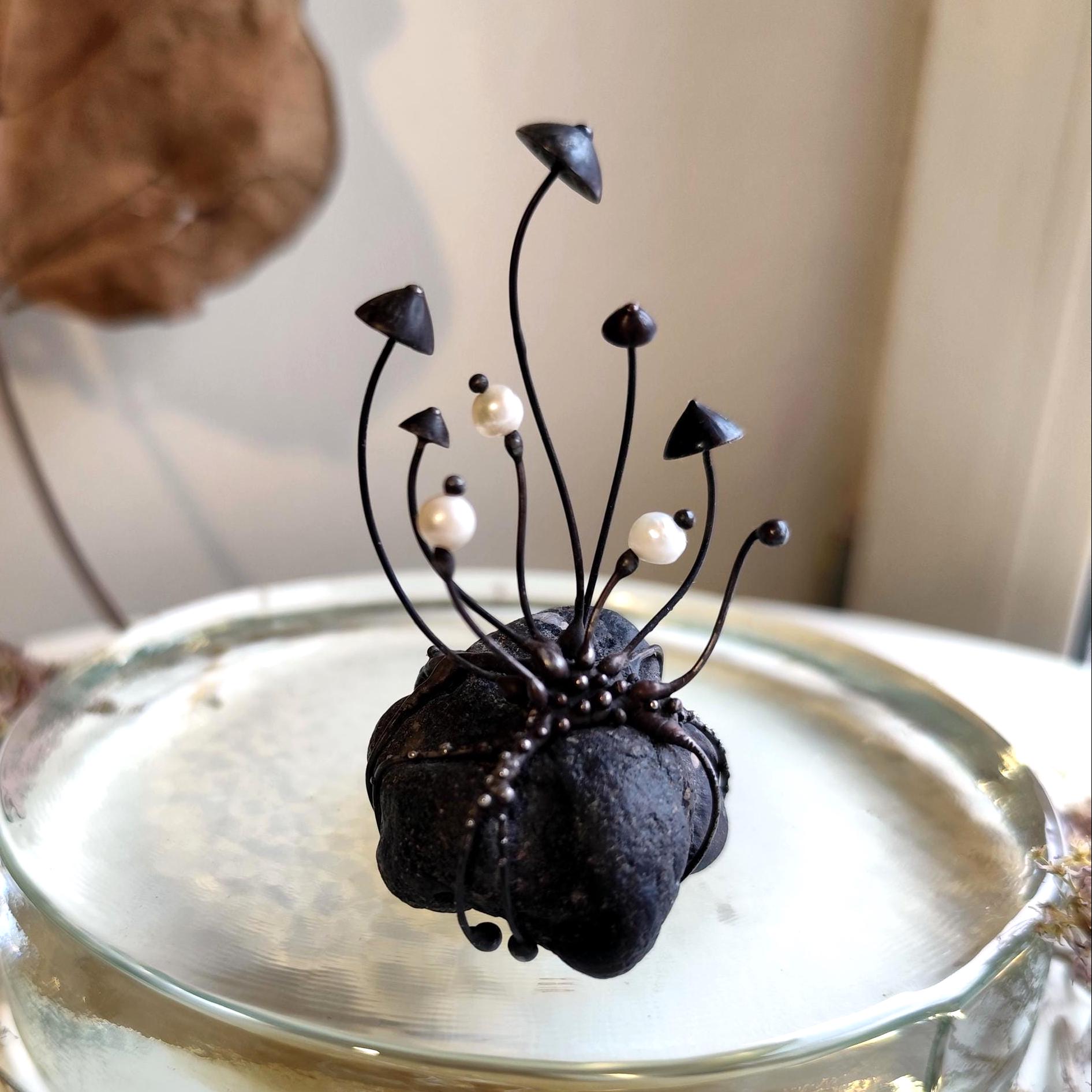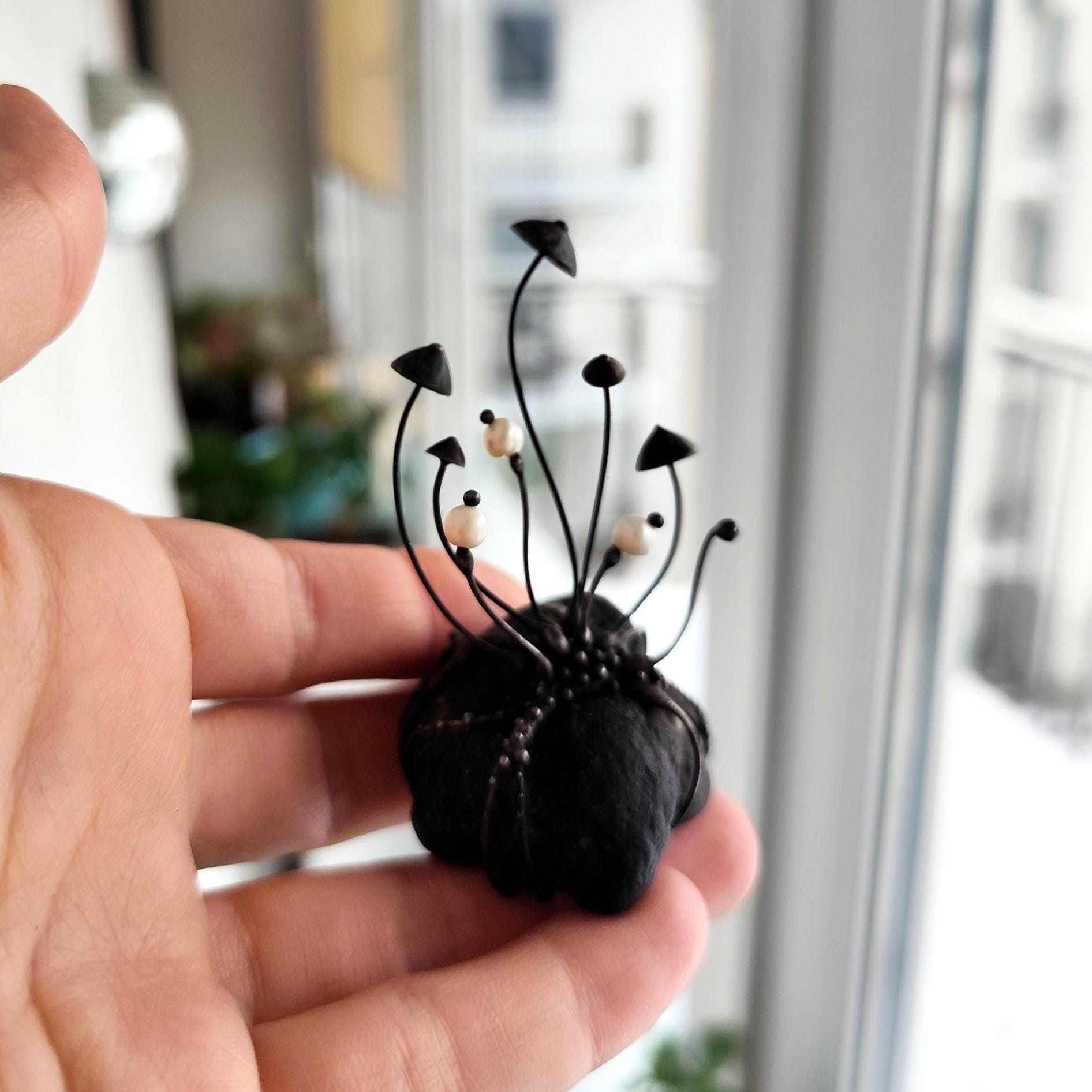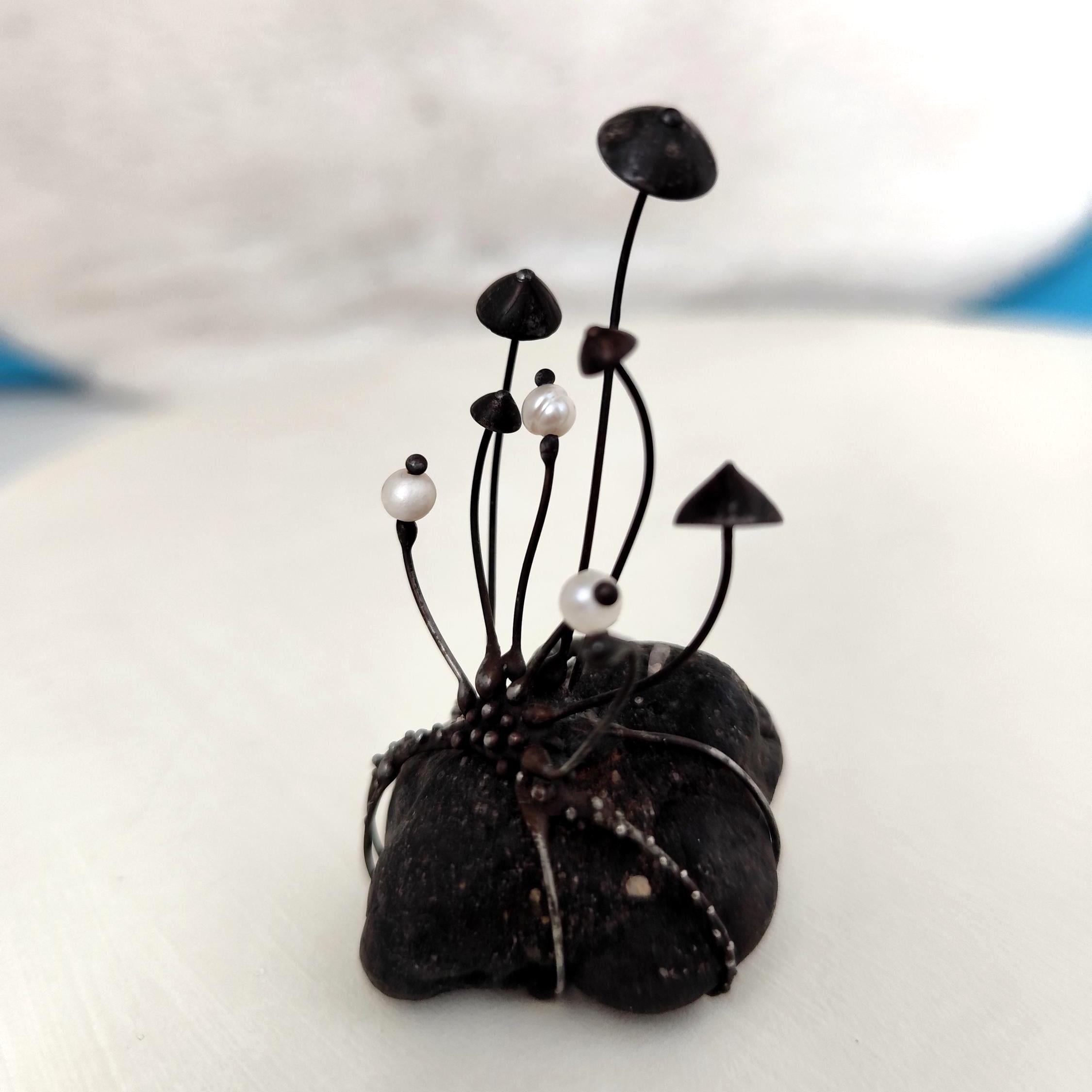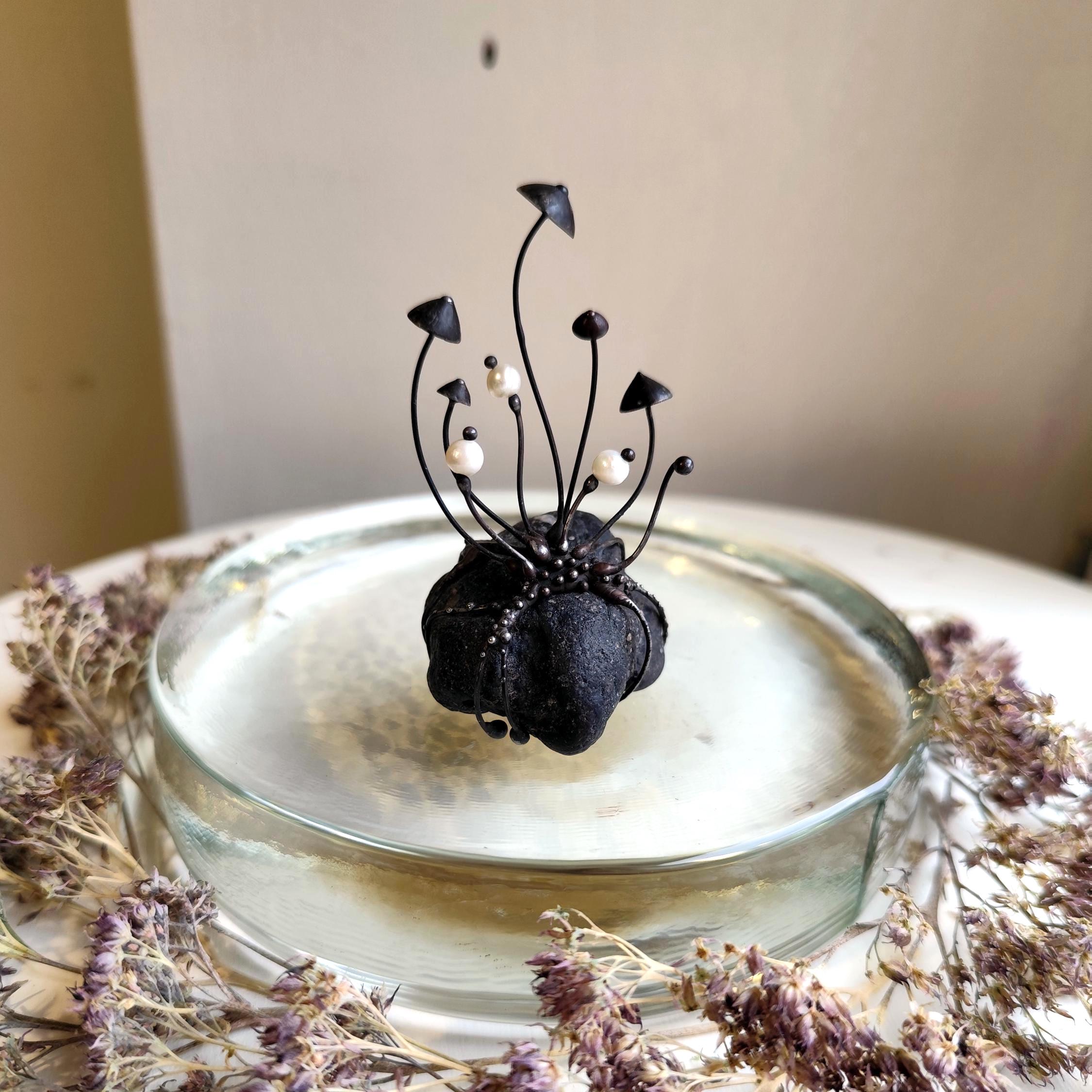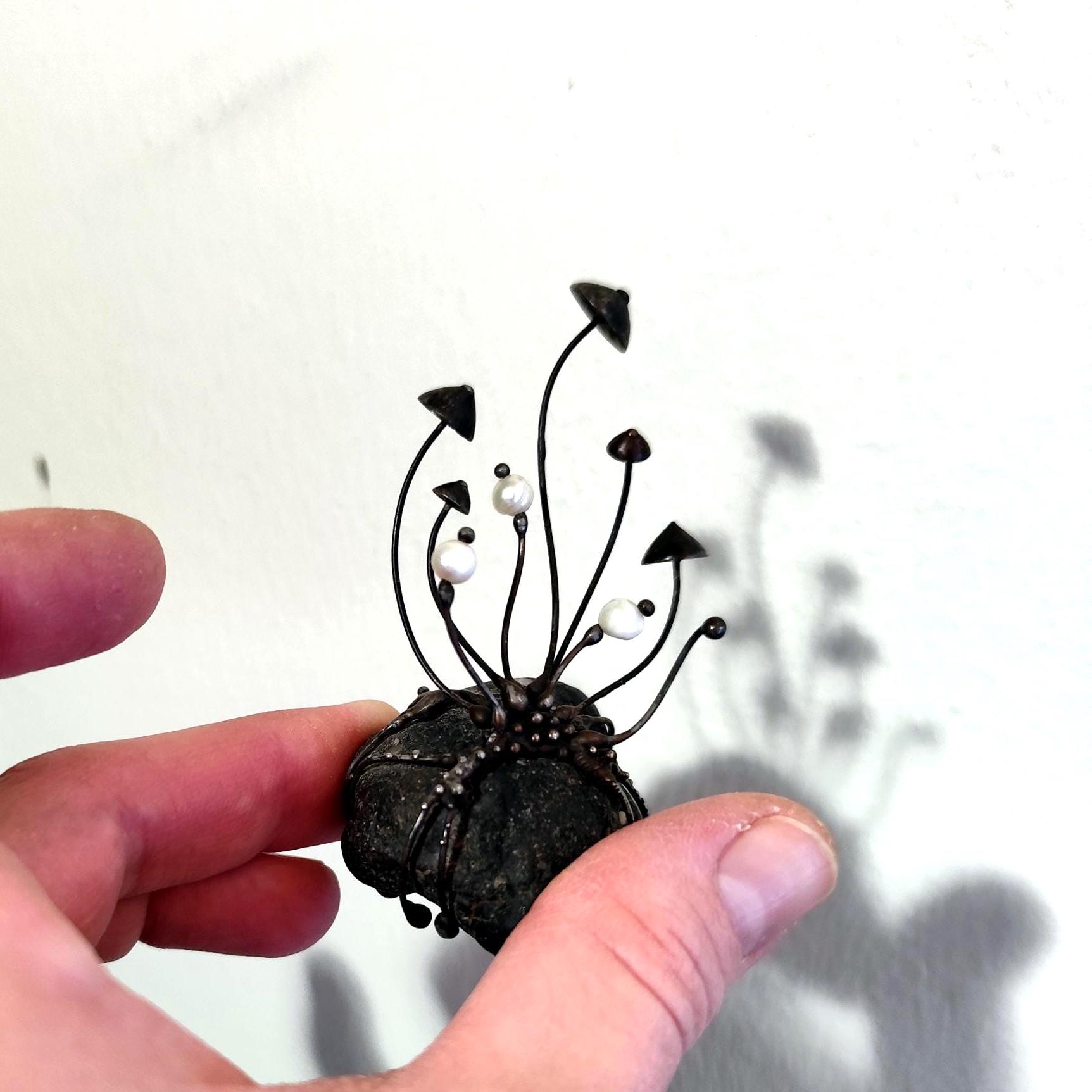 Baltic Sea Stone Mushroom Statue inspired by nature handmade from stone, copper, pewter alloy, steel and pearl beads. Covered with patina and treated with antioxidant, sanded, polished. Light and sturdy forest magic home decor statue . All elements are handmade, which ensures the individuality of each product made in the Yadovito workshop. The copper alloy is coated with a black patina to color the metal black, polished with a finishing solution to give the jewelry a noble appearance and at the same time so that the metal does not oxidize. Each jewelry looks individually, because mushroom caps are made by hand, and not cast or stamped. Size about 8 * 4 * 4.6 cm (3.1 * 1.5 * 1.7 in).