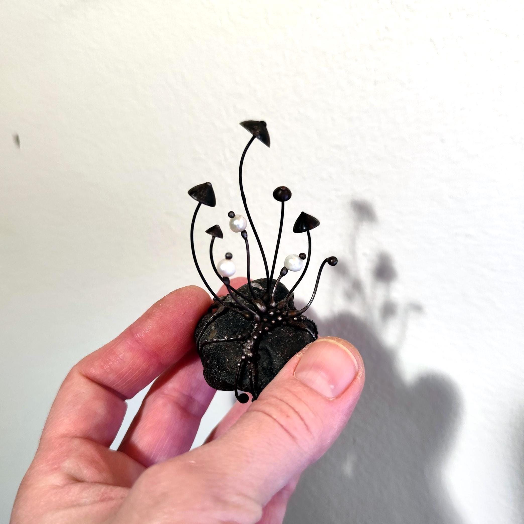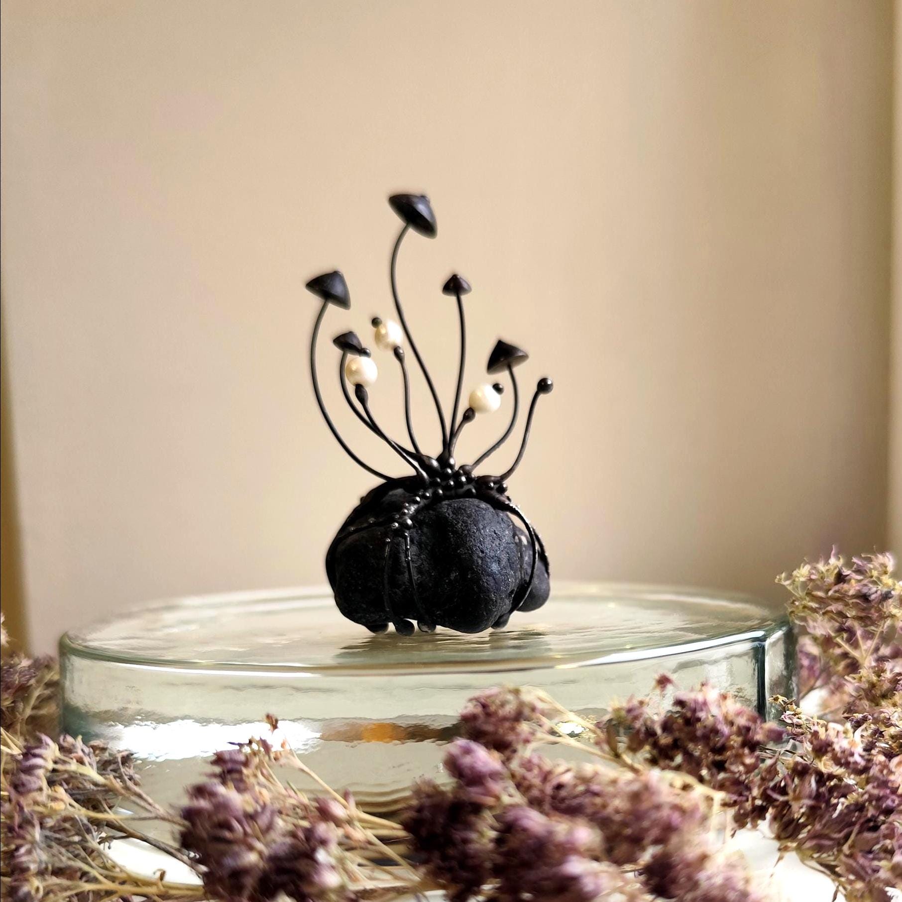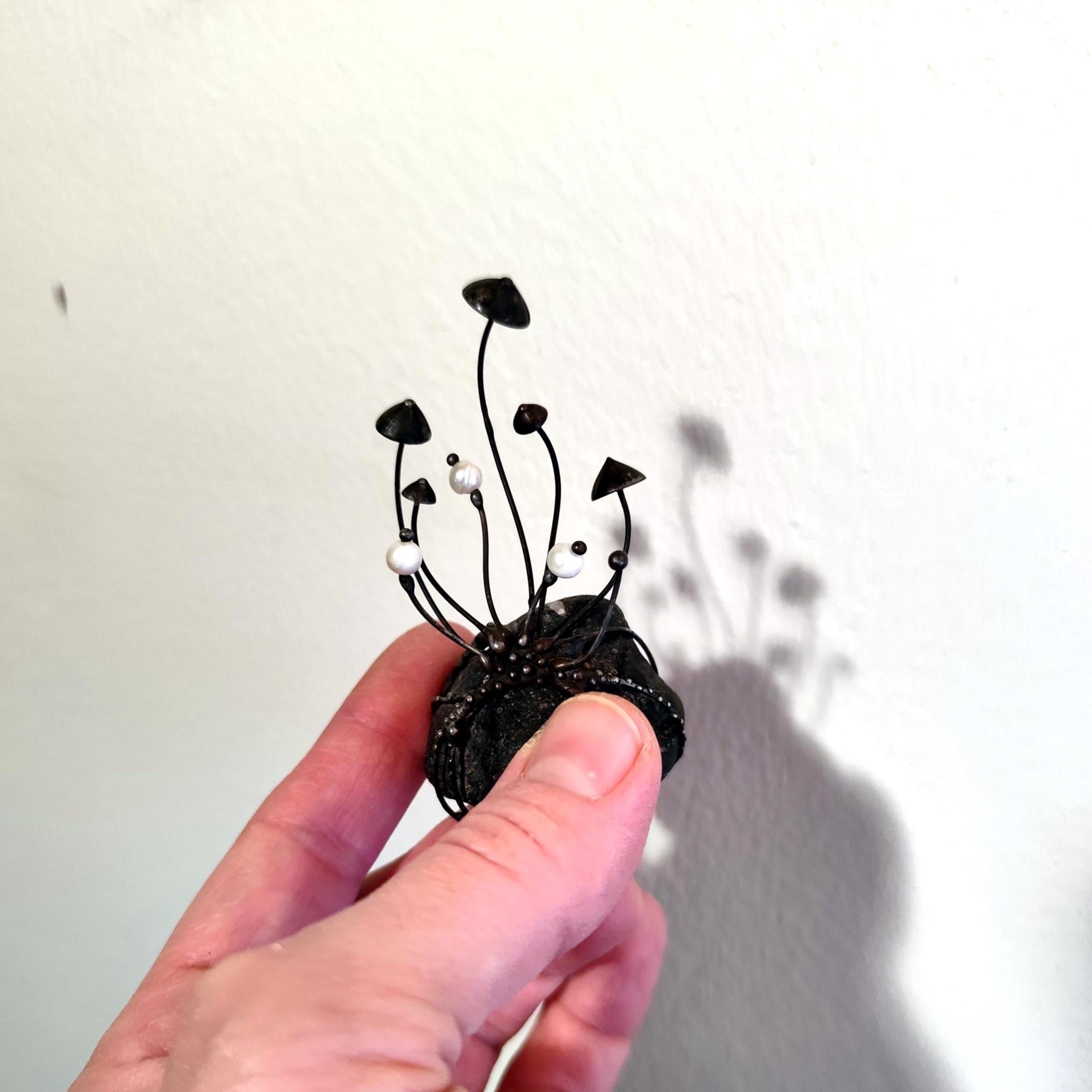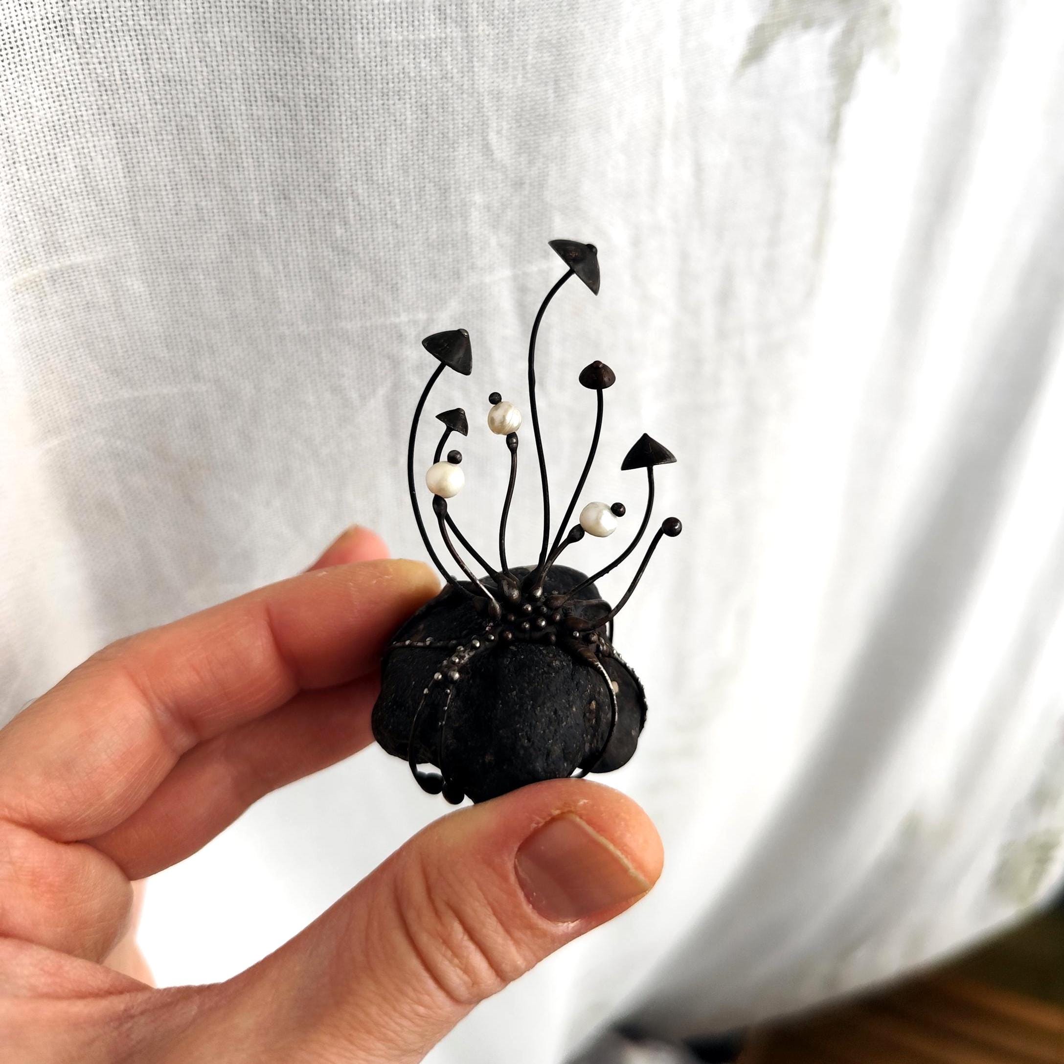 Baltic Sea Stone Mushroom Statue inspired by nature handmade from stone, copper, pewter alloy, steel and pearl beads. Covered with patina and treated with antioxidant, sanded, polished. Light and sturdy forest magic home decor statue . All elements are handmade, which ensures the individuality of each product made in the Yadovito workshop. The copper alloy is coated with a black patina to color the metal black, polished with a finishing solution to give the jewelry a noble appearance and at the same time so that the metal does not oxidize. Each jewelry looks individually, because mushroom caps are made by hand, and not cast or stamped. Size about 8 * 4 * 4.6 cm (3.1 * 1.5 * 1.7 in).