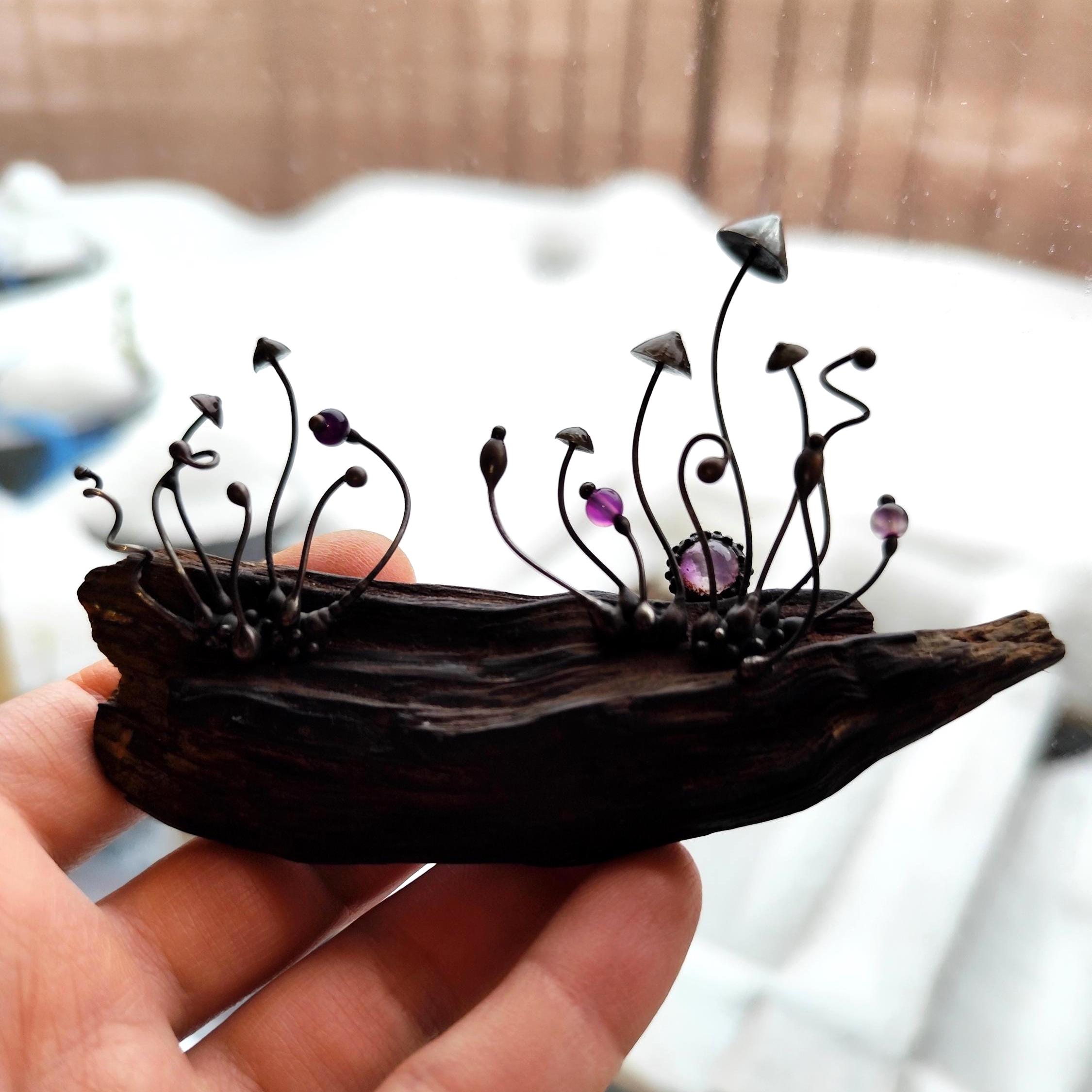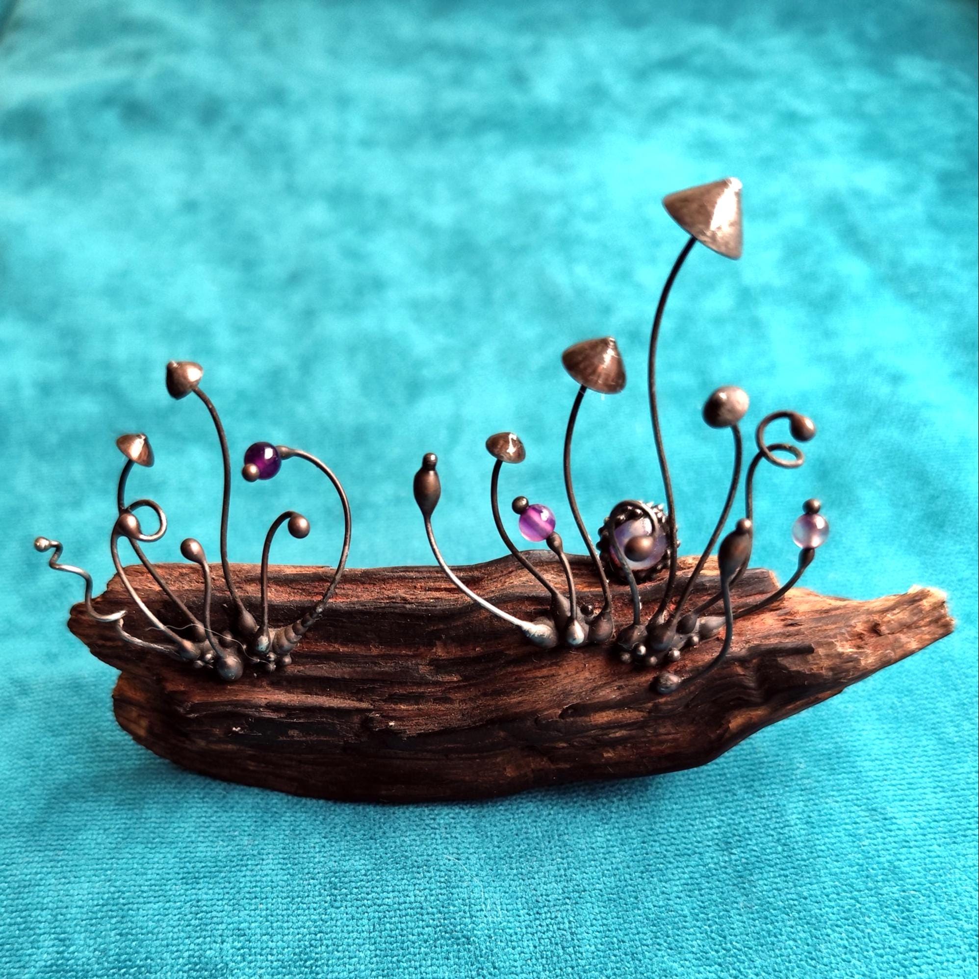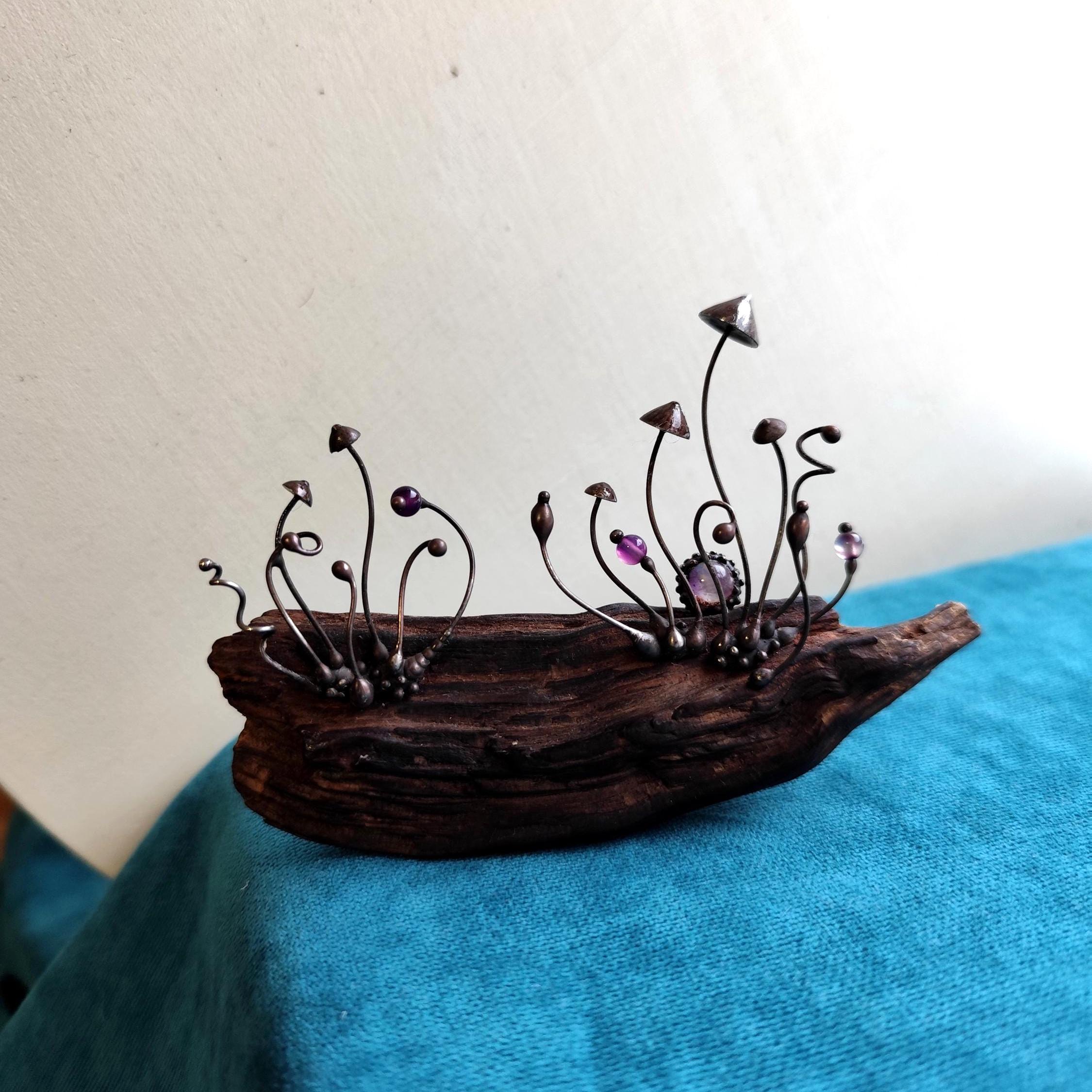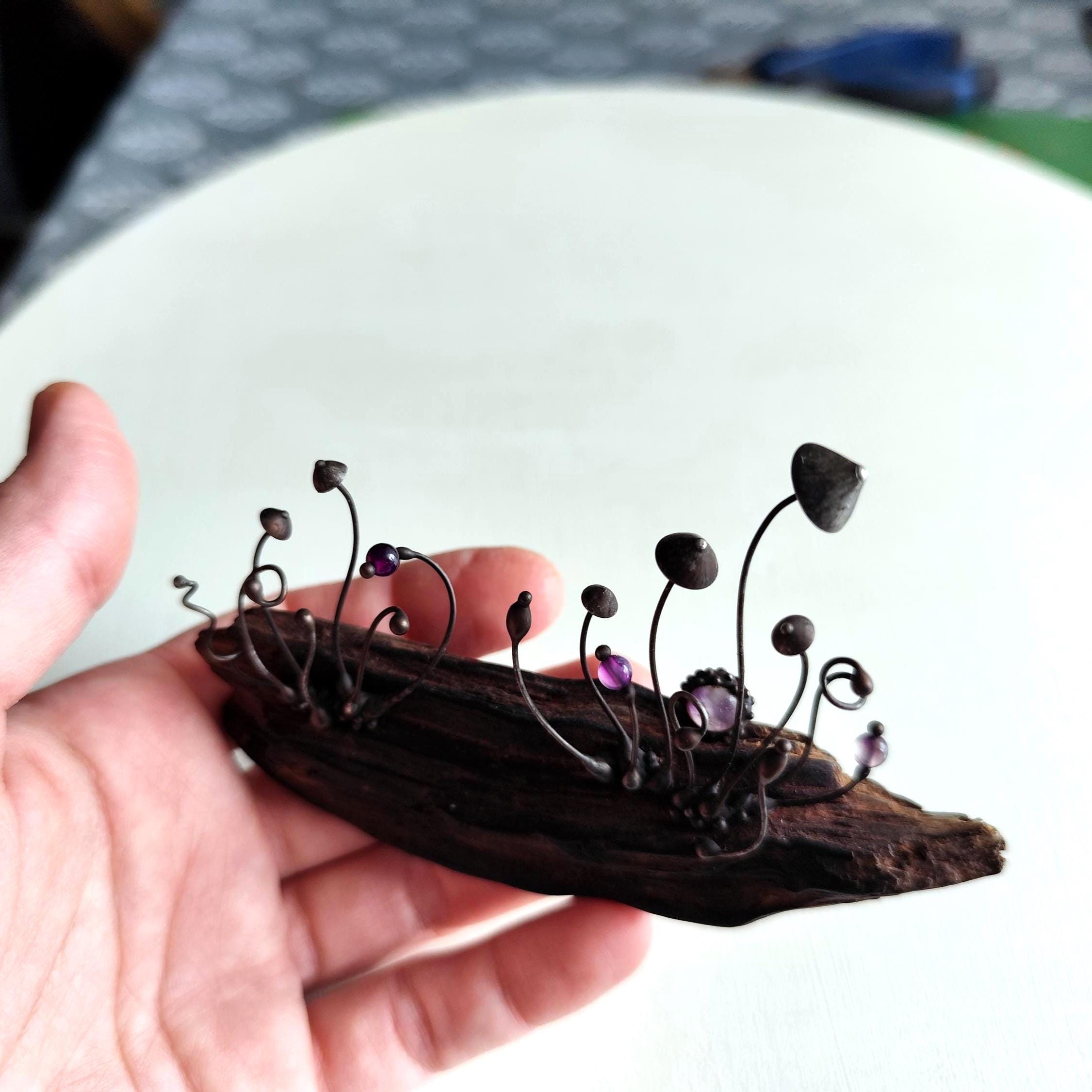 Baltic Sea Driftwood Mushroom Statue inspired by nature handmade from wood, copper, pewter alloy and amethysts stone and beads. Covered with patina and treated with antioxidant, sanded, polished. Light and sturdy fungi magic mushrooms home decor statue. All elements are handmade, which ensures the individuality of each product made in the Yadovito workshop. The copper alloy is coated with a black patina to color the metal black, polished with a finishing solution to give the jewelry a noble appearance and at the same time so that the metal does not oxidize. Each jewelry looks individually, because mushroom caps are made by hand, and not cast or stamped. Size about 11 * 8 * 4 cm (4.3 * 3.1 * 1.5 in). Color black/purple.