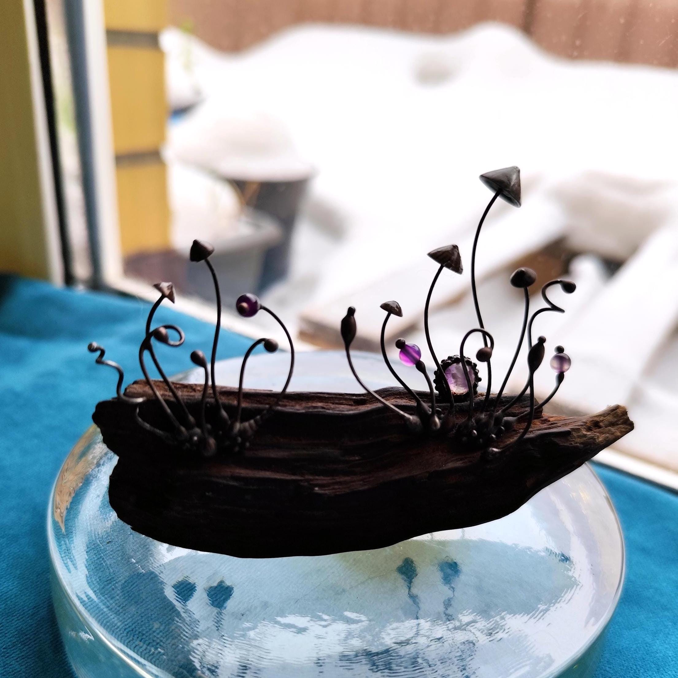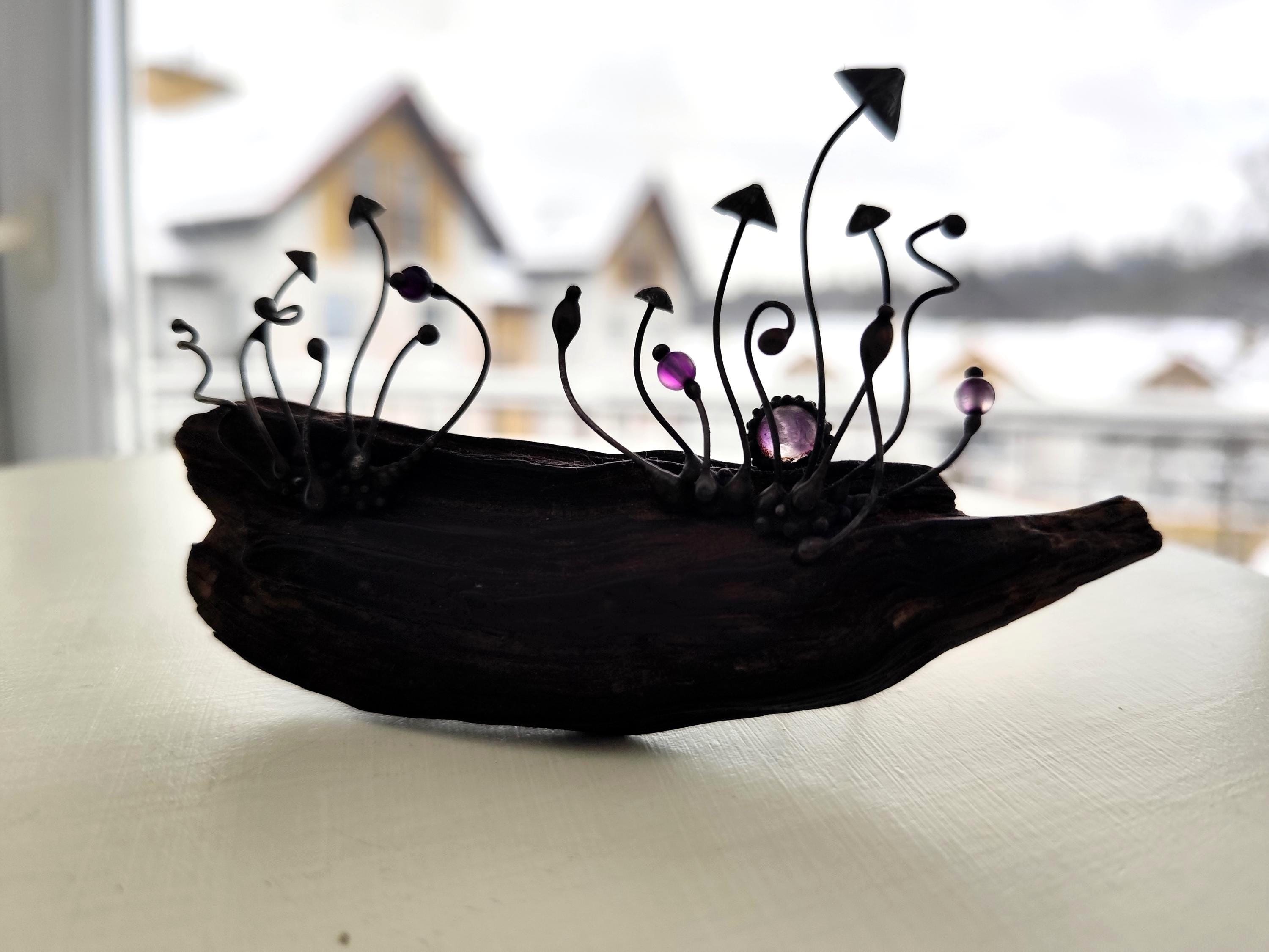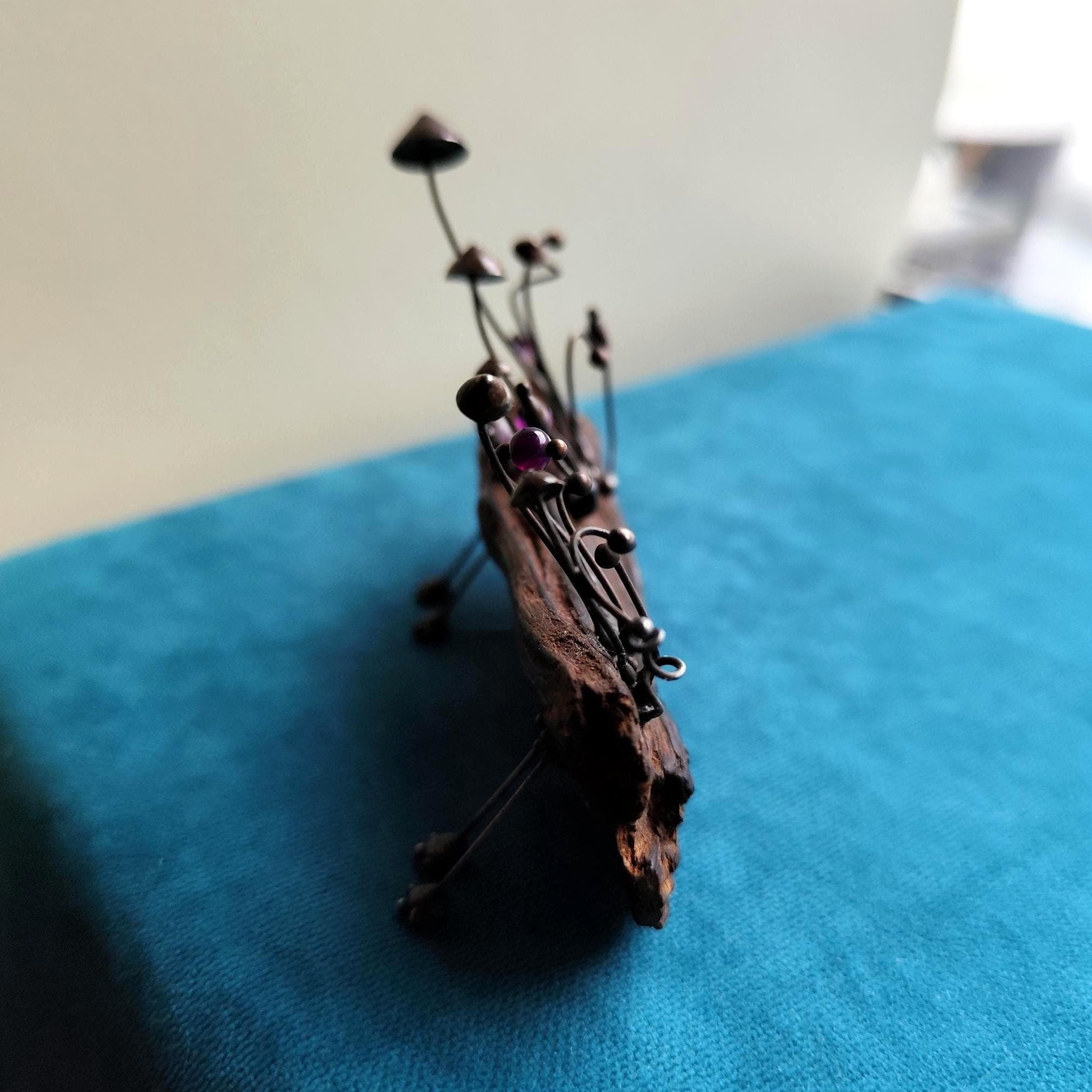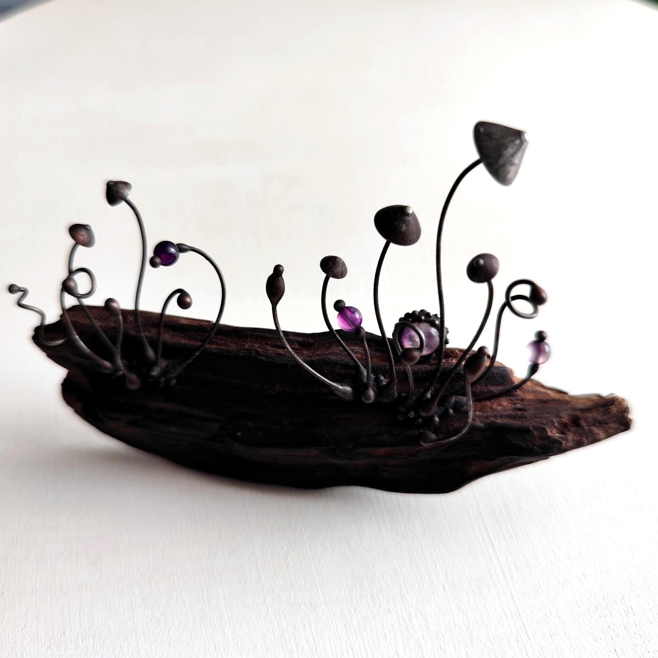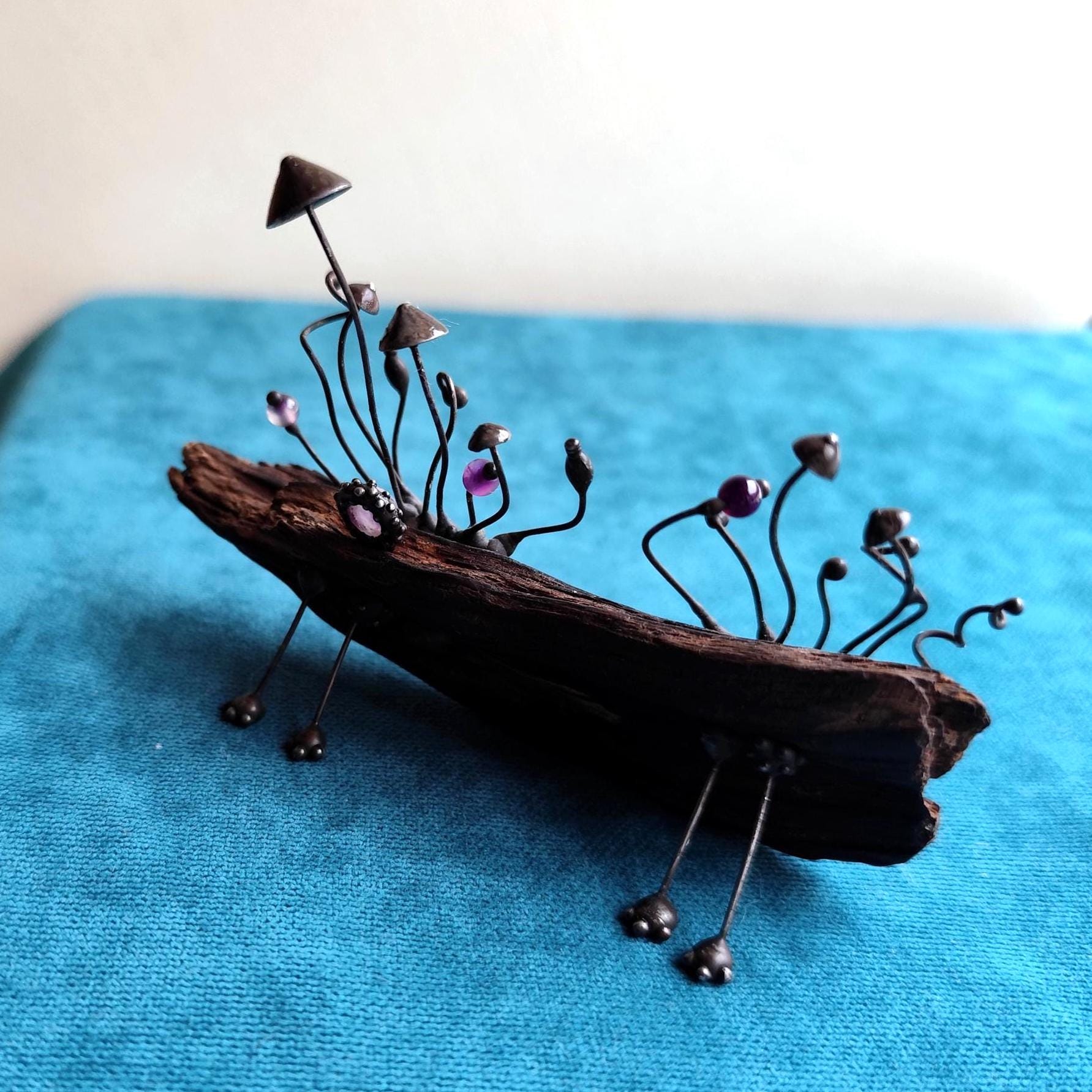 Baltic Sea Driftwood Mushroom Statue inspired by nature handmade from wood, copper, pewter alloy and amethysts stone and beads. Covered with patina and treated with antioxidant, sanded, polished. Light and sturdy fungi magic mushrooms home decor statue. All elements are handmade, which ensures the individuality of each product made in the Yadovito workshop. The copper alloy is coated with a black patina to color the metal black, polished with a finishing solution to give the jewelry a noble appearance and at the same time so that the metal does not oxidize. Each jewelry looks individually, because mushroom caps are made by hand, and not cast or stamped. Size about 11 * 8 * 4 cm (4.3 * 3.1 * 1.5 in). Color black/purple.