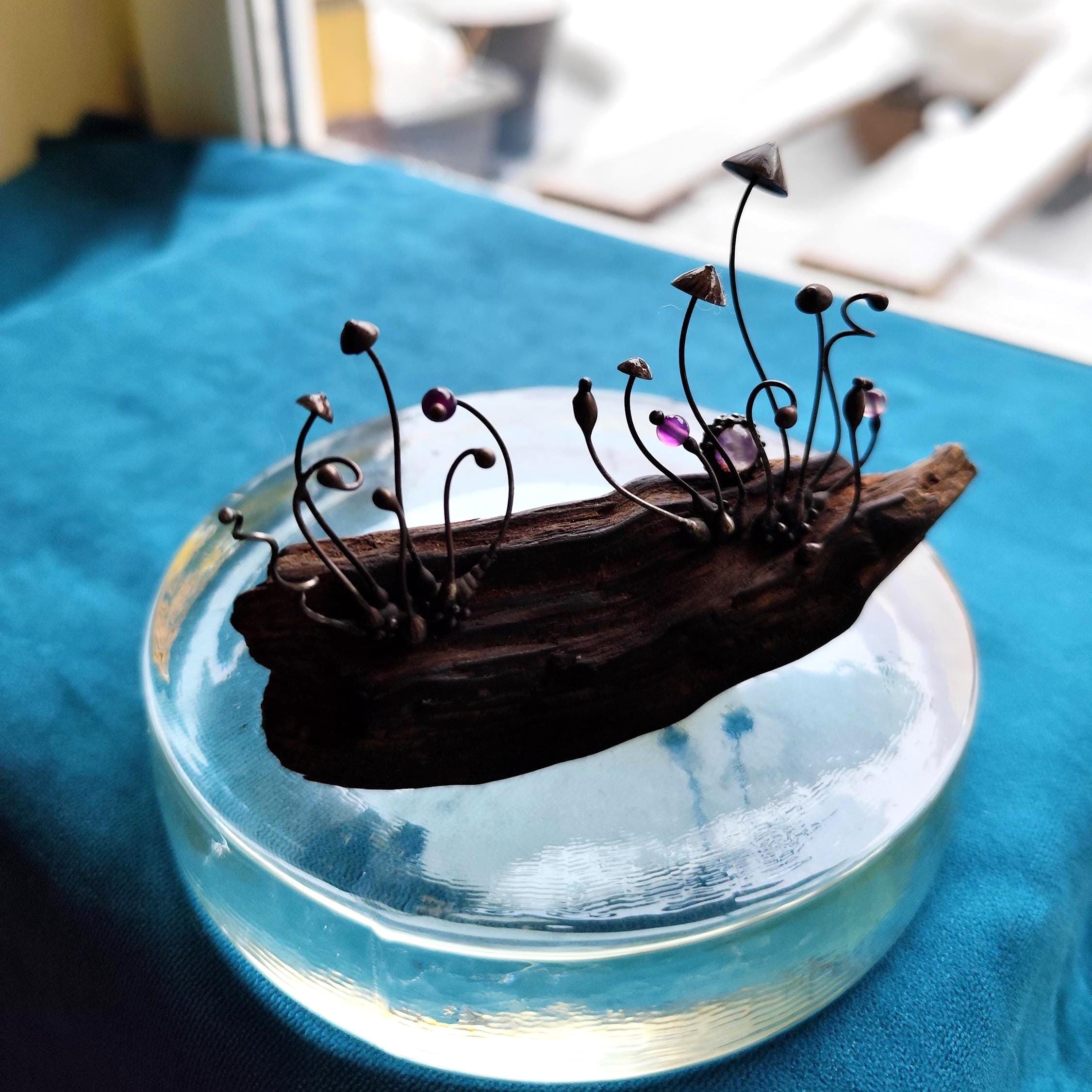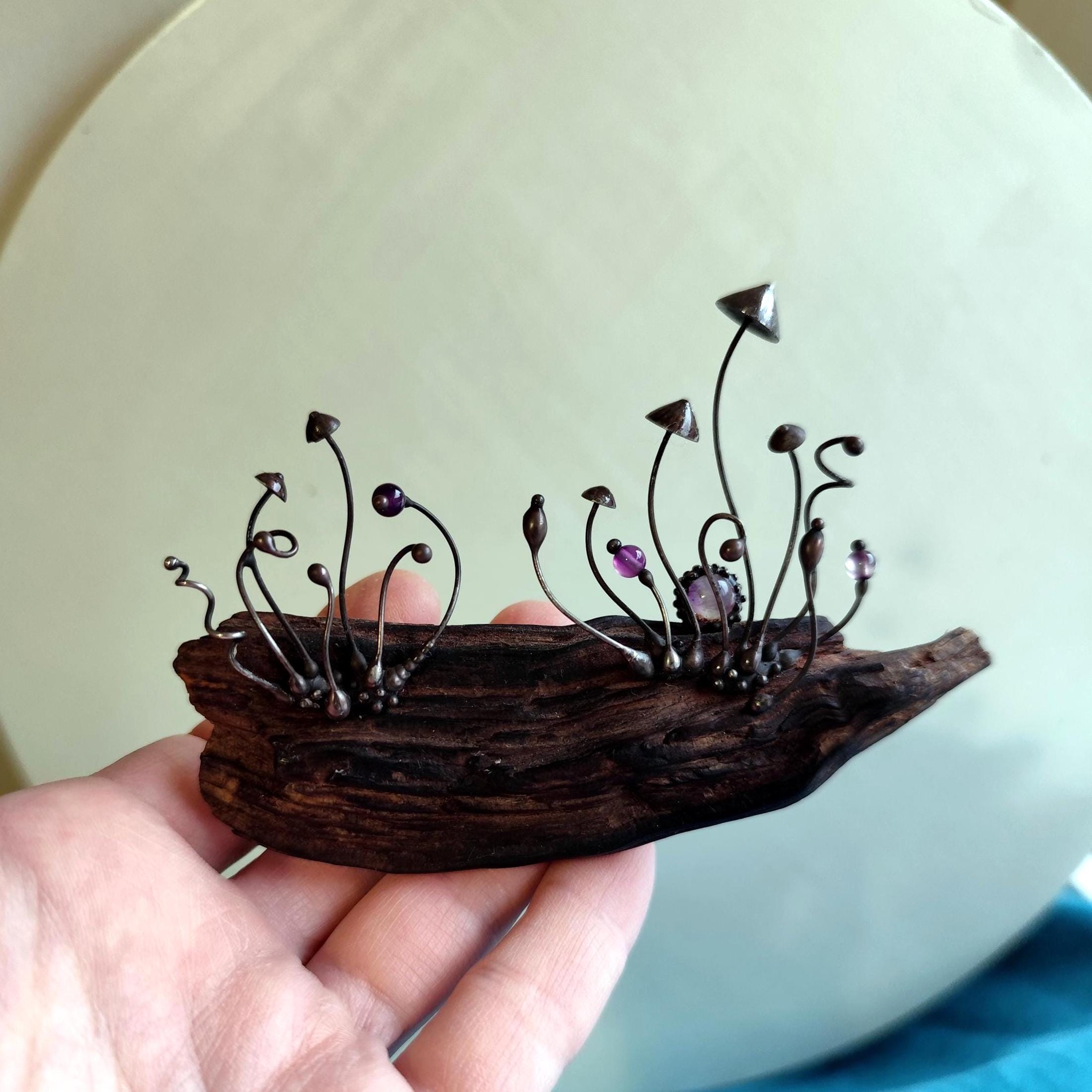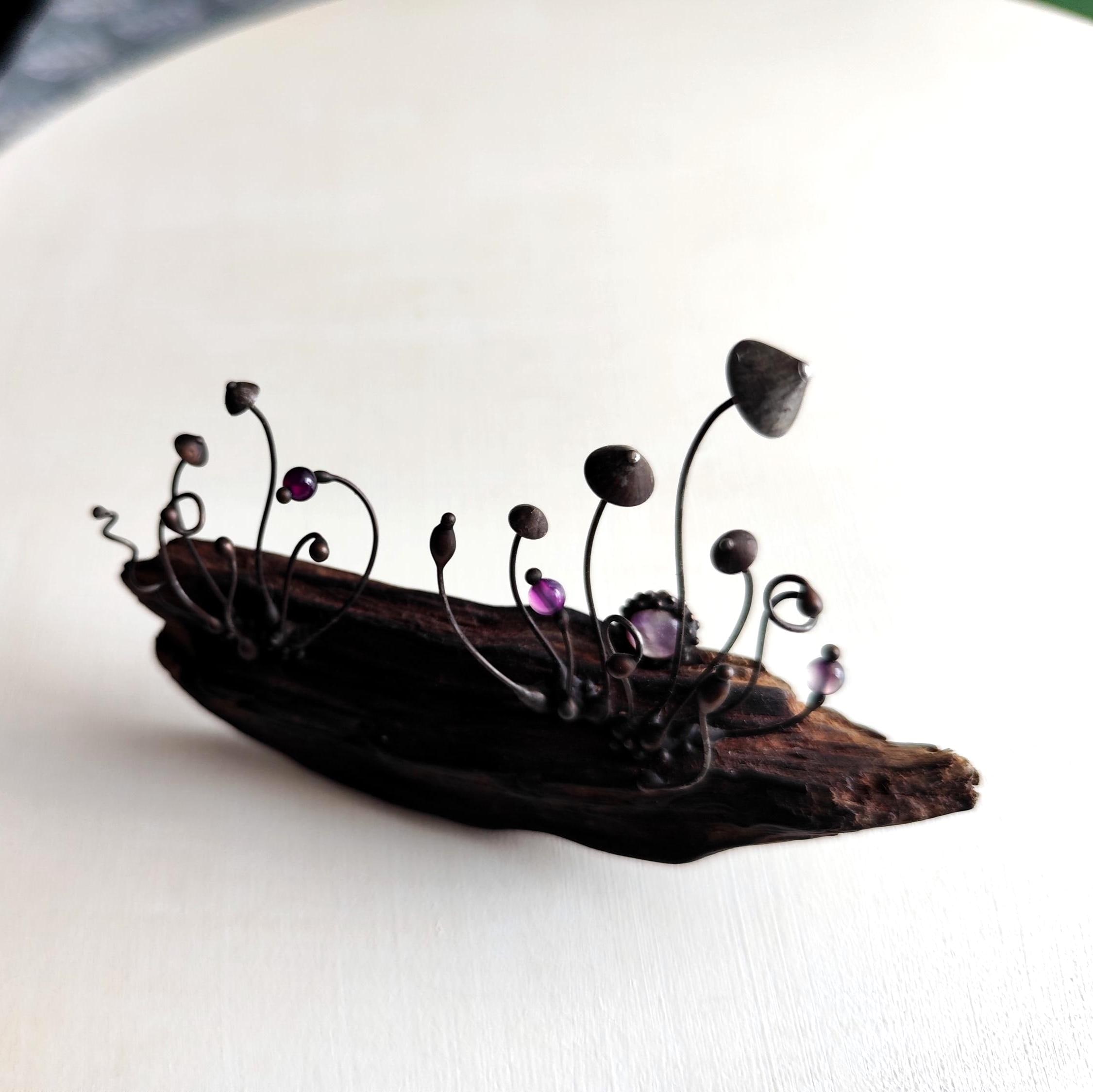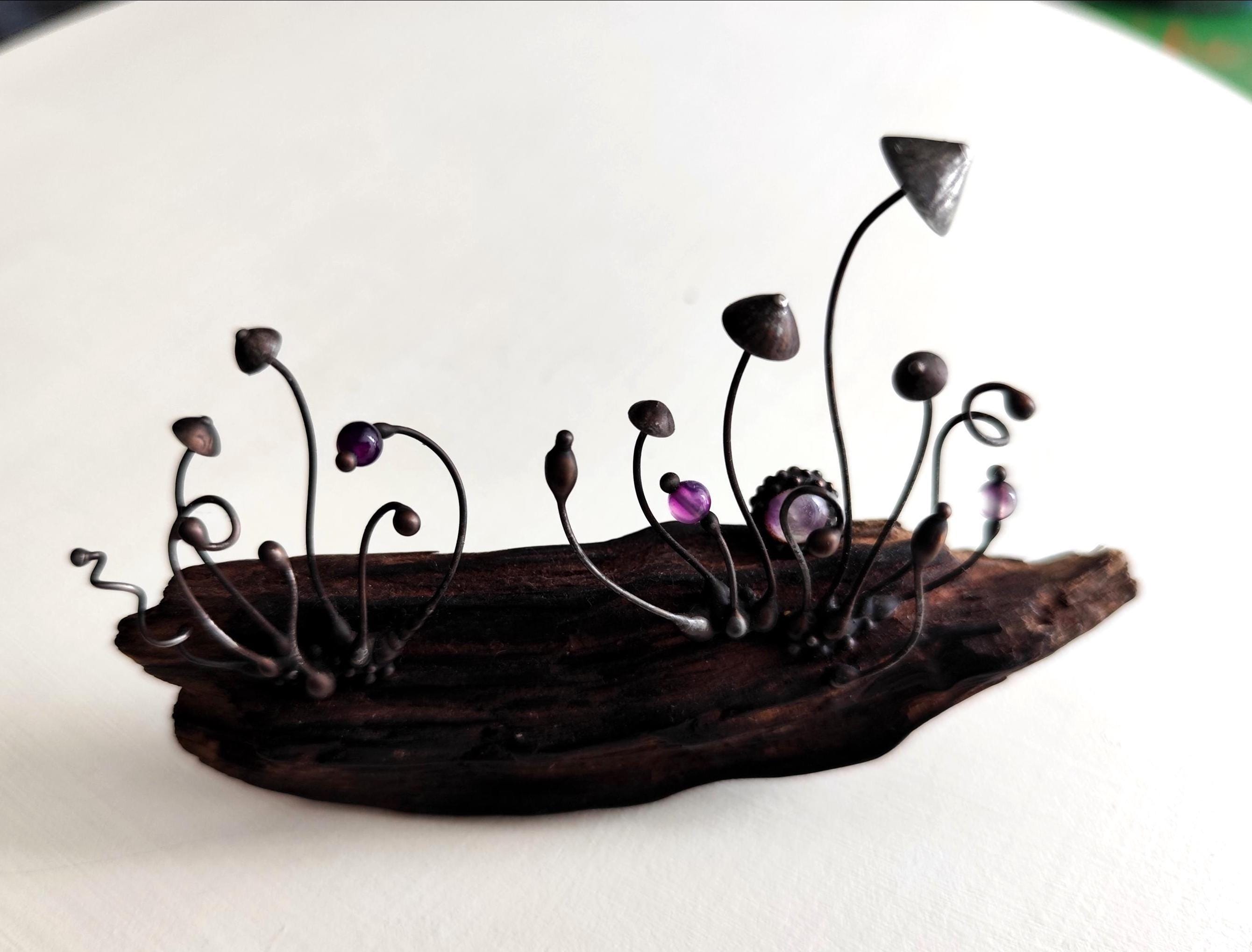Baltic Sea Driftwood Mushroom Statue inspired by nature handmade from wood, copper, pewter alloy and amethysts stone and beads. Covered with patina and treated with antioxidant, sanded, polished. Light and sturdy fungi magic mushrooms home decor statue. All elements are handmade, which ensures the individuality of each product made in the Yadovito workshop. The copper alloy is coated with a black patina to color the metal black, polished with a finishing solution to give the jewelry a noble appearance and at the same time so that the metal does not oxidize. Each jewelry looks individually, because mushroom caps are made by hand, and not cast or stamped. Size about 11 * 8 * 4 cm (4.3 * 3.1 * 1.5 in). Color black/purple.