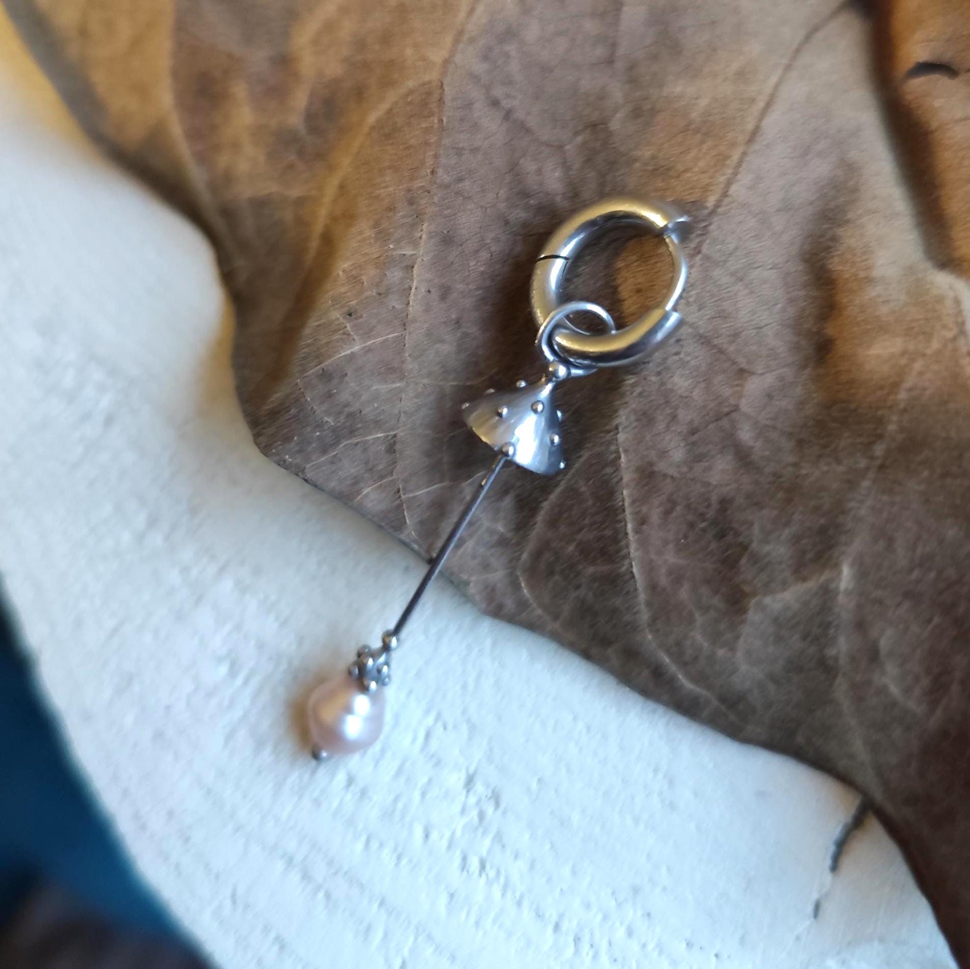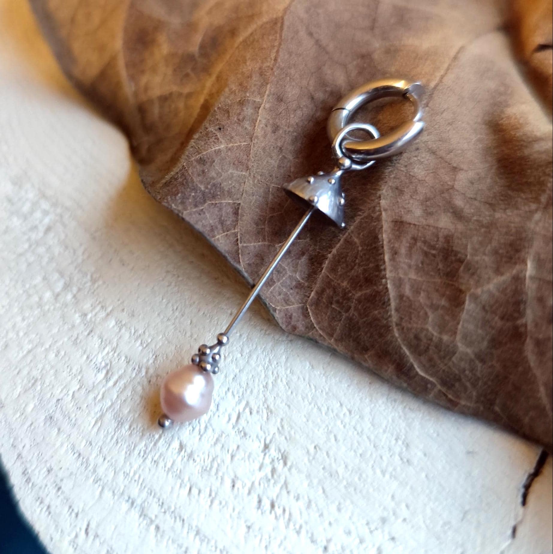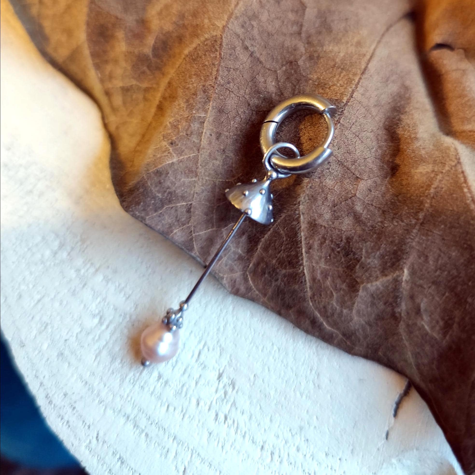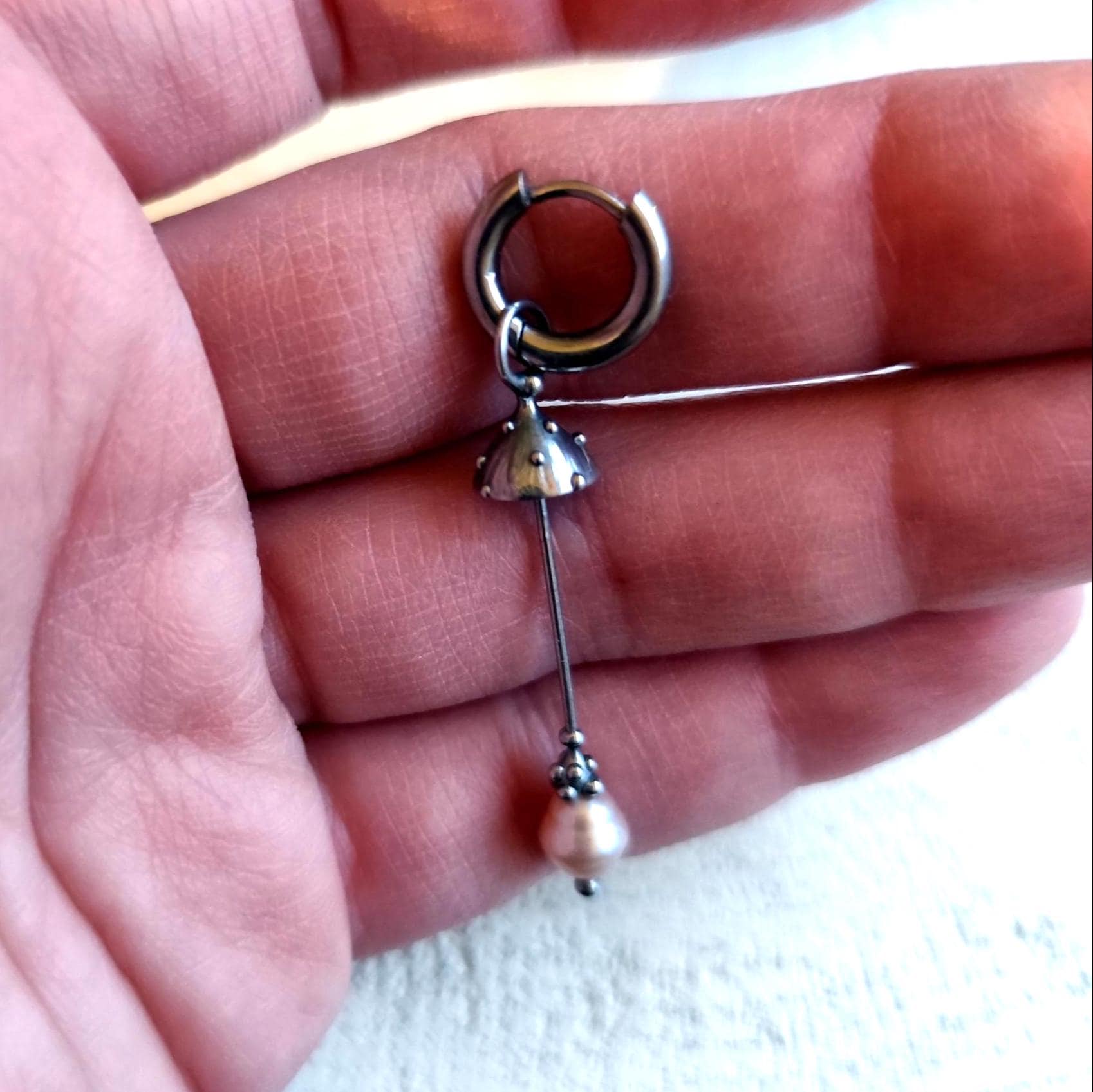 Handcrafted metal earring ring shaped like fungi amanita from copper, pewter, steel and pearl. Treated with antioxidant, sanded, polished. Light and sturdy fly agaric pendant. All elements are handmade, which ensures the individuality of each product made in the Yadovito workshop. The copper alloy is polished with a finishing solution to give the jewelry a noble appearance and at the same time so that the metal does not oxidize. Size about 4.5/0.8 cm (1.7 * 0.4 in). Color silver/white.